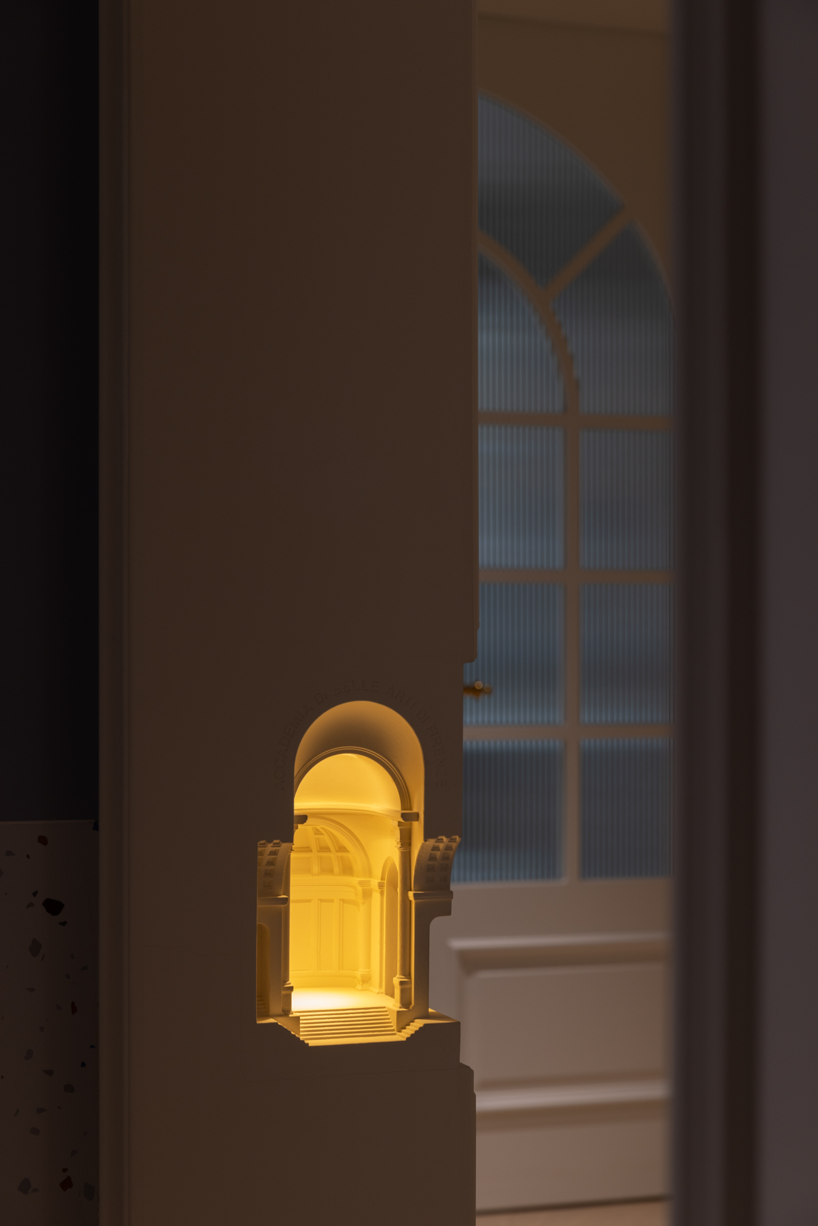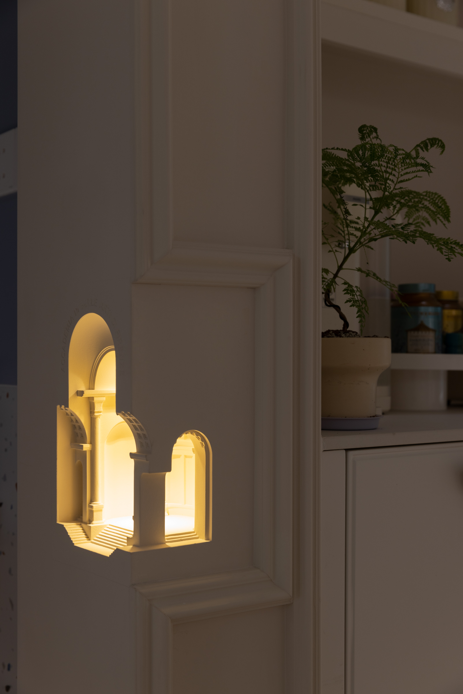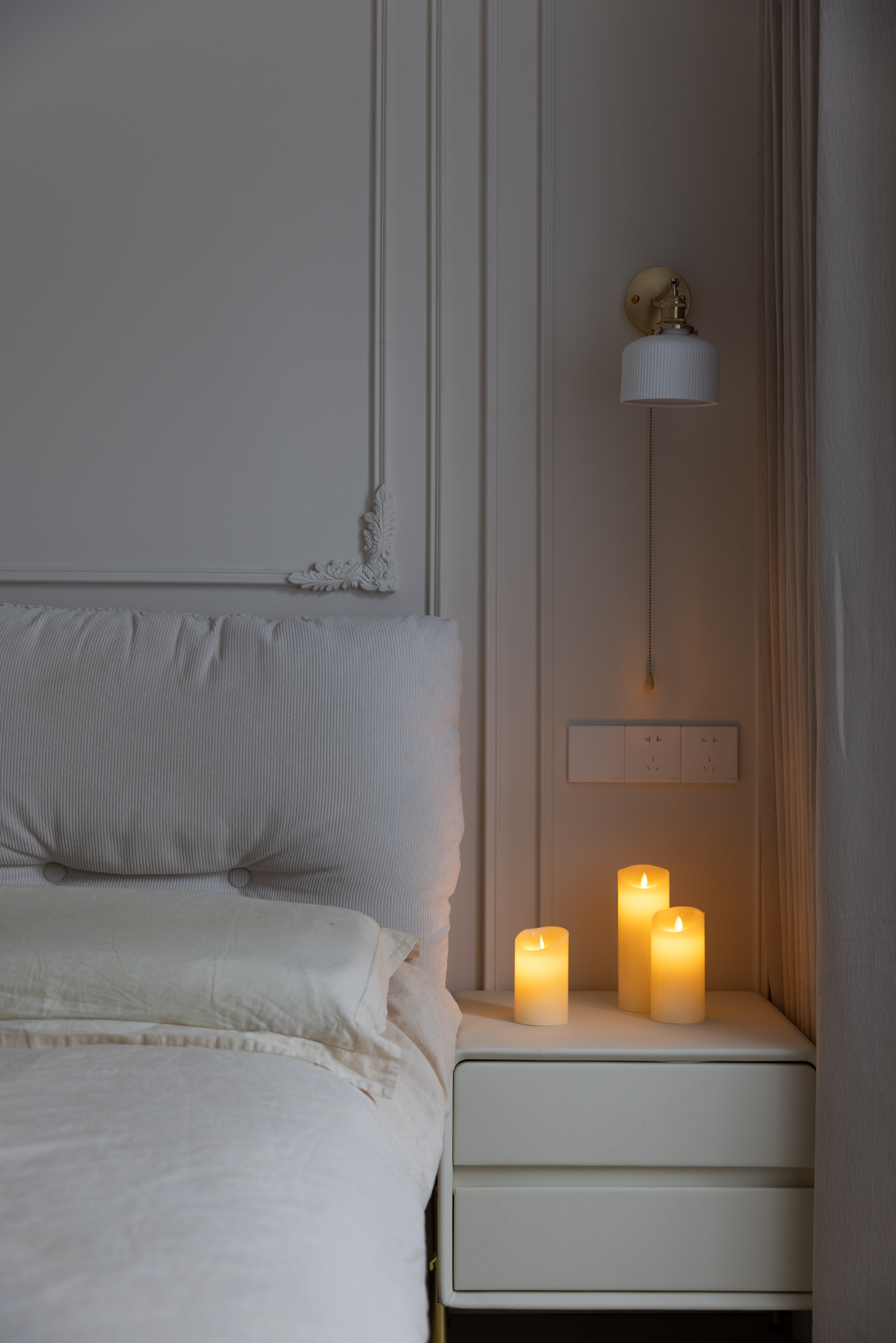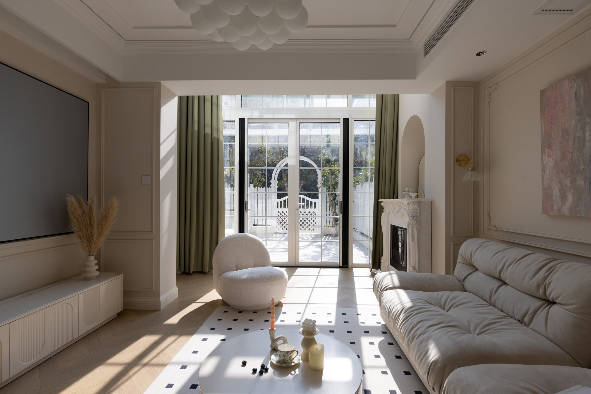 空间意境:首创“法式+童话”双轴配色系统:奶油立面嵌入低饱和莫兰迪童话色,石膏线脚藏入隐藏式变色灯带,日落后自动切换柔雾粉/星雾蓝,让法式线条与童话幻彩同频呼吸,浪漫随光成长。