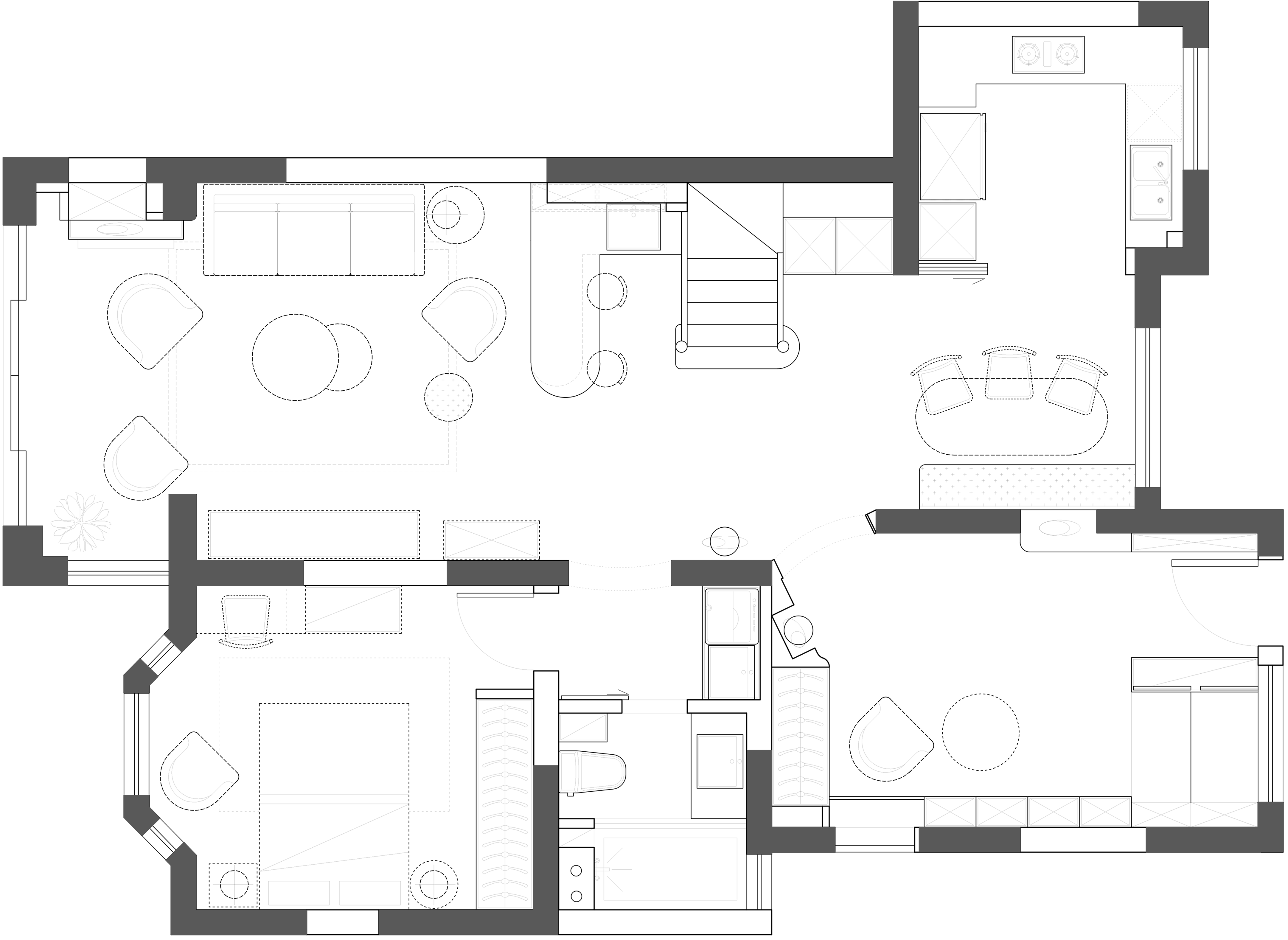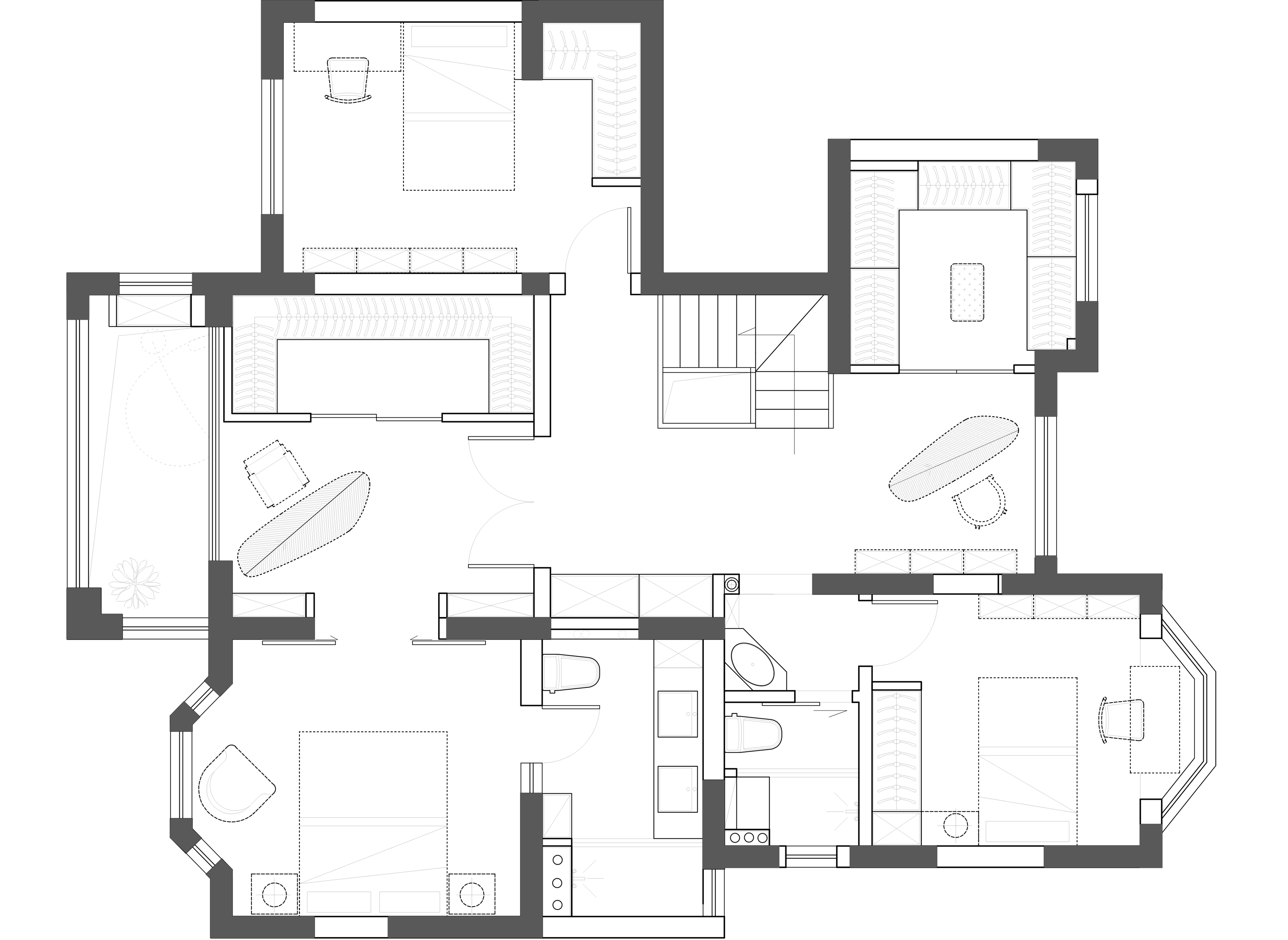 空间布局:创新“代际分层”动线:二楼双套房设亲子隐形串门仓口,一楼老人房、适老厨房与花园无高差环通,公区餐桌可旋转面向庭院,瞬间切换照护/欢聚模式,三代同堂既独立又一眼相望。