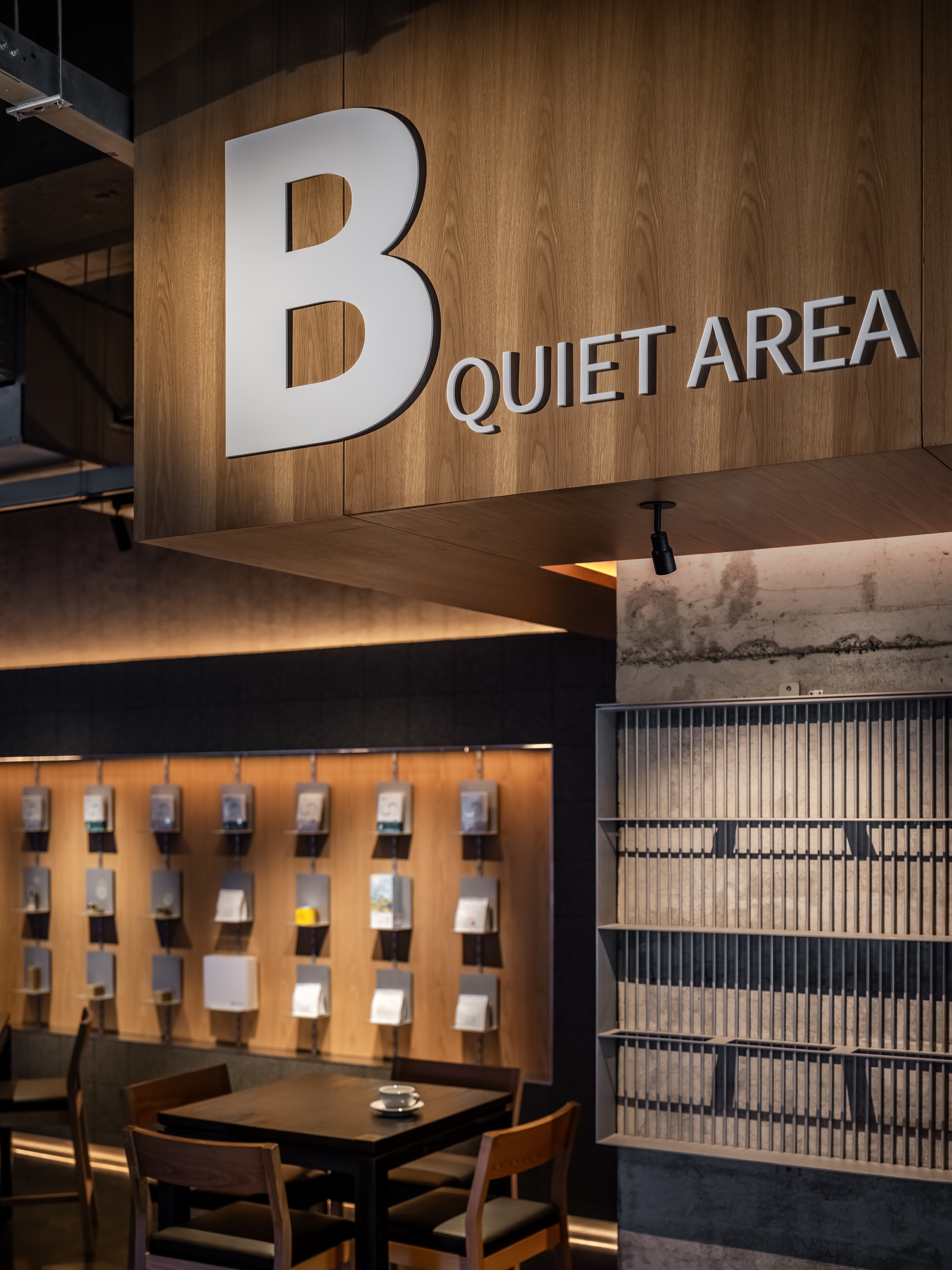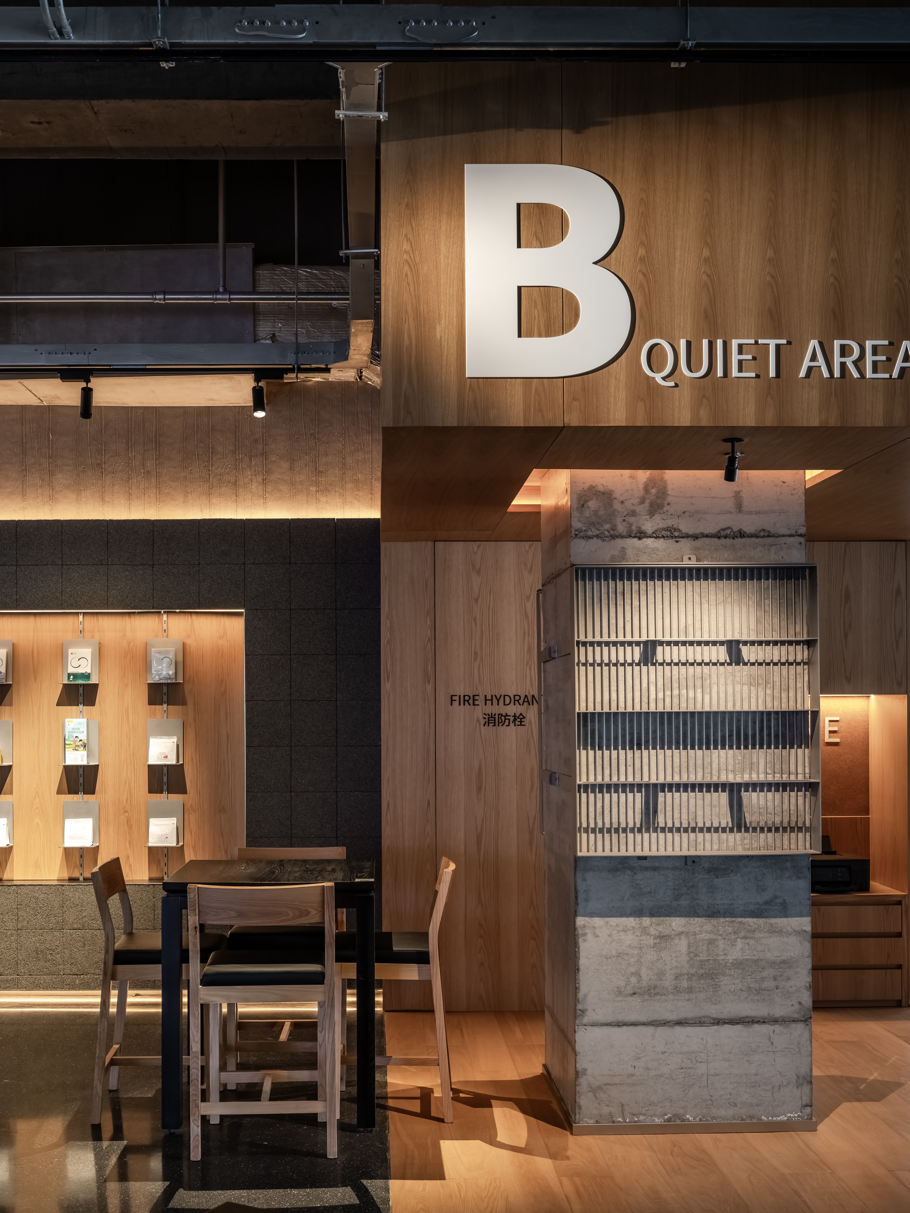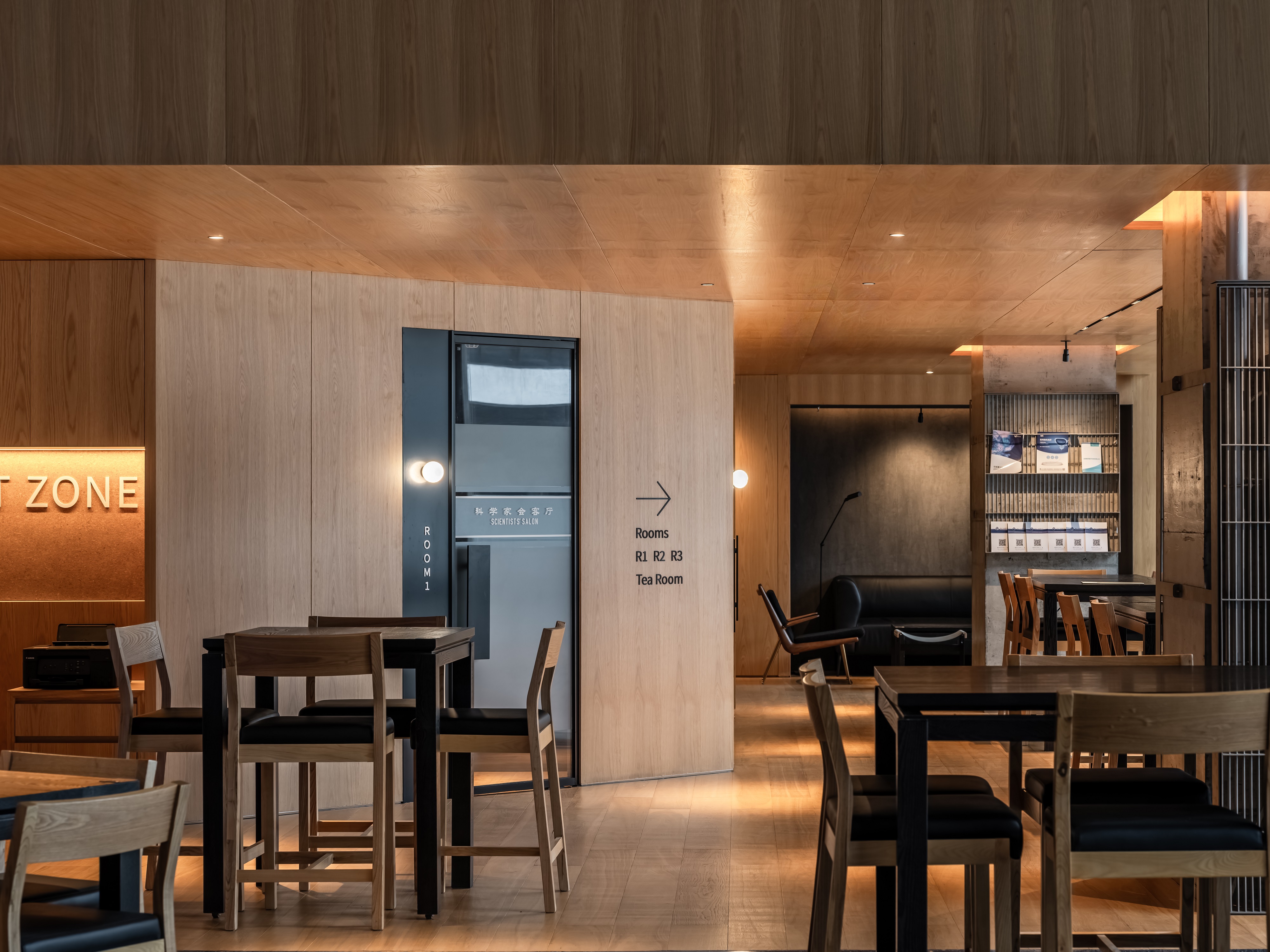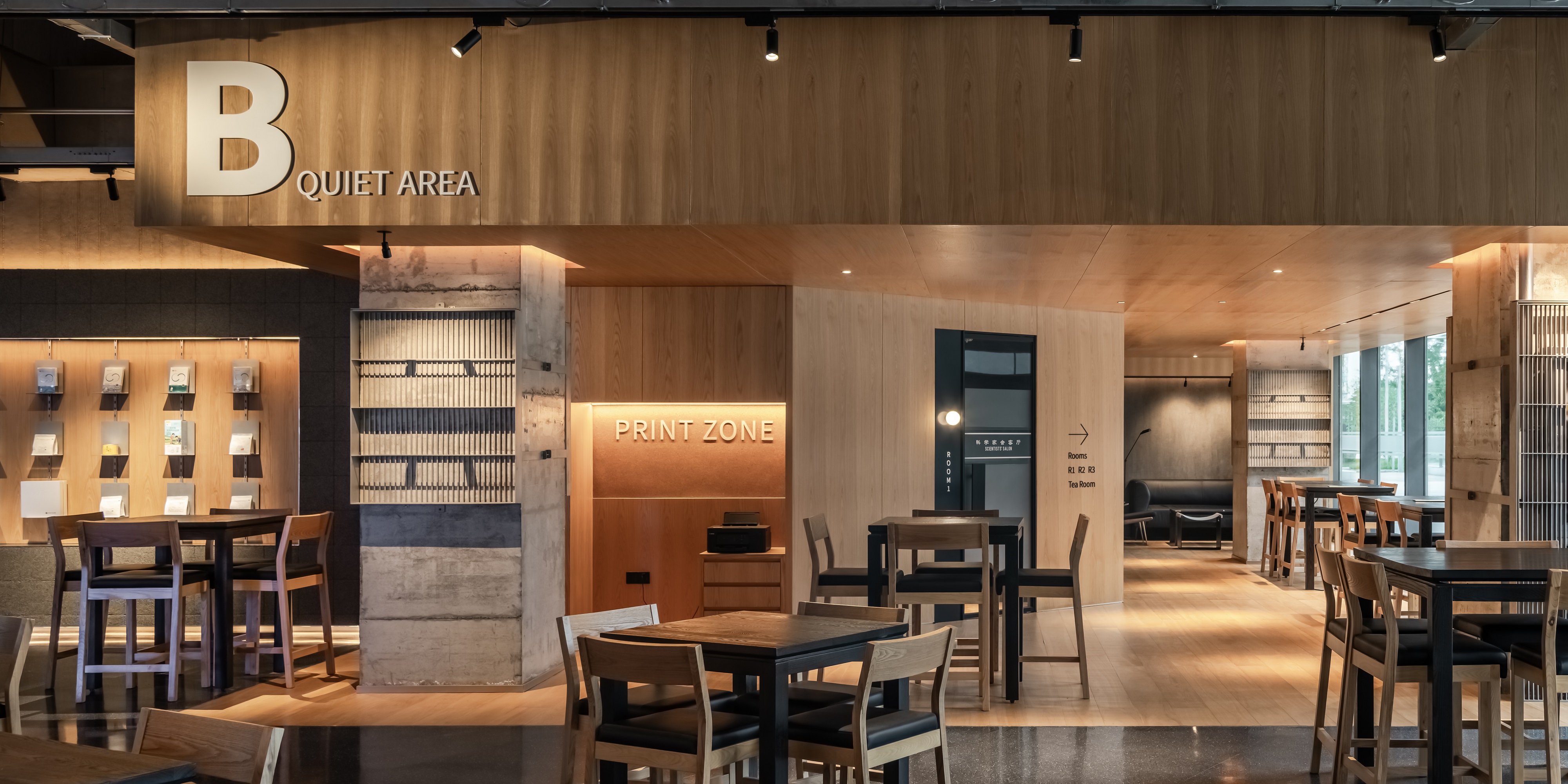 空间意境:空间功能分区:基于人员的使用场景,将空间划分为 OPEN AREA(开放交流区)与 QUIET AREA(静谧休憩区)两大核心区域。开放交流区设置灵活组合的桌椅、互动展示墙,满足小组研讨、学术分享、团队协作等需求;静谧休憩区则以舒适的沙发、柔和的灯光营造宁静氛围,适配独处思考、短暂放松、轻量阅读等场景,实现功能与场景的精准匹配。
