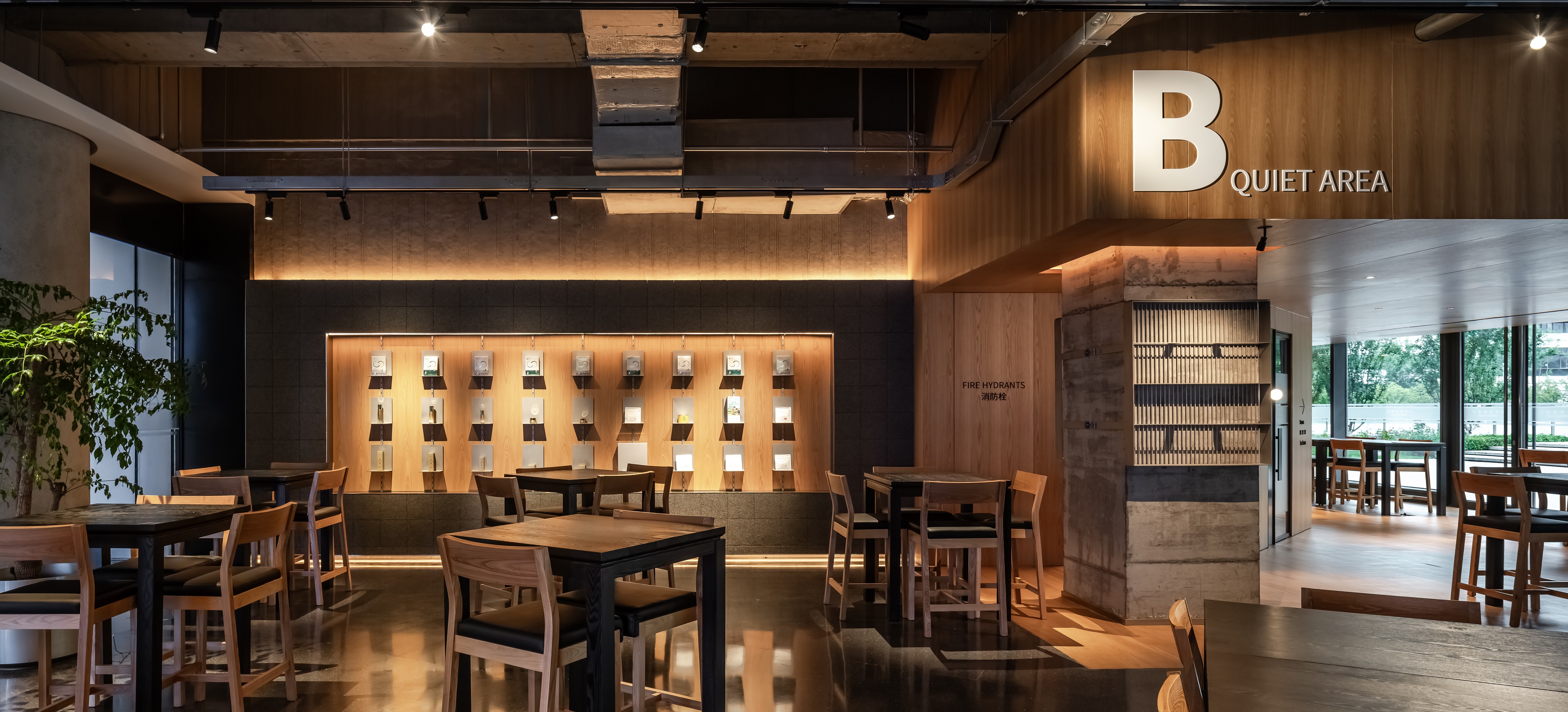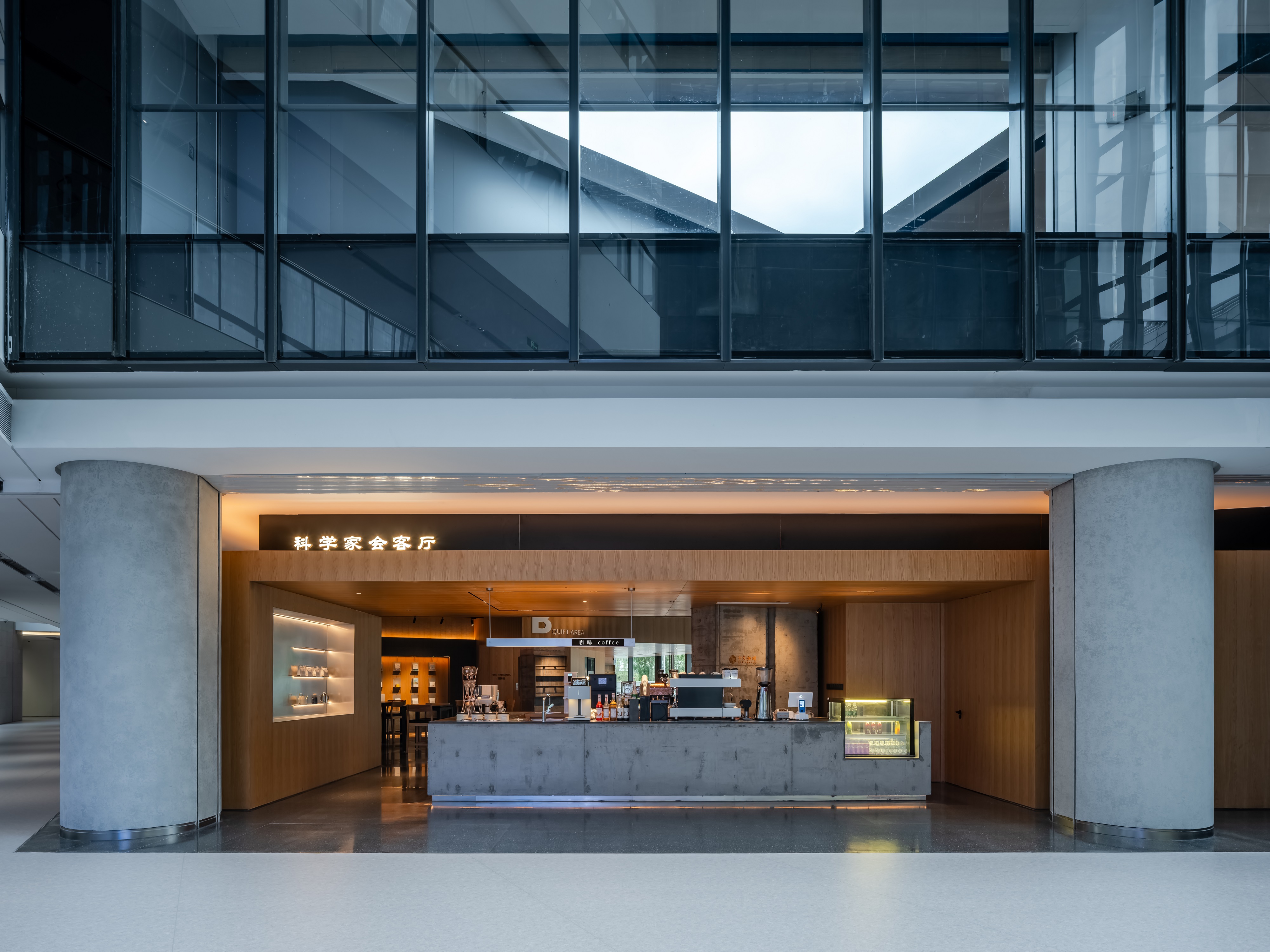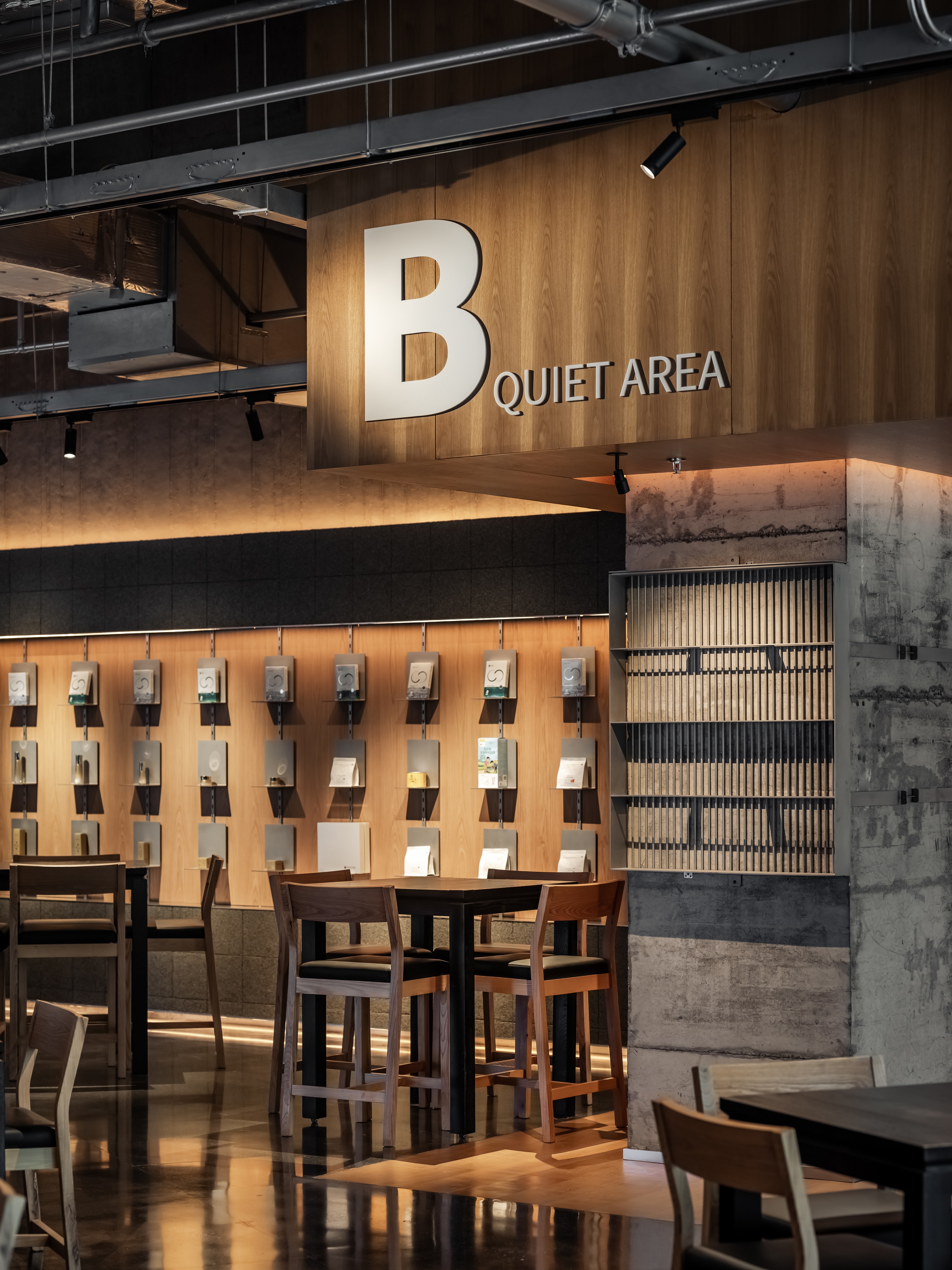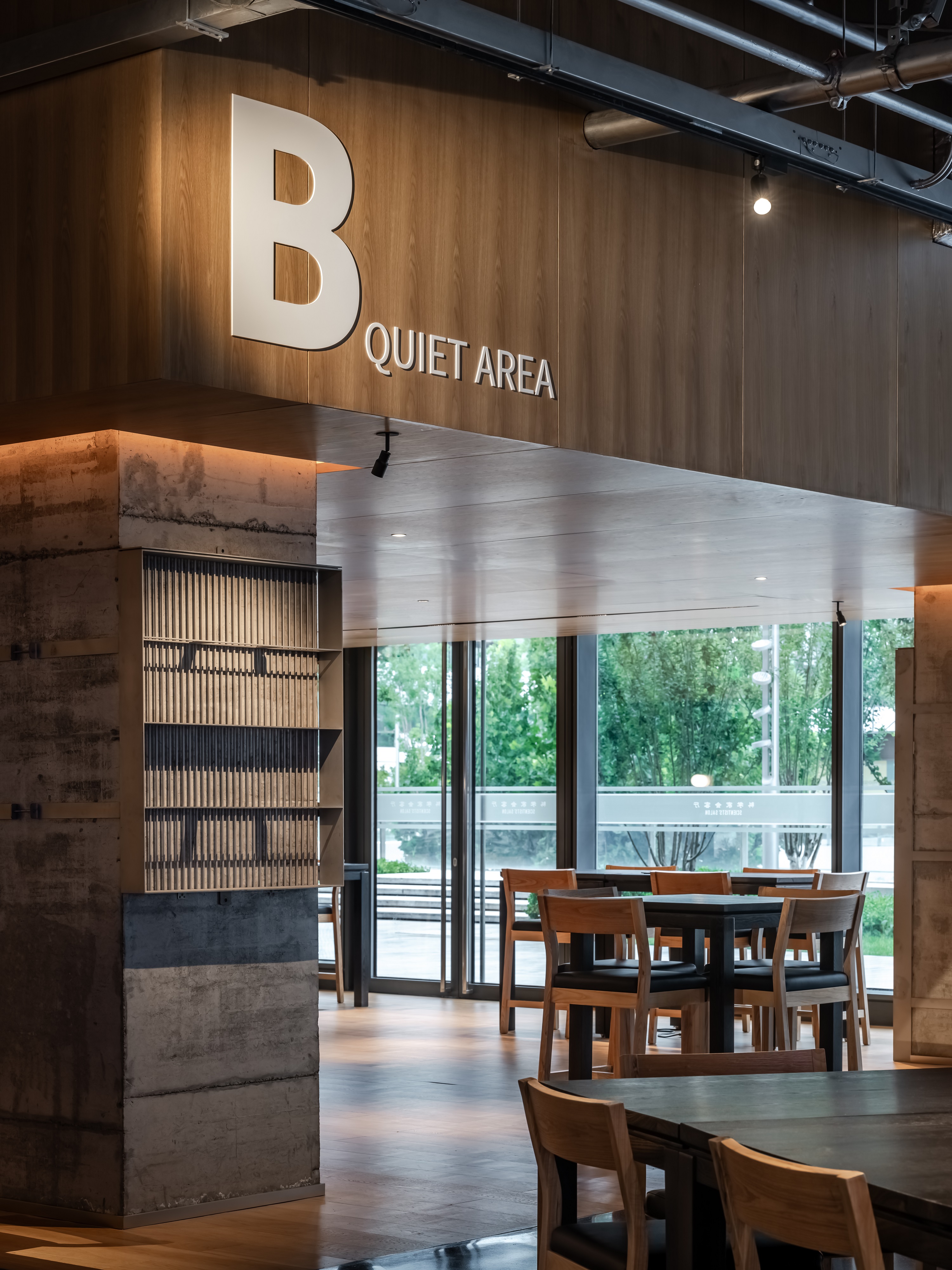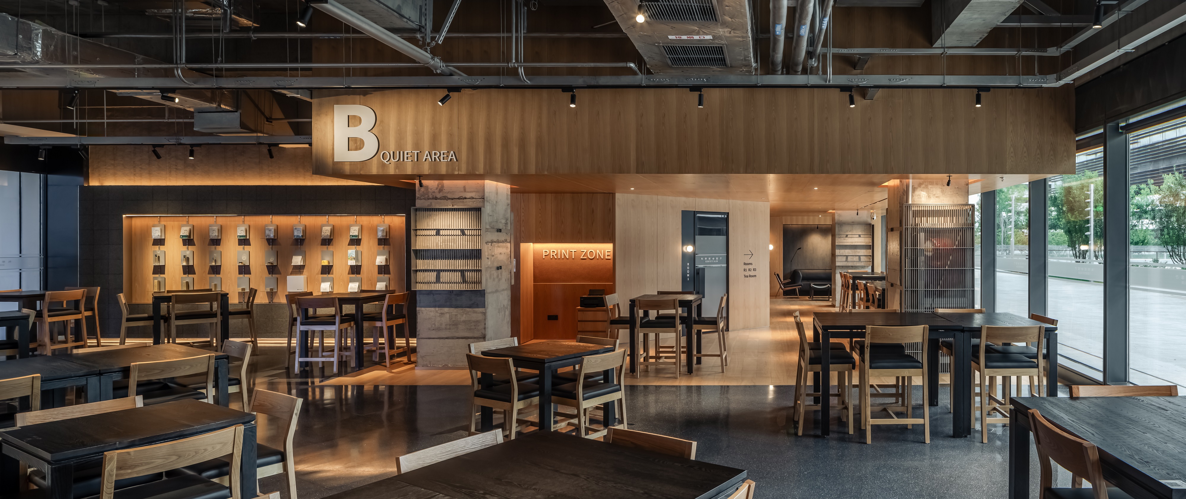 空间意境:空间功能分区:基于人员的使用场景,将空间划分为 OPEN AREA(开放交流区)与 QUIET AREA(静谧休憩区)两大核心区域。开放交流区设置灵活组合的桌椅、互动展示墙,满足小组研讨、学术分享、团队协作等需求;静谧休憩区则以舒适的沙发、柔和的灯光营造宁静氛围,适配独处思考、短暂放松、轻量阅读等场景,实现功能与场景的精准匹配。