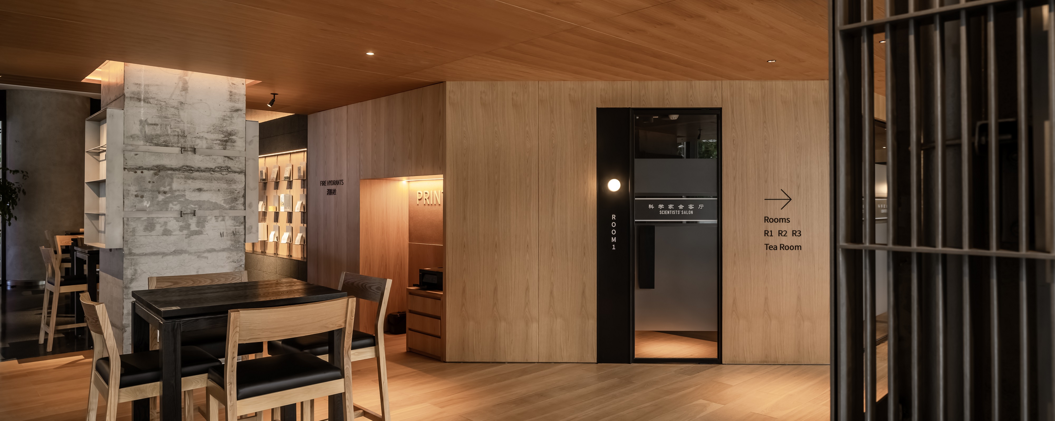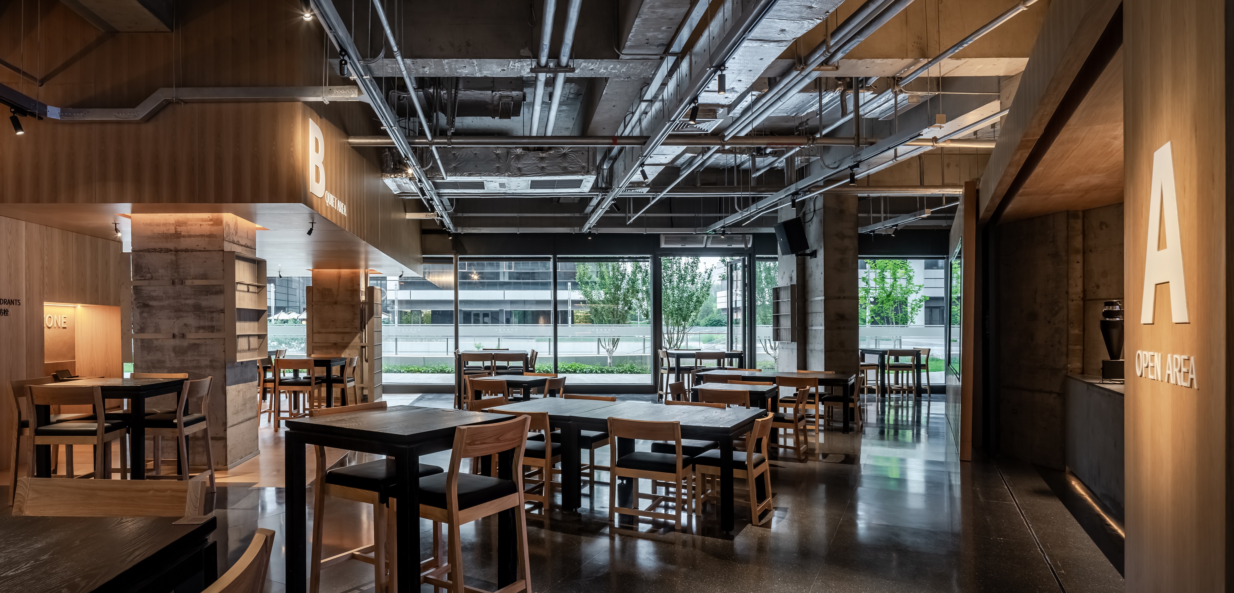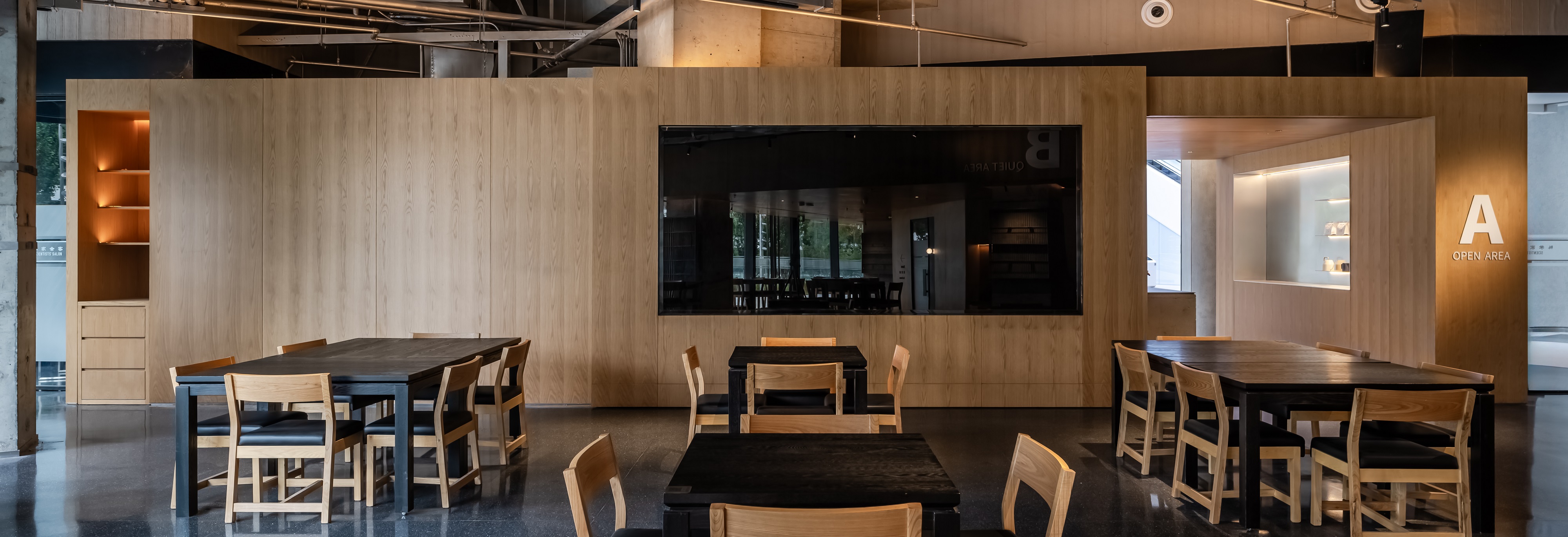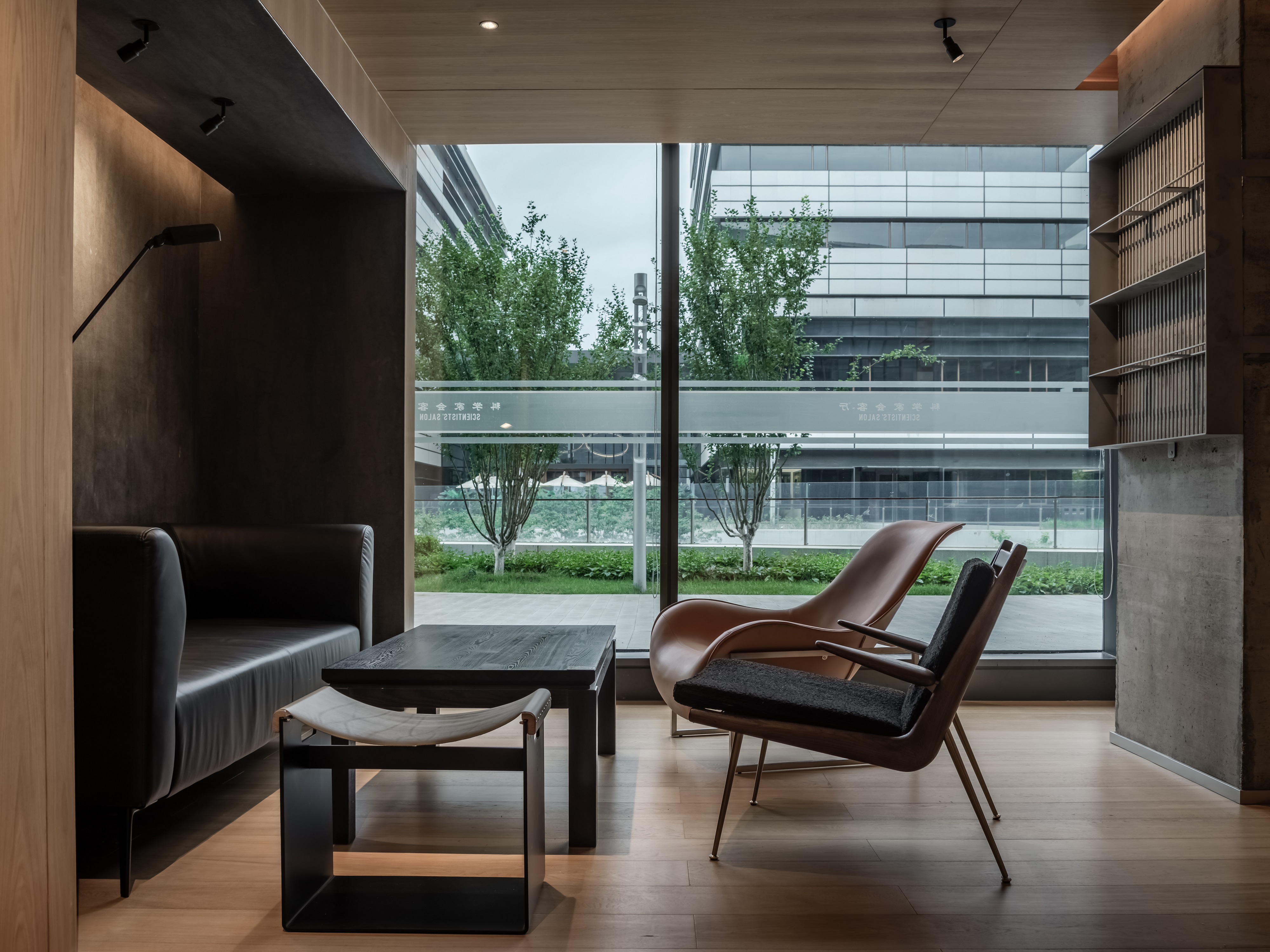 空间意境:空间功能分区:基于人员的使用场景,将空间划分为 OPEN AREA(开放交流区)与 QUIET AREA(静谧休憩区)两大核心区域。开放交流区设置灵活组合的桌椅、互动展示墙,满足小组研讨、学术分享、团队协作等需求;静谧休憩区则以舒适的沙发、柔和的灯光营造宁静氛围,适配独处思考、短暂放松、轻量阅读等场景,实现功能与场景的精准匹配。