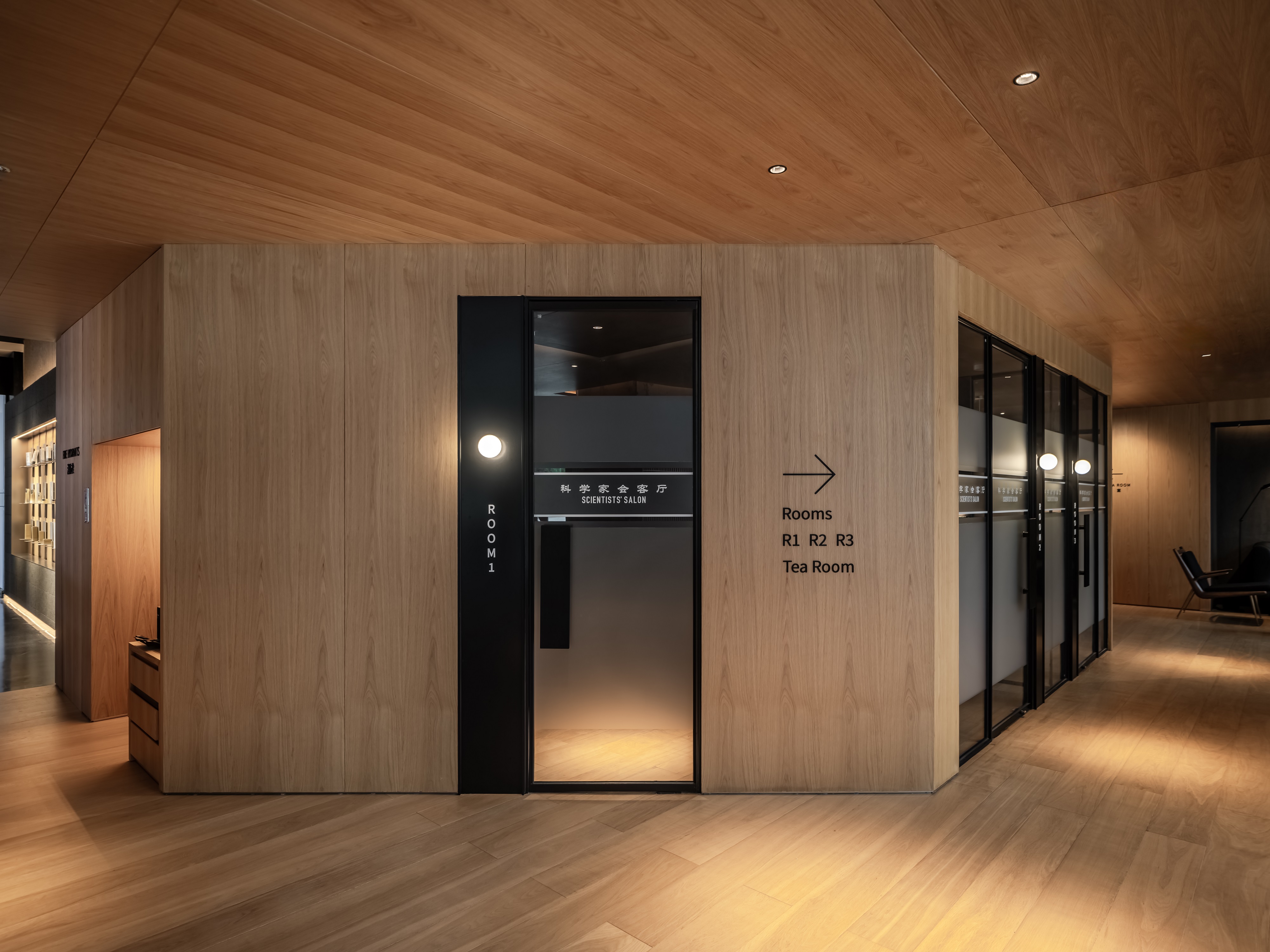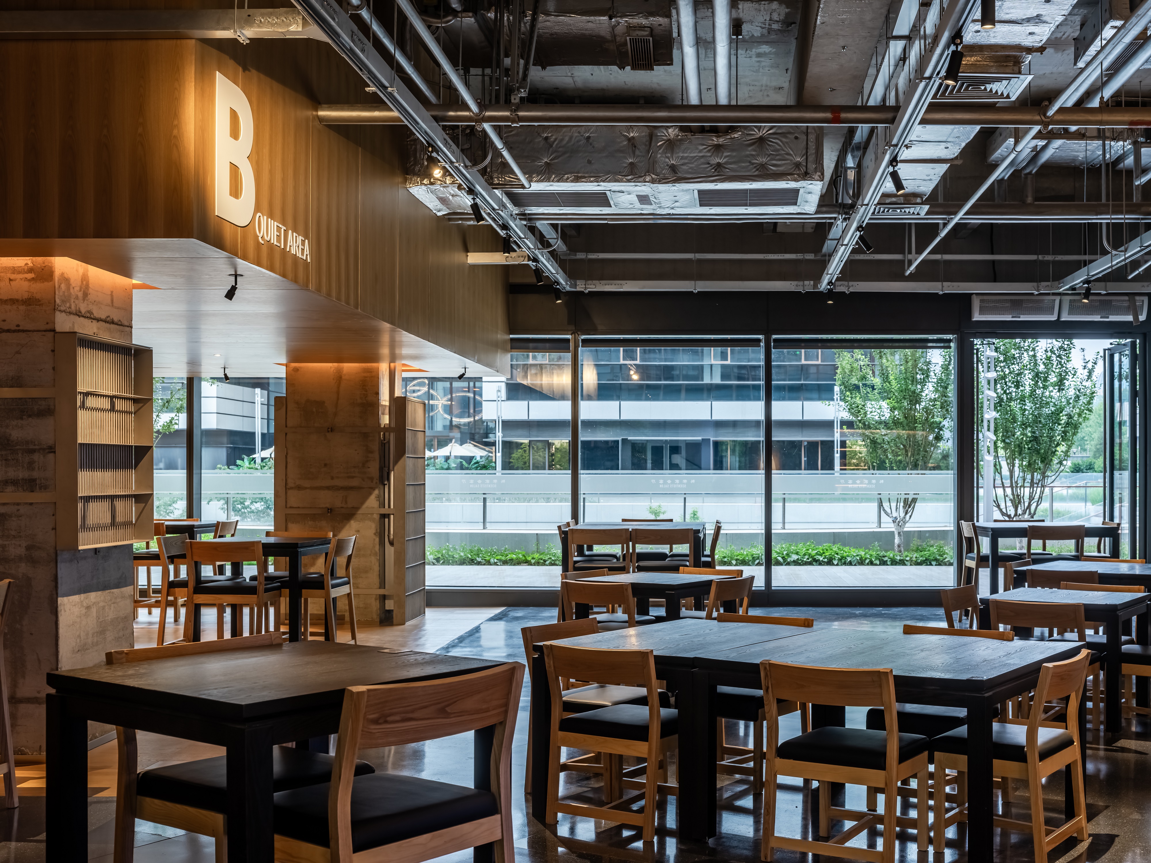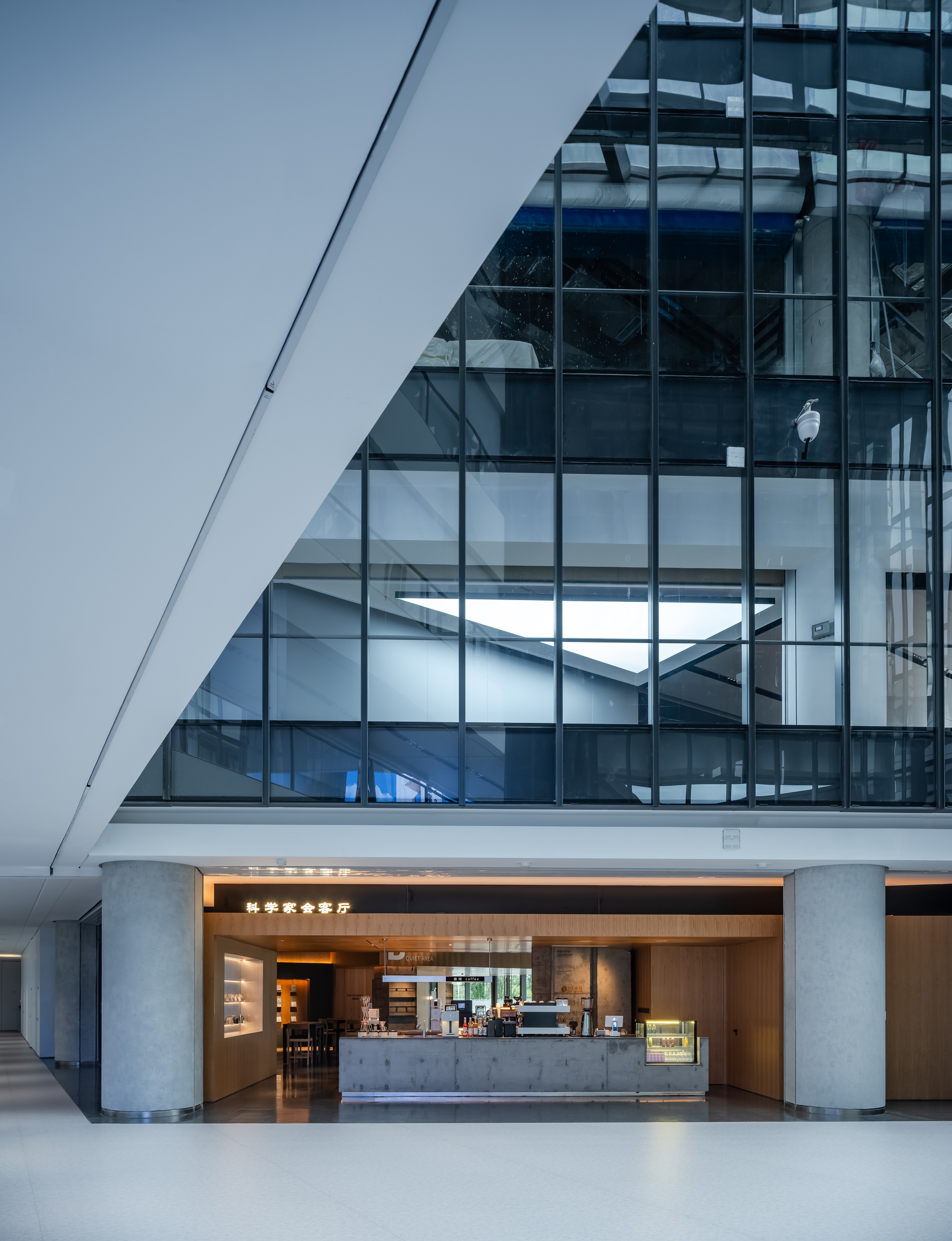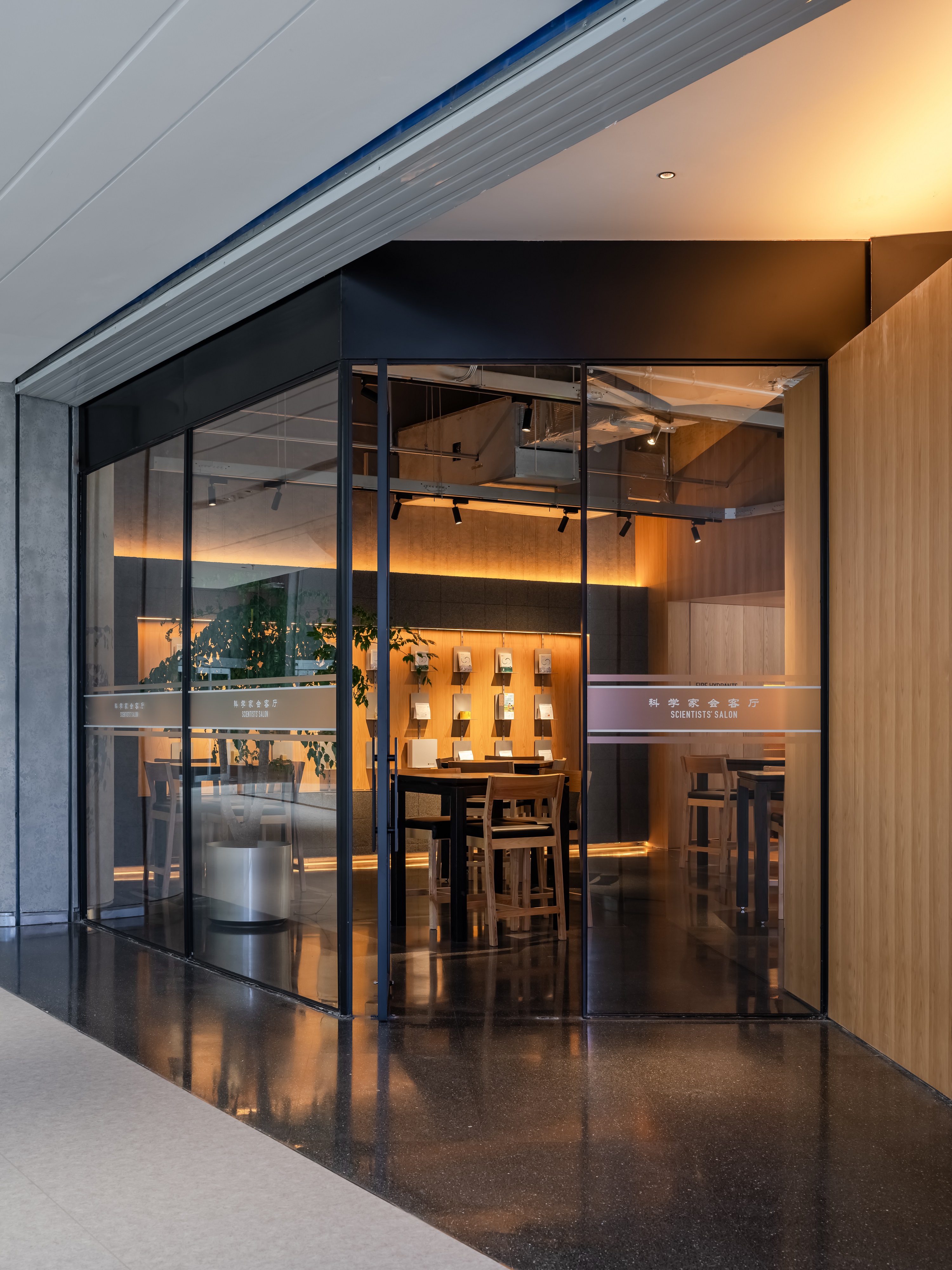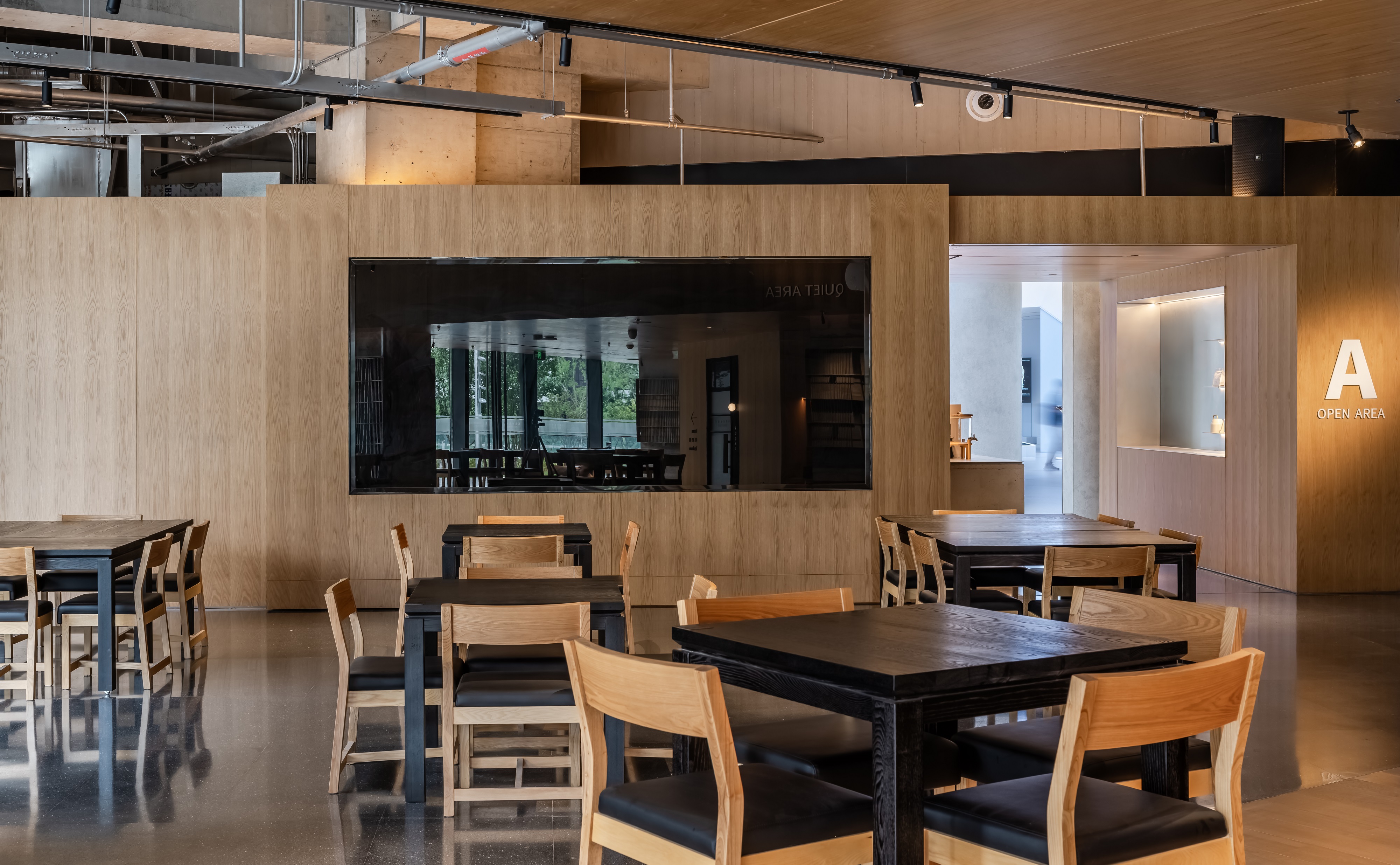 空间意境:空间功能分区:基于人员的使用场景,将空间划分为 OPEN AREA(开放交流区)与 QUIET AREA(静谧休憩区)两大核心区域。开放交流区设置灵活组合的桌椅、互动展示墙,满足小组研讨、学术分享、团队协作等需求;静谧休憩区则以舒适的沙发、柔和的灯光营造宁静氛围,适配独处思考、短暂放松、轻量阅读等场景,实现功能与场景的精准匹配。