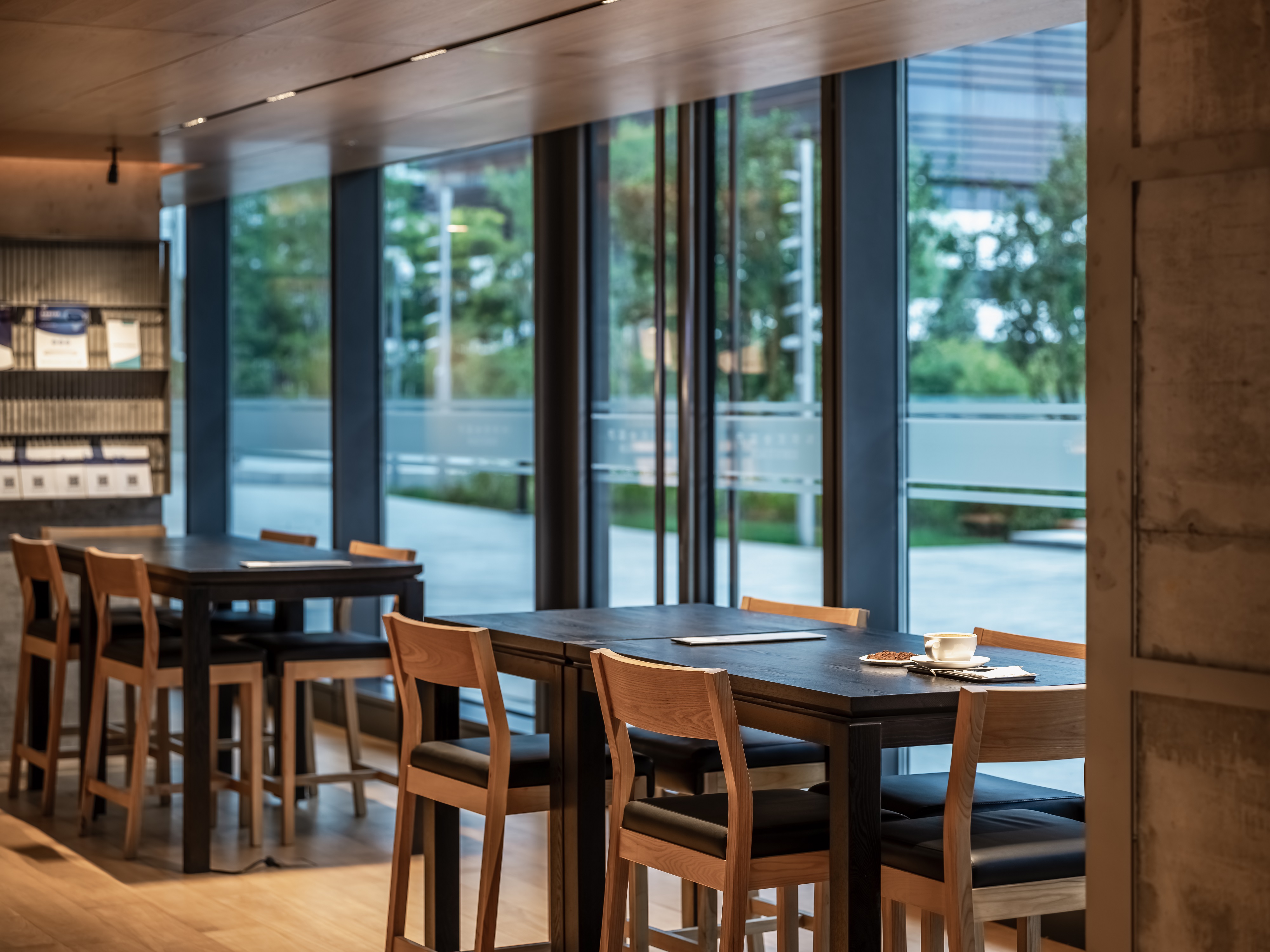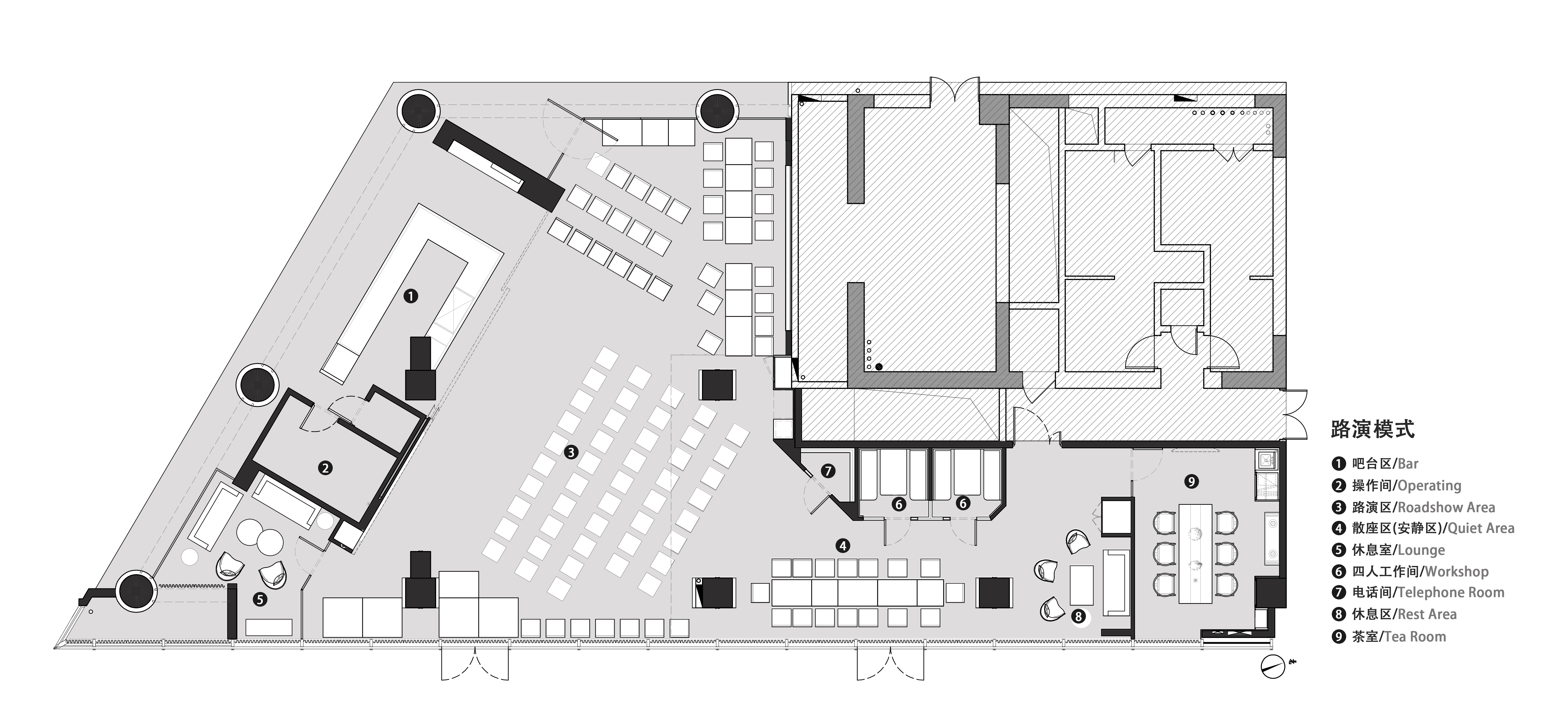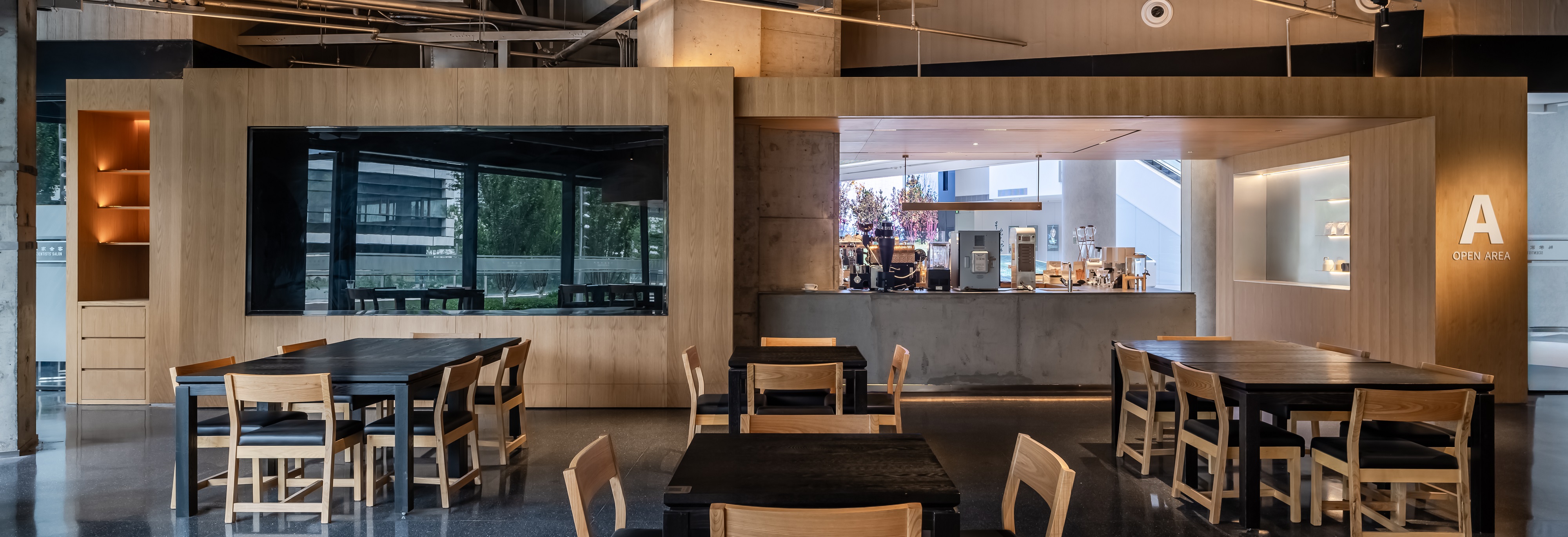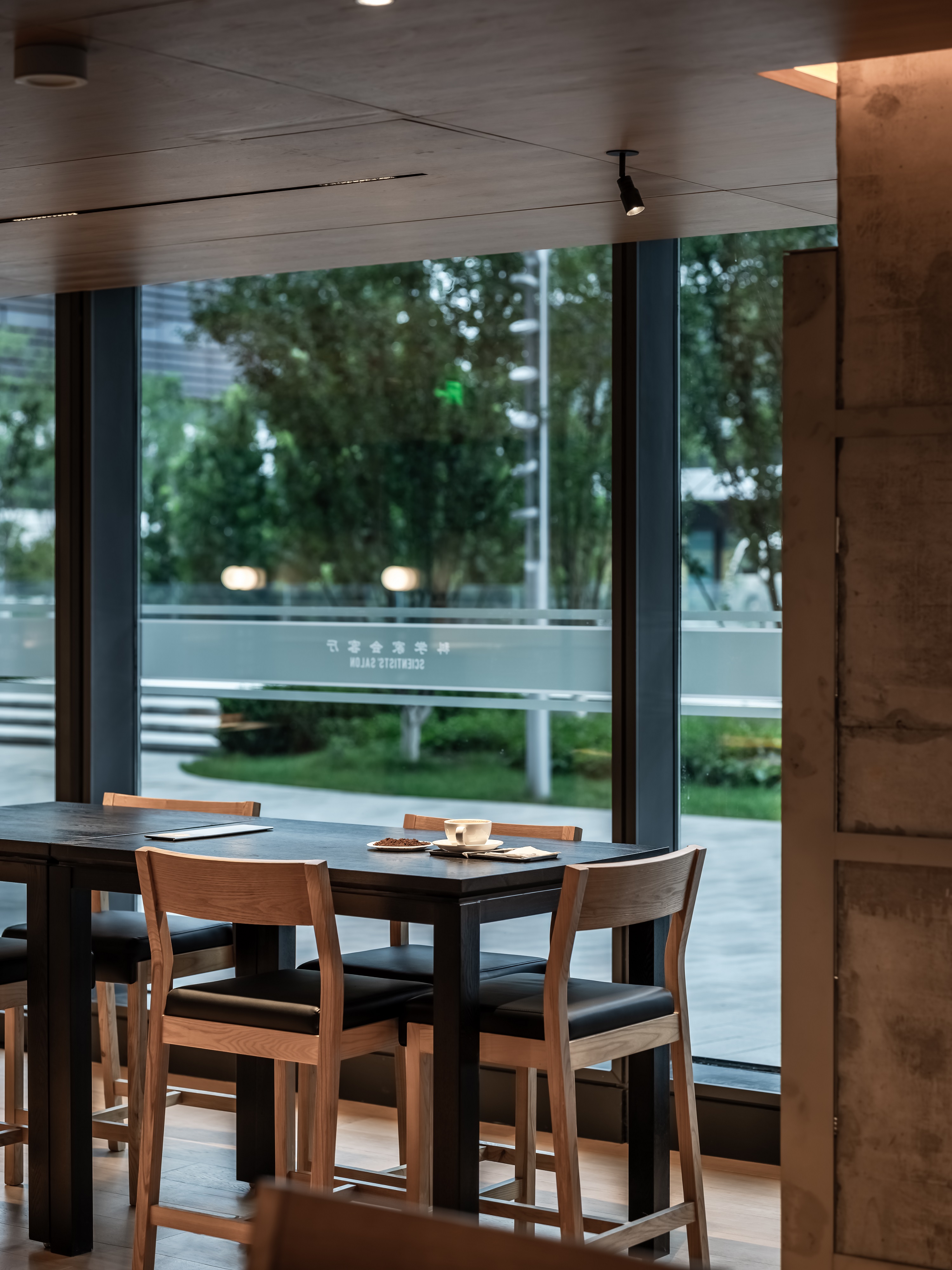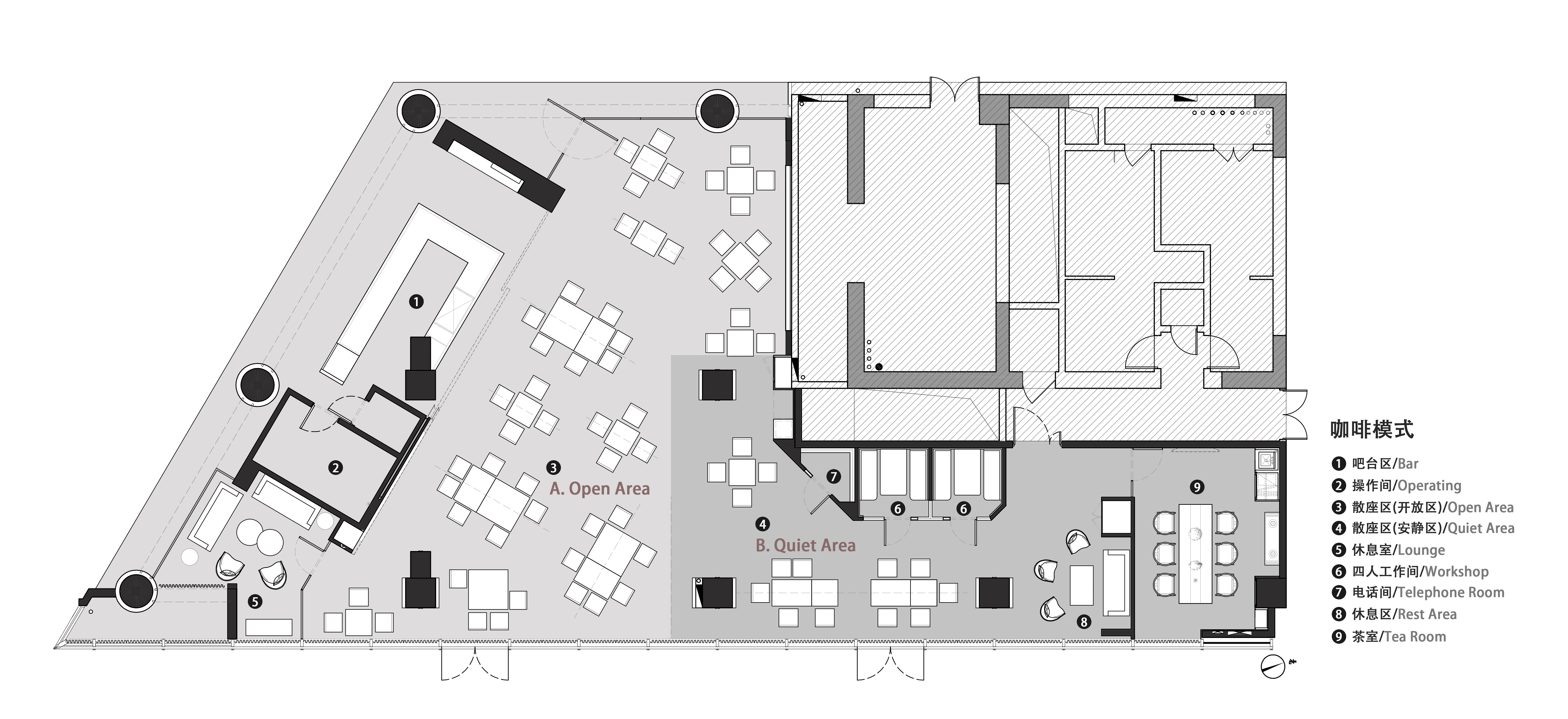 空间意境:空间功能分区:基于人员的使用场景,将空间划分为 OPEN AREA(开放交流区)与 QUIET AREA(静谧休憩区)两大核心区域。开放交流区设置灵活组合的桌椅、互动展示墙,满足小组研讨、学术分享、团队协作等需求;静谧休憩区则以舒适的沙发、柔和的灯光营造宁静氛围,适配独处思考、短暂放松、轻量阅读等场景,实现功能与场景的精准匹配。