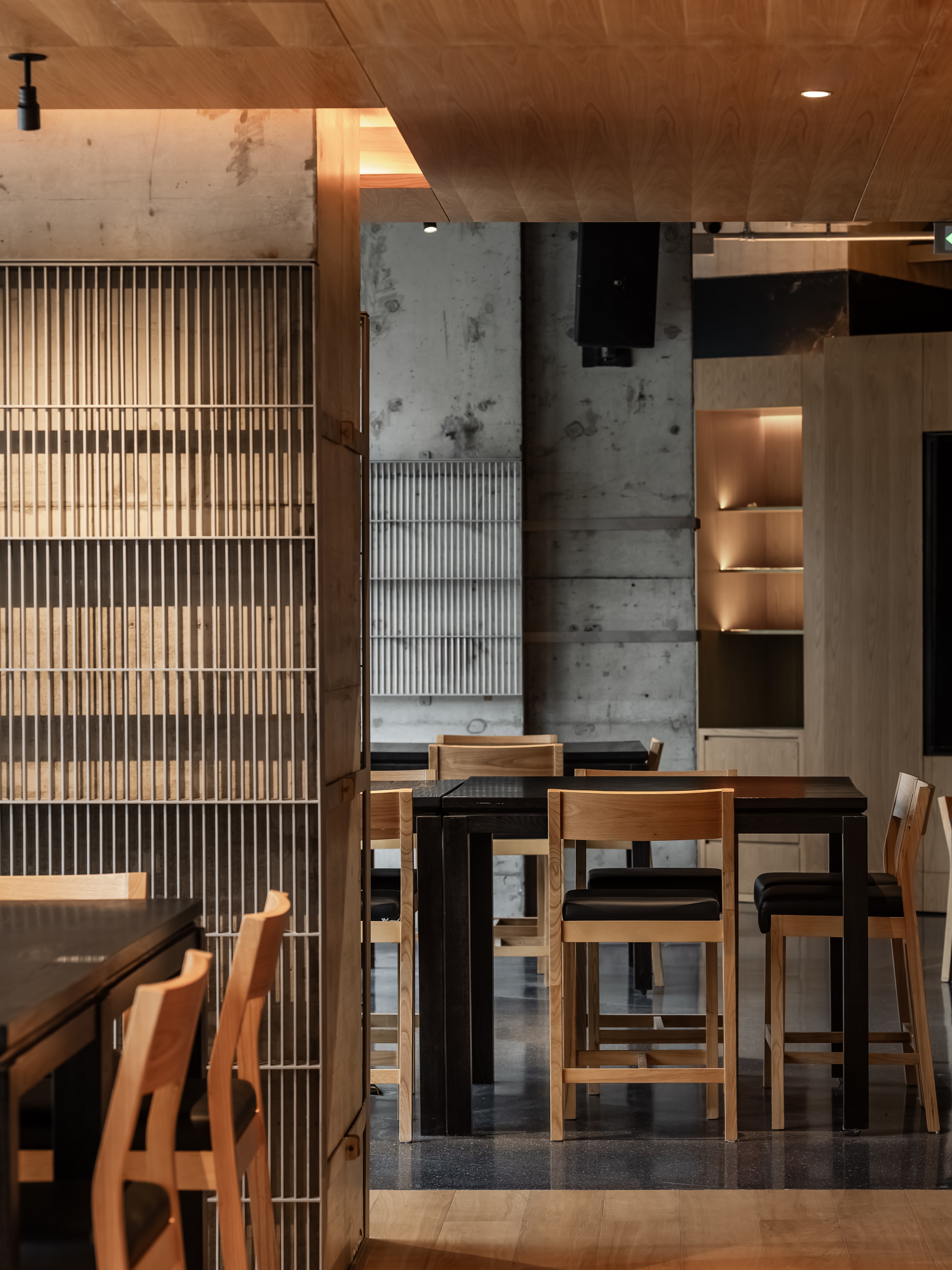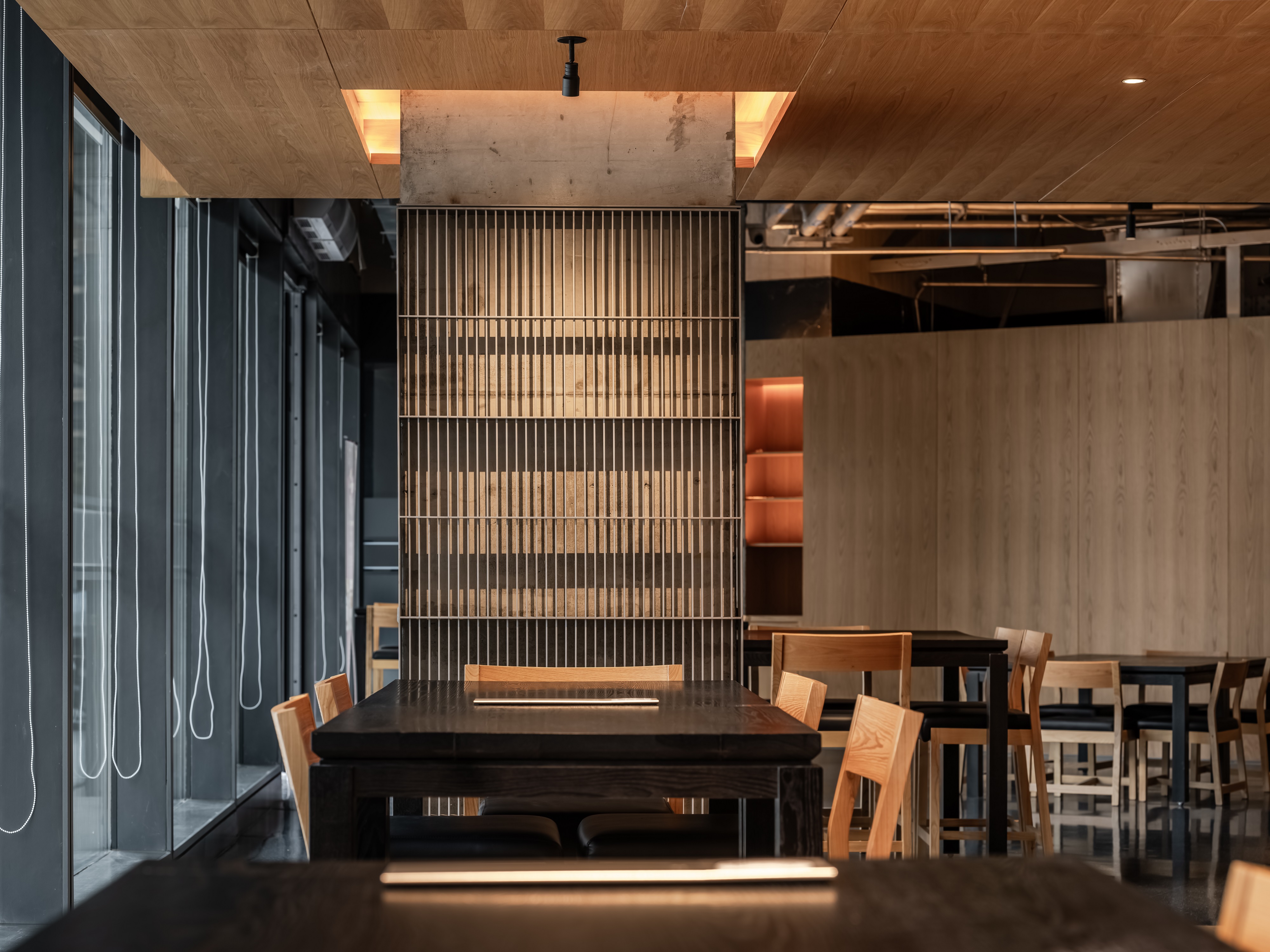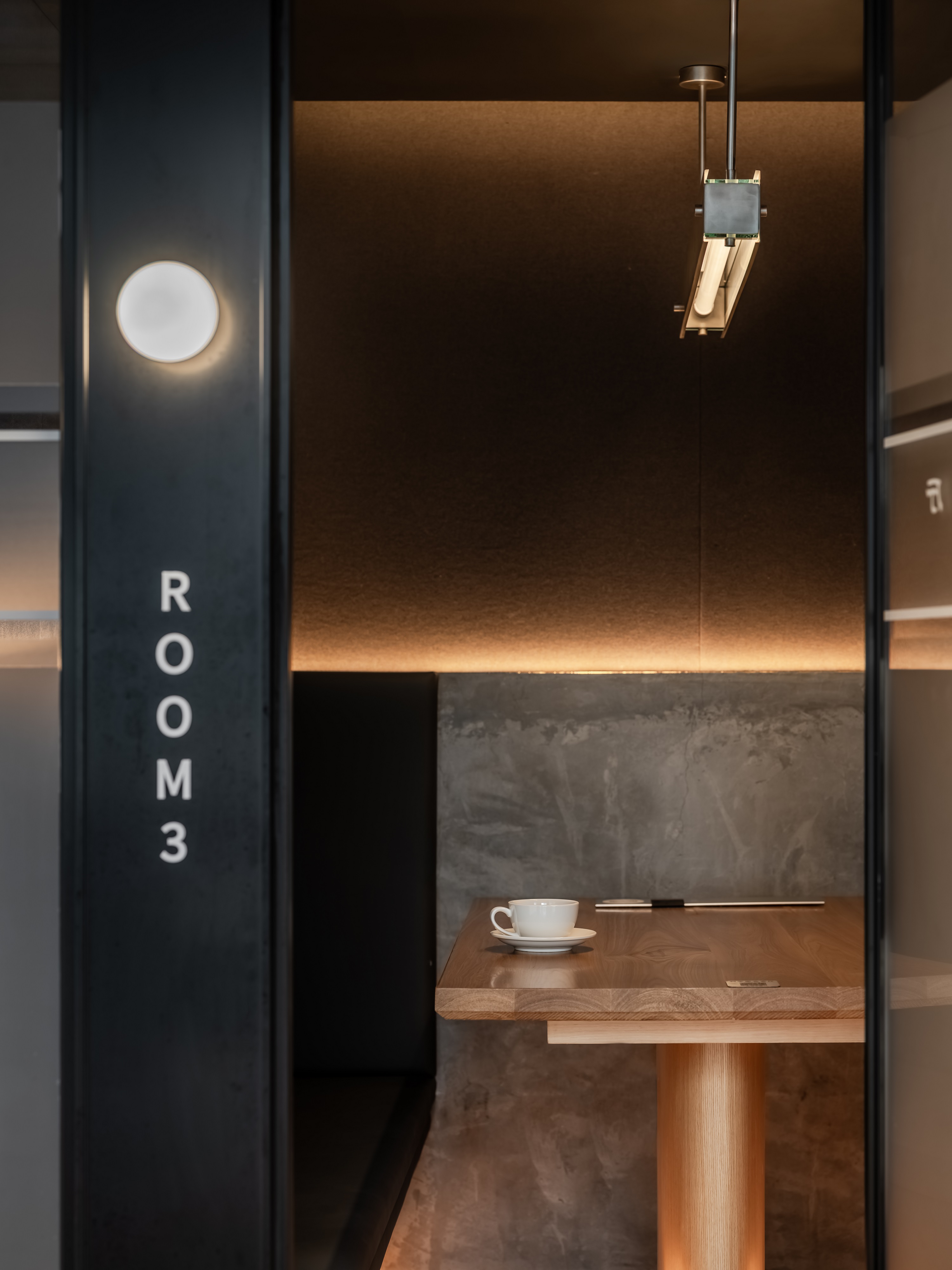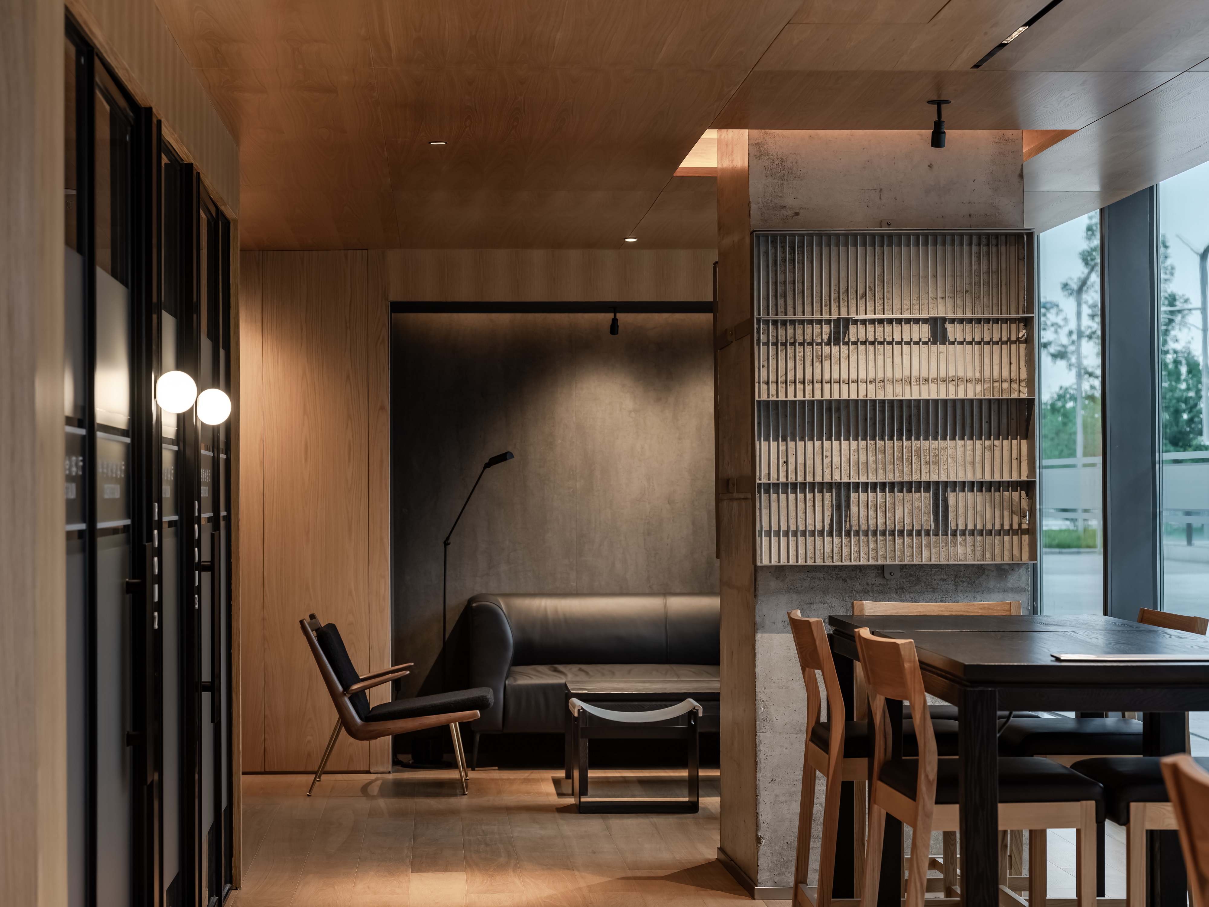墙面材质:环保乳胶漆 + 原木饰面板 + 局部磨砂玻璃