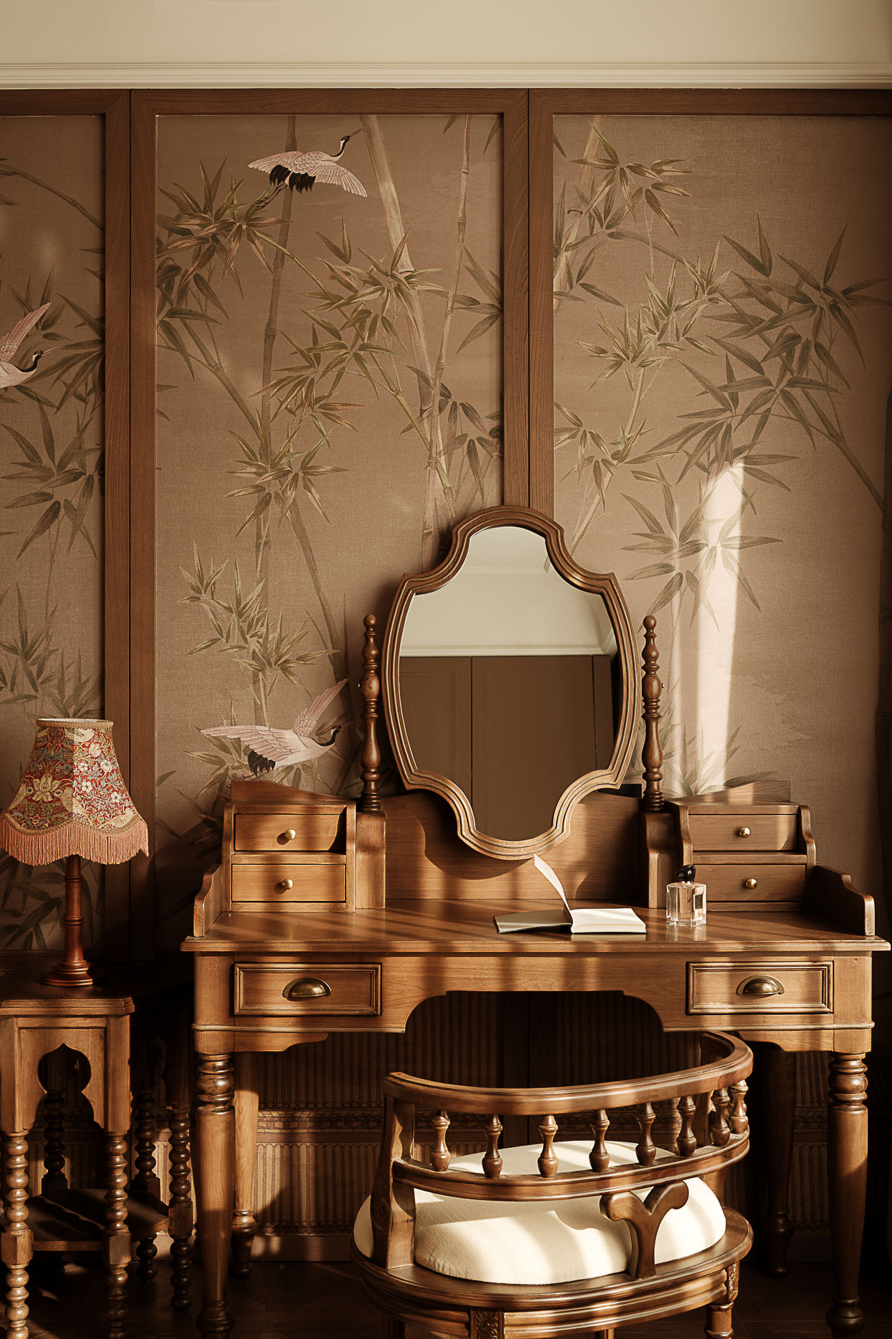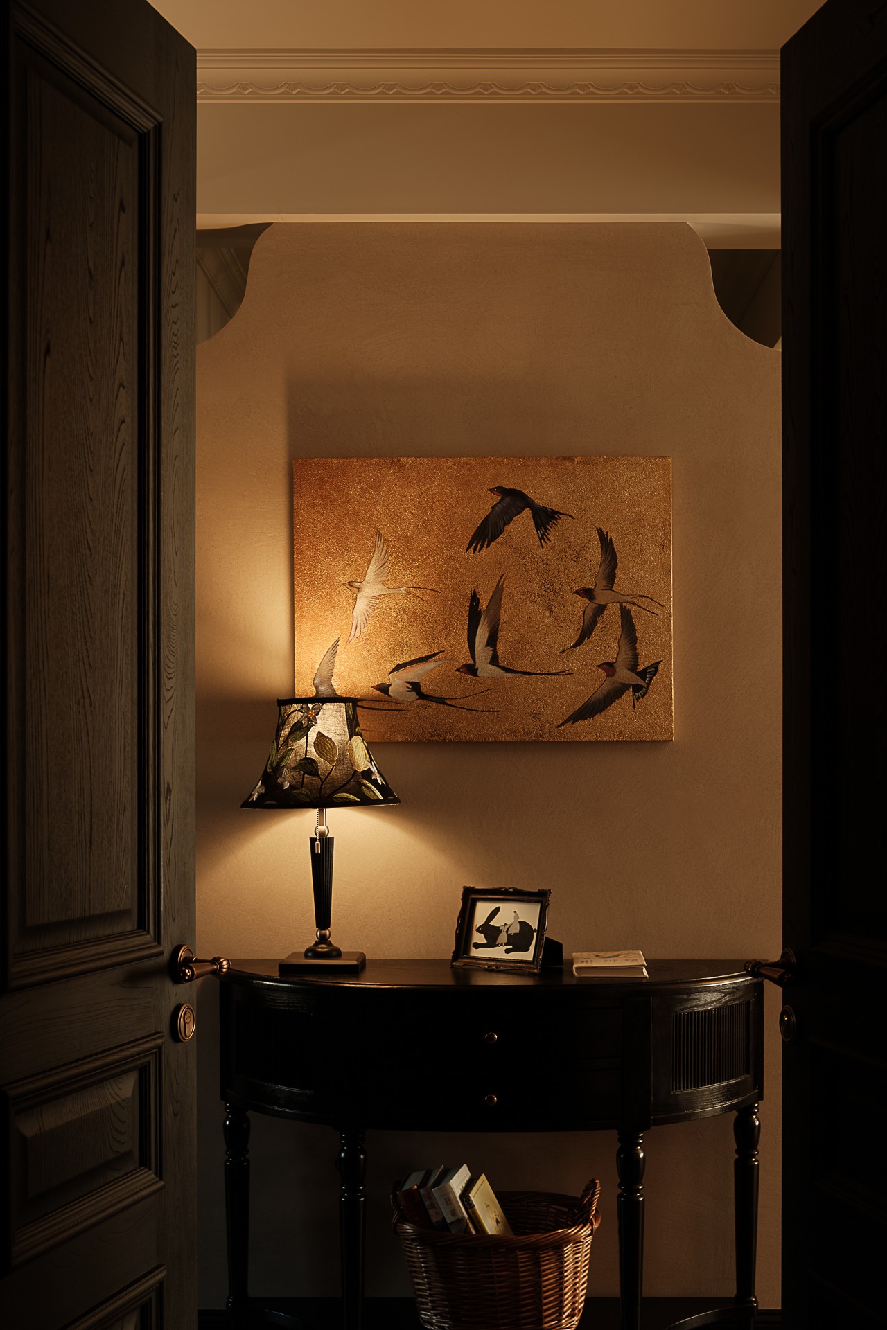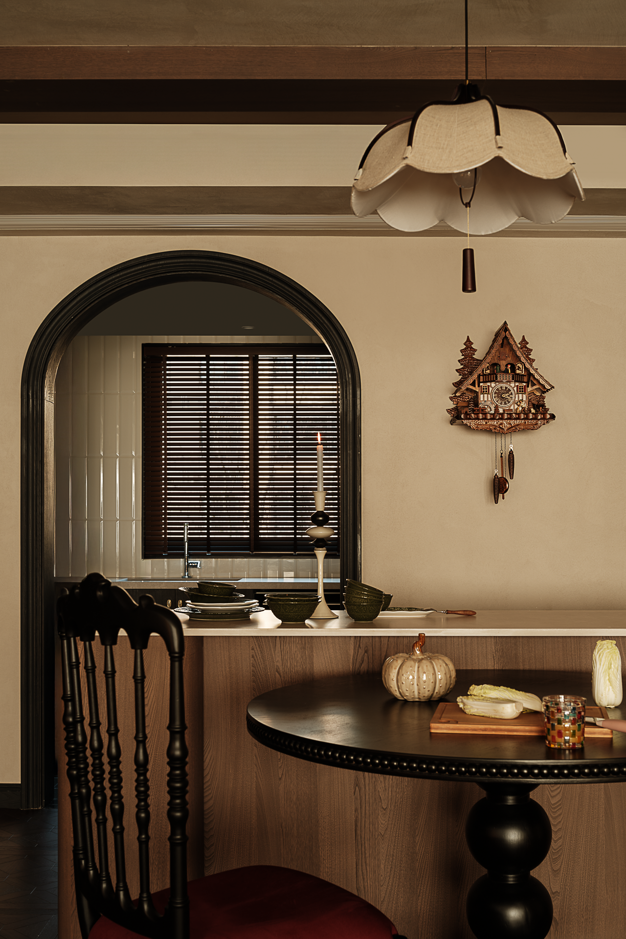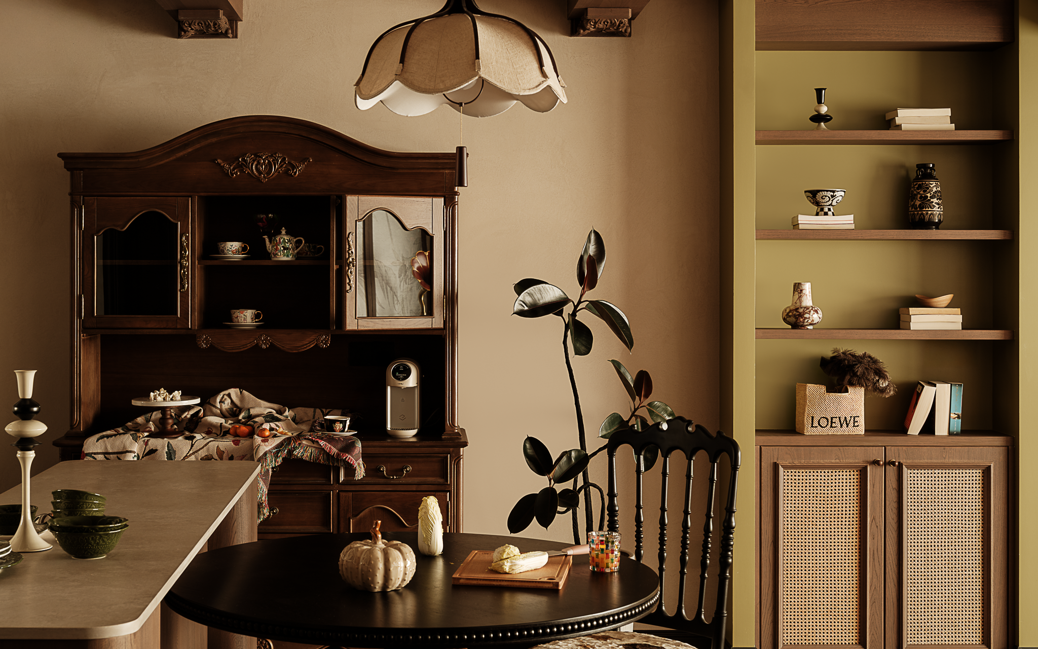 设计选材:复古雕花的实木餐边柜,既有功能性,又延伸出视觉美学,刻意保留的布艺与托盘,呼应美式农舍的质朴基因。藤编柜与实木开放格架碰撞出日常对话。当晨光穿过窗格,坐在圆桌前啜饮手冲咖啡,看光线在做旧地板与美式浮雕柜体之间缓慢位移,仿佛连时光都沉浸在这杯烟火气的拿铁里。