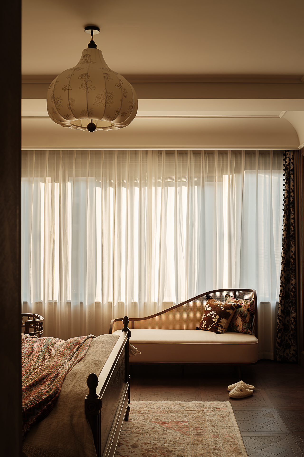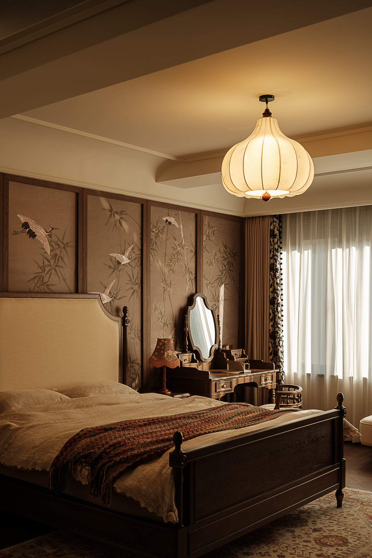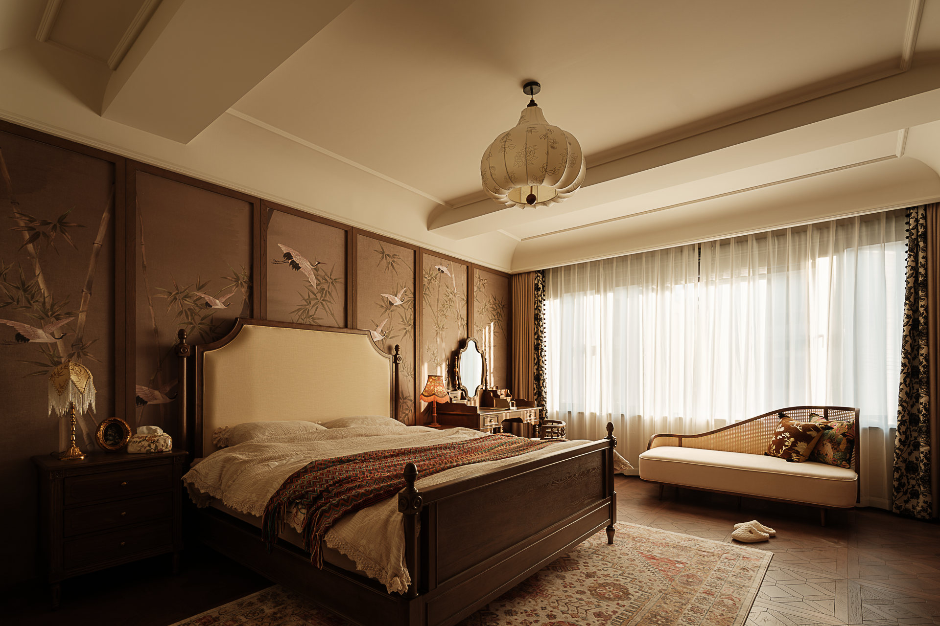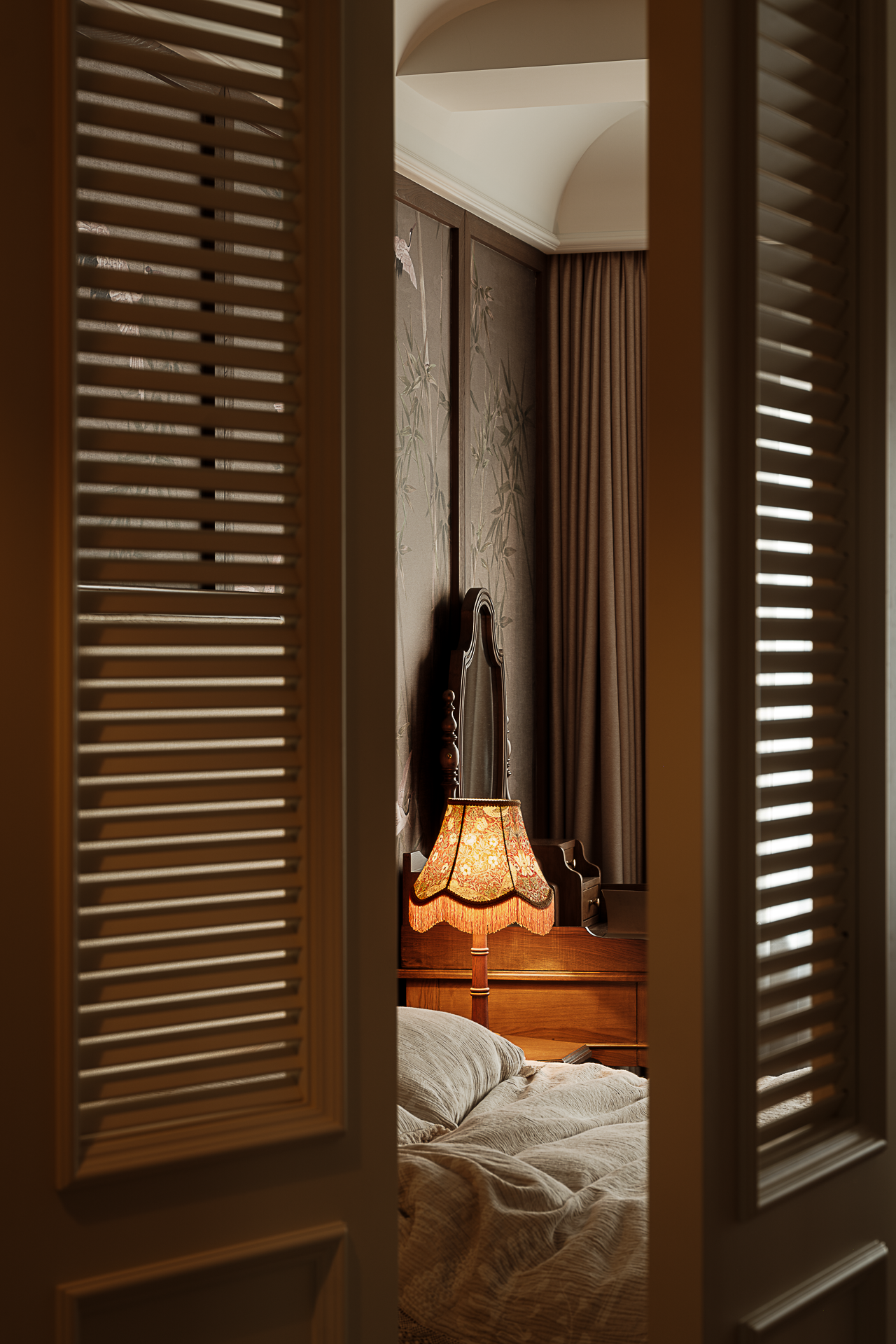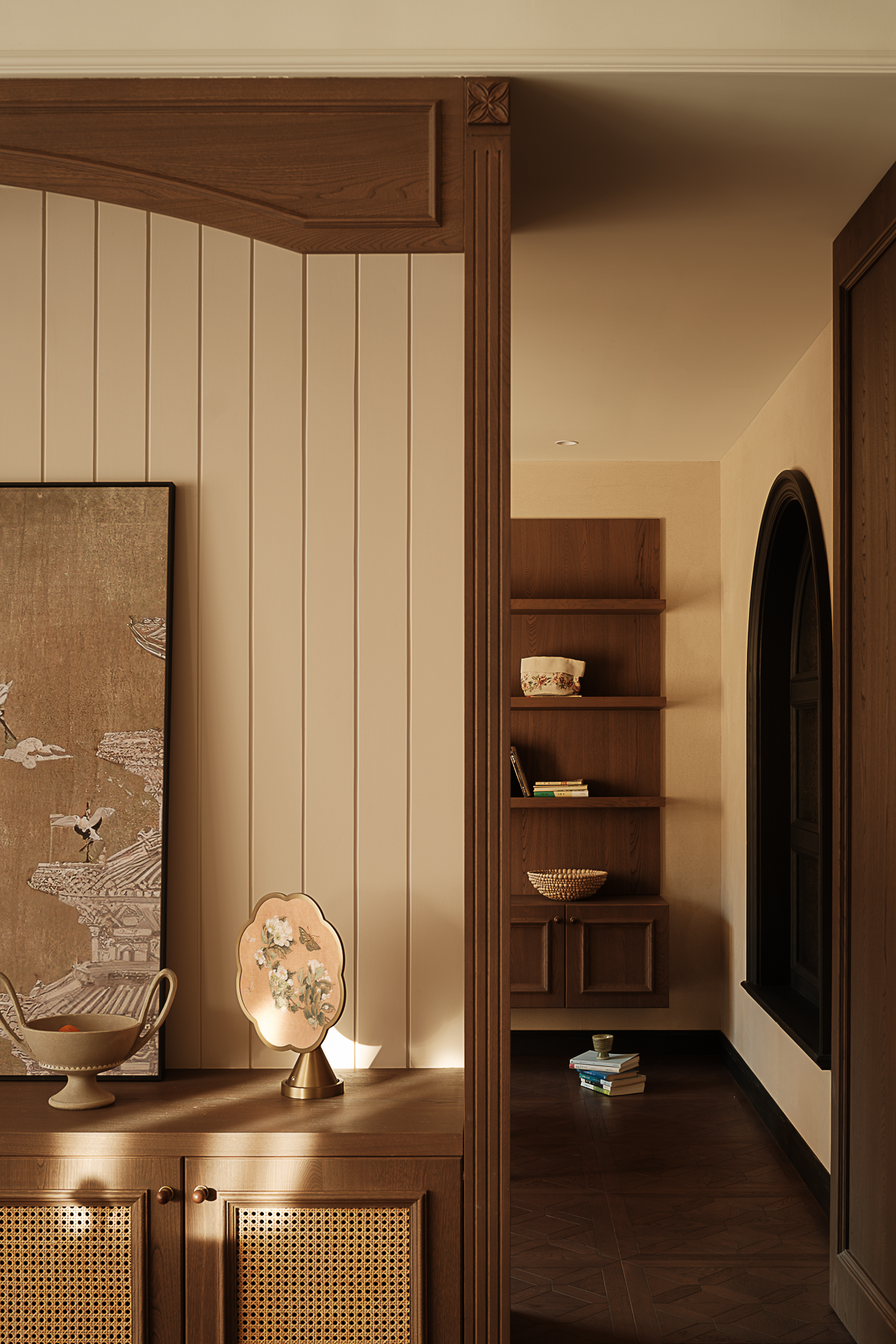 项目定位:本案是一座以“时空折叠”为精神内核的美式复古宅邸,设计师解构古典建筑语汇——拱券的仪式感、梁架的节奏感、穹顶的包裹感——与现代居住需求达成微妙平衡,让厚重木作与轻盈窗幔在空间中跳起探戈。