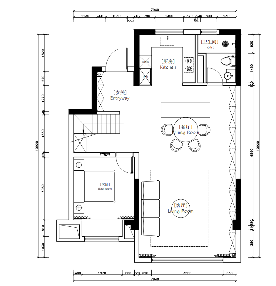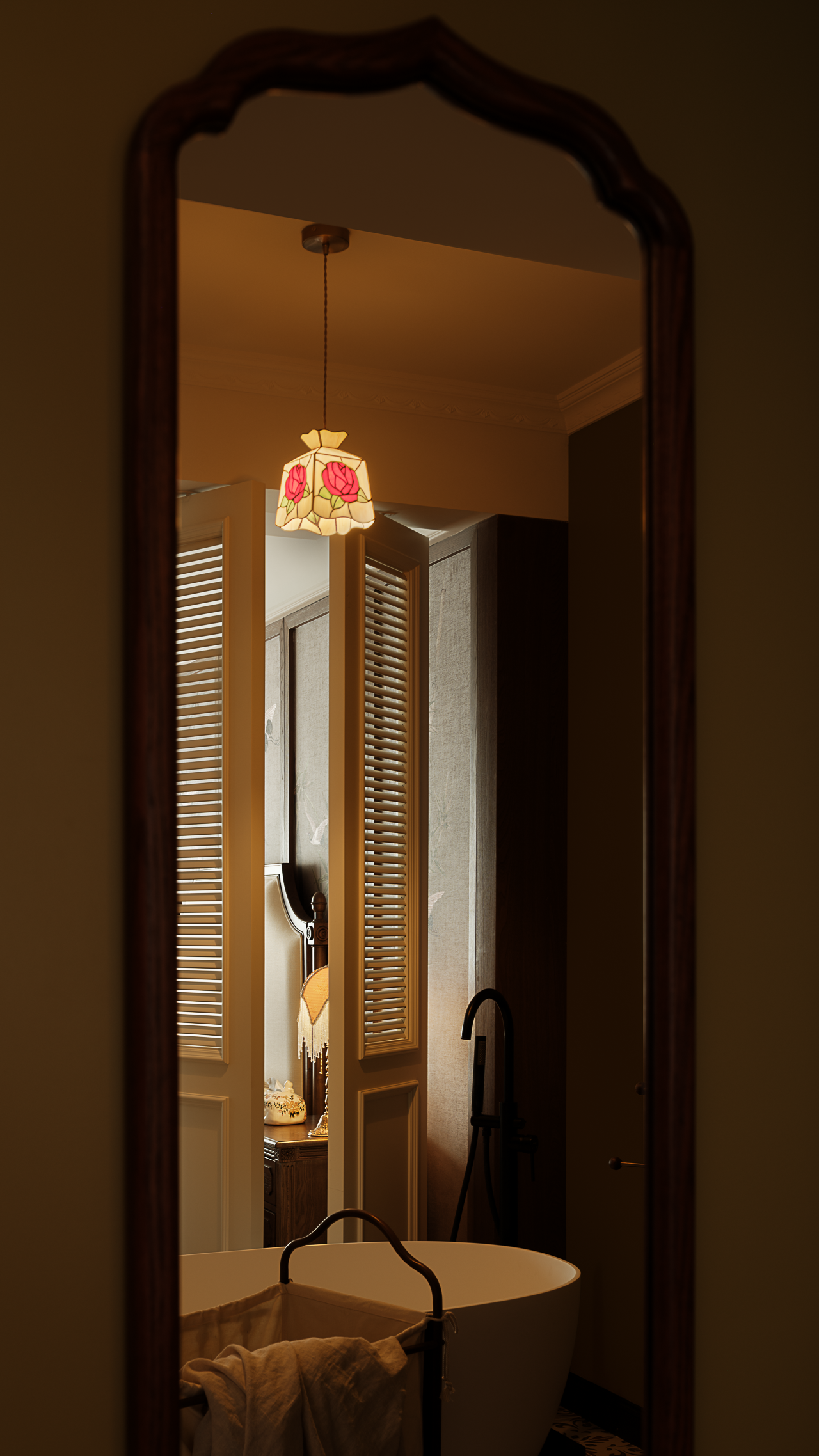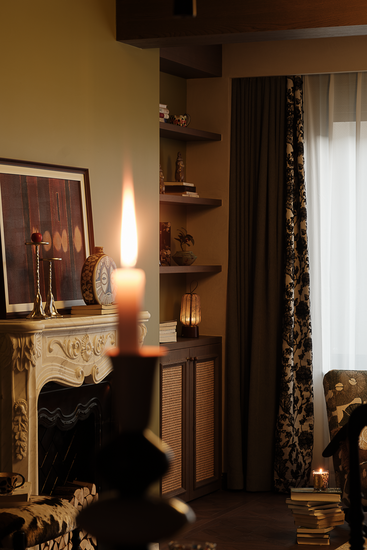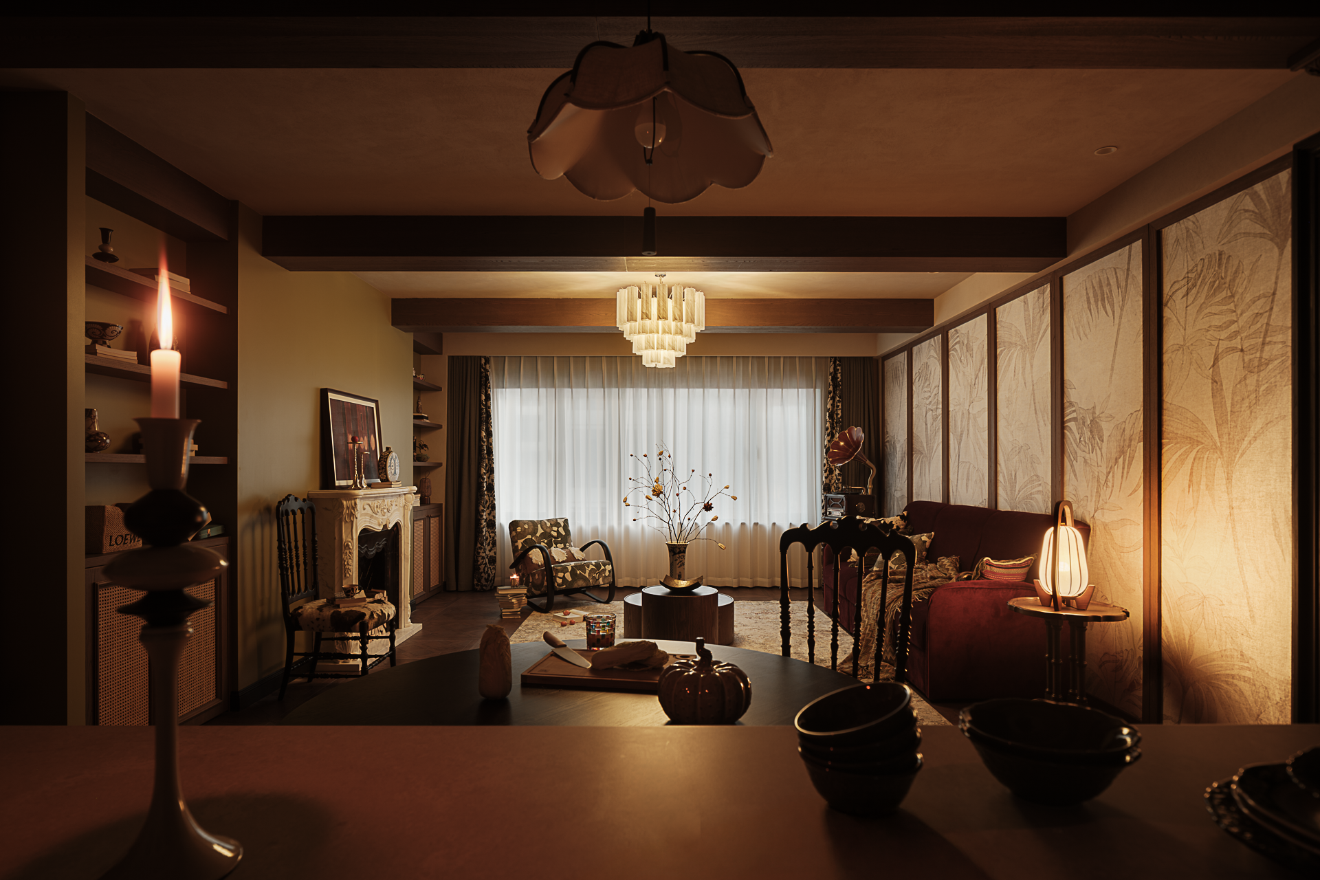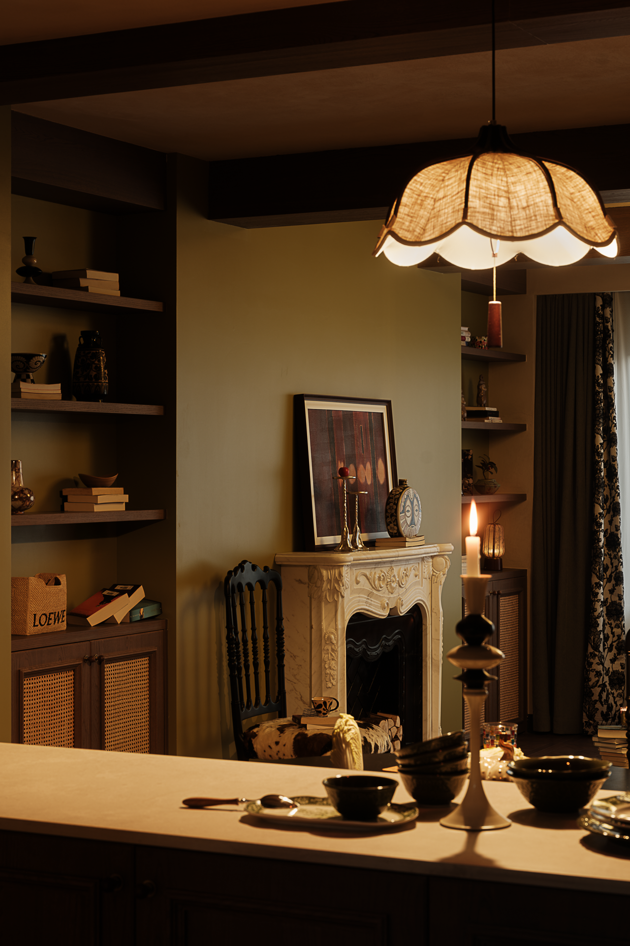 空间布局:白色雕花壁炉为空间点燃了复古激情,当夜幕降临,烛光燃气,蜷在单椅里,任壁炉光影在手里的书本上流转。顶部垂落的玻璃吊灯将复古花纹投射在地板上忽明忽暗,静态空间生出流动诗意的轨迹。