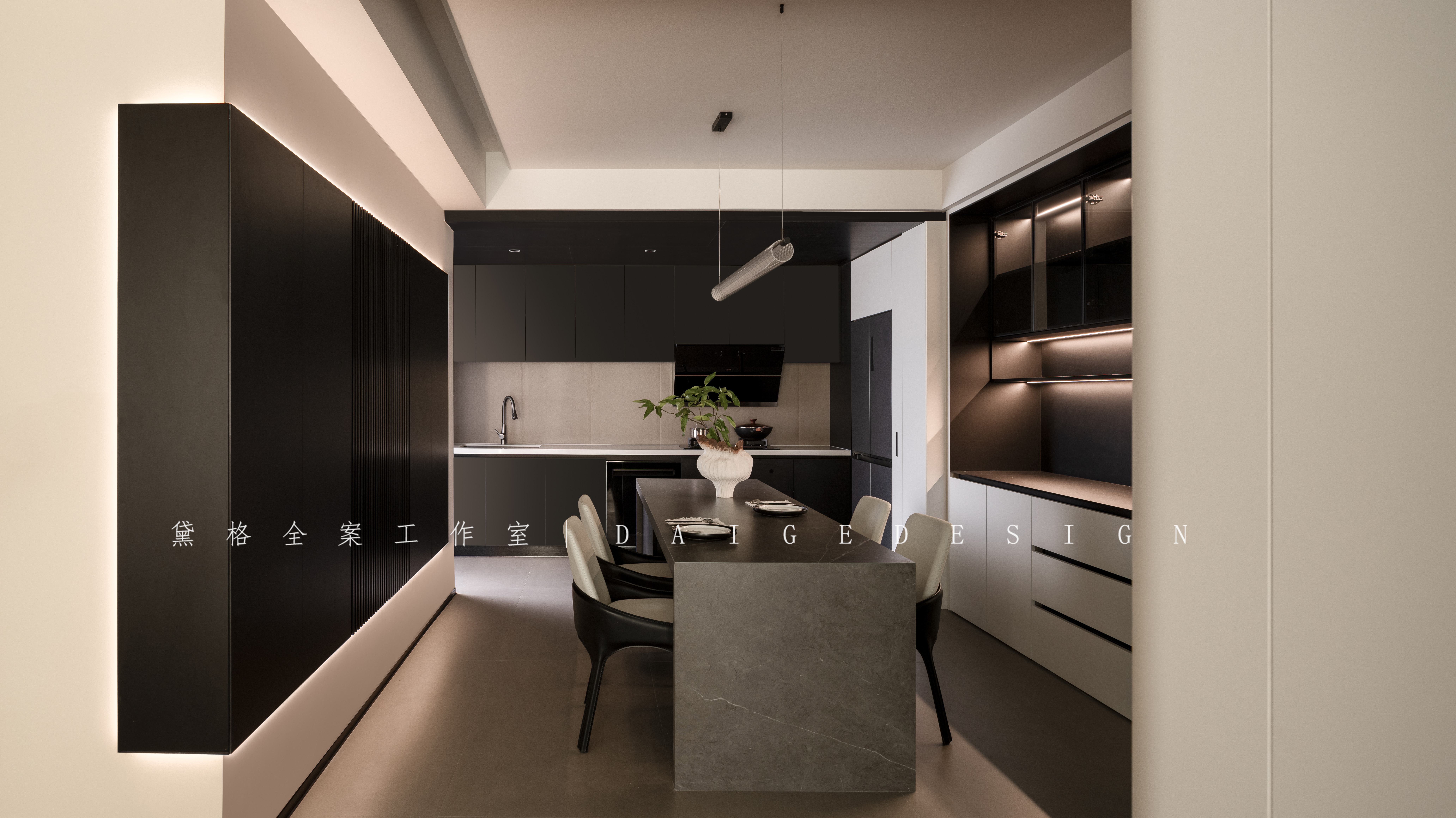 空间意境:材质混搭的反差创新:跳出单一的“水泥+金属”工业质感,尝试软质与硬质材质的碰撞,比如哑光黑岩板台面搭配浅灰色羊毛地毯、白色肤感柜门拼接深灰色拉丝不锈钢收边,用肌理反差强化空间质感,同时兼顾实用触感。
