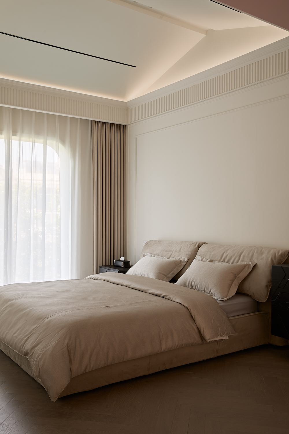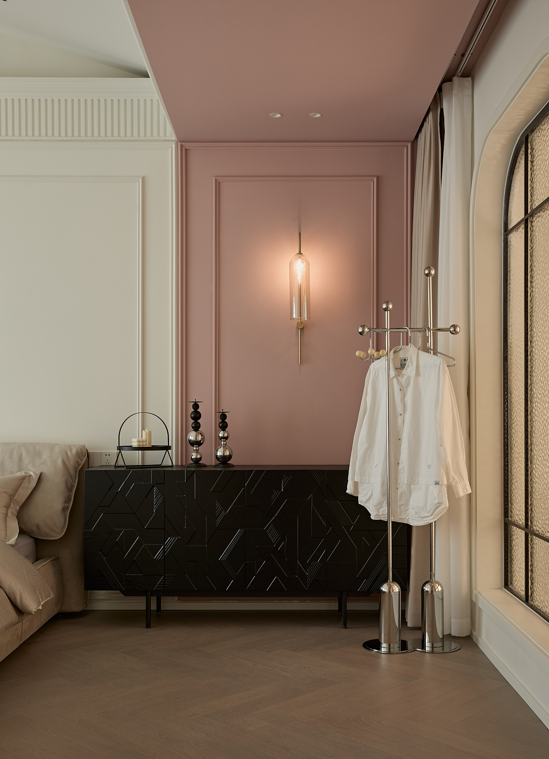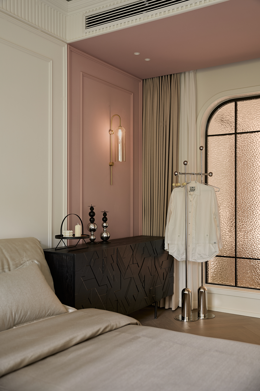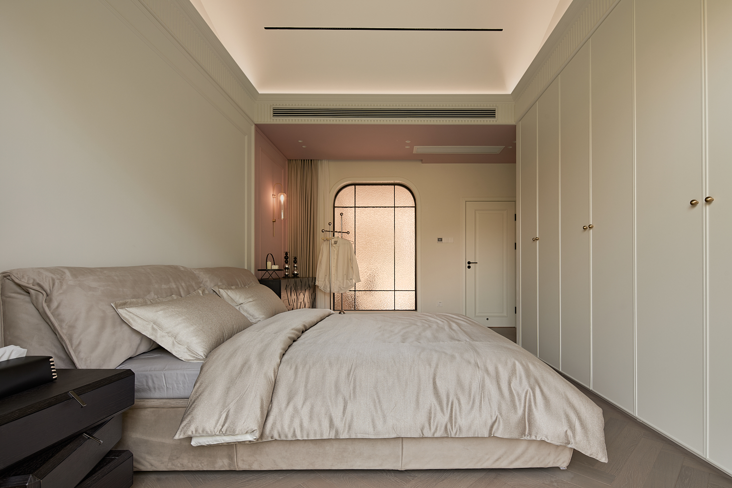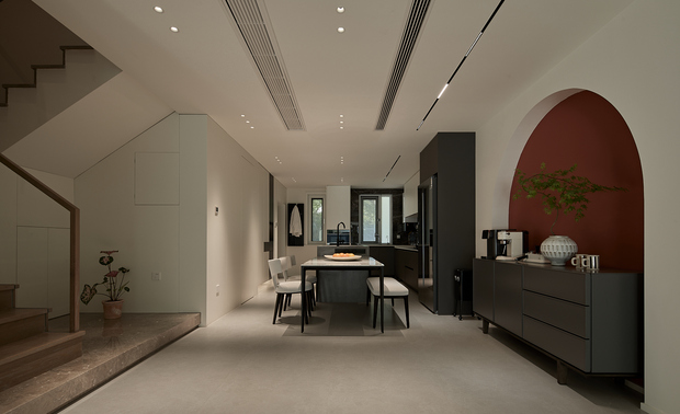 空间意境:打破单一风格的局限,以现代极简为底,轻法式优雅为韵的风格融合。公共会客区以米白、浅灰为基础色调,搭配深灰、勃艮第红做局部跳色,用极简线条加无主灯设计构建利落框架,再以弧形门洞、金属线条等柔化细节,平衡理性秩序与感性温度;私密生活区注入低饱和度的柔粉、暖杏等色调,结合丝绒、玻璃等材质,叠加石膏线、弧形床头等轻法式元素,既保留现代空间的整洁,又赋予私密场域的温柔松弛感。