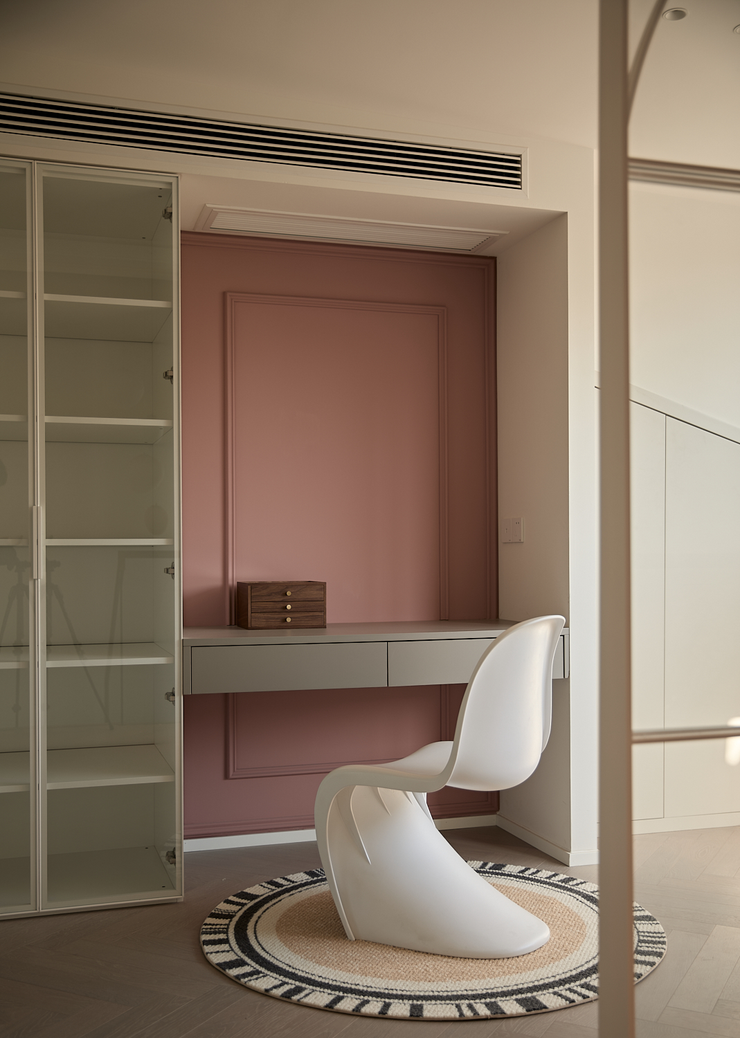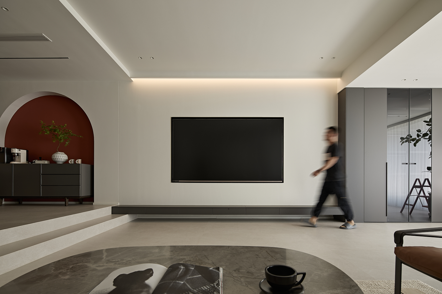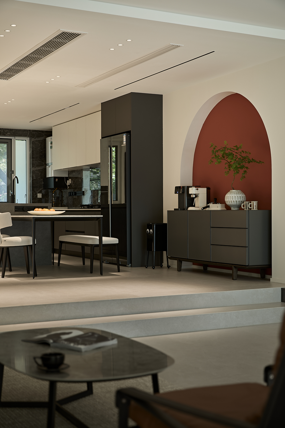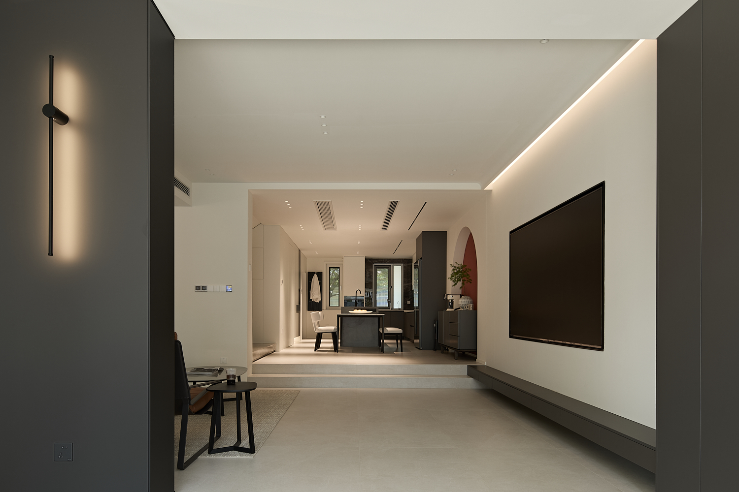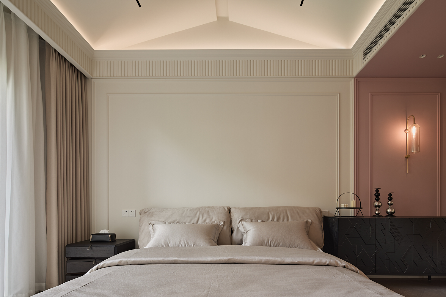 空间意境:打破单一风格的局限,以现代极简为底,轻法式优雅为韵的风格融合。公共会客区以米白、浅灰为基础色调,搭配深灰、勃艮第红做局部跳色,用极简线条加无主灯设计构建利落框架,再以弧形门洞、金属线条等柔化细节,平衡理性秩序与感性温度;私密生活区注入低饱和度的柔粉、暖杏等色调,结合丝绒、玻璃等材质,叠加石膏线、弧形床头等轻法式元素,既保留现代空间的整洁,又赋予私密场域的温柔松弛感。