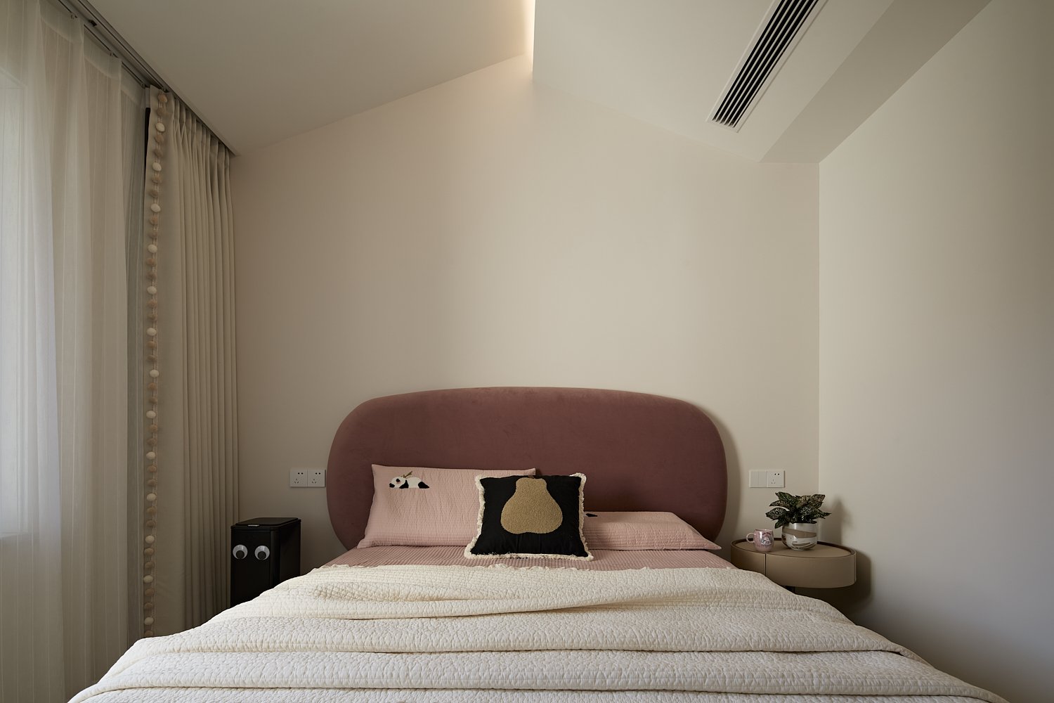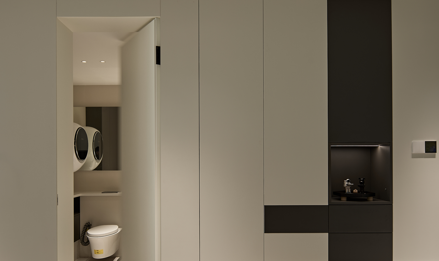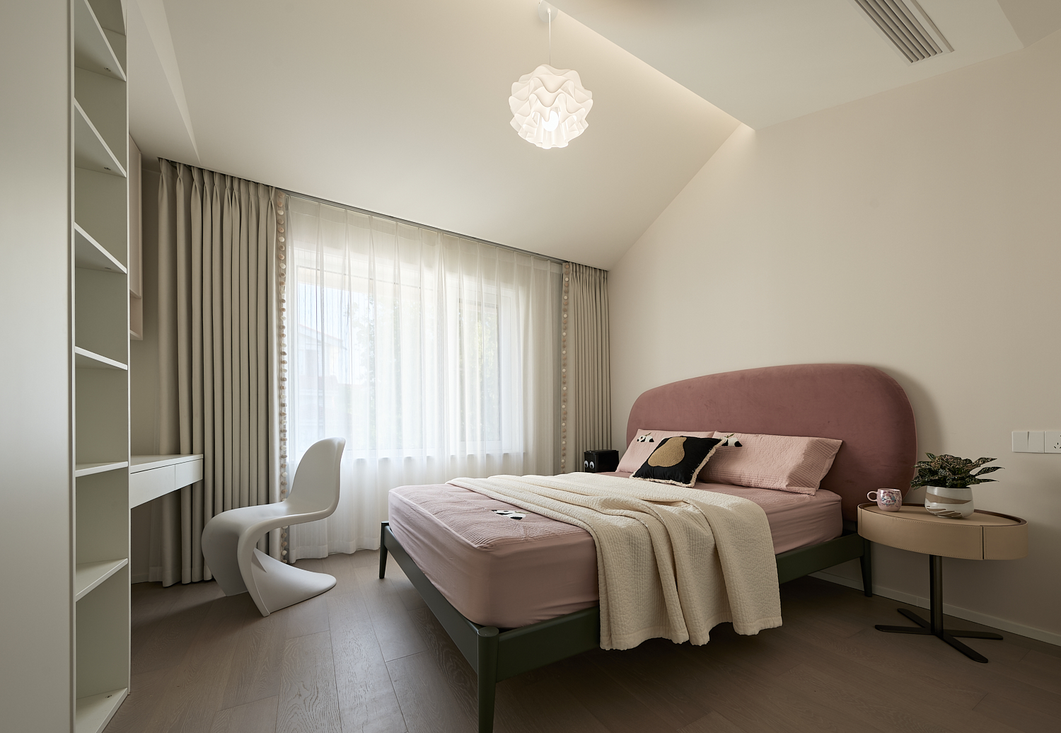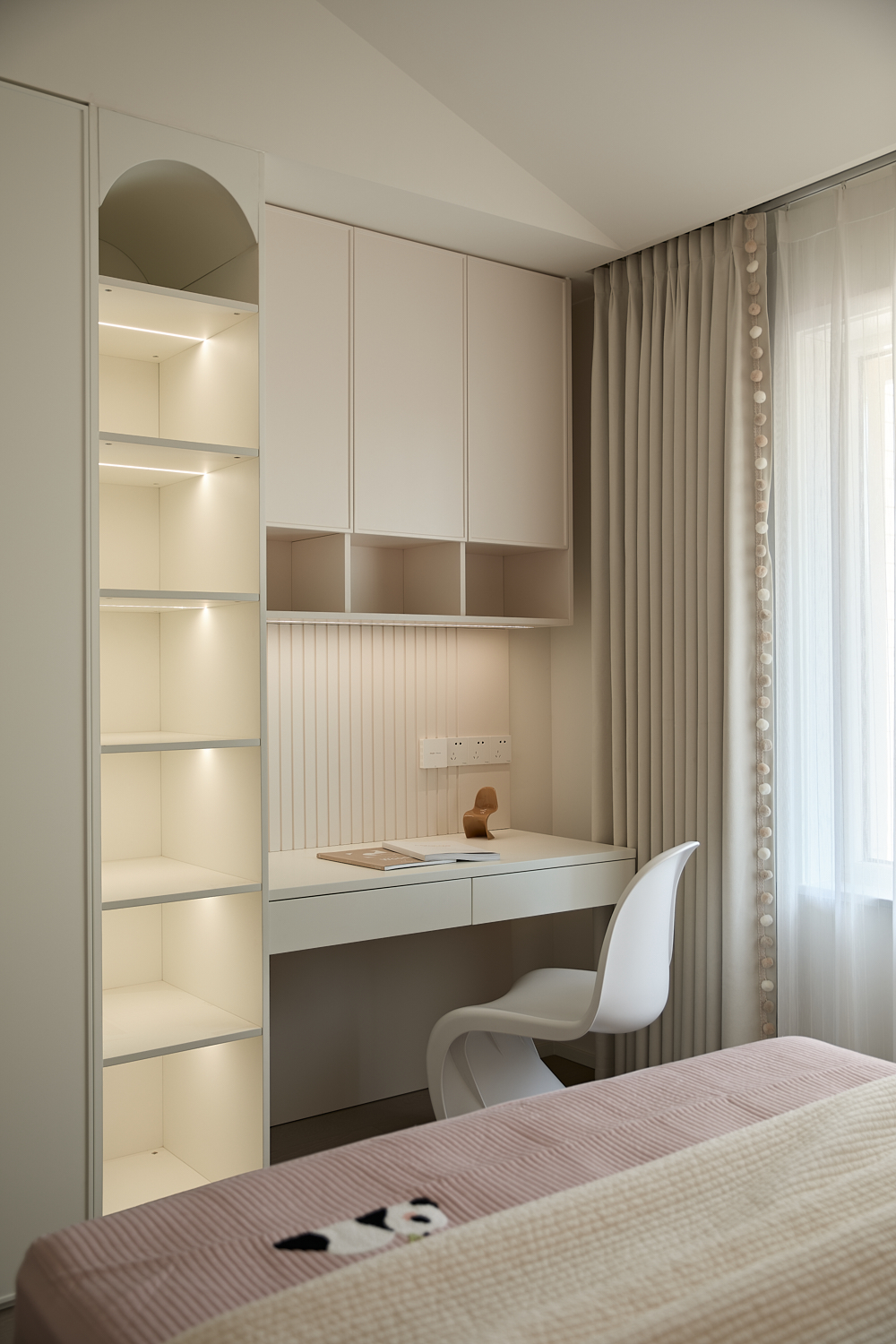 空间意境:打破单一风格的局限,以现代极简为底,轻法式优雅为韵的风格融合。公共会客区以米白、浅灰为基础色调,搭配深灰、勃艮第红做局部跳色,用极简线条加无主灯设计构建利落框架,再以弧形门洞、金属线条等柔化细节,平衡理性秩序与感性温度;私密生活区注入低饱和度的柔粉、暖杏等色调,结合丝绒、玻璃等材质,叠加石膏线、弧形床头等轻法式元素,既保留现代空间的整洁,又赋予私密场域的温柔松弛感。