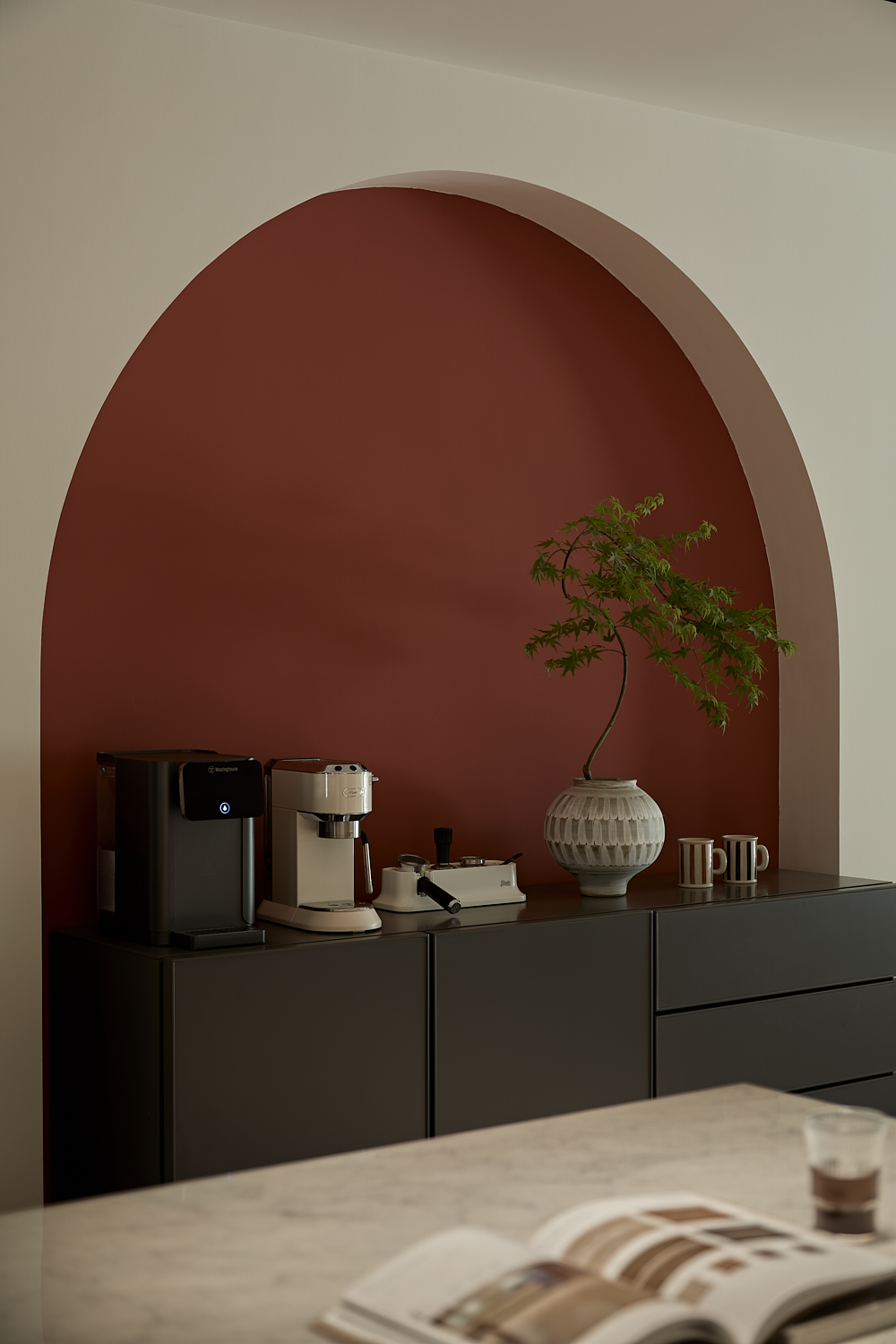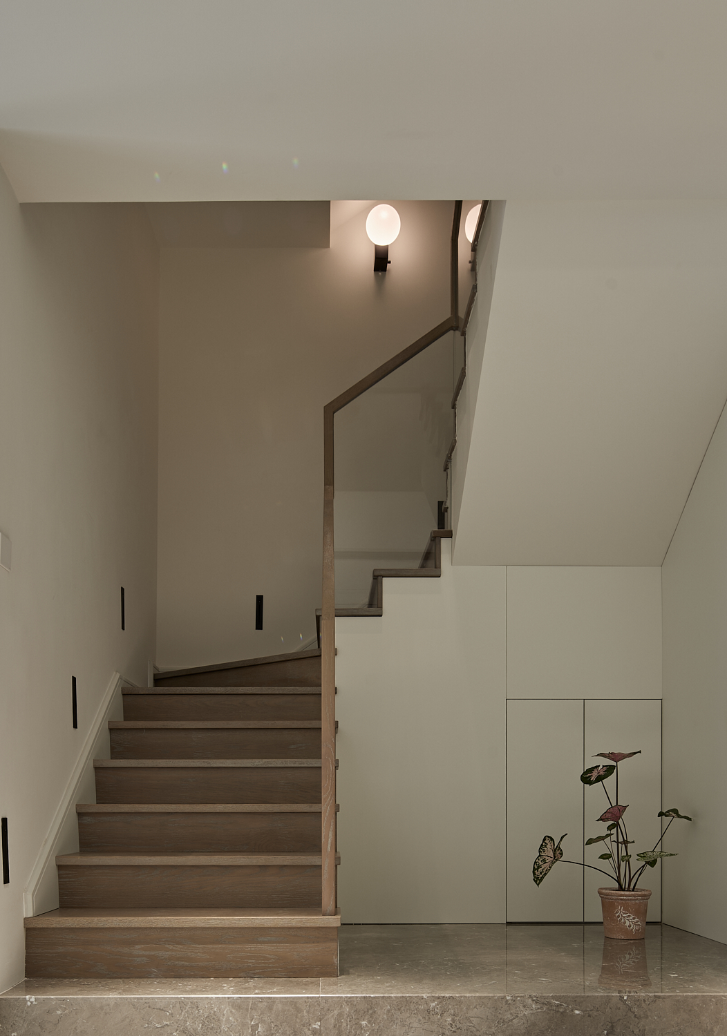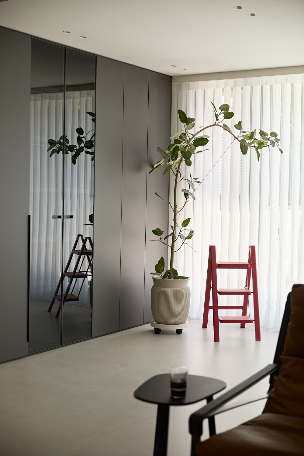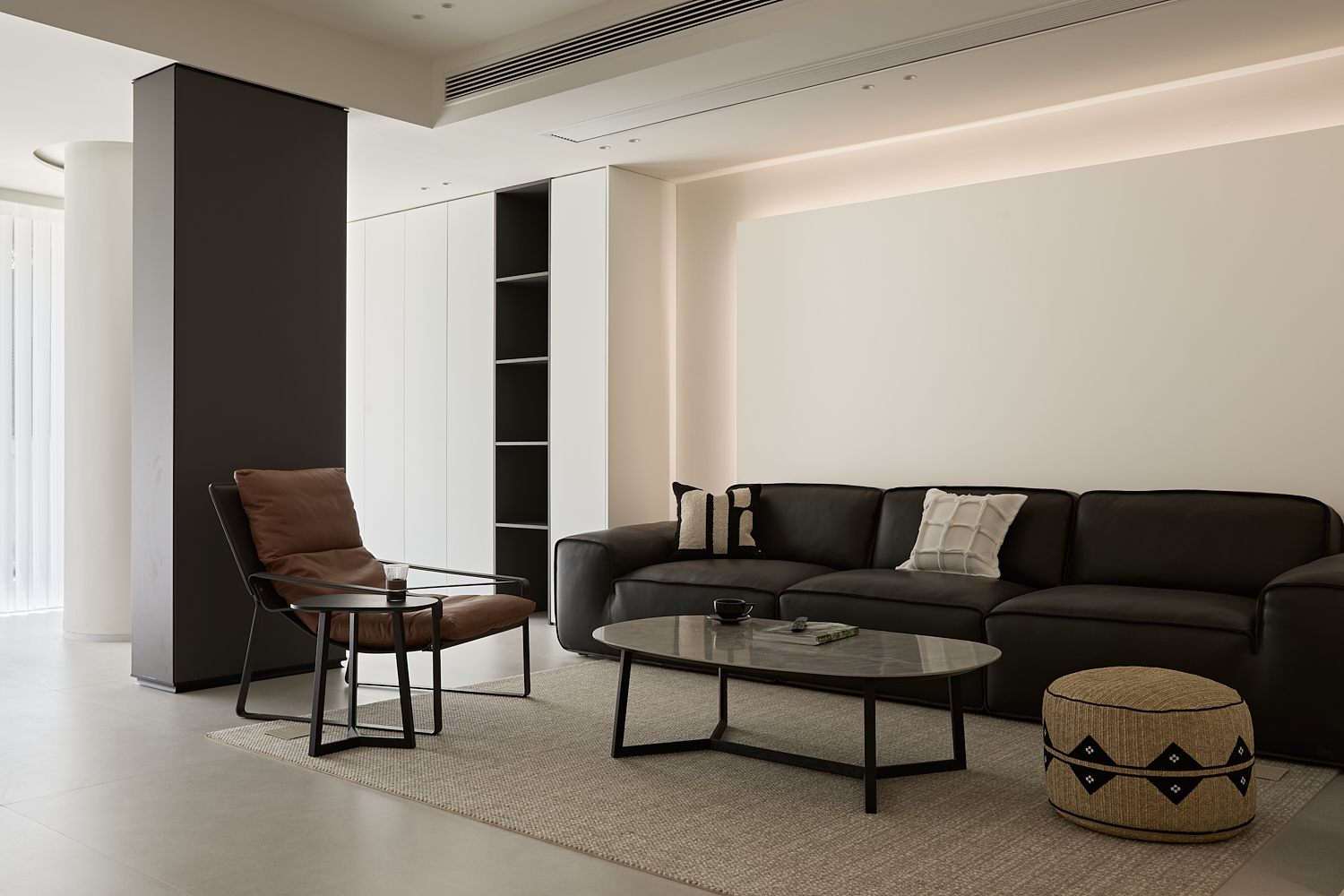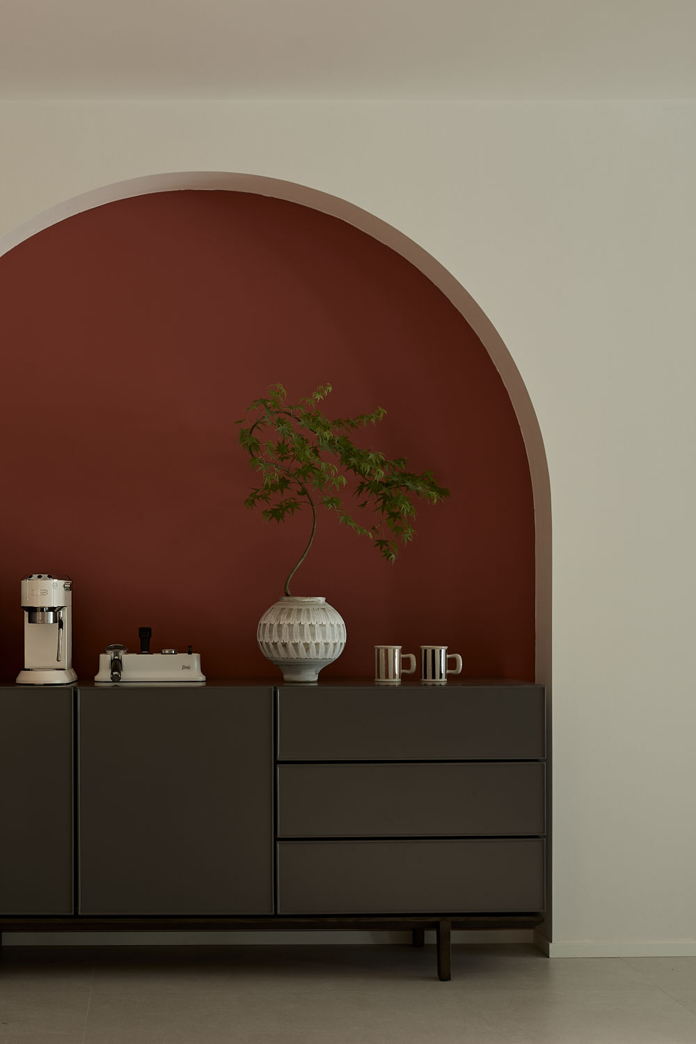 空间意境:打破单一风格的局限,以现代极简为底,轻法式优雅为韵的风格融合。公共会客区以米白、浅灰为基础色调,搭配深灰、勃艮第红做局部跳色,用极简线条加无主灯设计构建利落框架,再以弧形门洞、金属线条等柔化细节,平衡理性秩序与感性温度;私密生活区注入低饱和度的柔粉、暖杏等色调,结合丝绒、玻璃等材质,叠加石膏线、弧形床头等轻法式元素,既保留现代空间的整洁,又赋予私密场域的温柔松弛感。