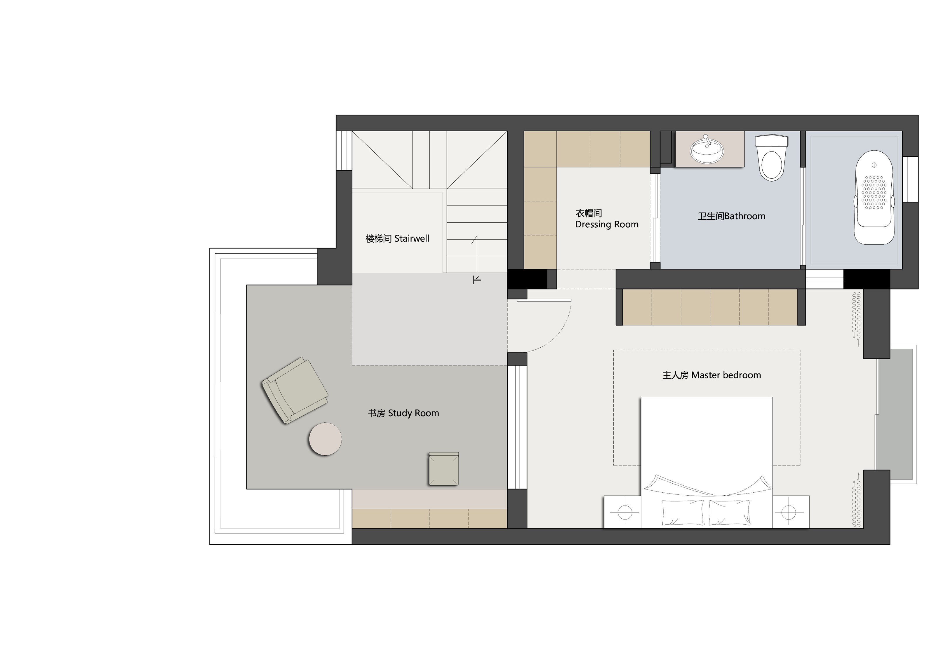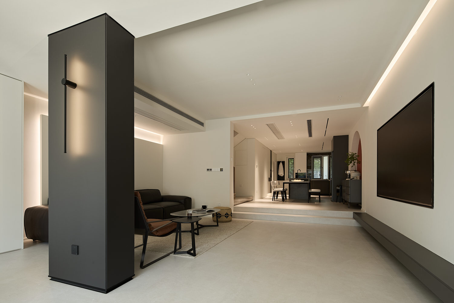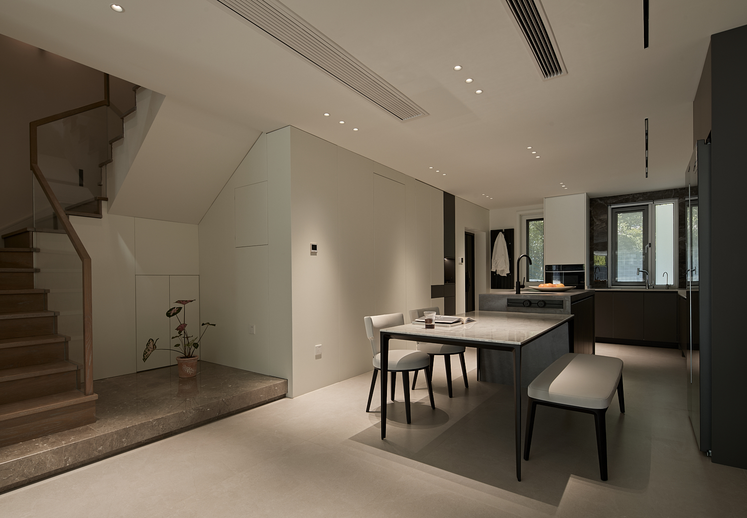 空间布局:以洄游动线与层级分区破解别墅空间的割裂感,客餐厨采用开放式连通,通过地面微高差划分功能区,既保持视觉通透,又强化空间层次;以客厅为核心,串联楼梯、书房、卧室等区域,形成无死角的洄游动线,提升空间利用率与动线流畅度;将书房、储物间嵌入,通过玻璃门、隐形门实现“功能隐身”,既保证空间整洁,又让功能区随需开合。