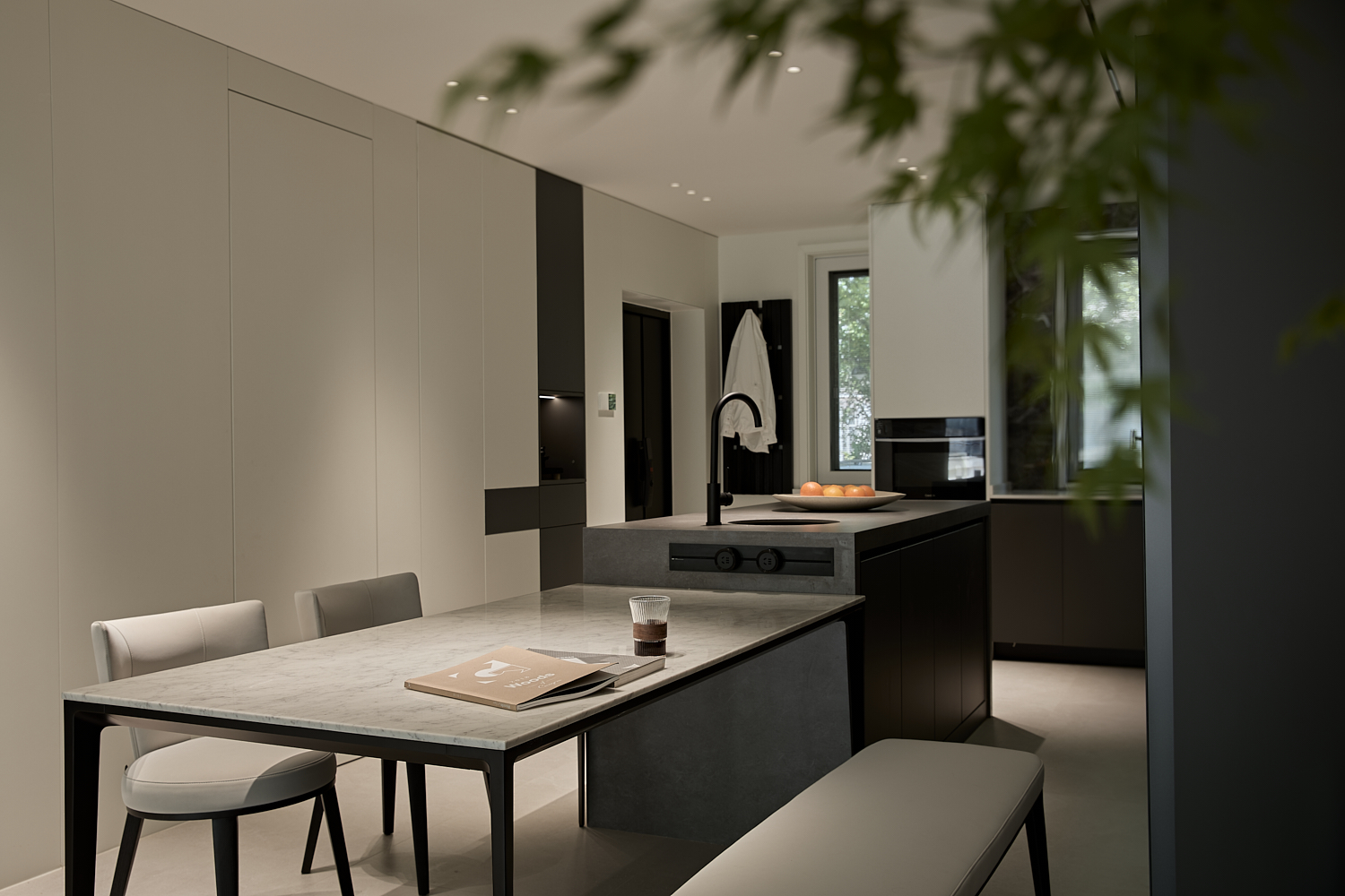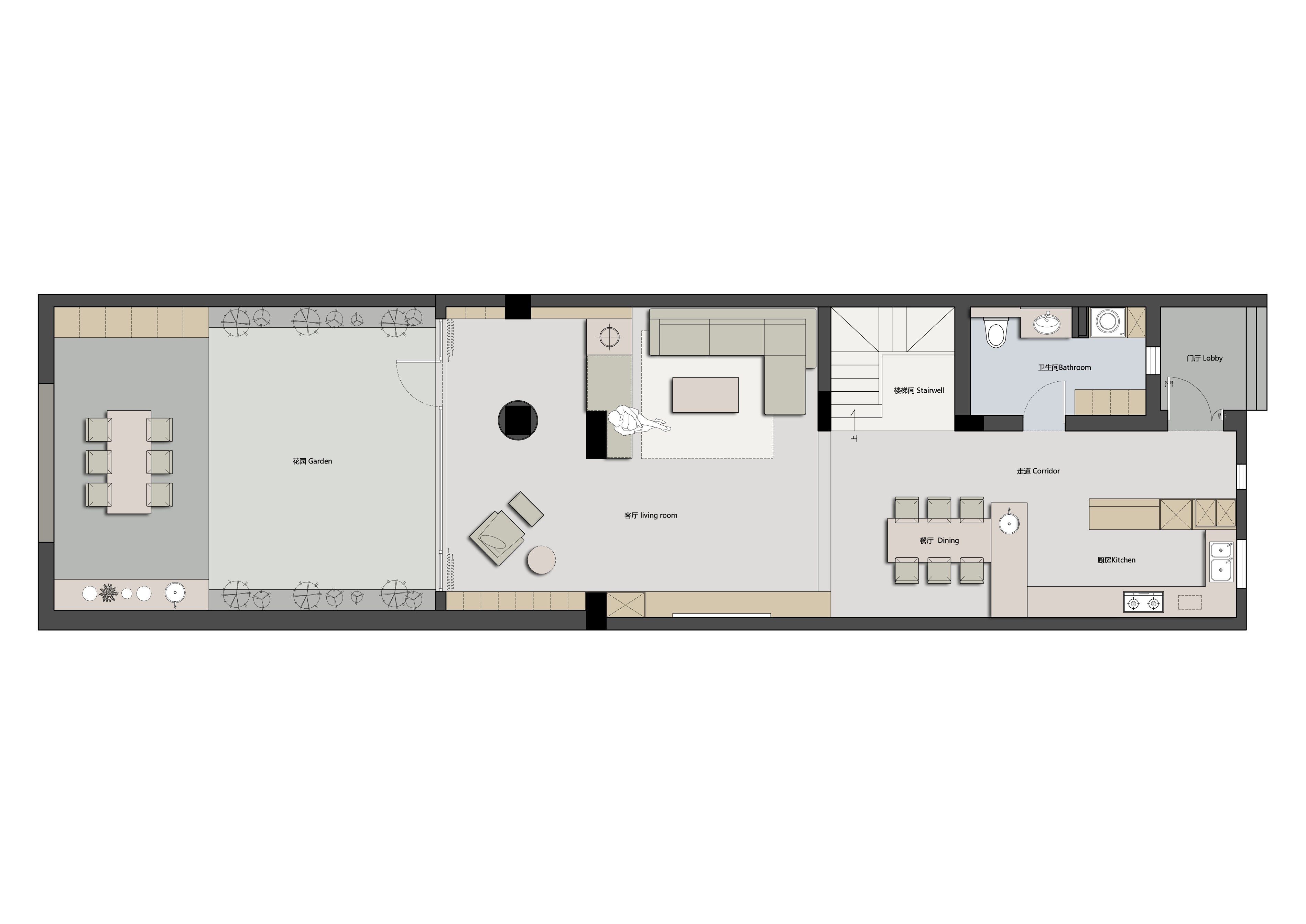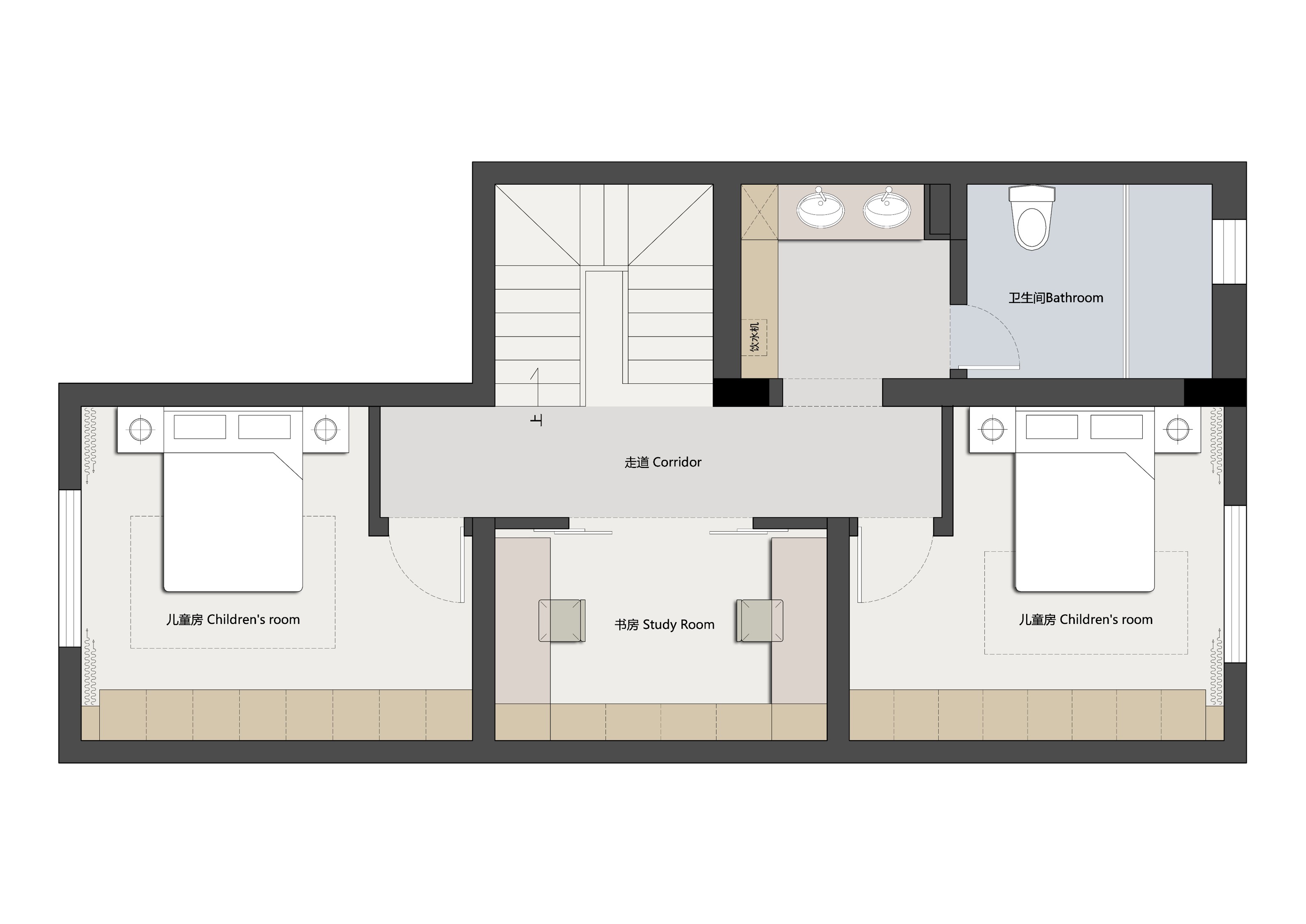 空间布局:以洄游动线与层级分区破解别墅空间的割裂感,客餐厨采用开放式连通,通过地面微高差划分功能区,既保持视觉通透,又强化空间层次;以客厅为核心,串联楼梯、书房、卧室等区域,形成无死角的洄游动线,提升空间利用率与动线流畅度;将书房、储物间嵌入,通过玻璃门、隐形门实现“功能隐身”,既保证空间整洁,又让功能区随需开合。