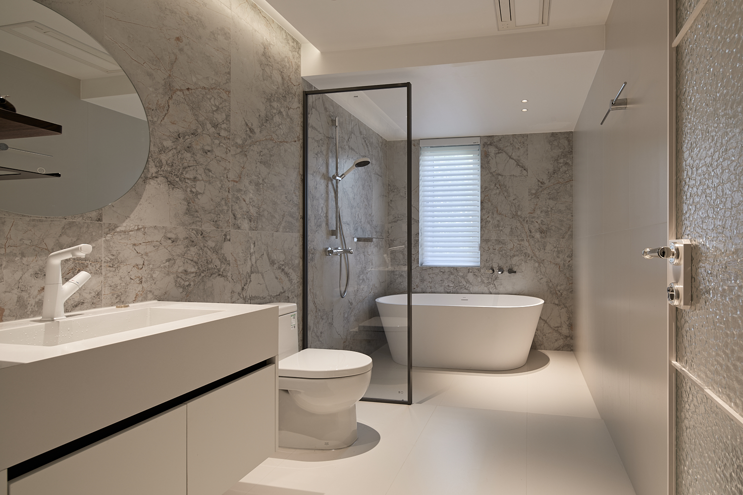 设计选材:在“质感呈现”与“低碳经济”间做适配选择,地面以大尺寸柔光瓷砖、木纹地板为主;柜体选用ENF级环保板材,减少甲醛释放;关键区域用平替材质还原高级感,局部用金属线条、玻璃做轻量点缀提升空间精致度。