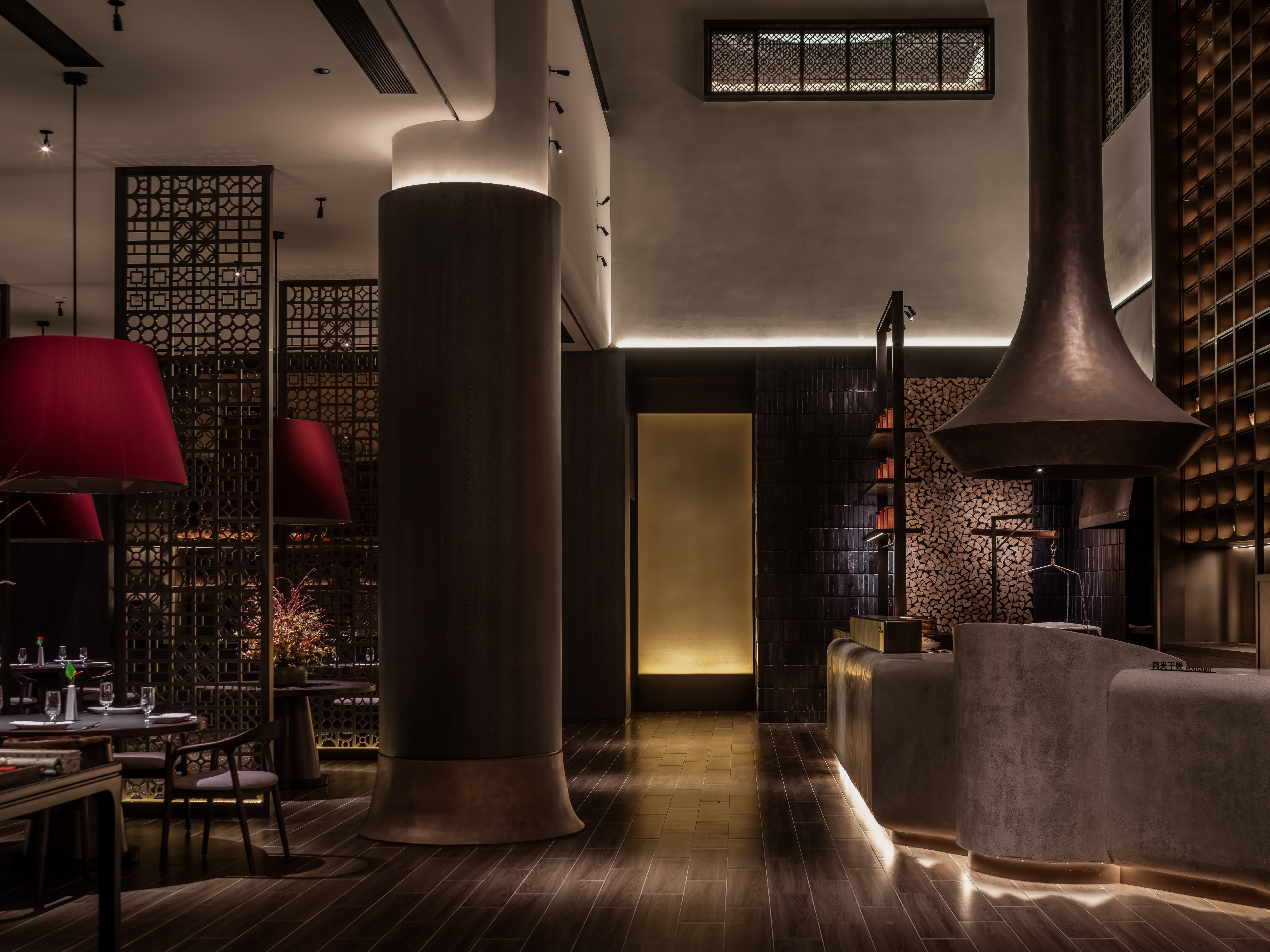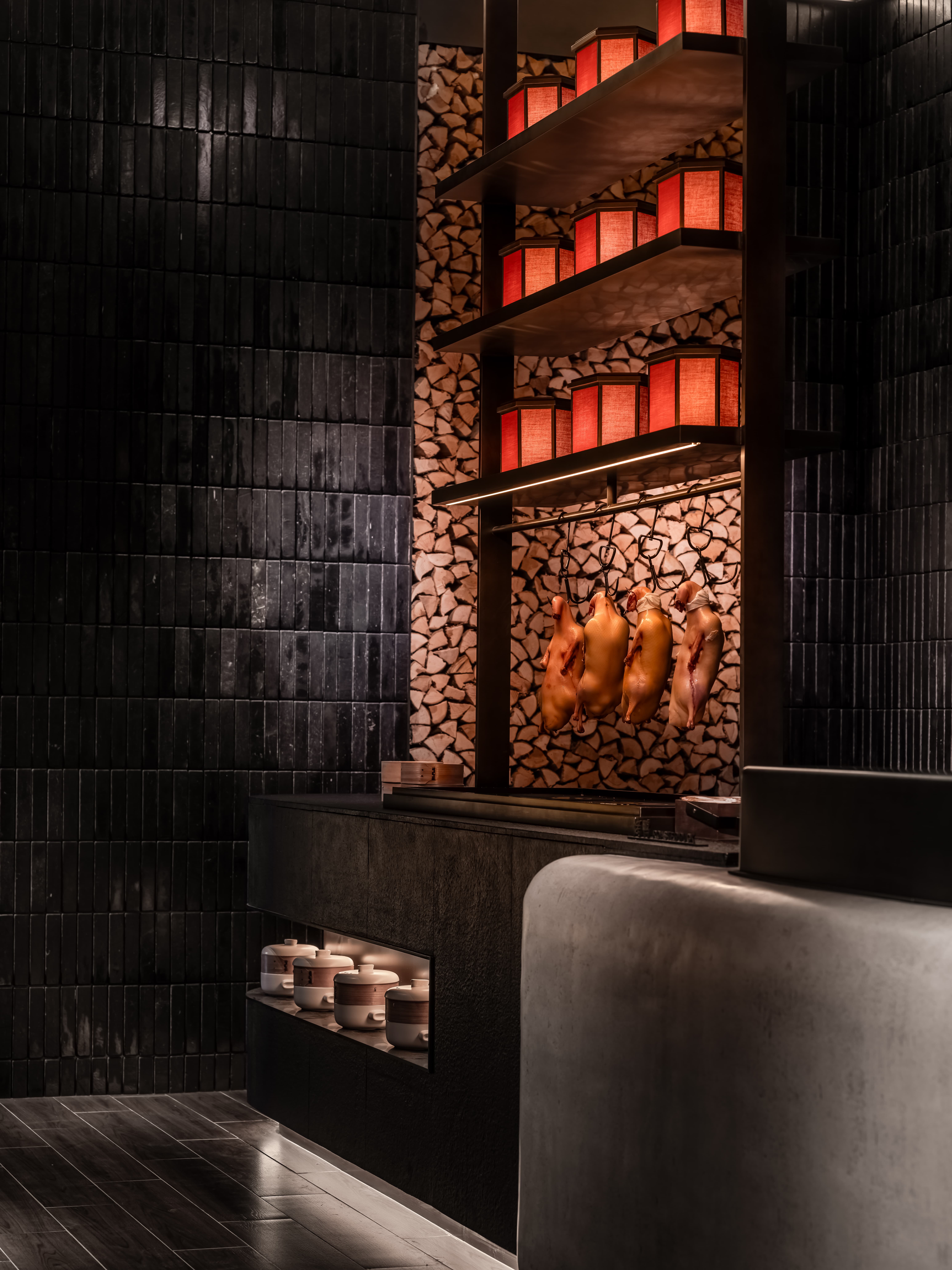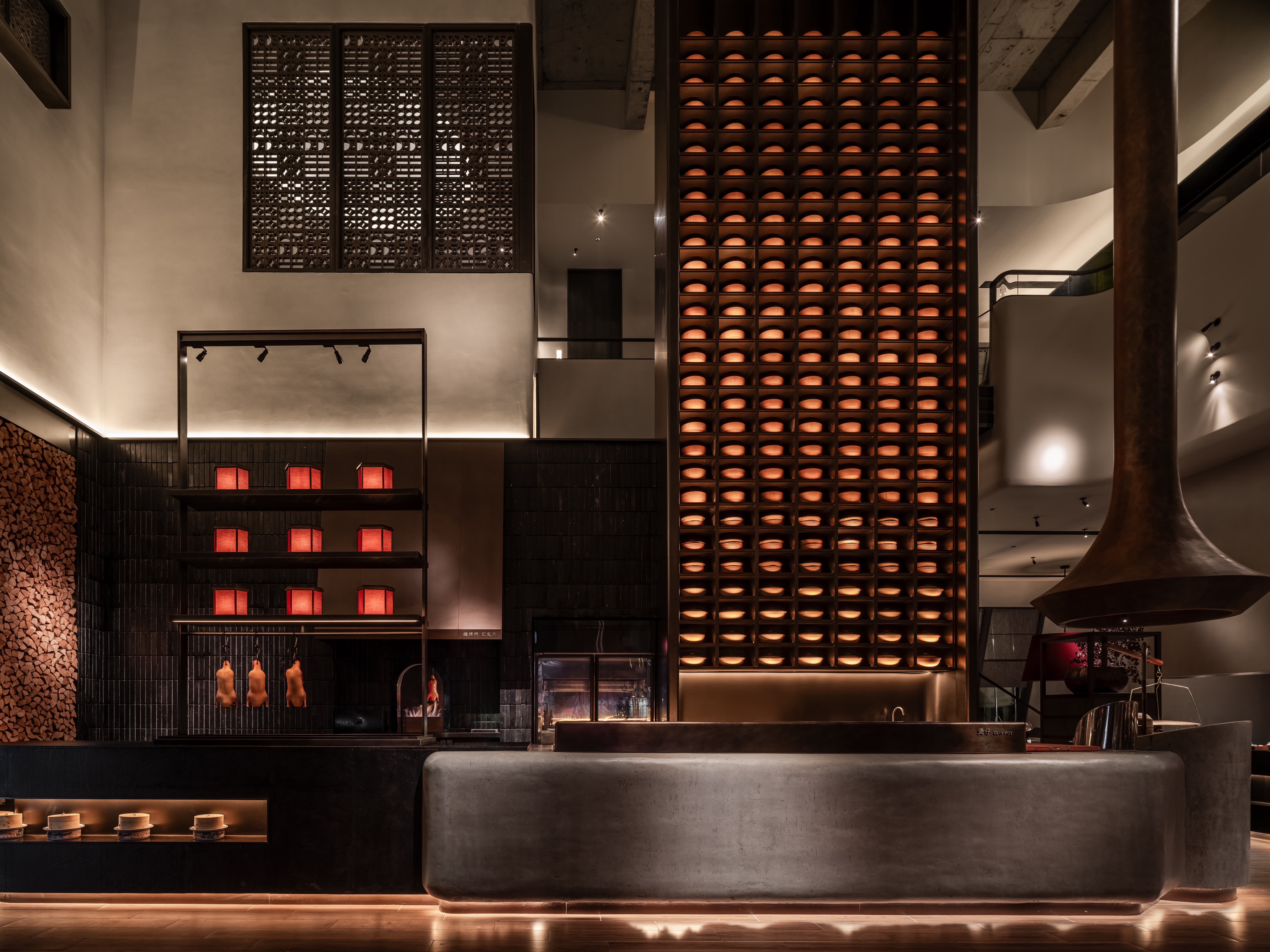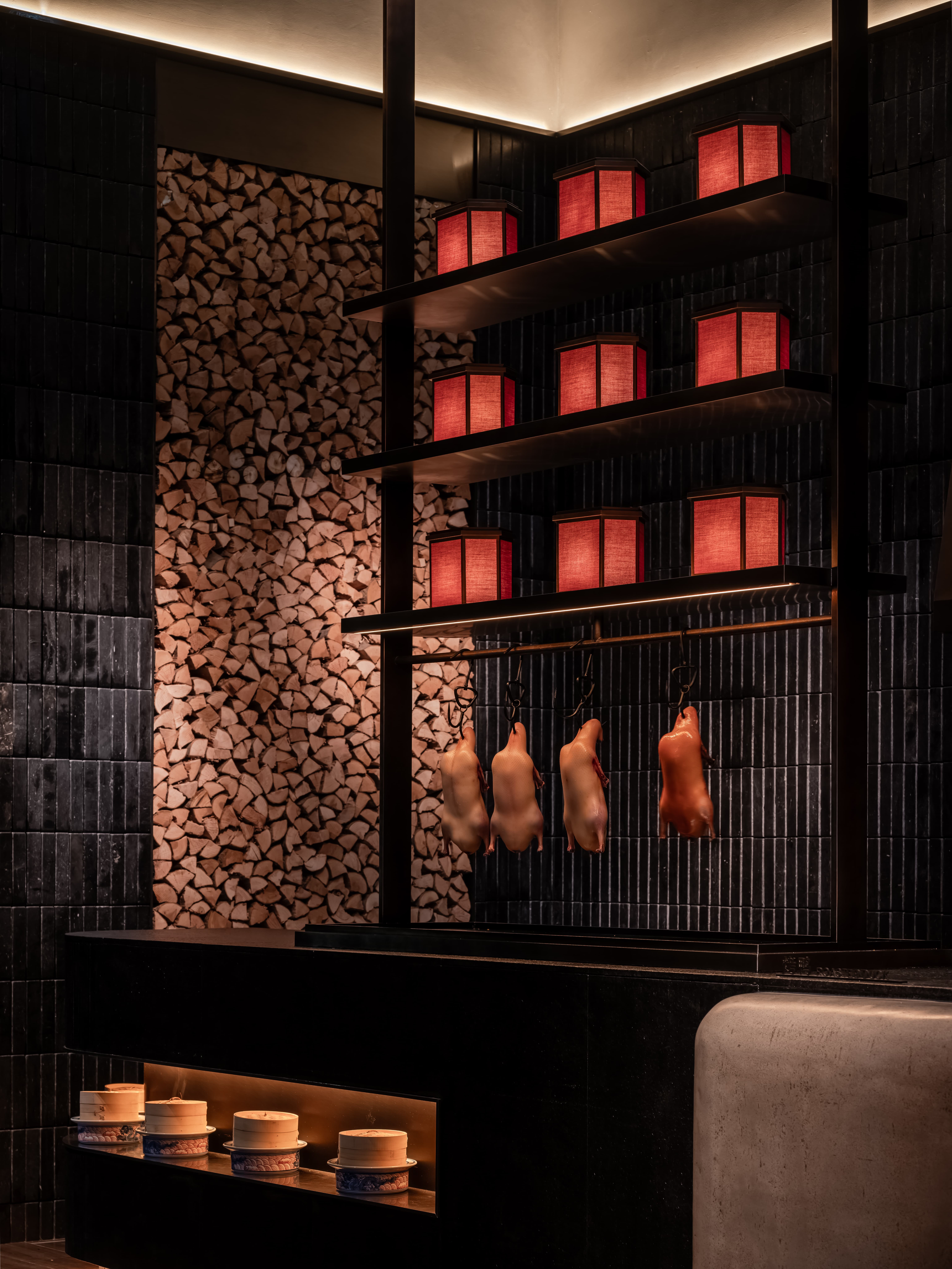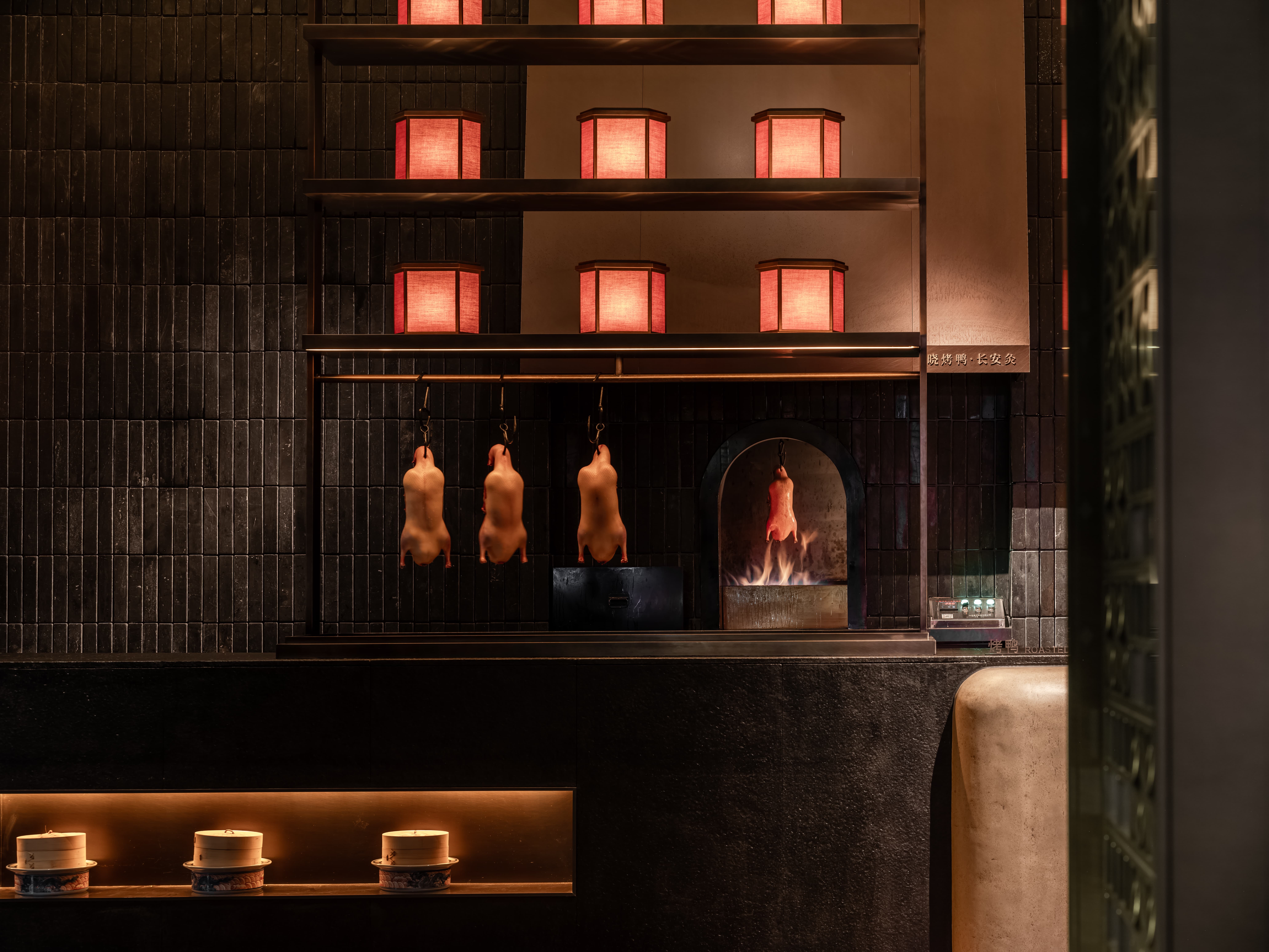 明档放在中间,辐射包间和走廊的多个视角,光从侧面“抚上”明档,上下左右的光源互相配合,期待这场精彩。