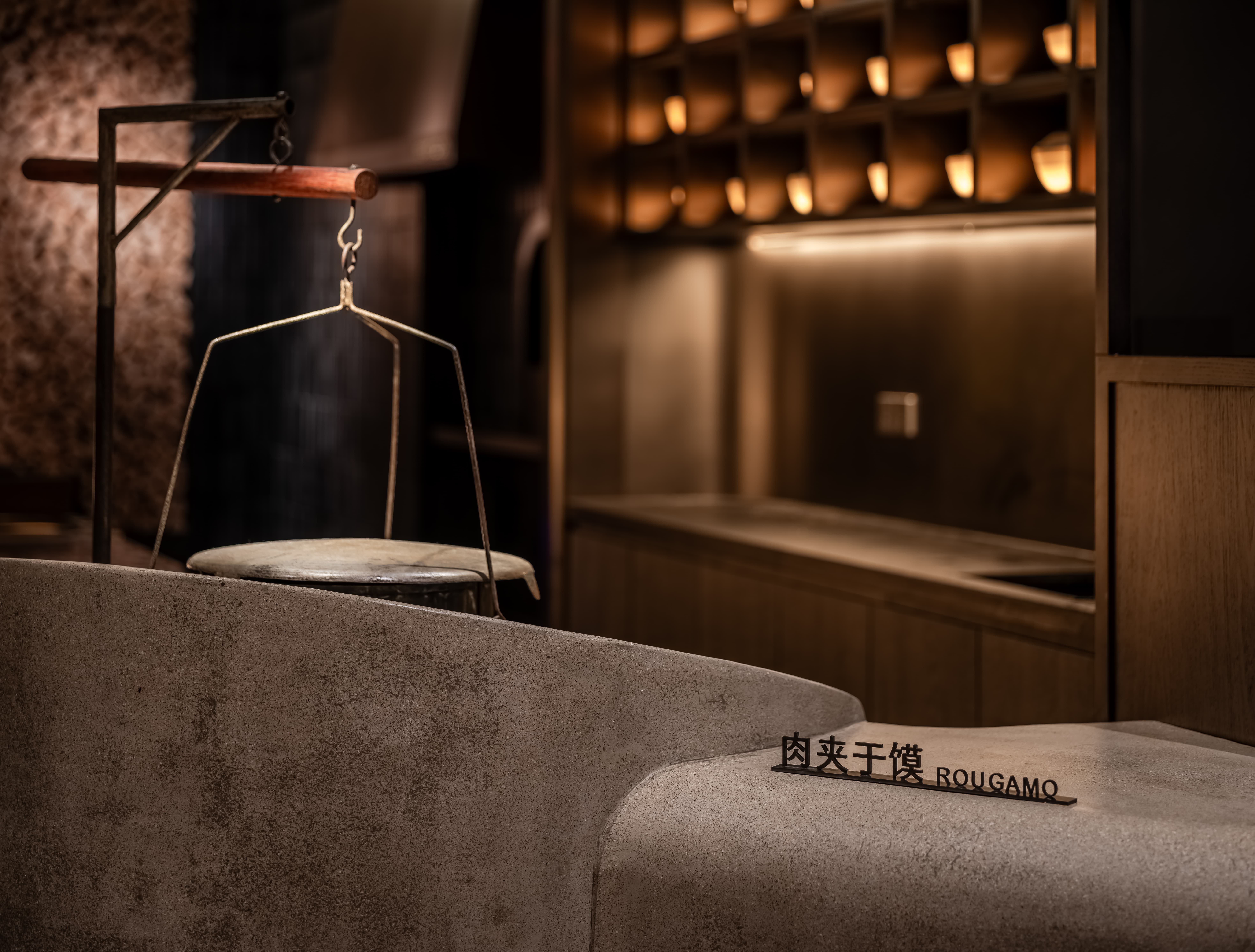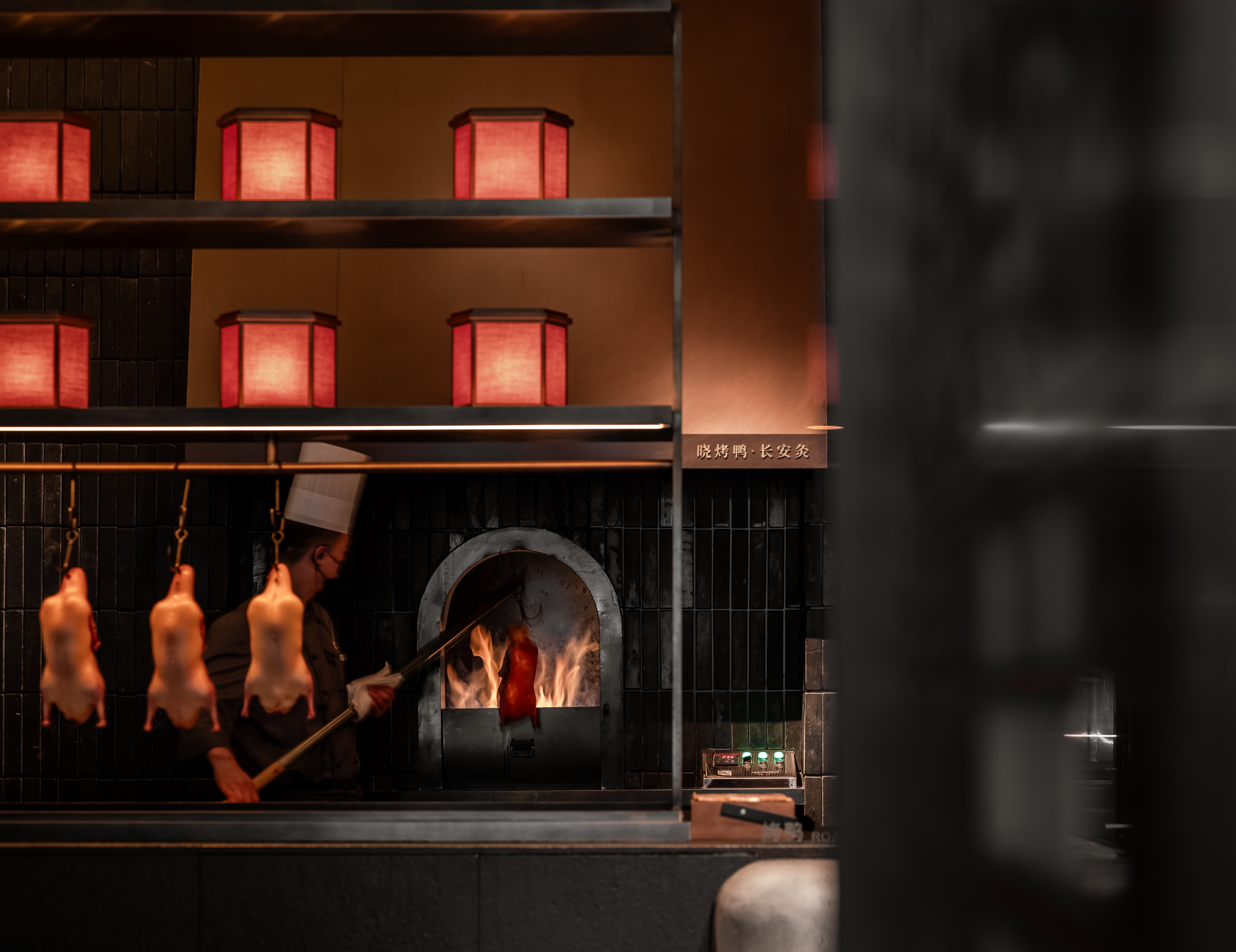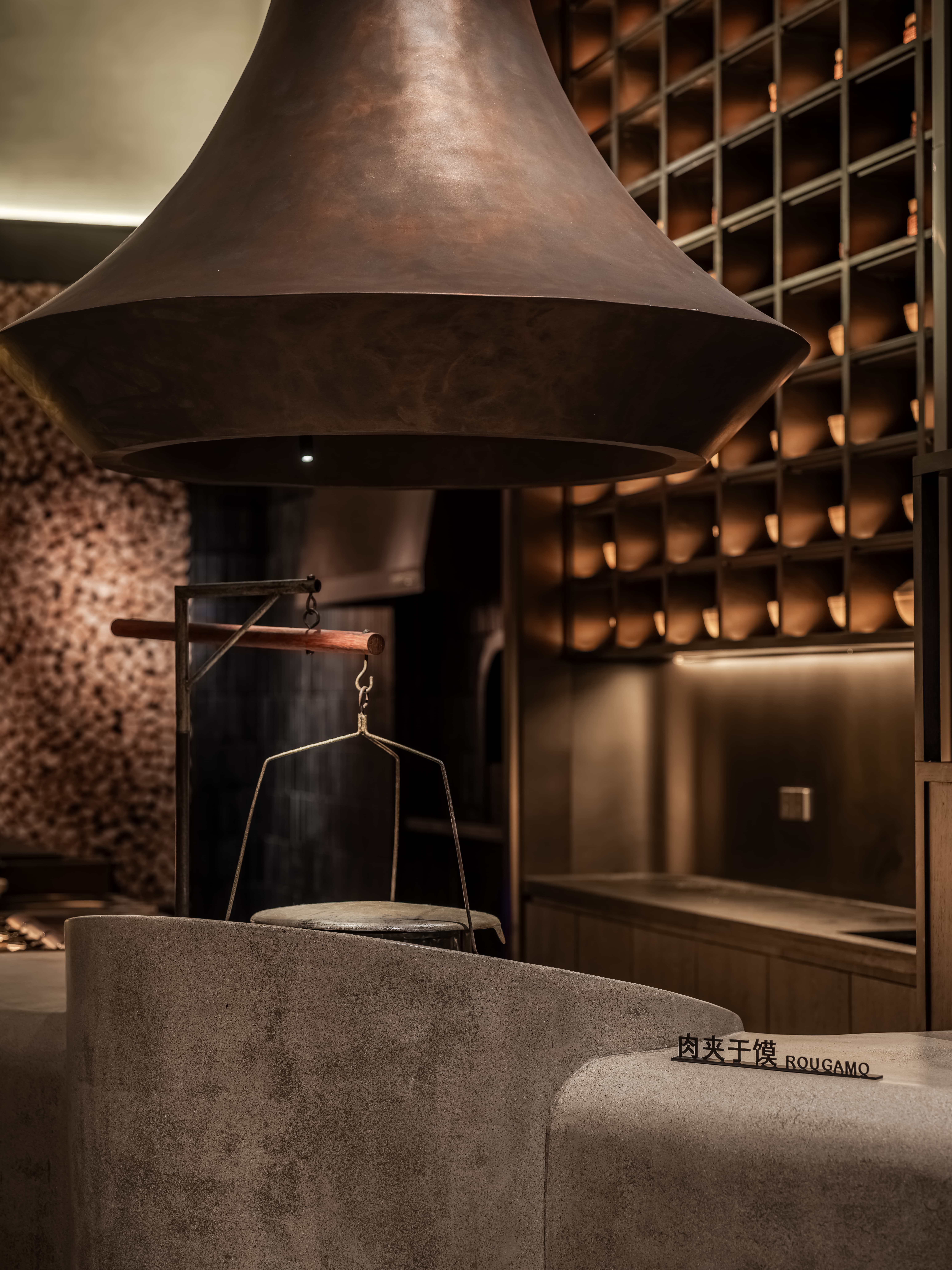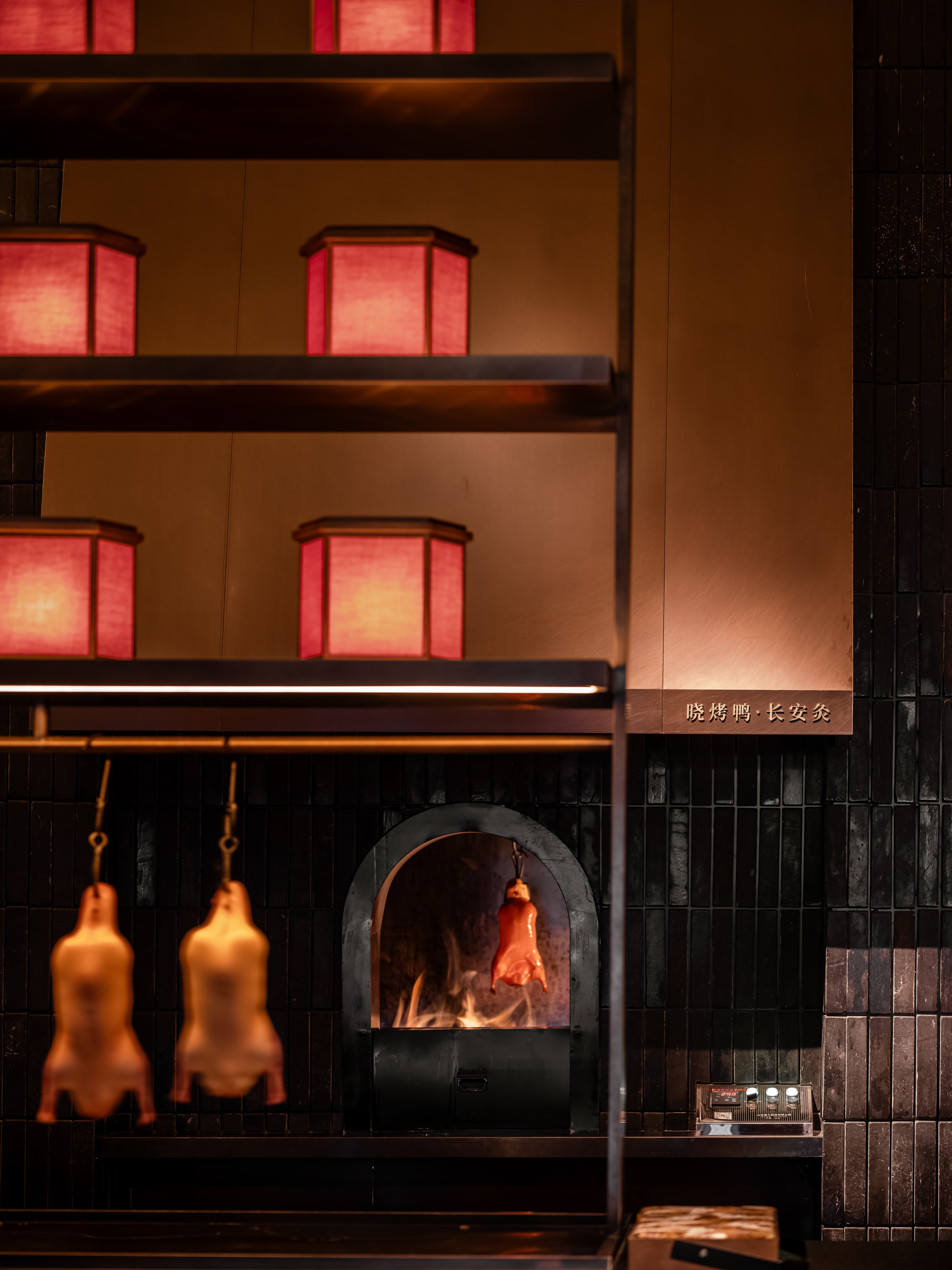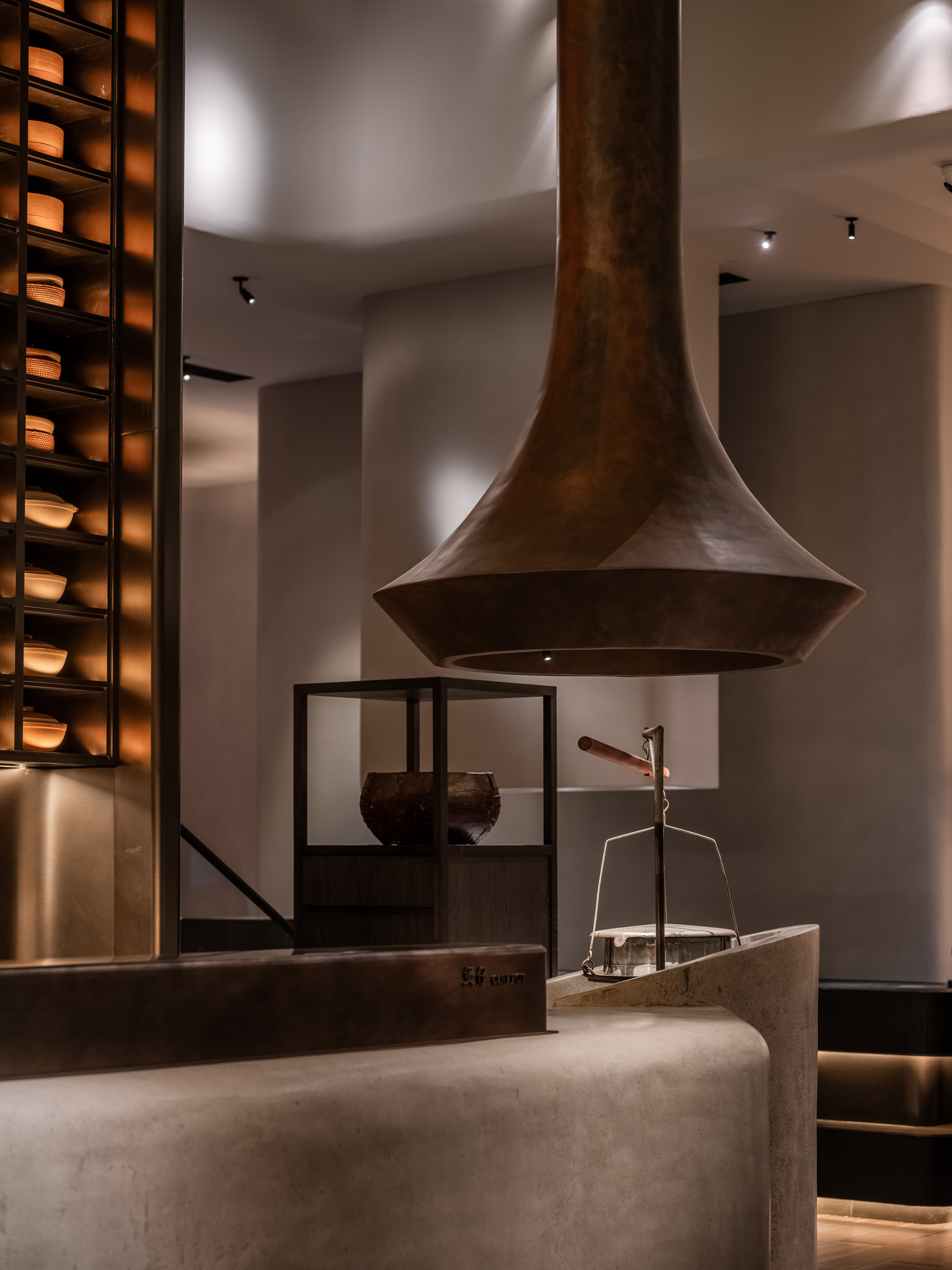 明档放在中间,辐射包间和走廊的多个视角,光从侧面“抚上”明档,上下左右的光源互相配合,期待这场精彩。