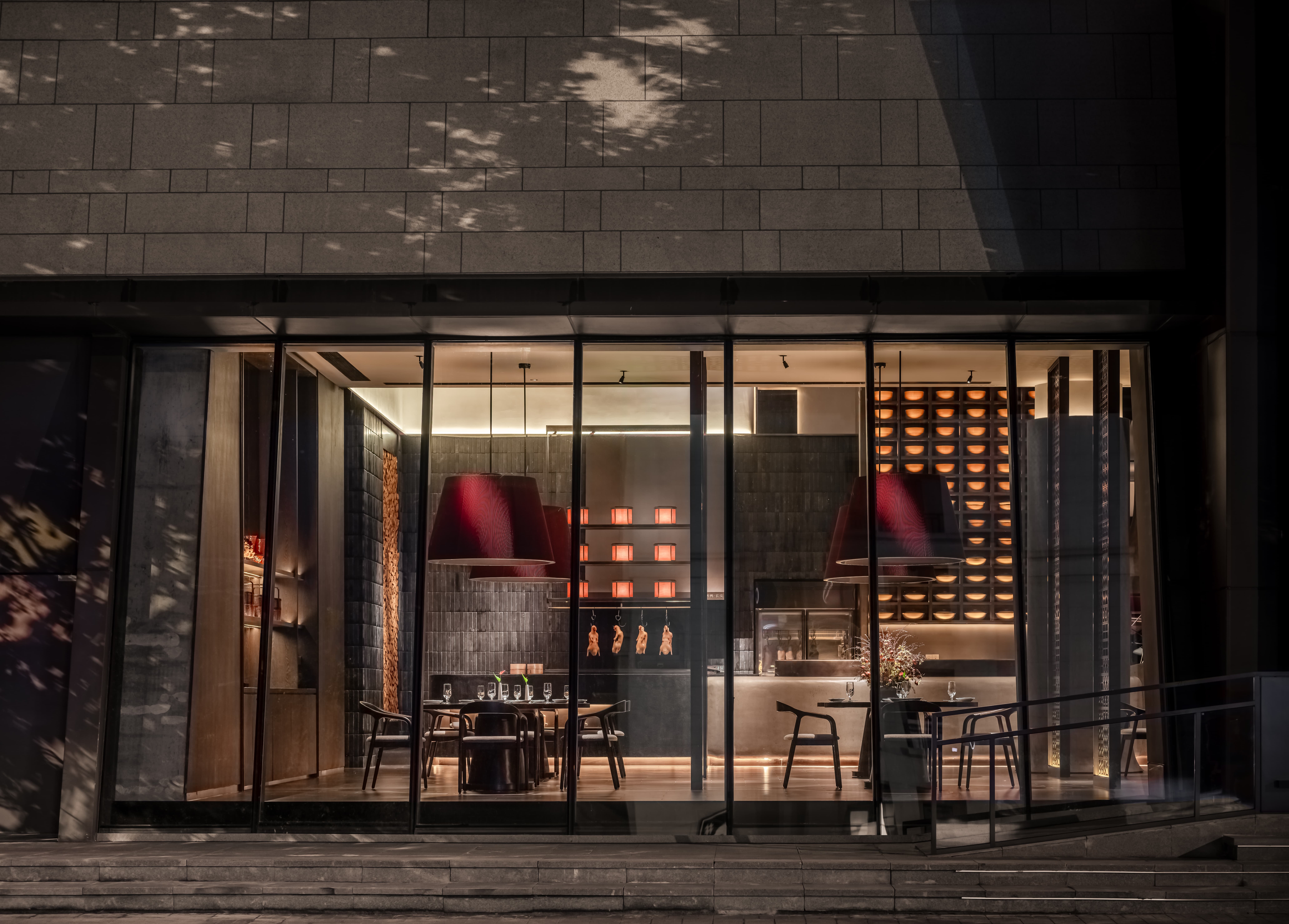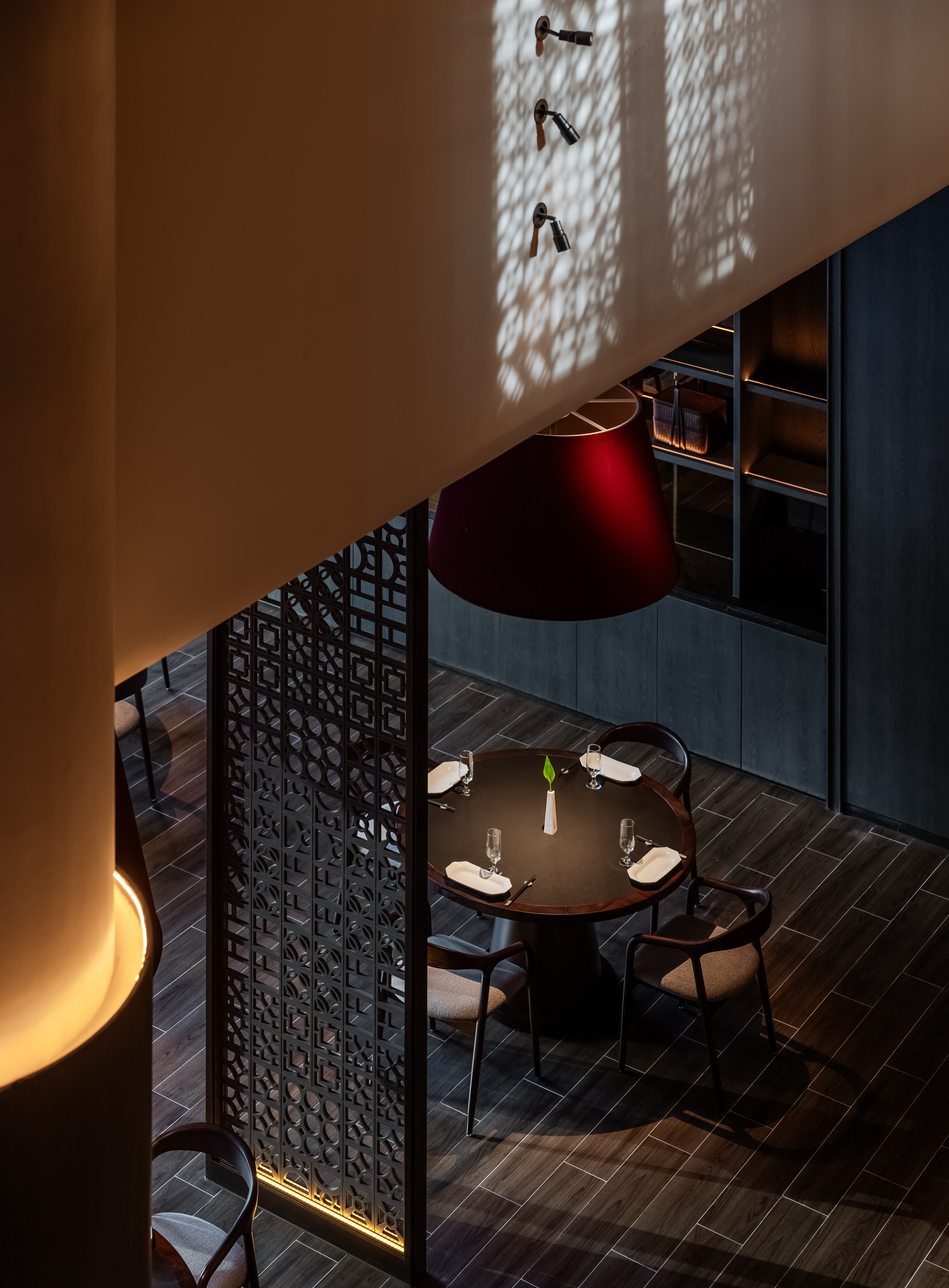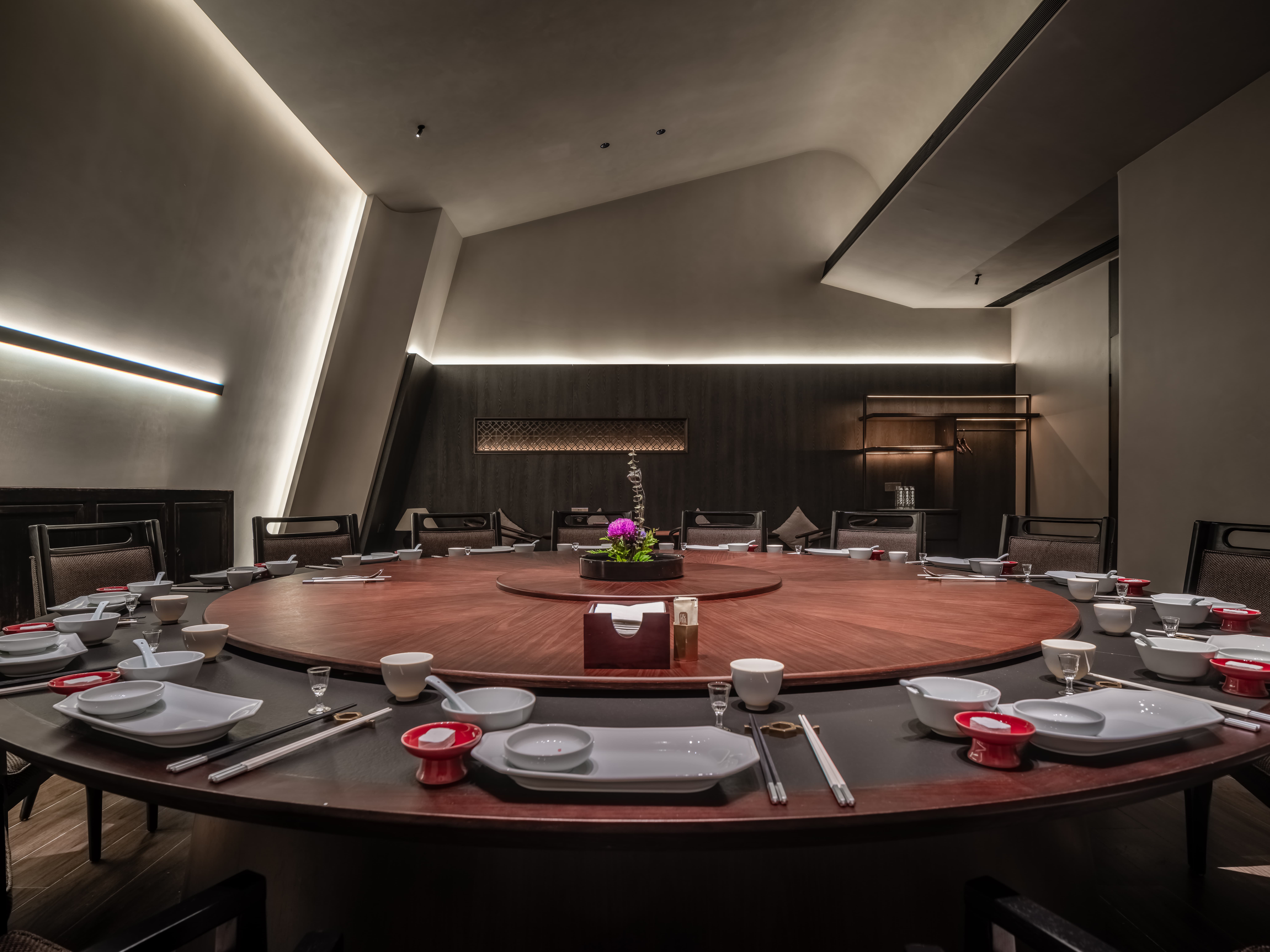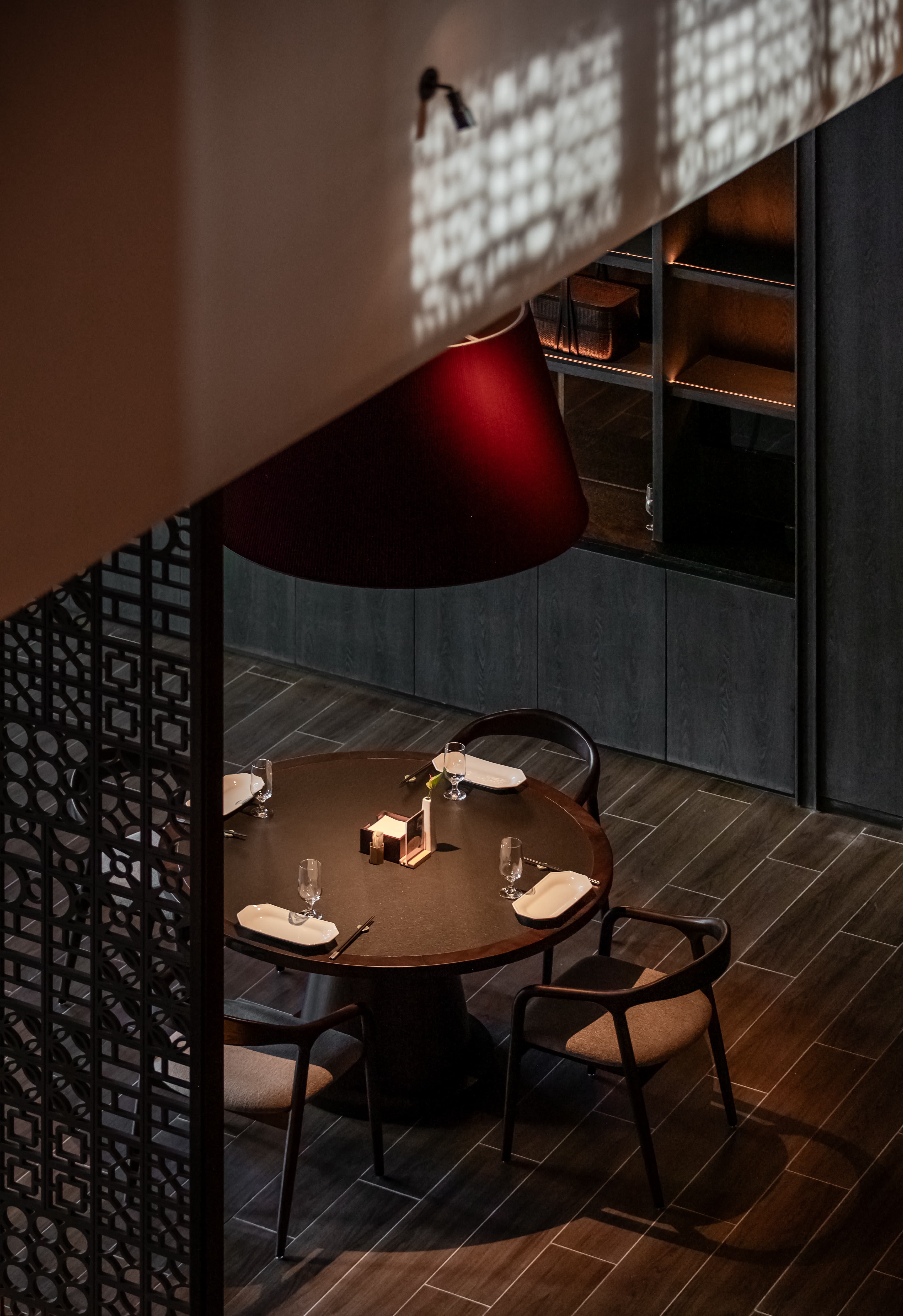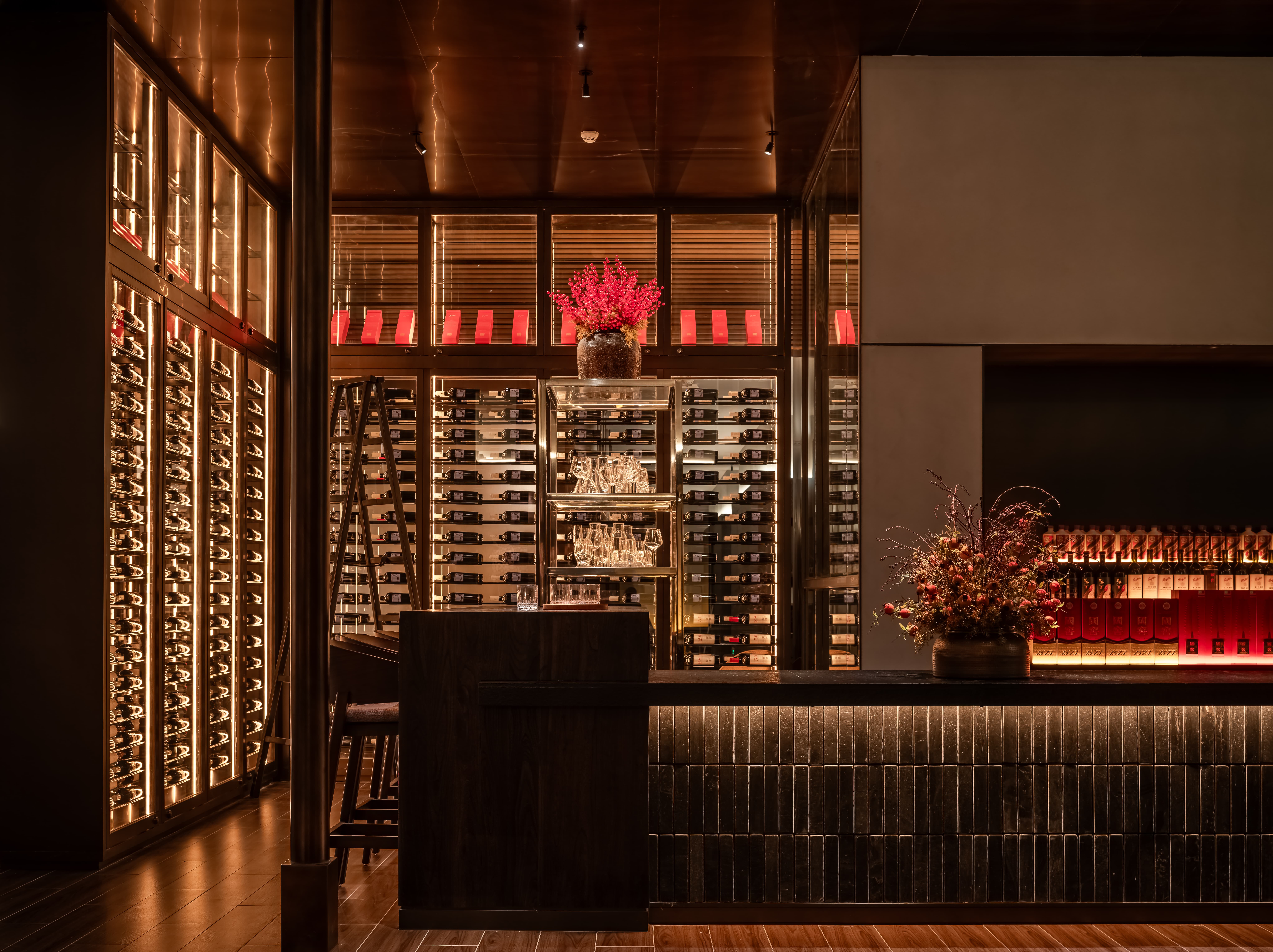 明档放在中间,辐射包间和走廊的多个视角,光从侧面“抚上”明档,上下左右的光源互相配合,期待这场精彩。