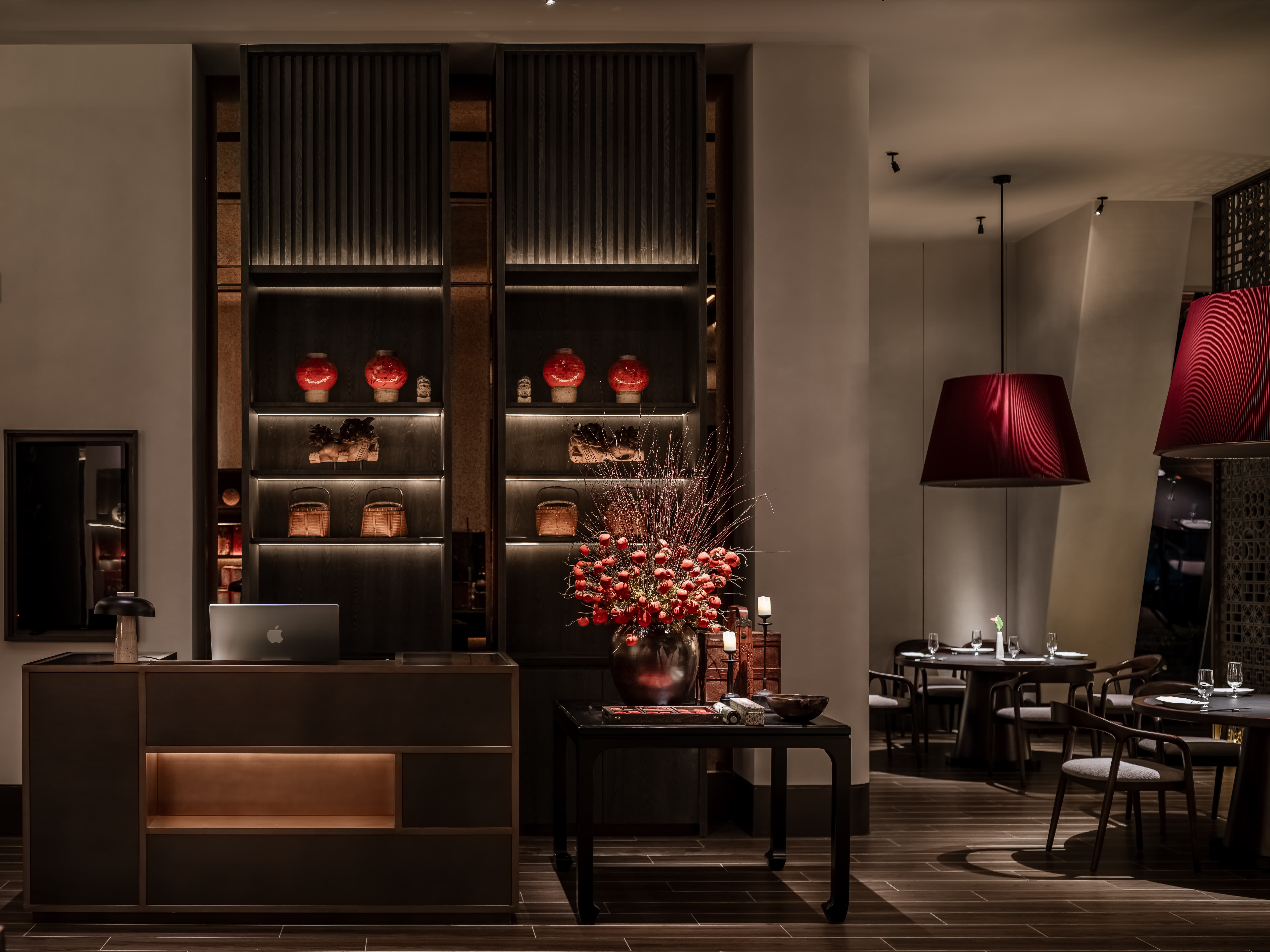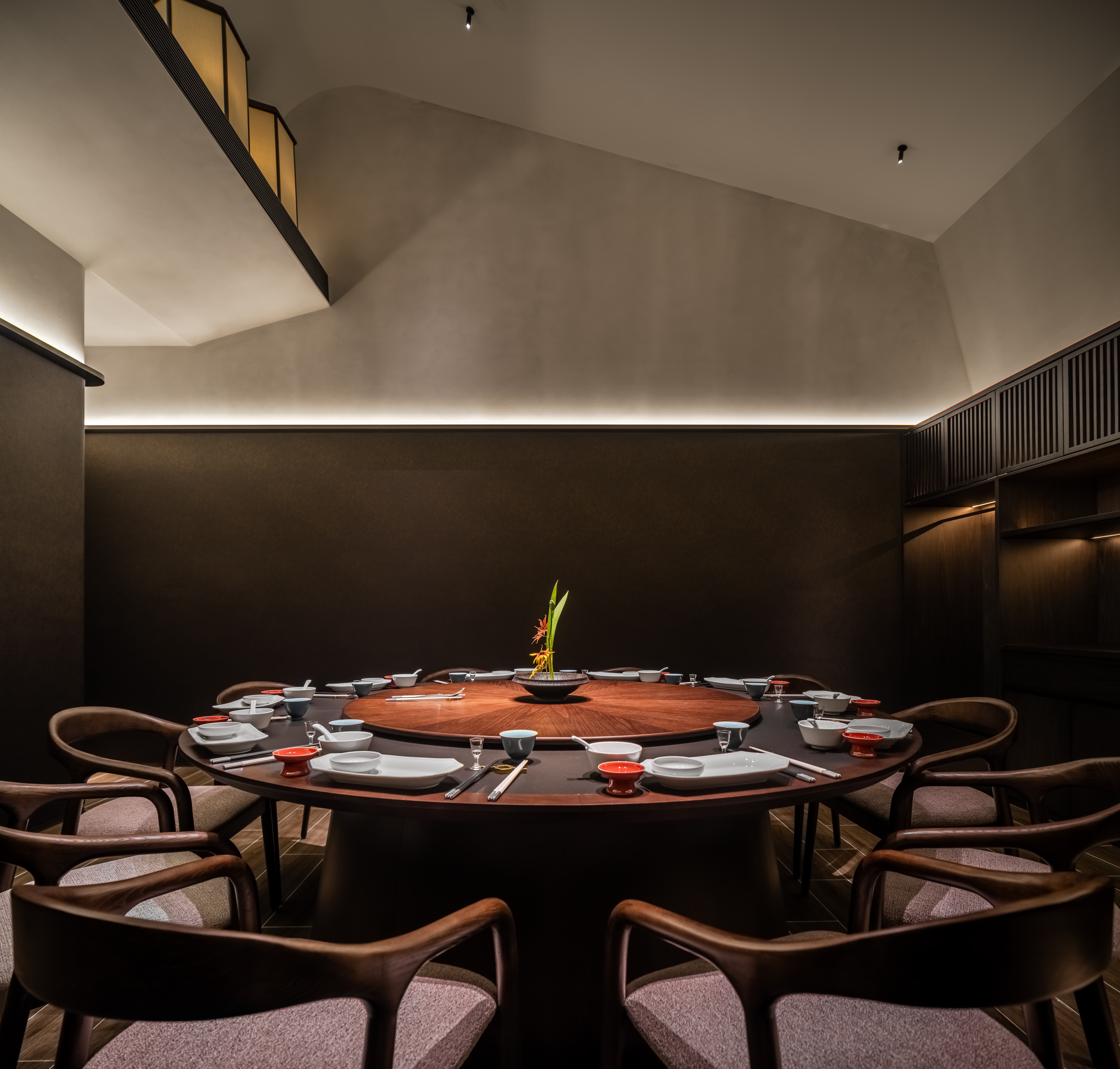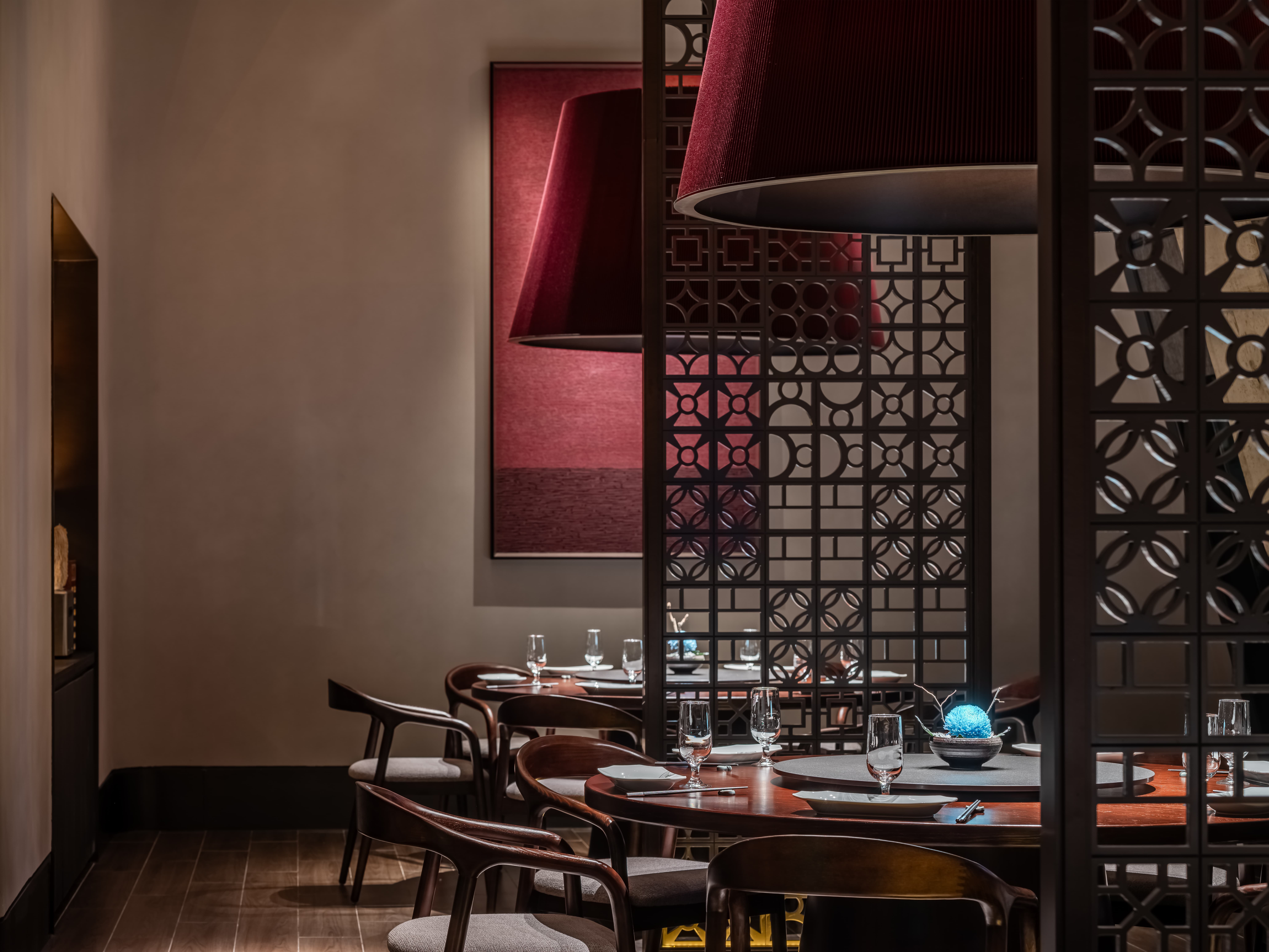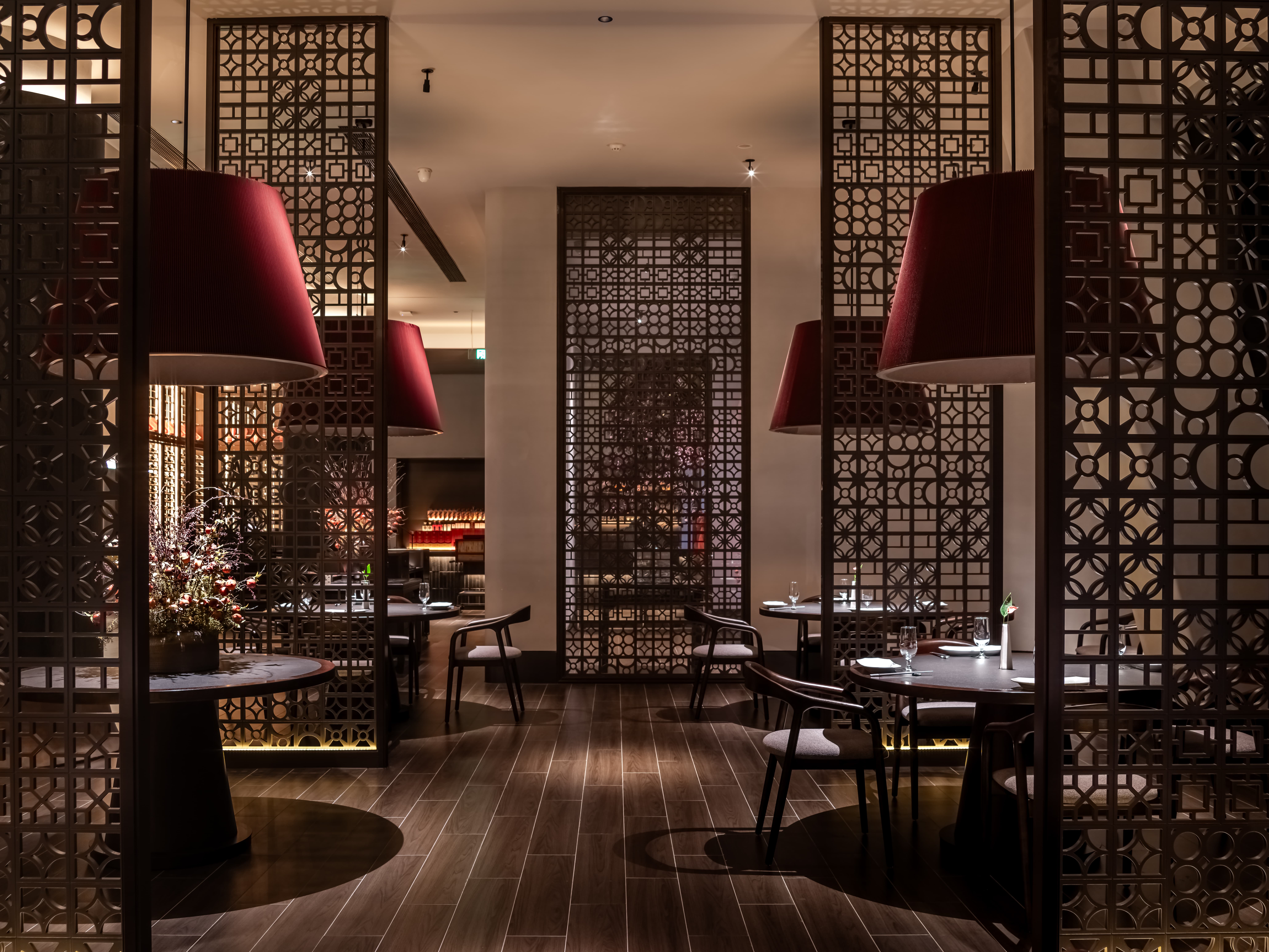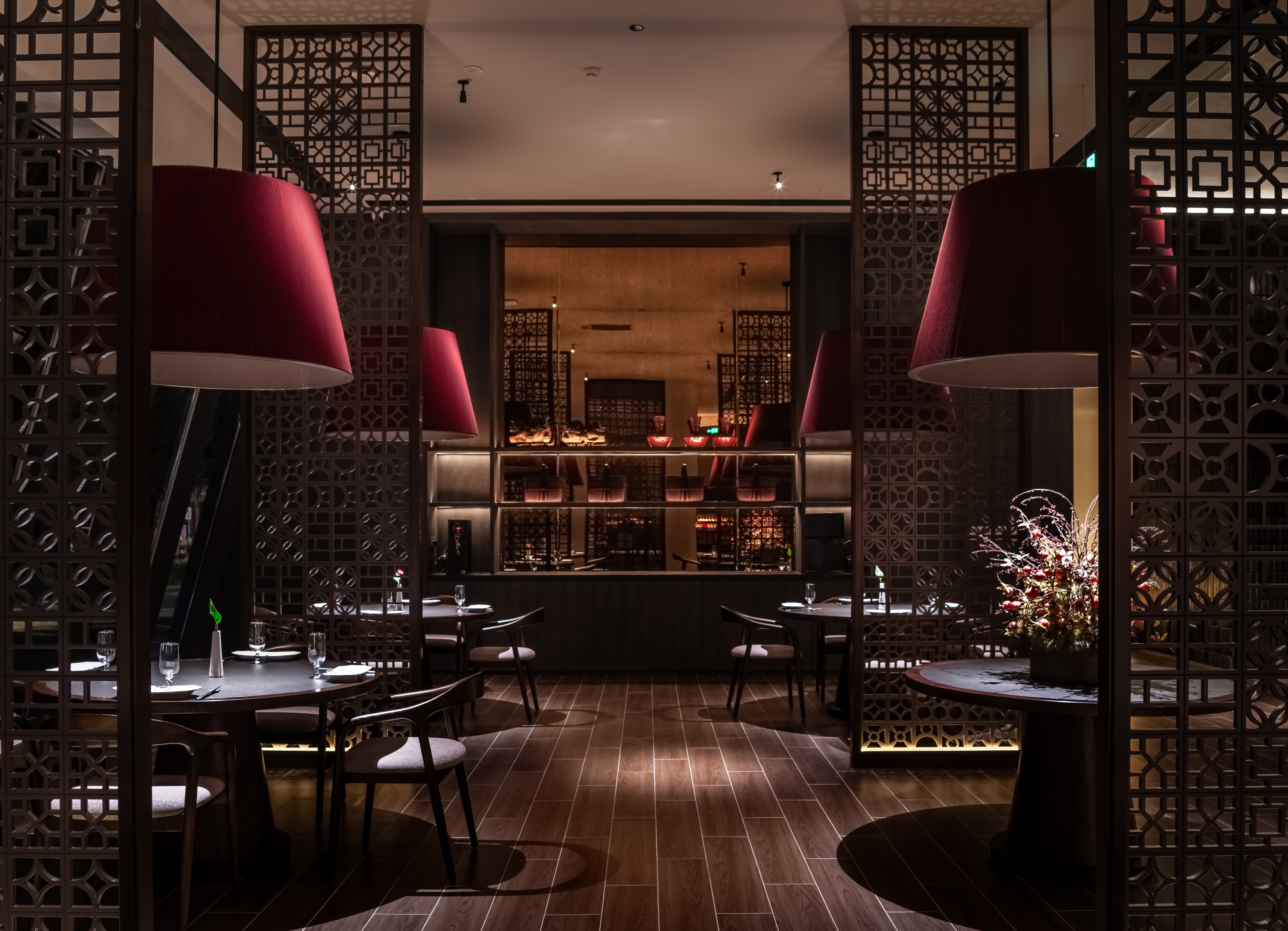 明档放在中间,辐射包间和走廊的多个视角,光从侧面“抚上”明档,上下左右的光源互相配合,期待这场精彩。