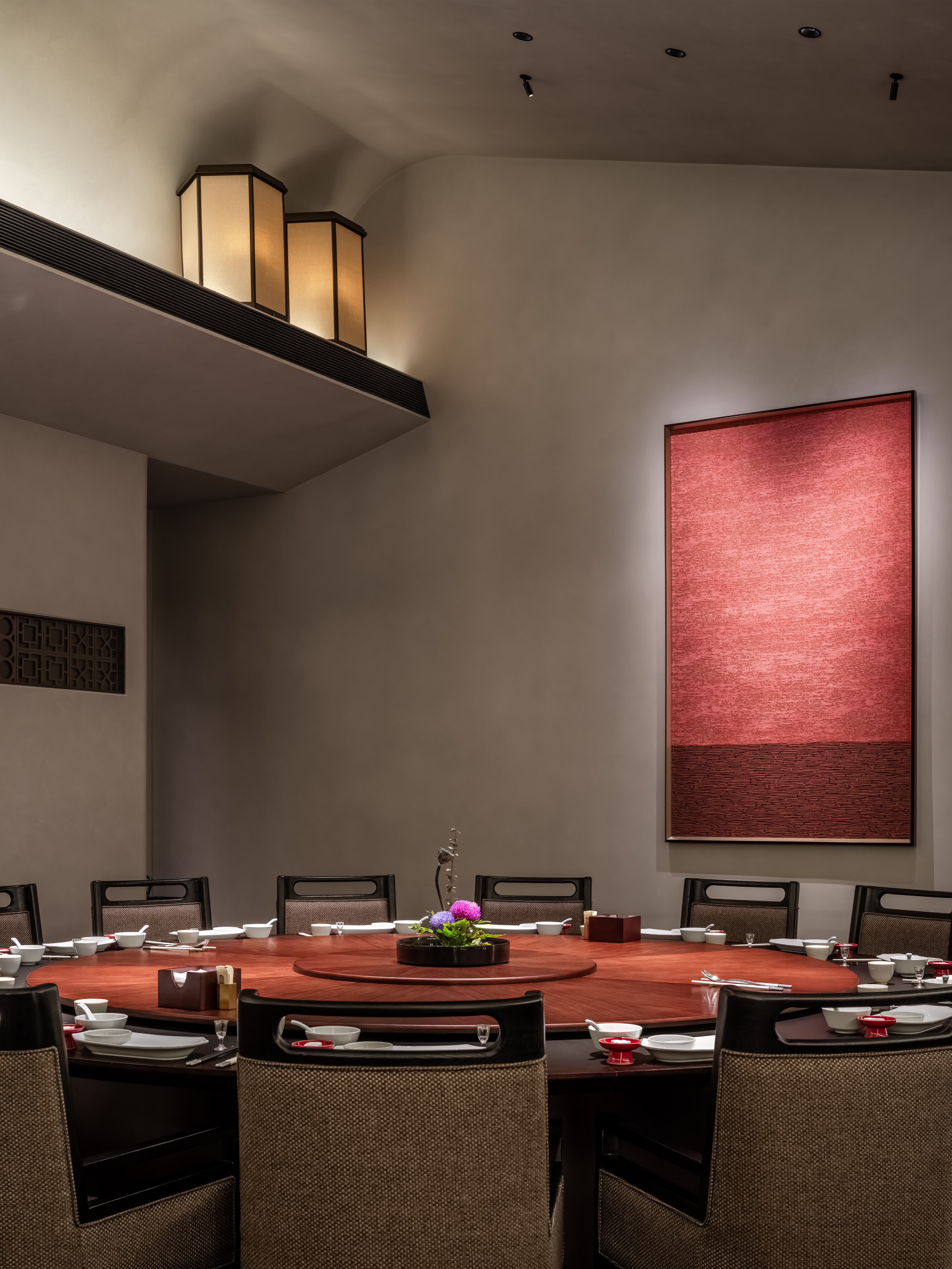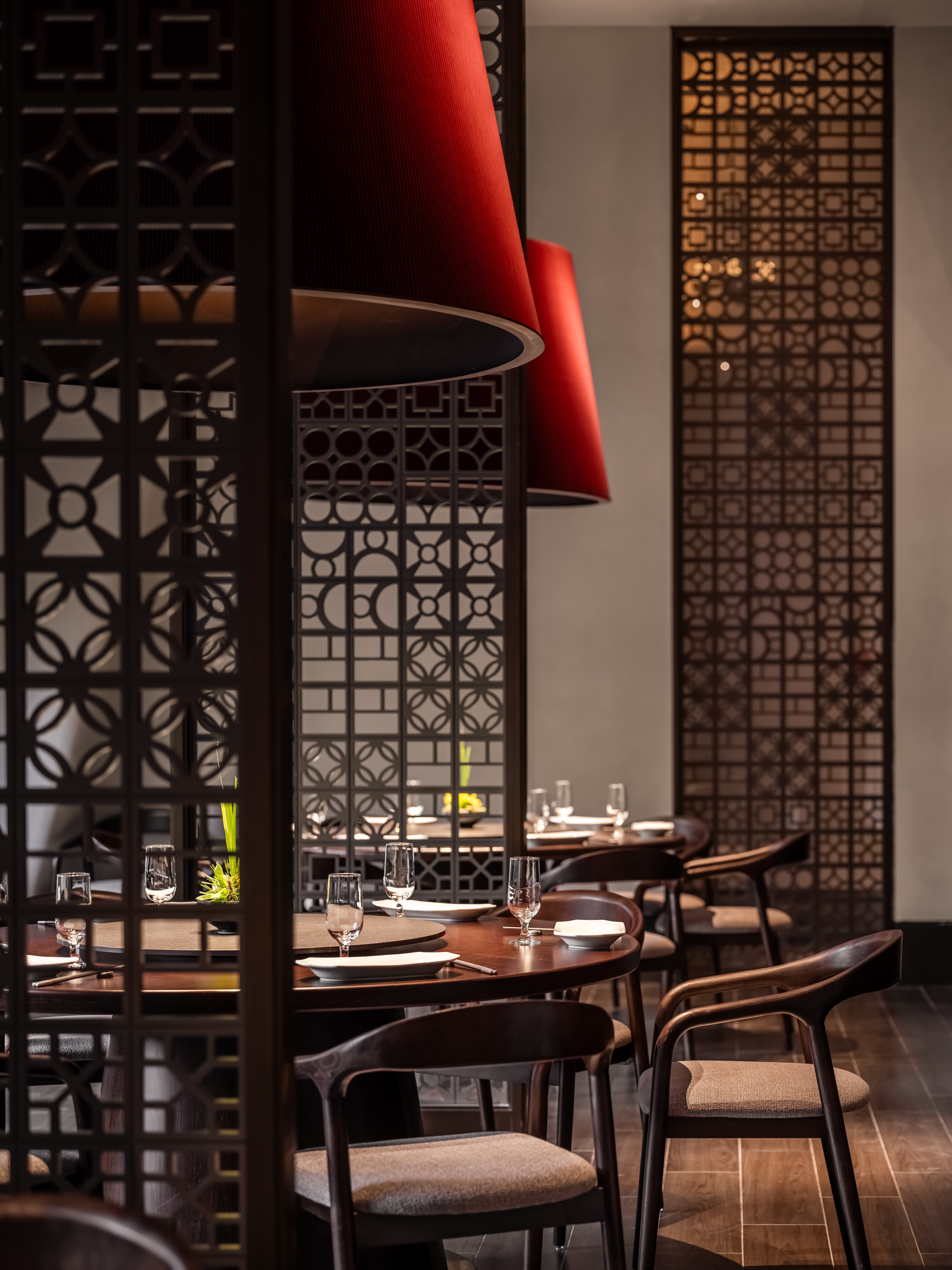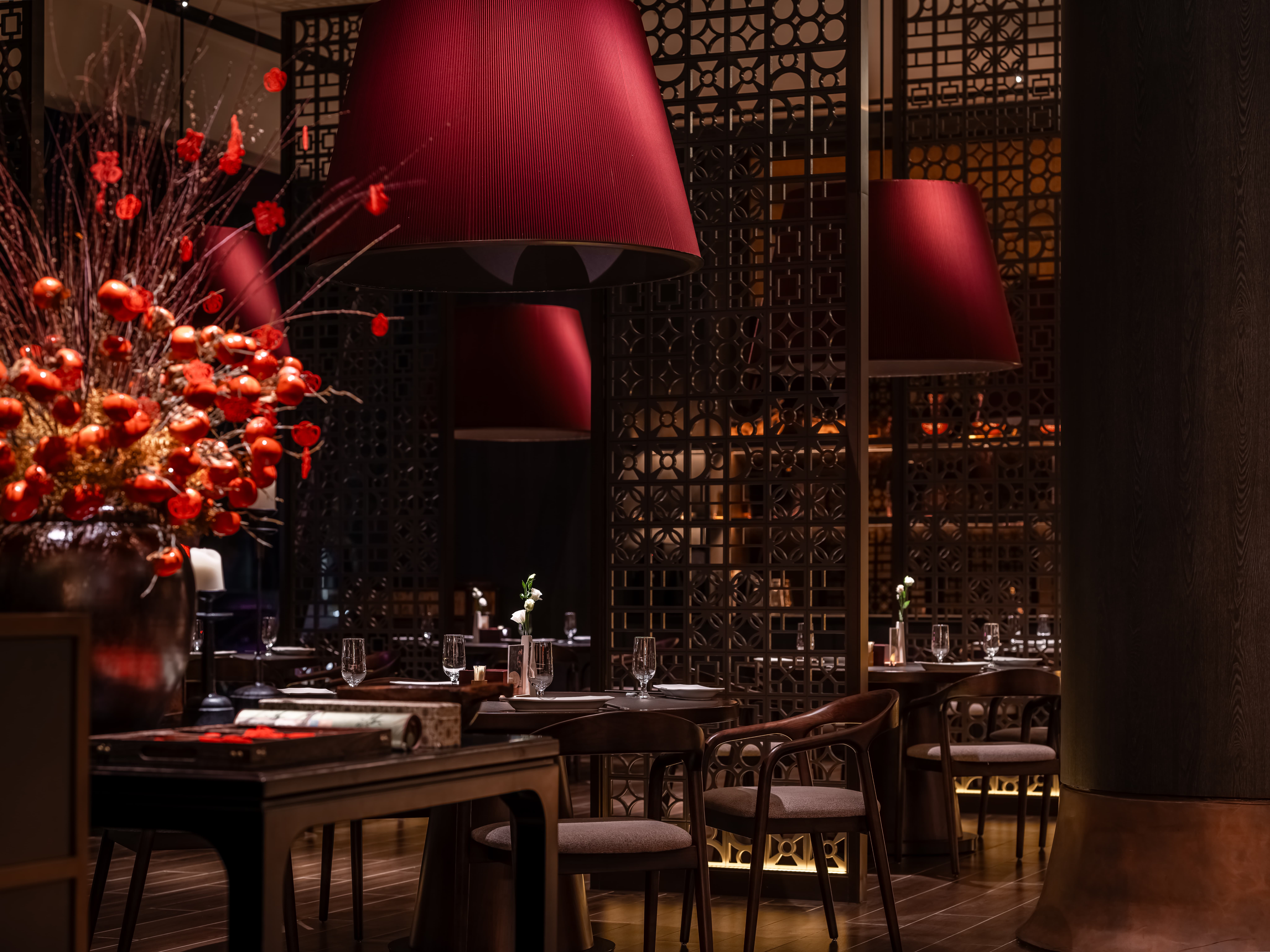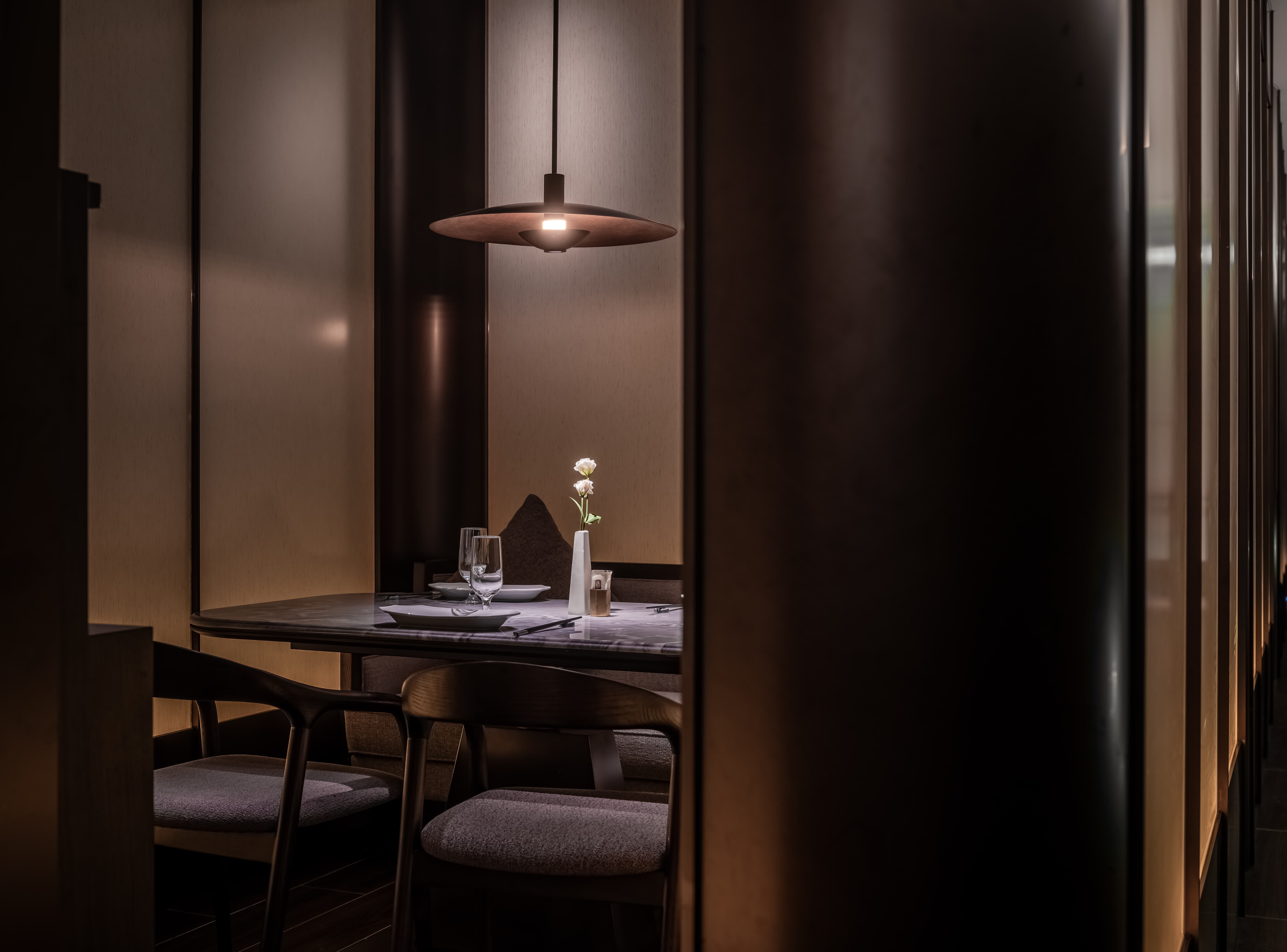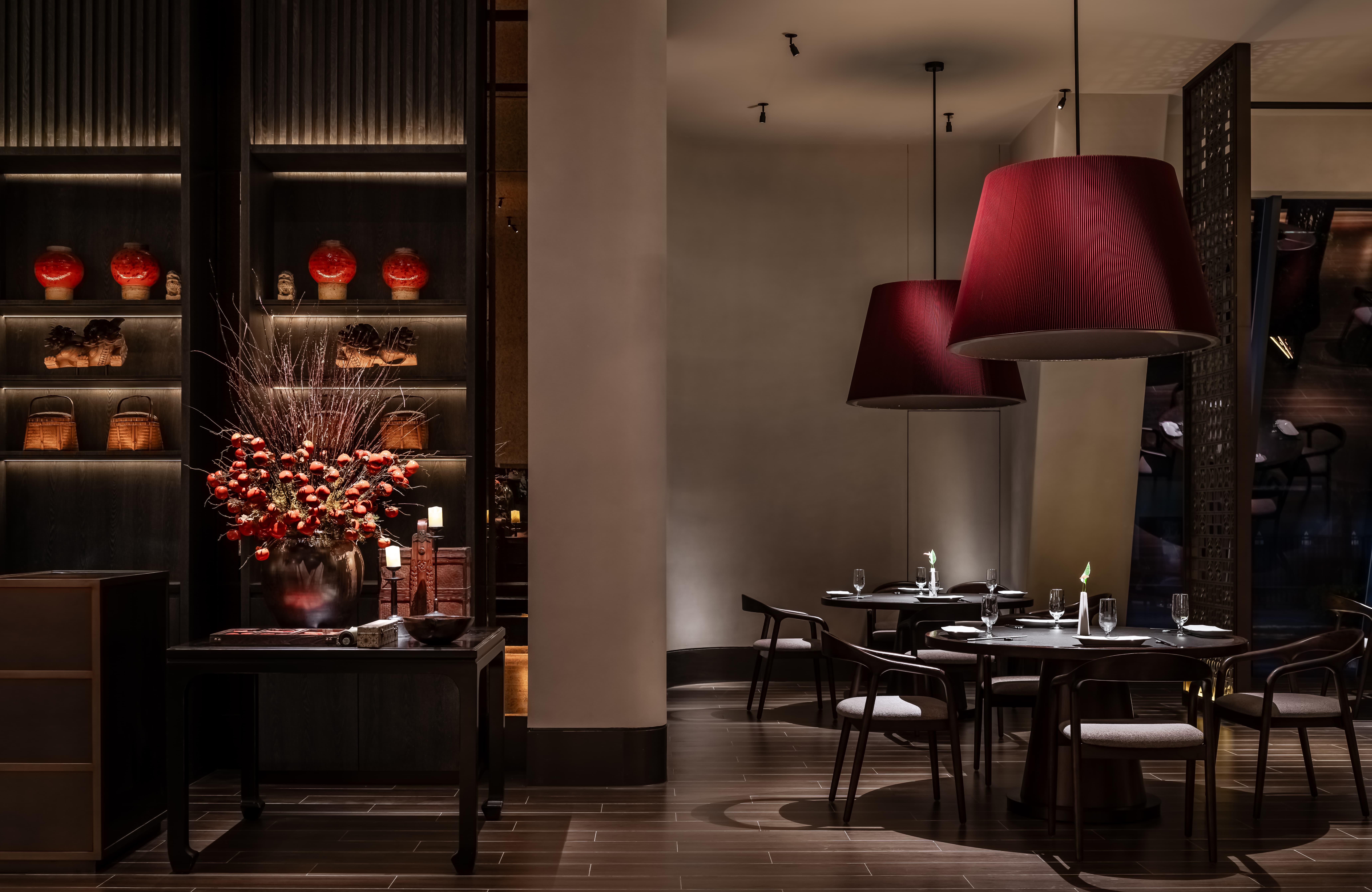 明档放在中间,辐射包间和走廊的多个视角,光从侧面“抚上”明档,上下左右的光源互相配合,期待这场精彩。