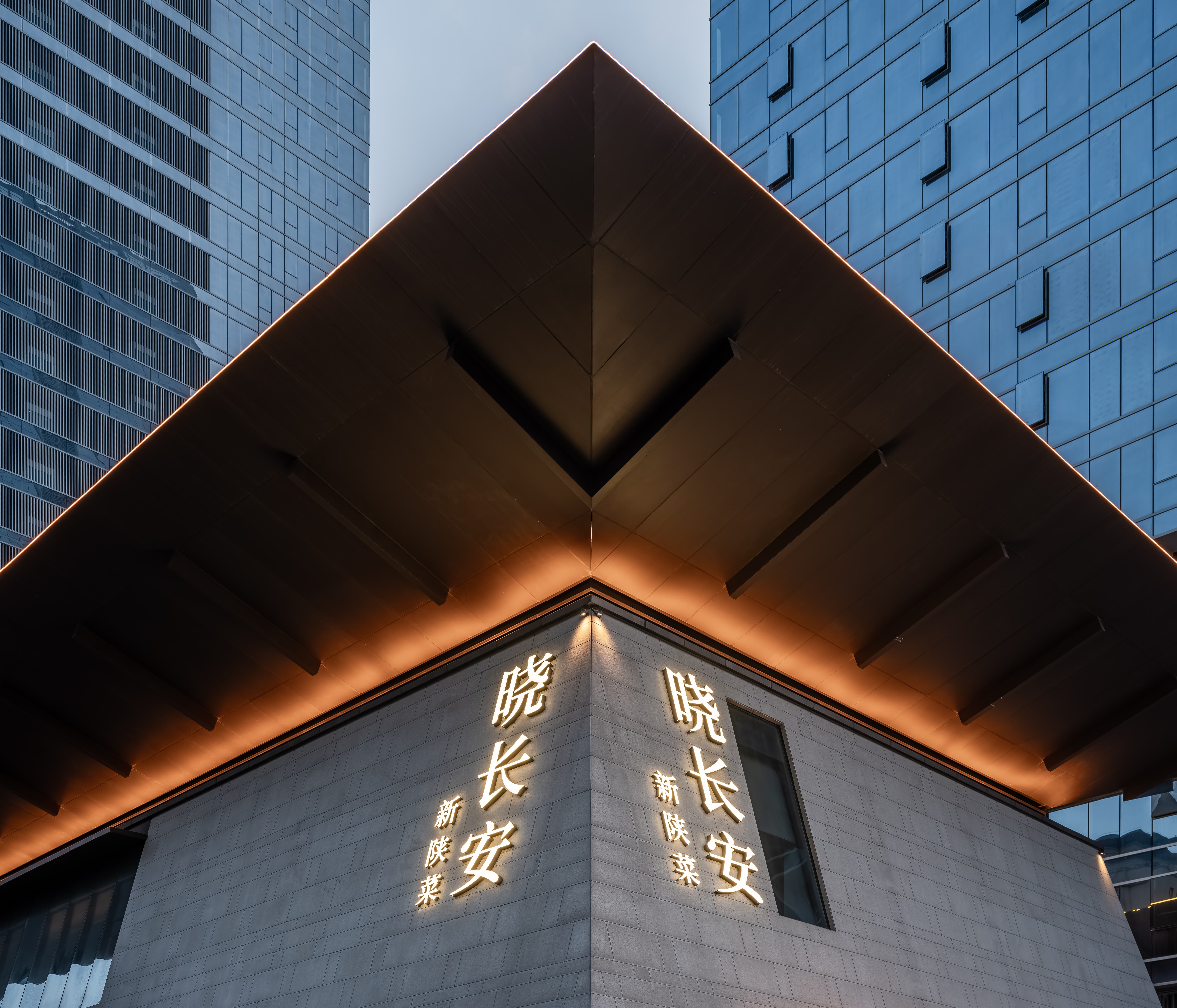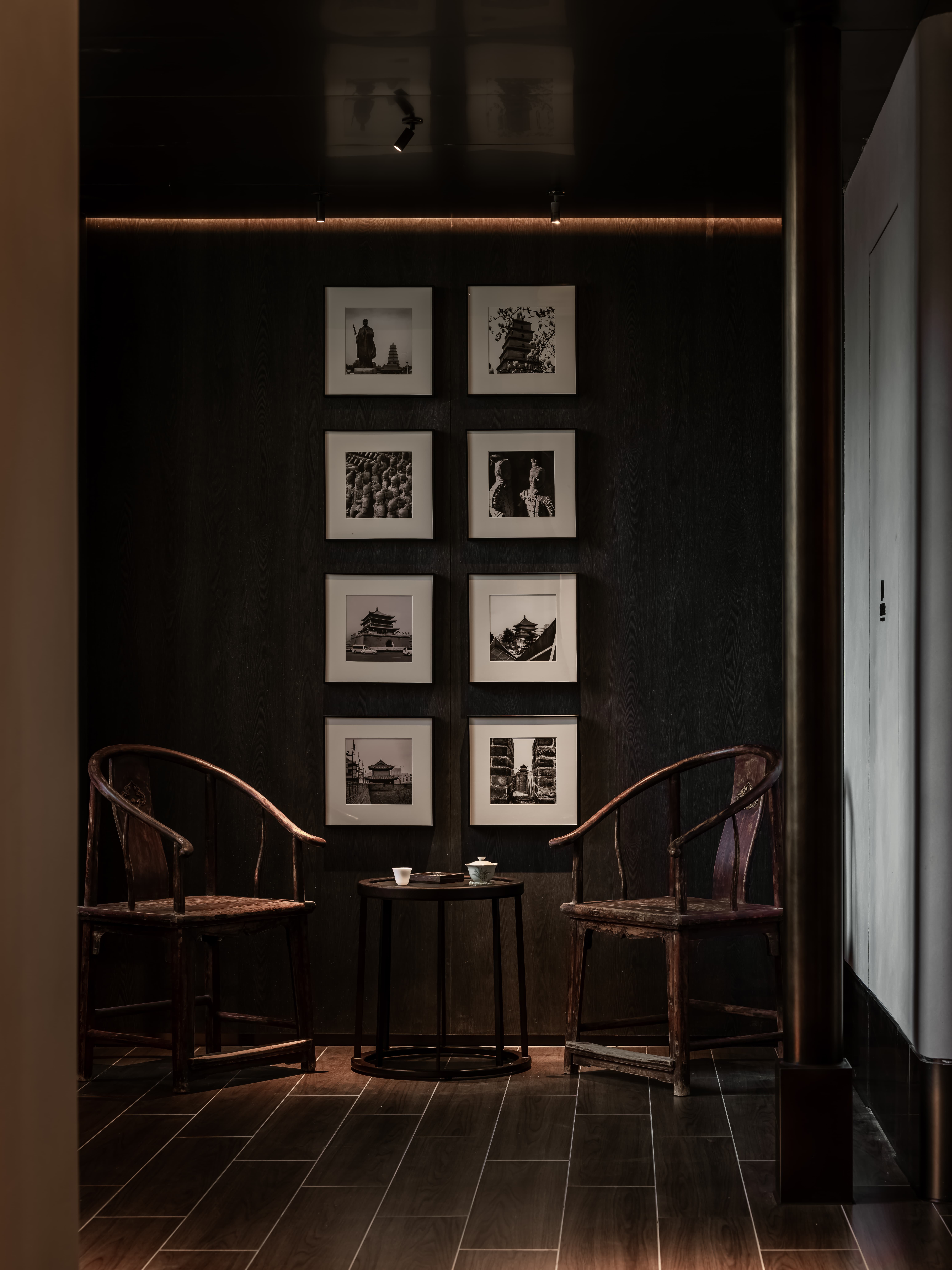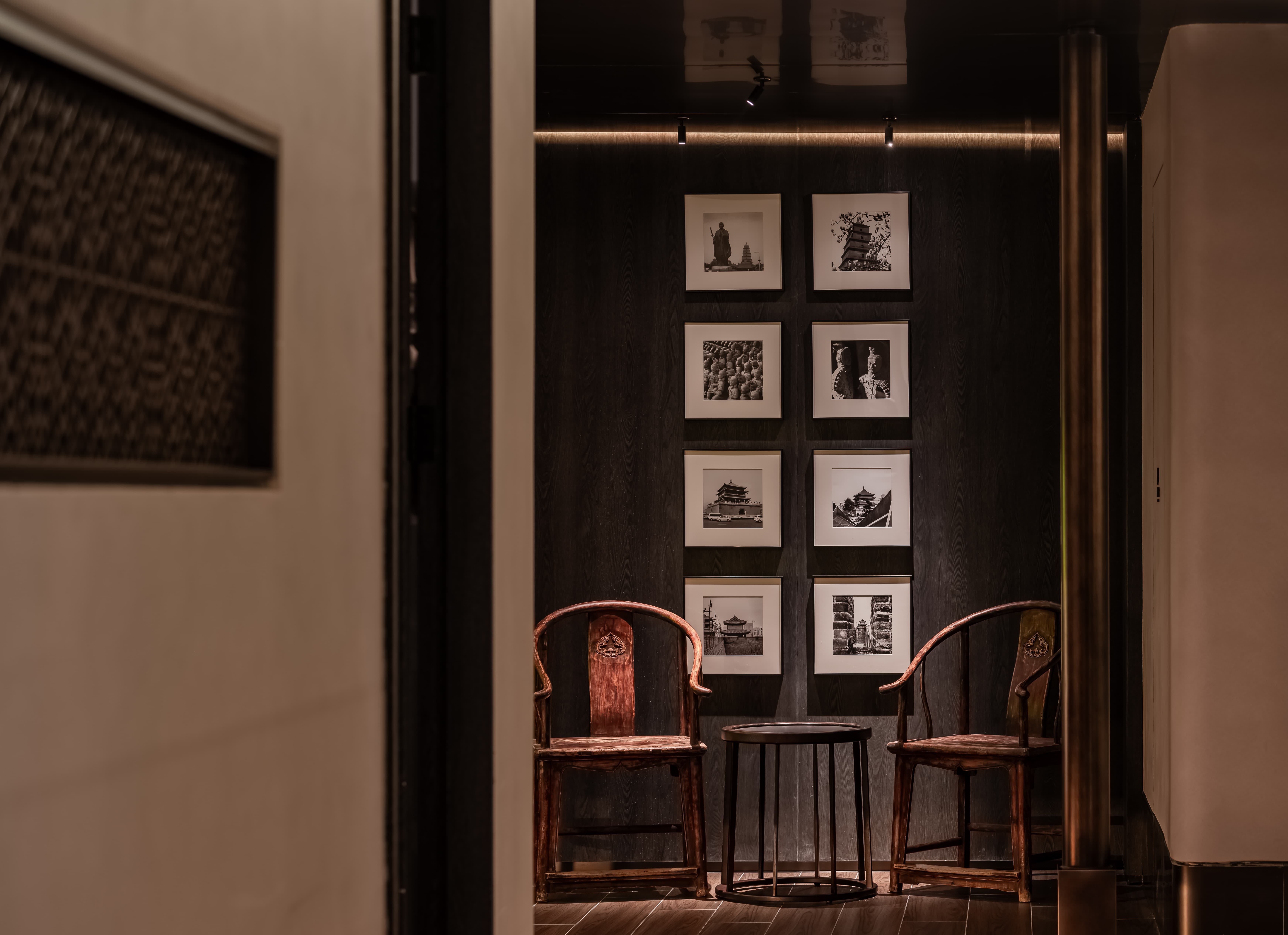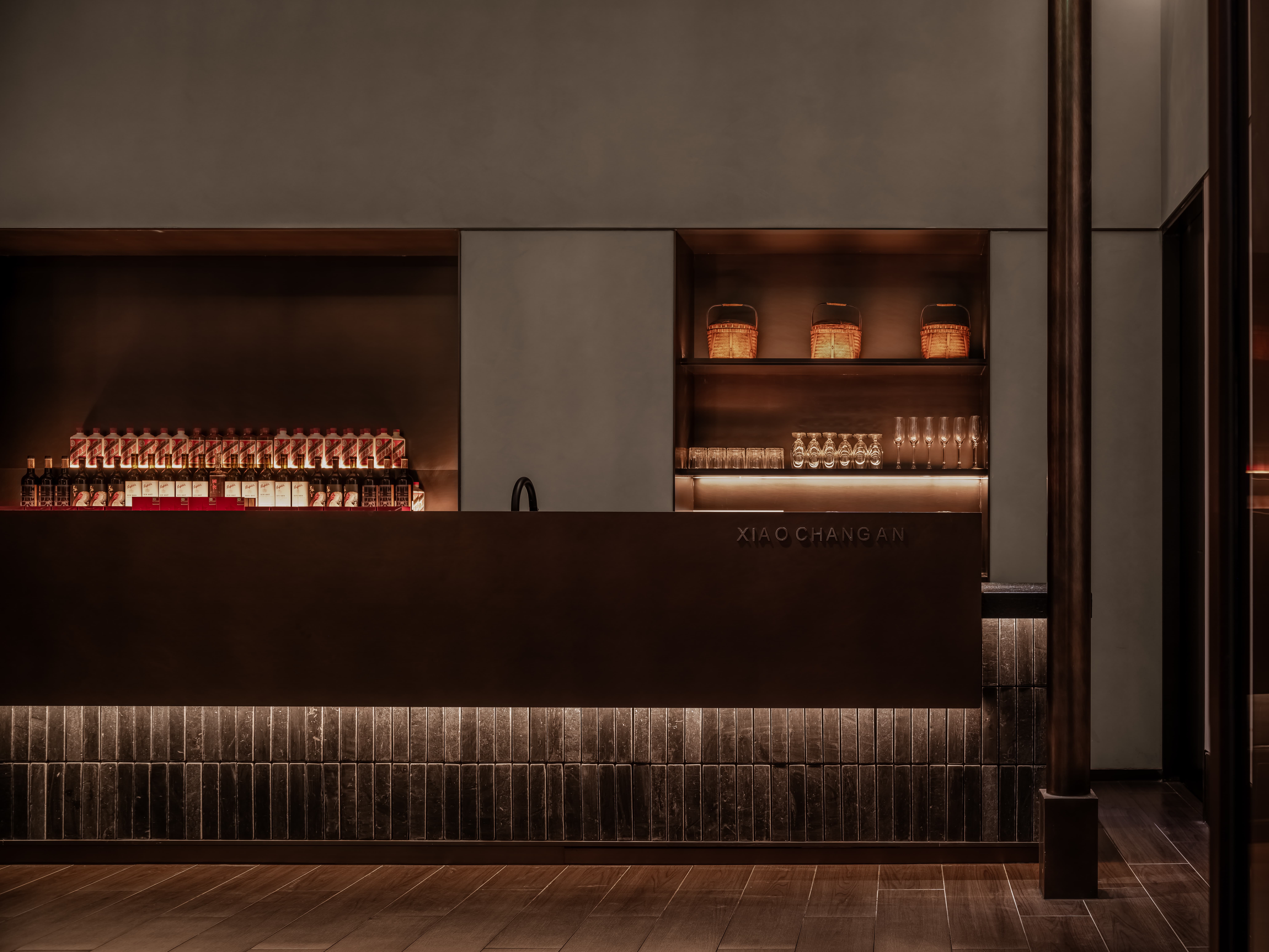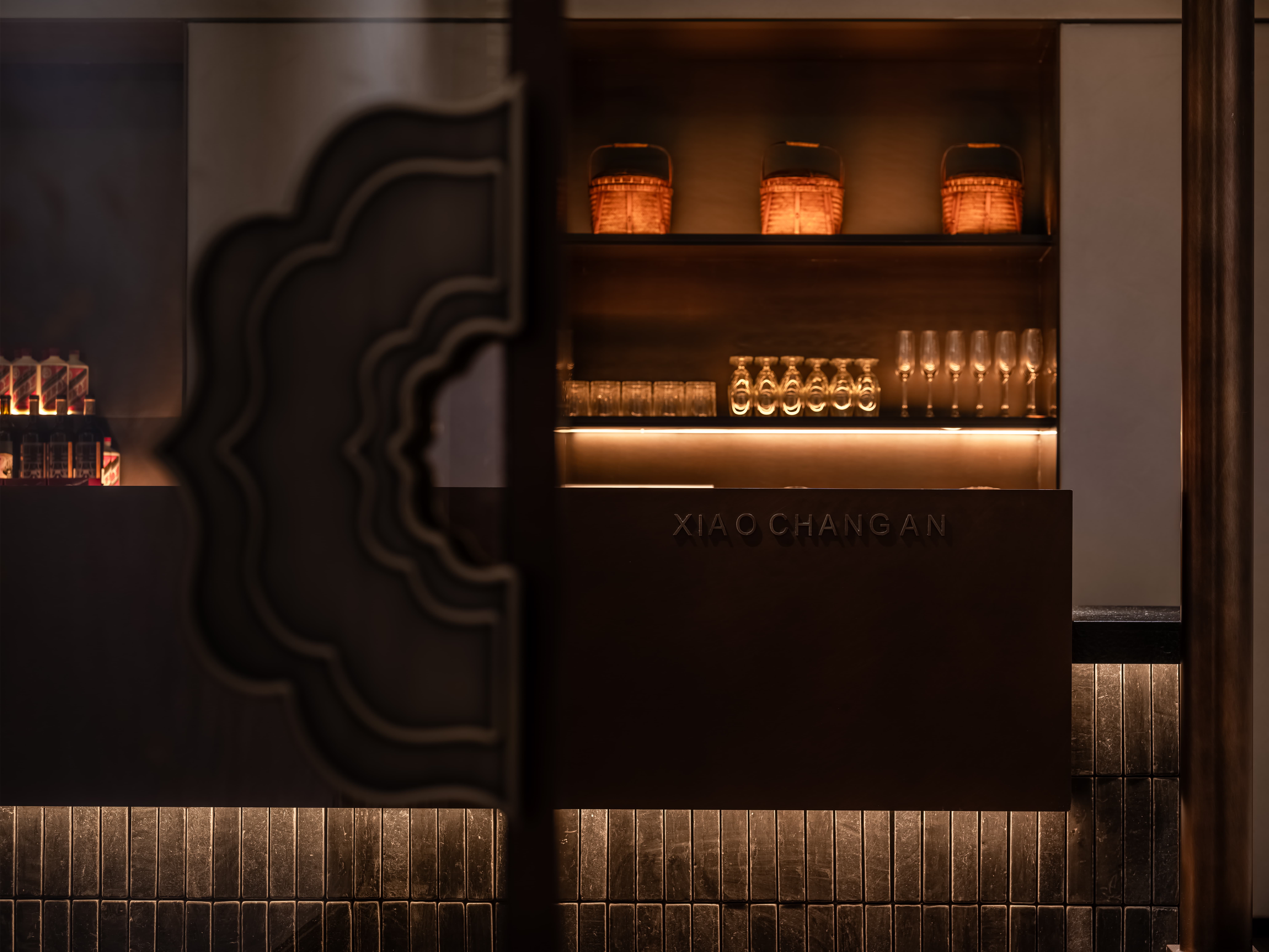吧台结合转角空间,是整个空间的公共设施,既是功能设置,亦是提升整个空间档次的“装置”,通过光线、色彩、质地、尺度输出-晓长安-的记忆点语言。