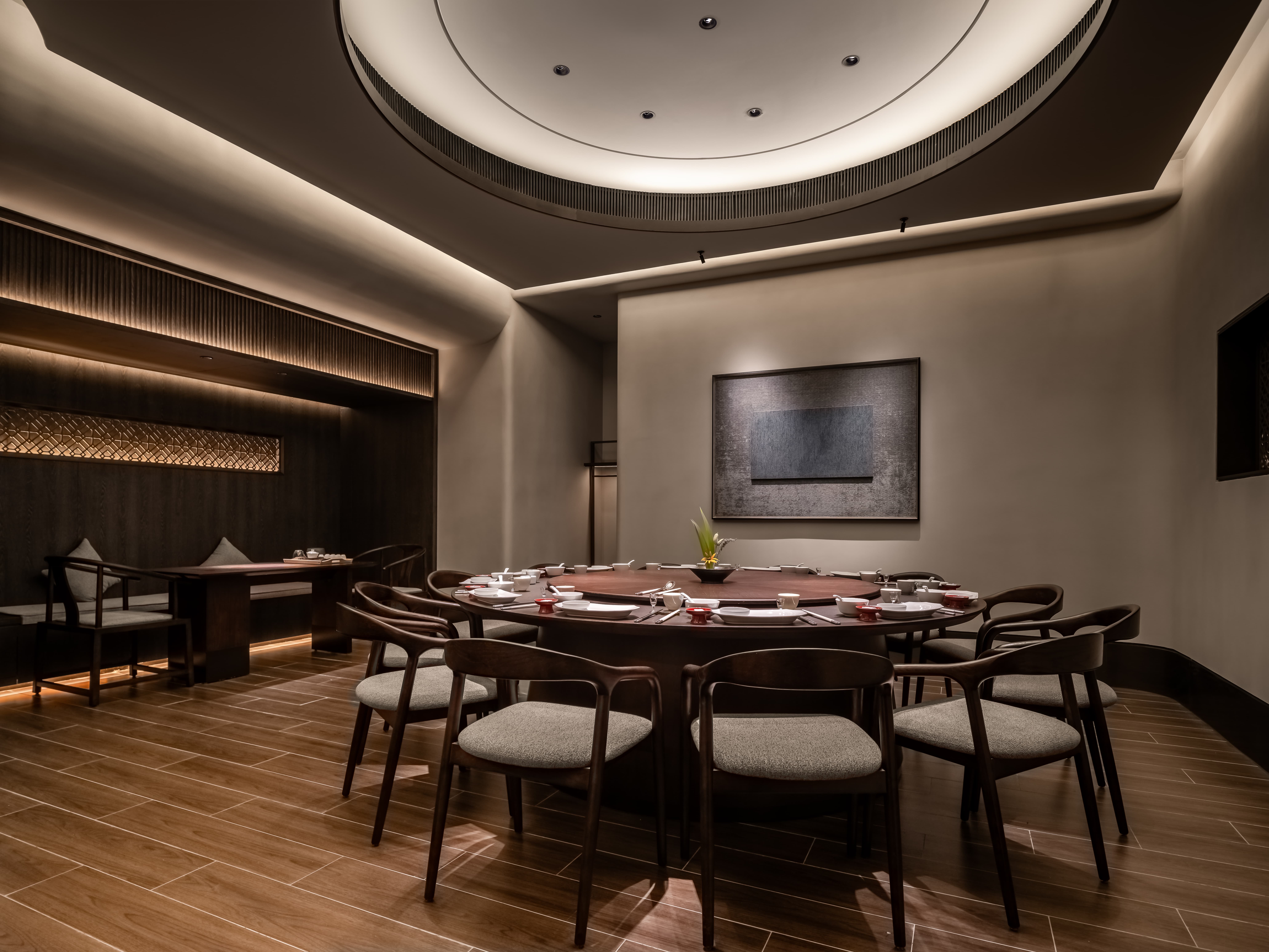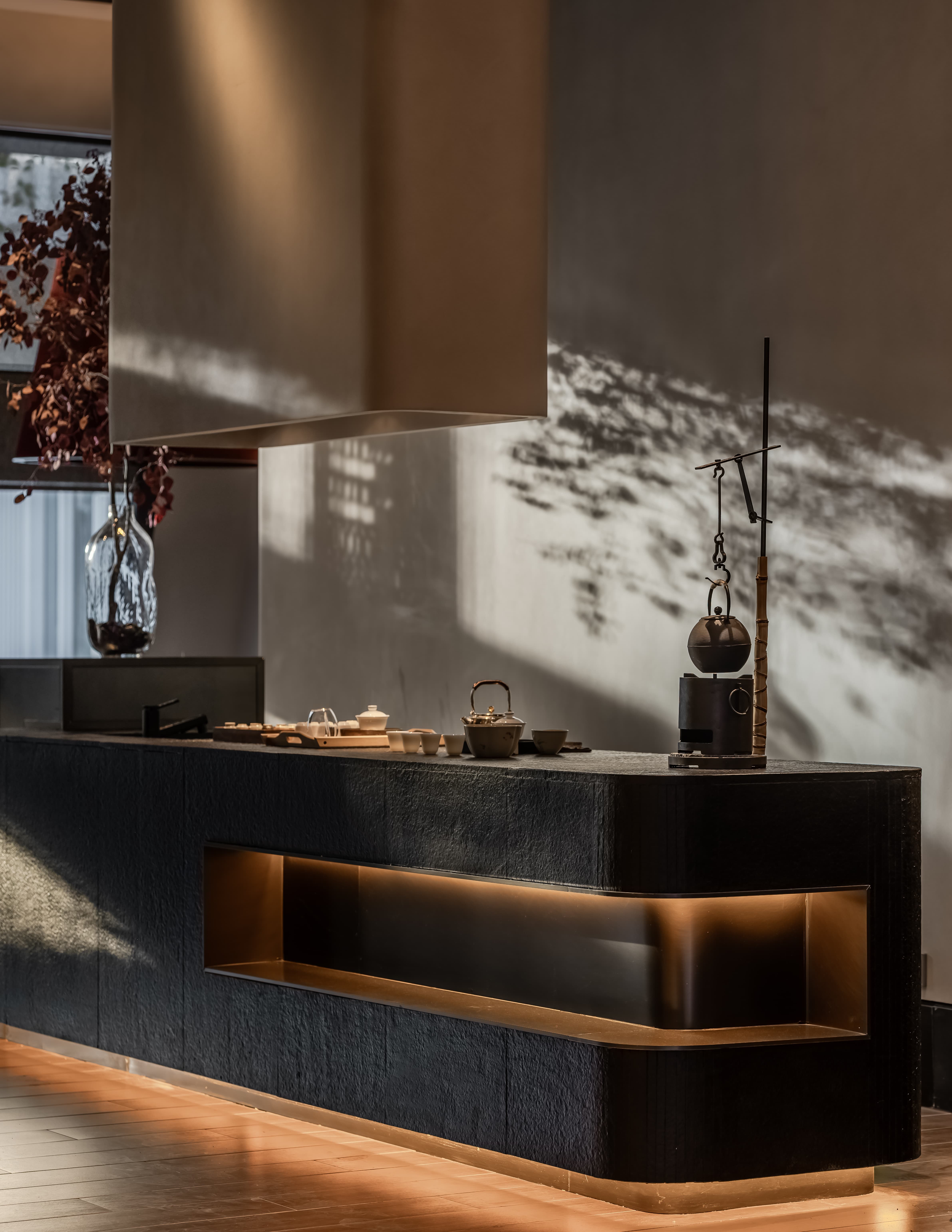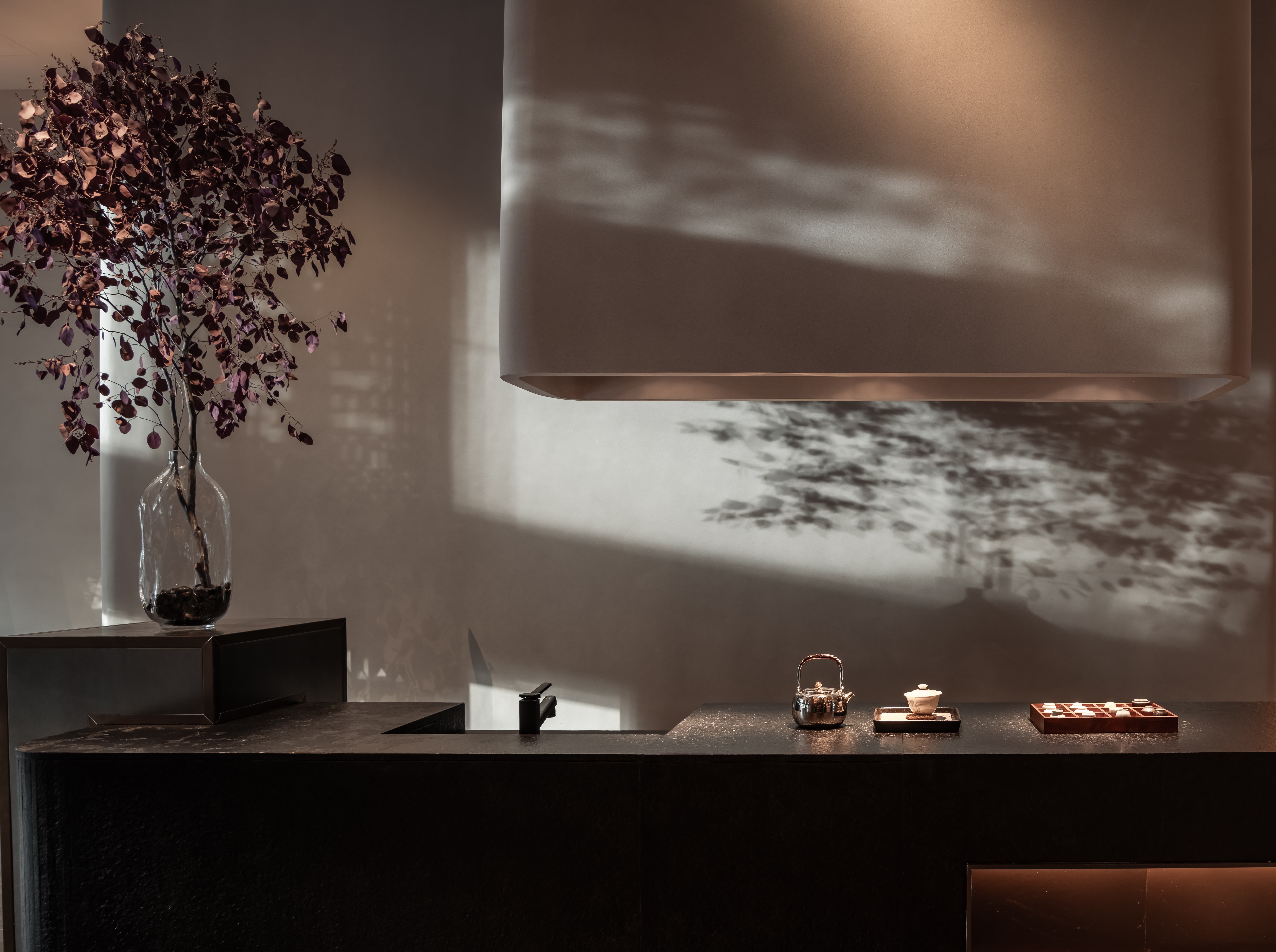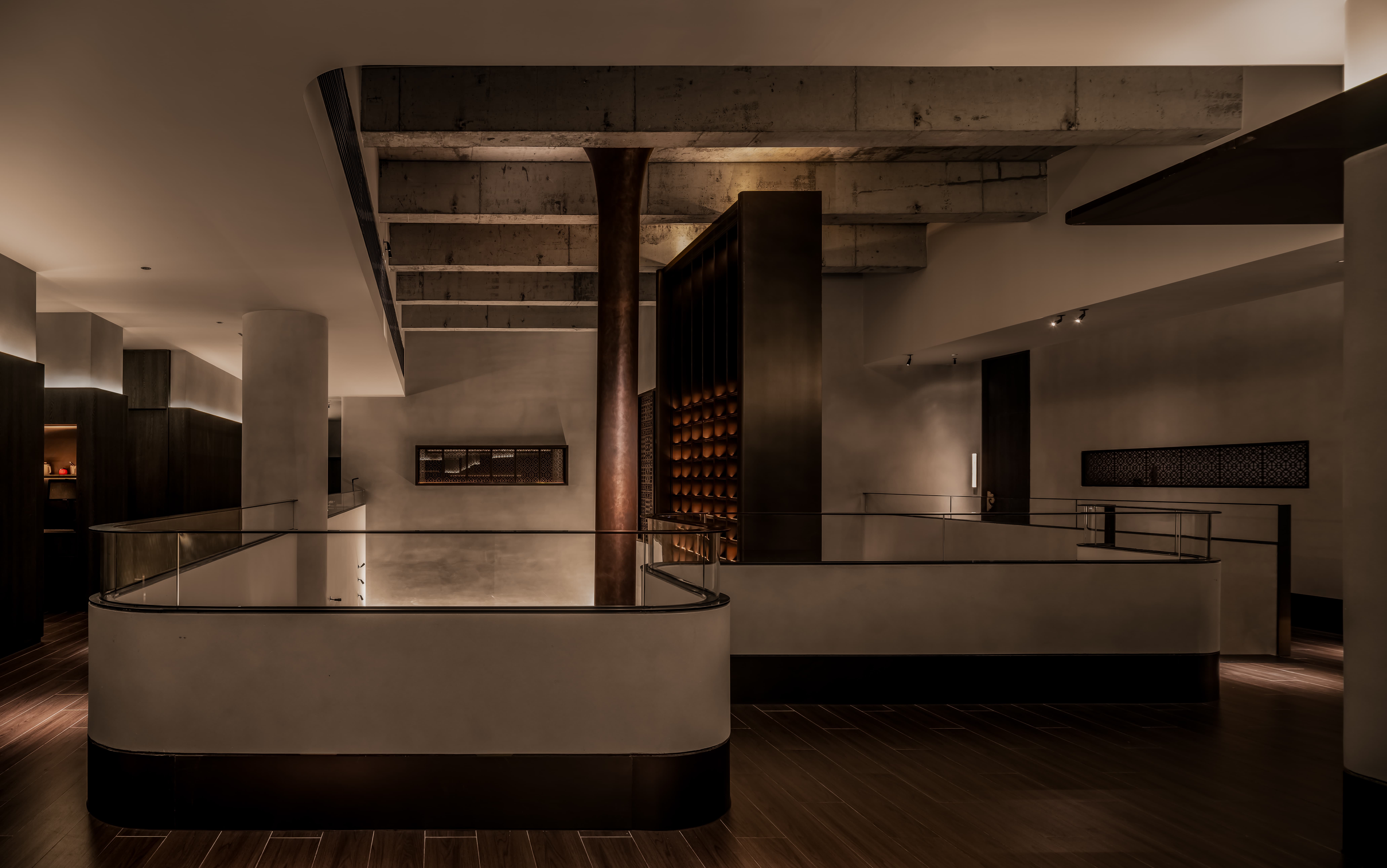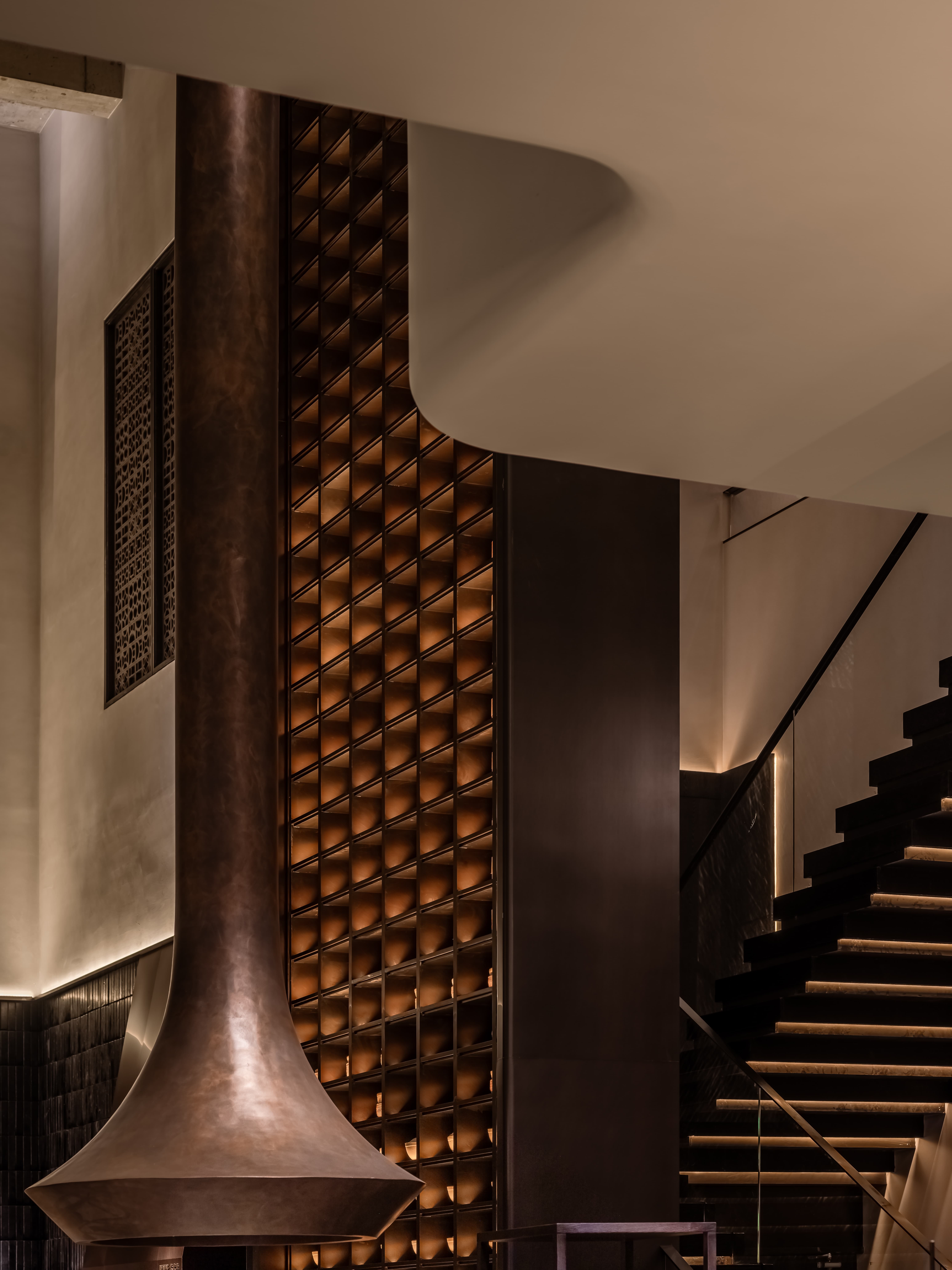 吧台结合转角空间,是整个空间的公共设施,既是功能设置,亦是提升整个空间档次的“装置”,通过光线、色彩、质地、尺度输出-晓长安-的记忆点语言。