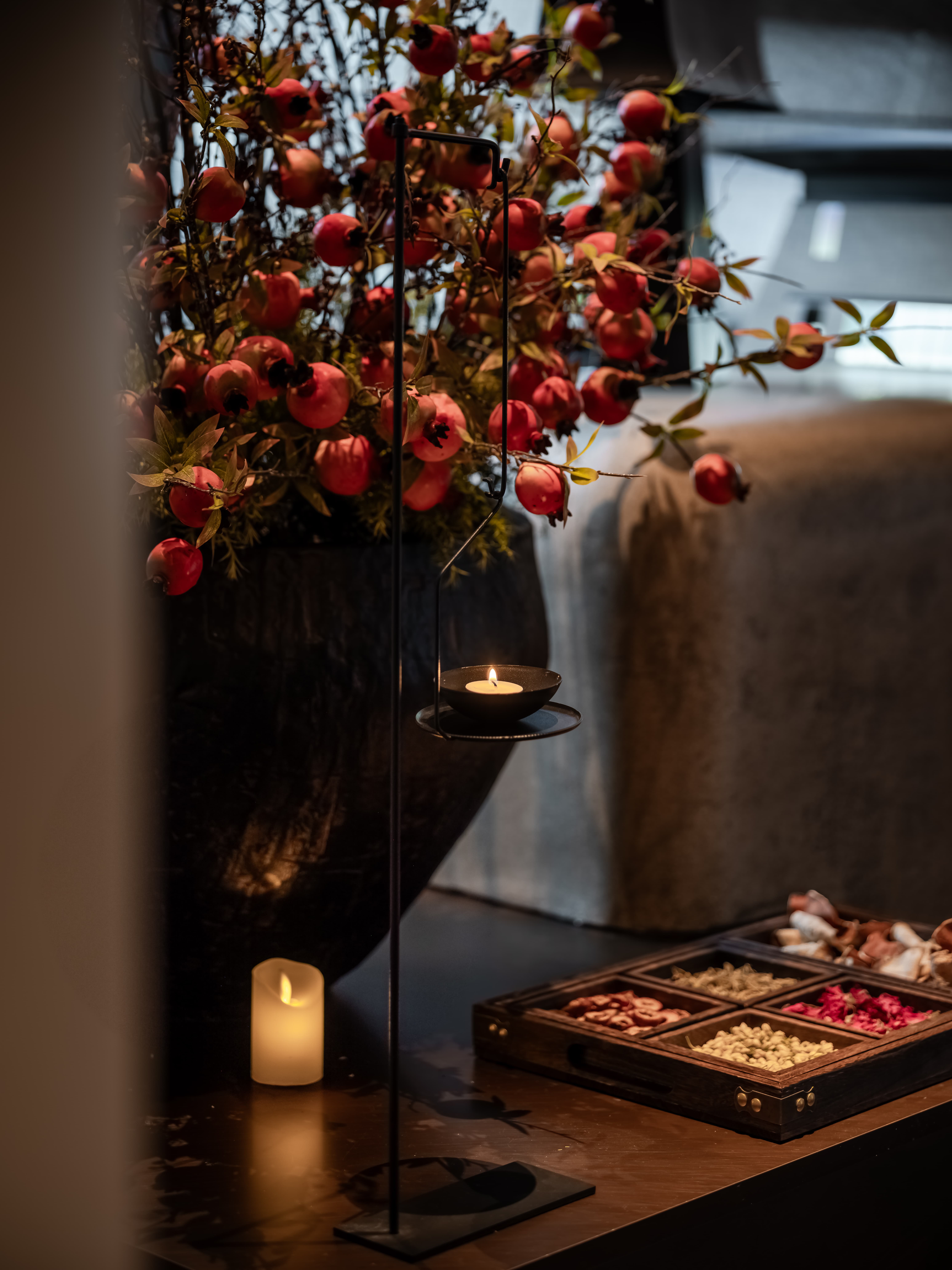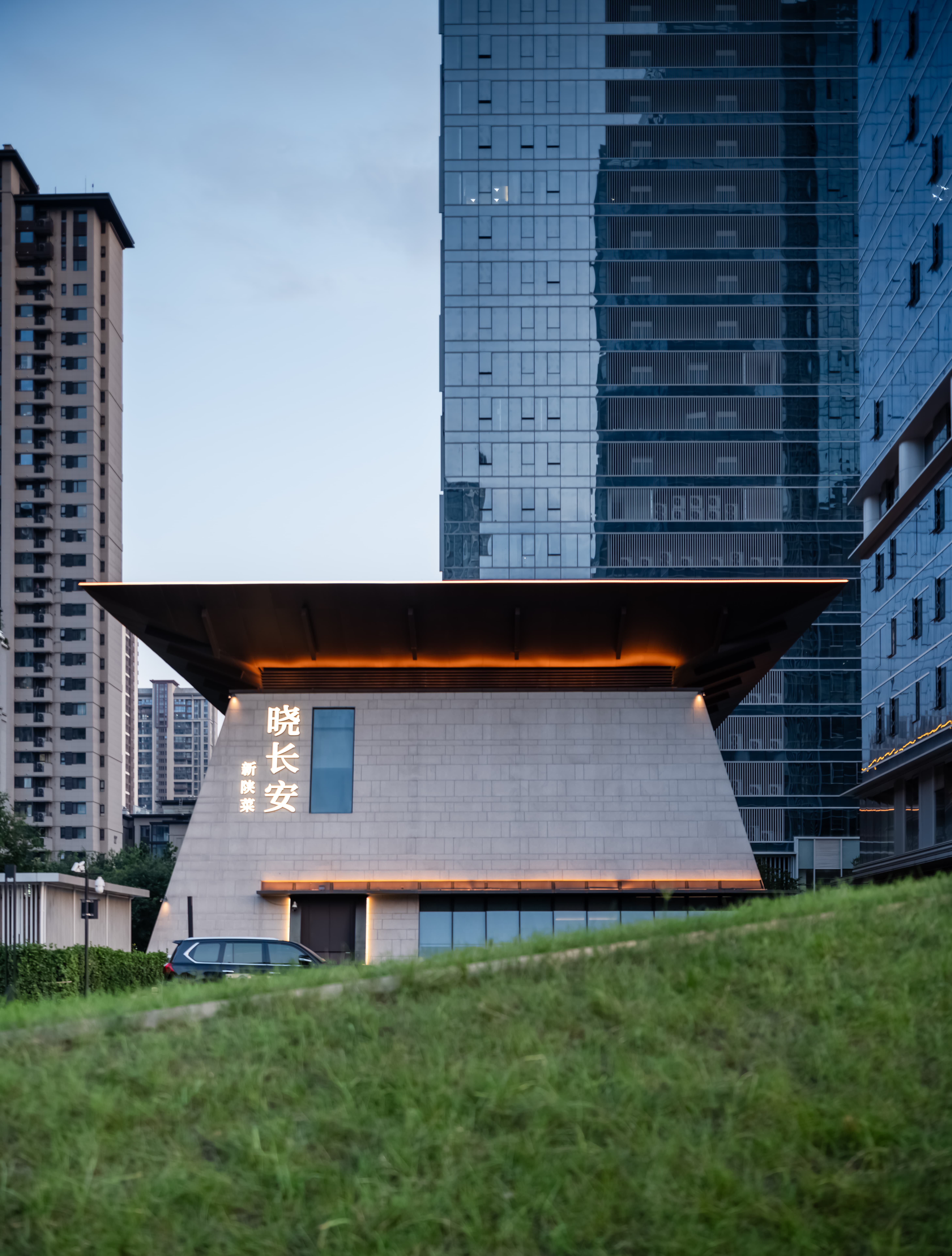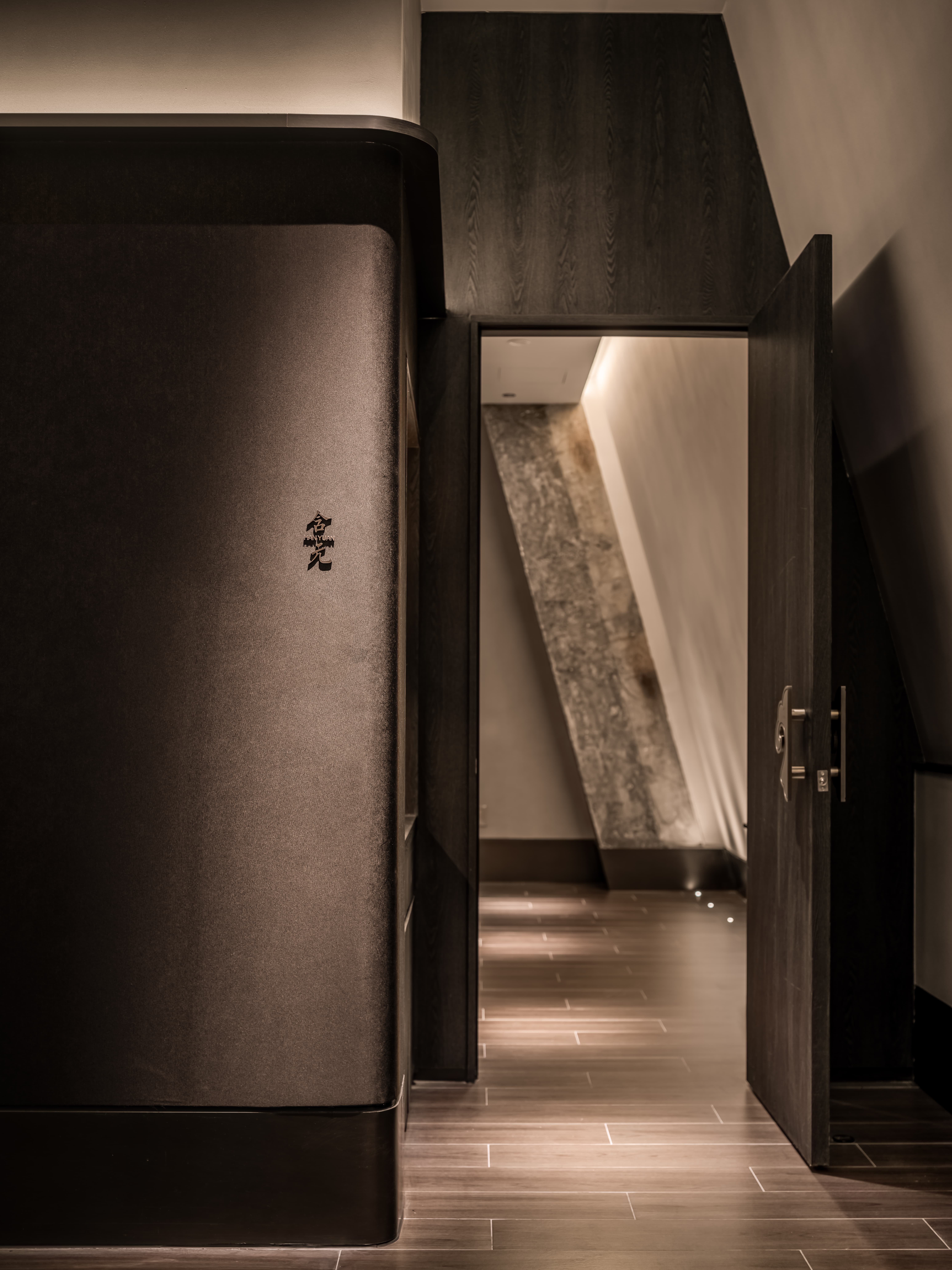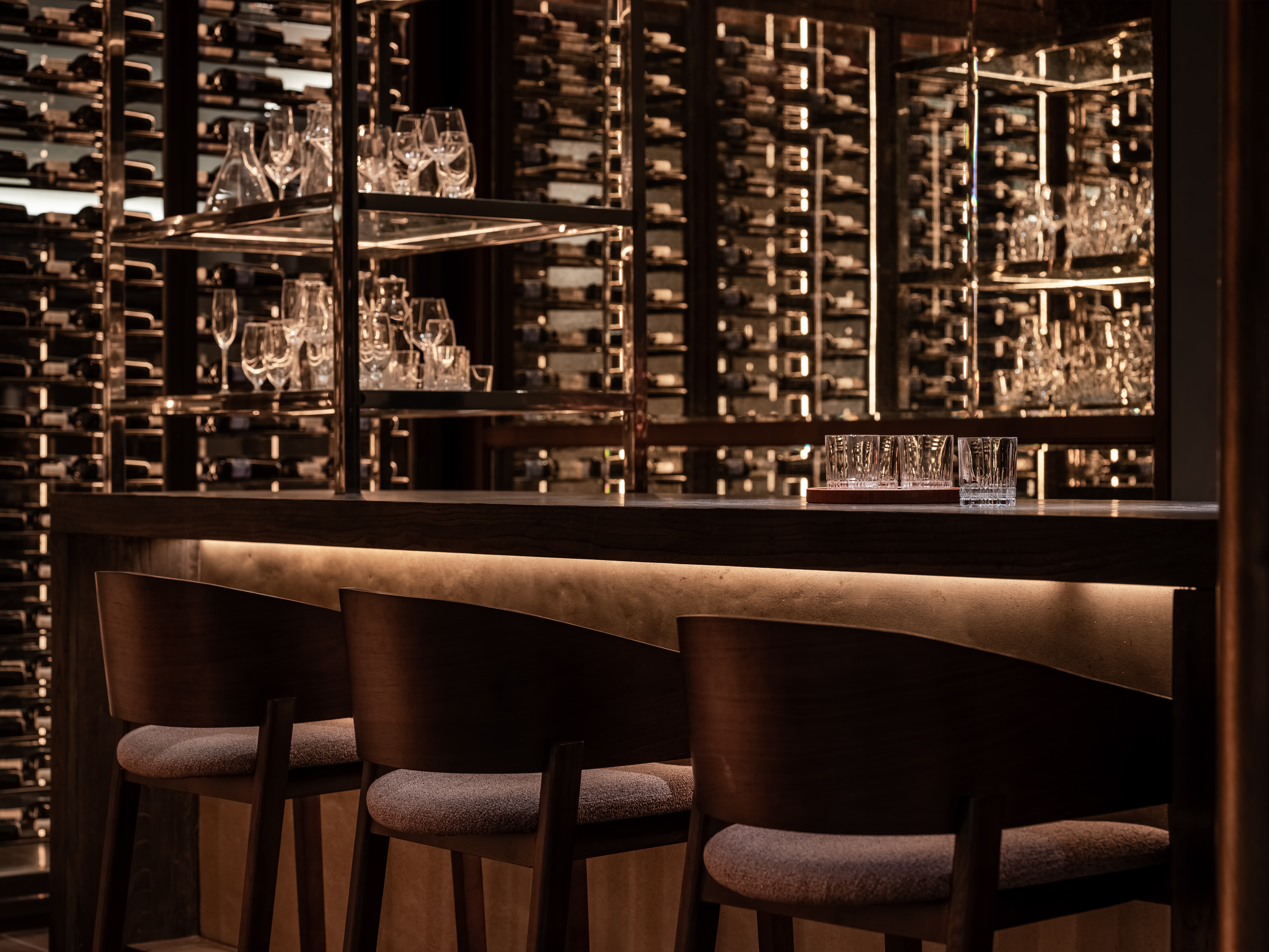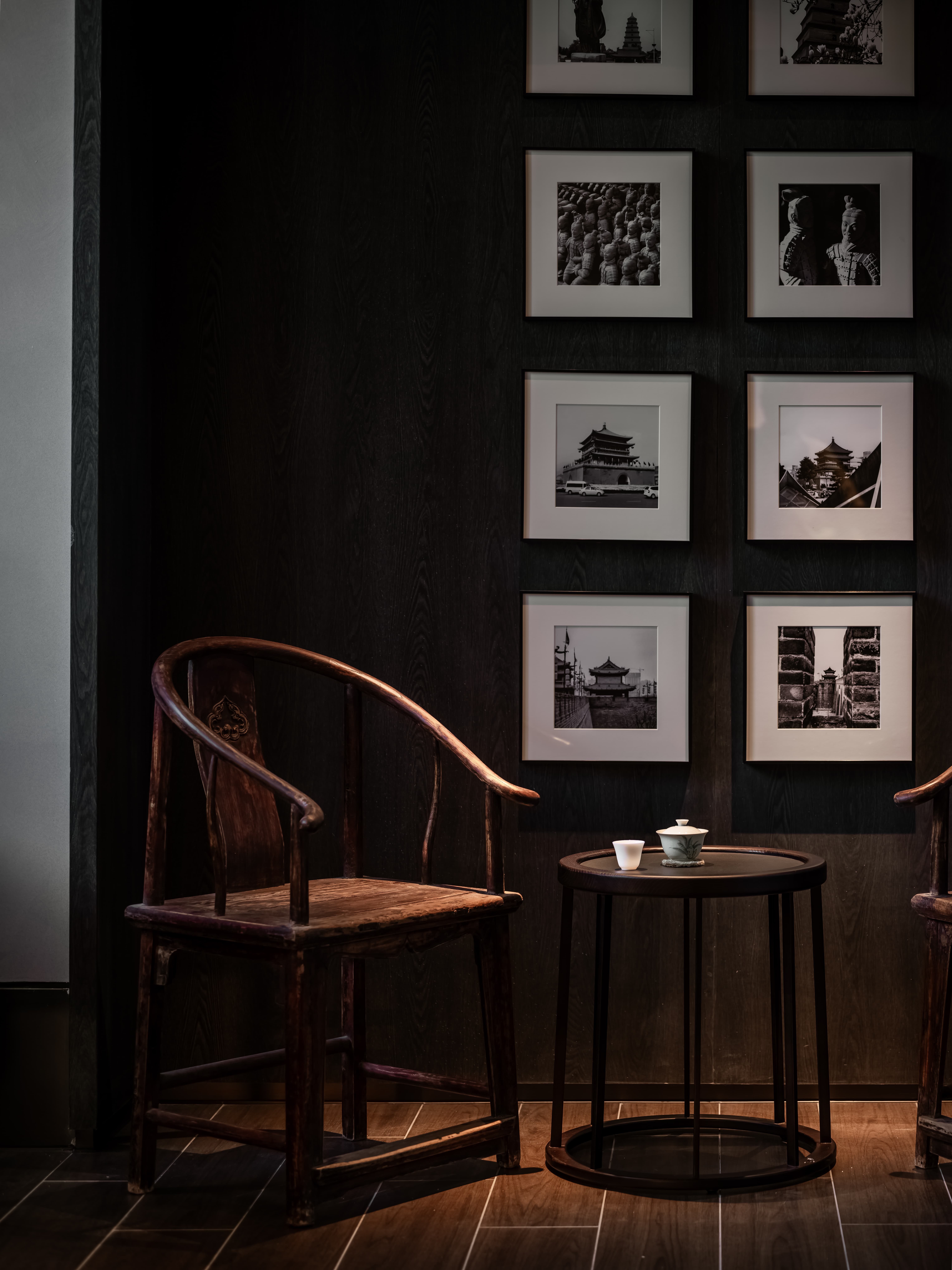 吧台结合转角空间,是整个空间的公共设施,既是功能设置,亦是提升整个空间档次的“装置”,通过光线、色彩、质地、尺度输出-晓长安-的记忆点语言。