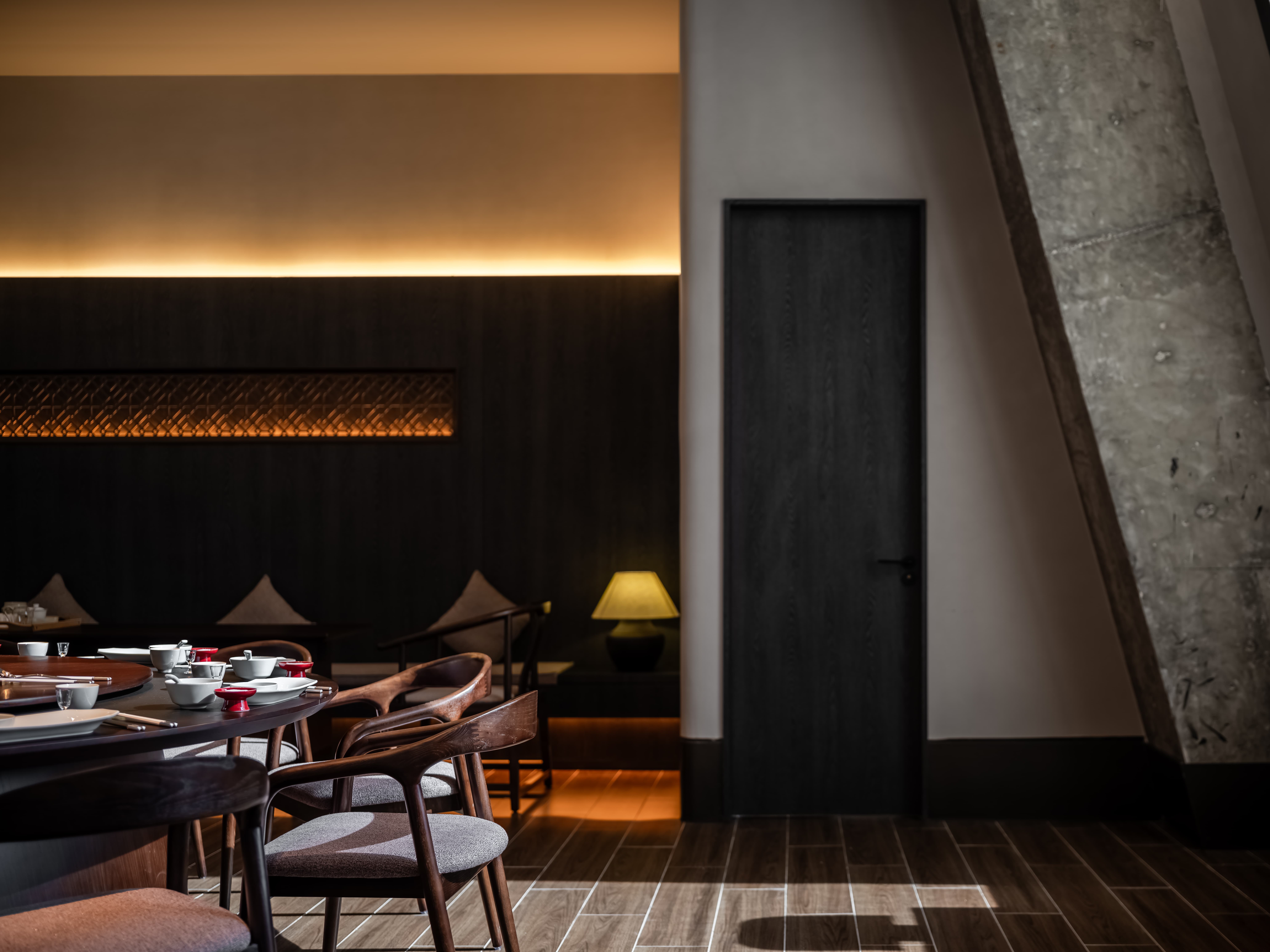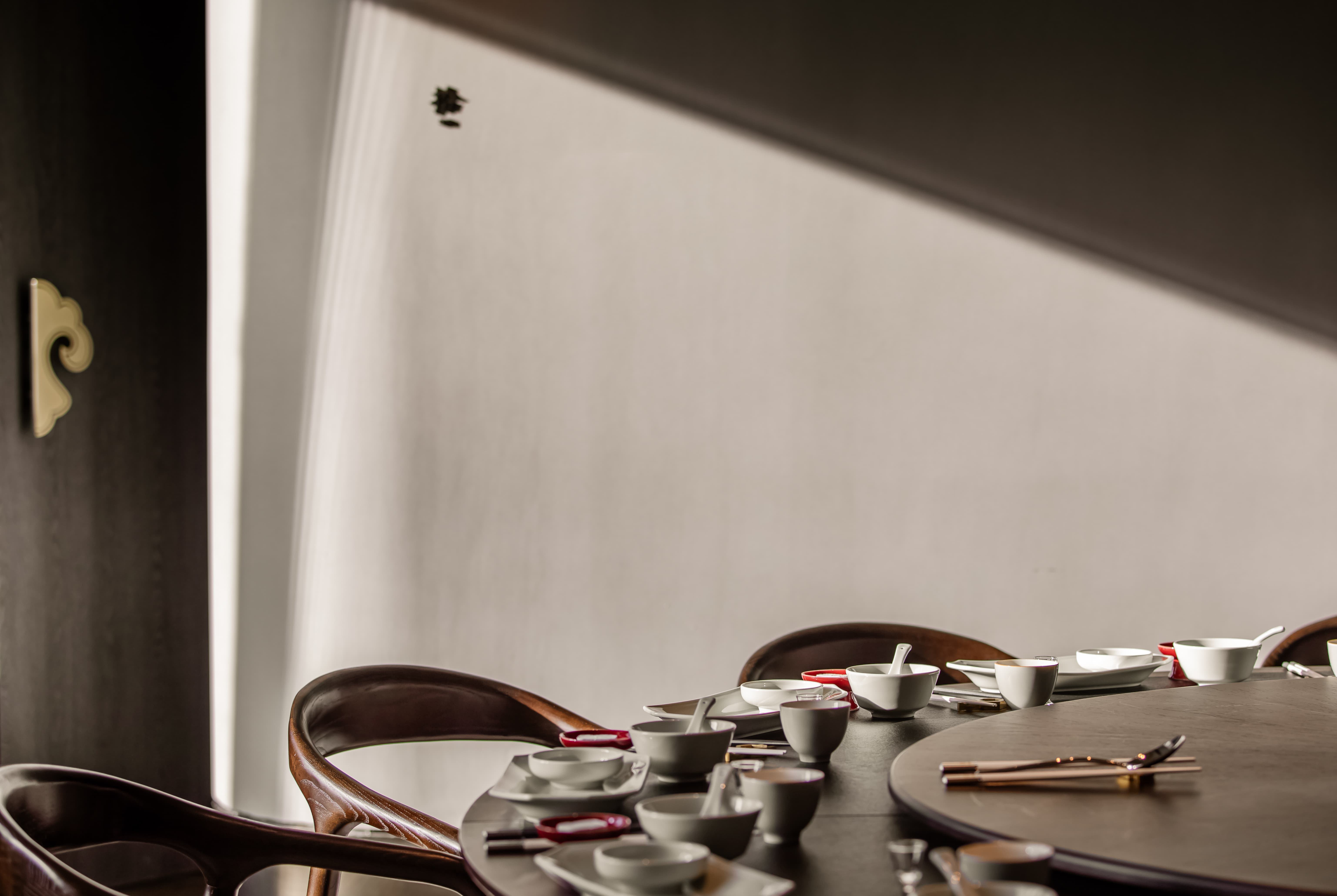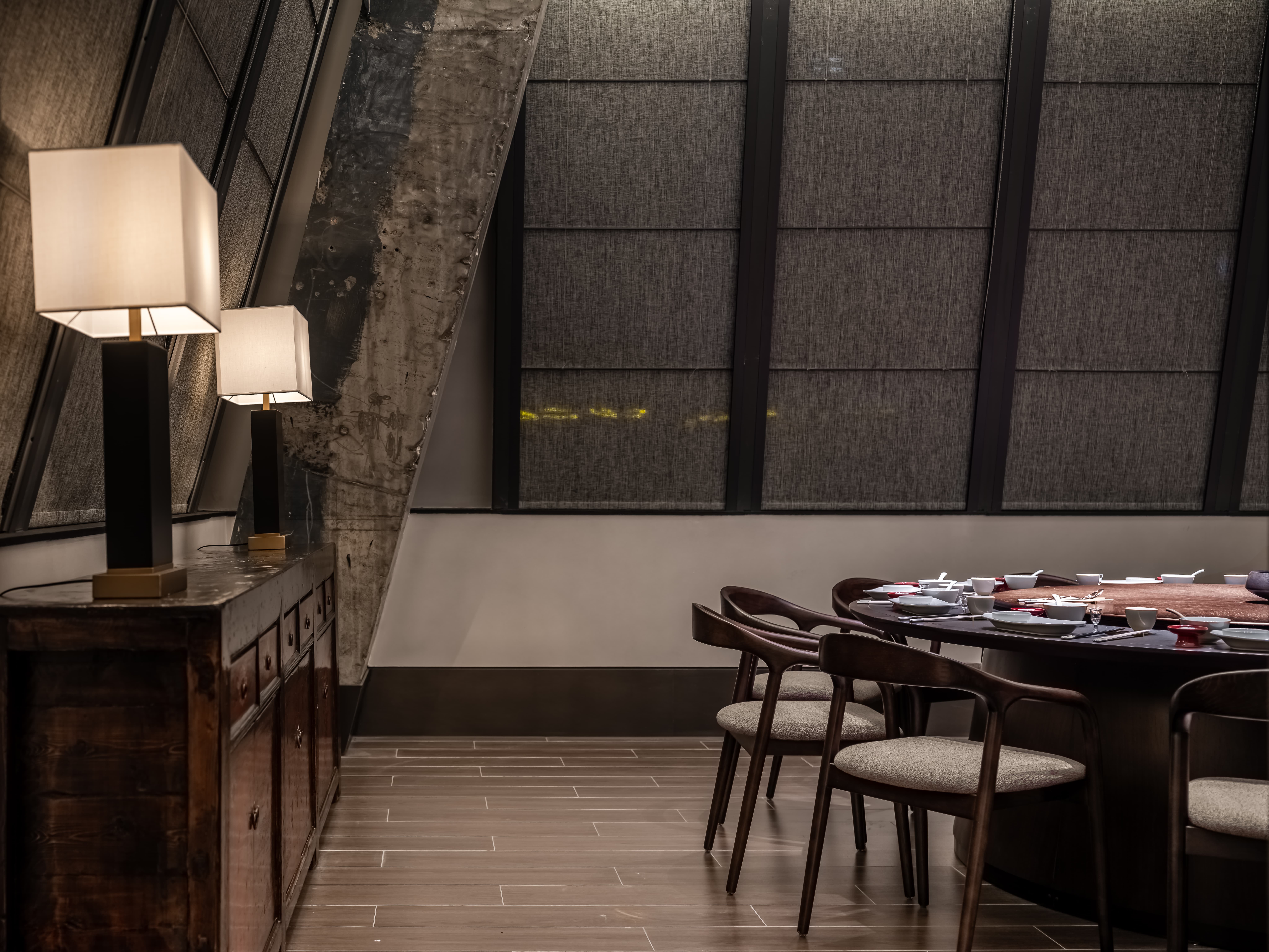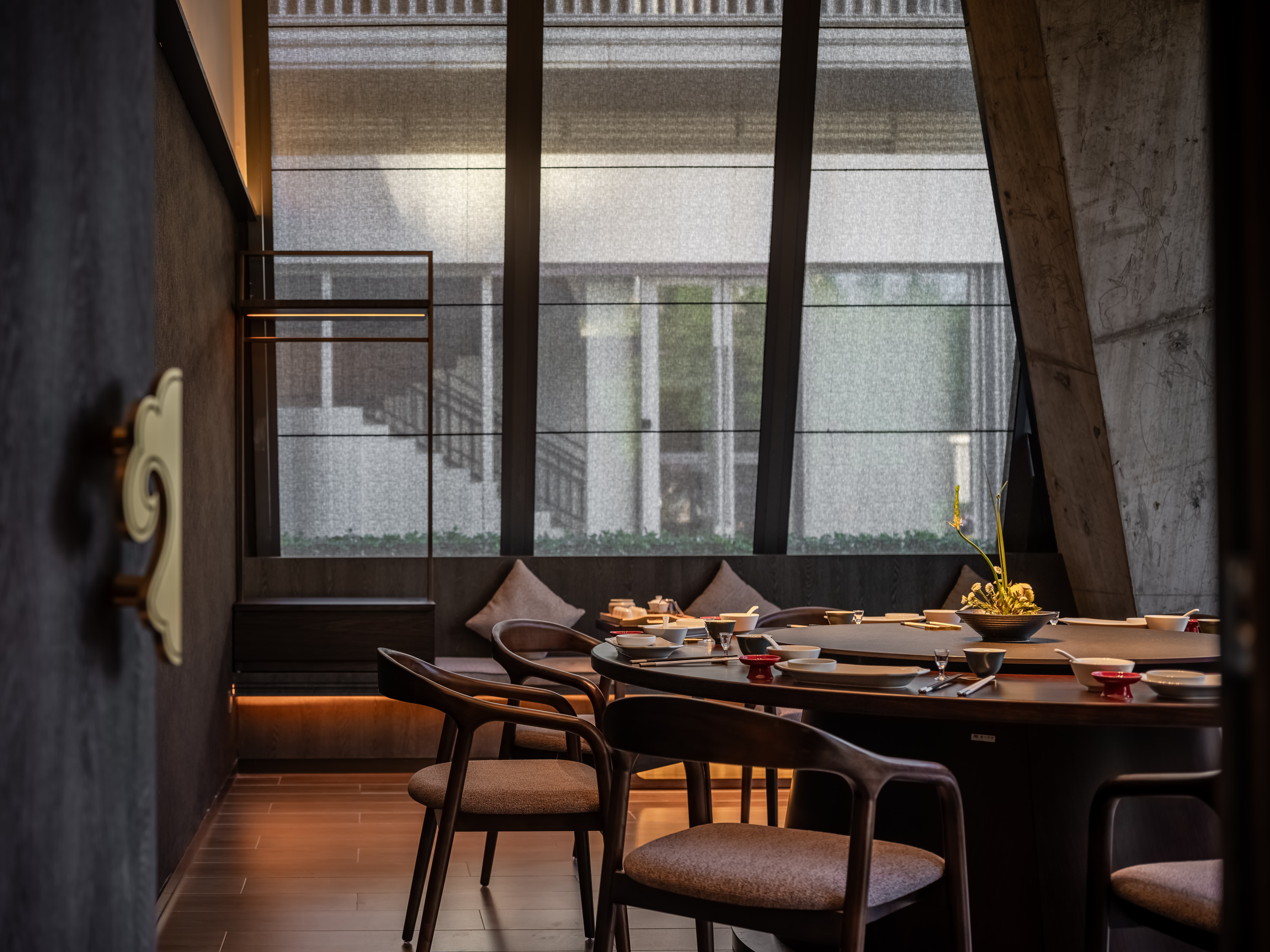 散座区,一边面向街面的小铺子,一边是办公绿化,外是人间烟火,内是高级中餐,裸露的水泥材质和室外的水泥台子在同一视觉空间,融合烟火,晓长安不再是“孤独的”,是长在这里,隐在这里的,内外的互动,周边的交互,空间中各样不同的生态关系在流转。 -