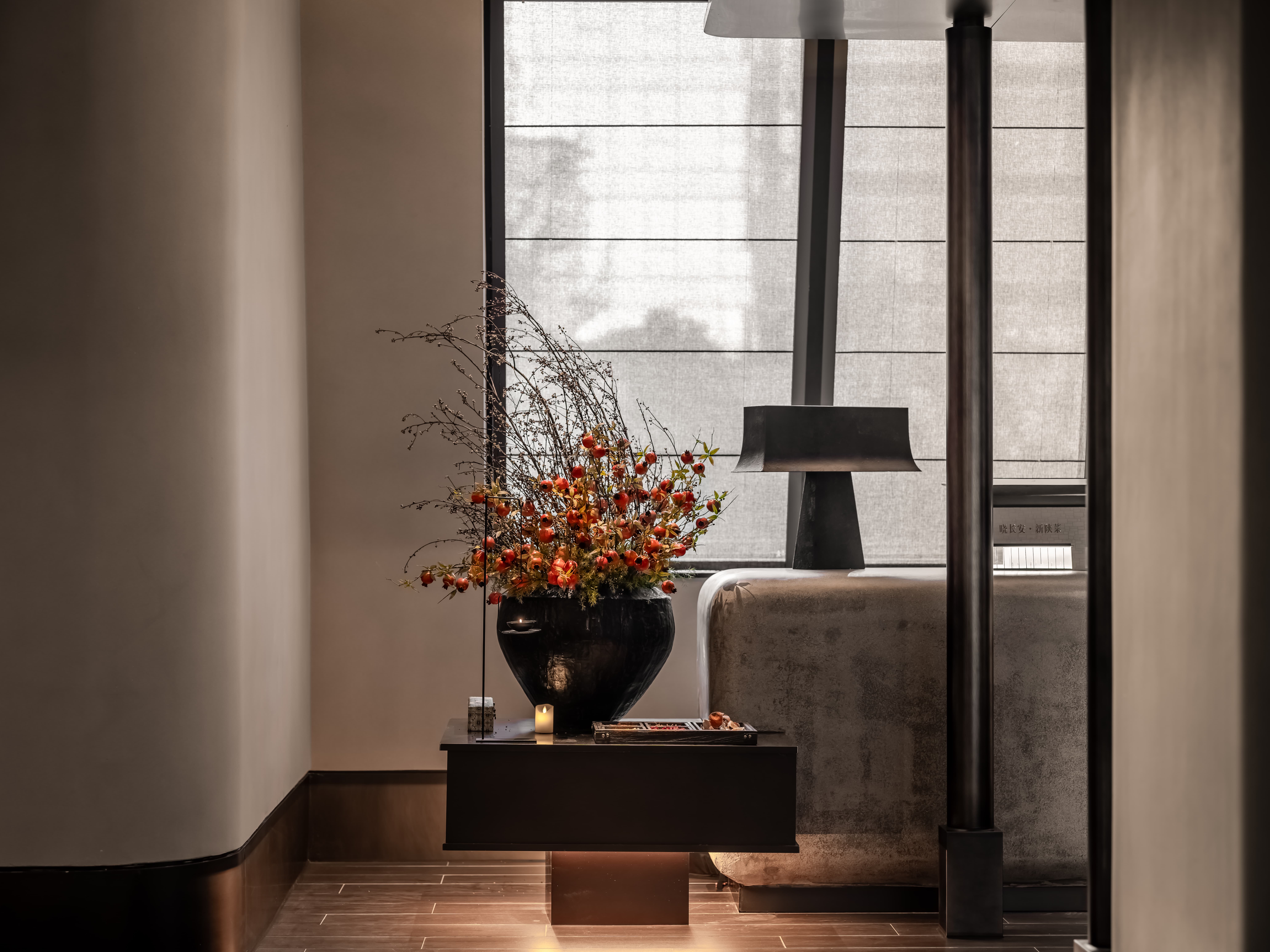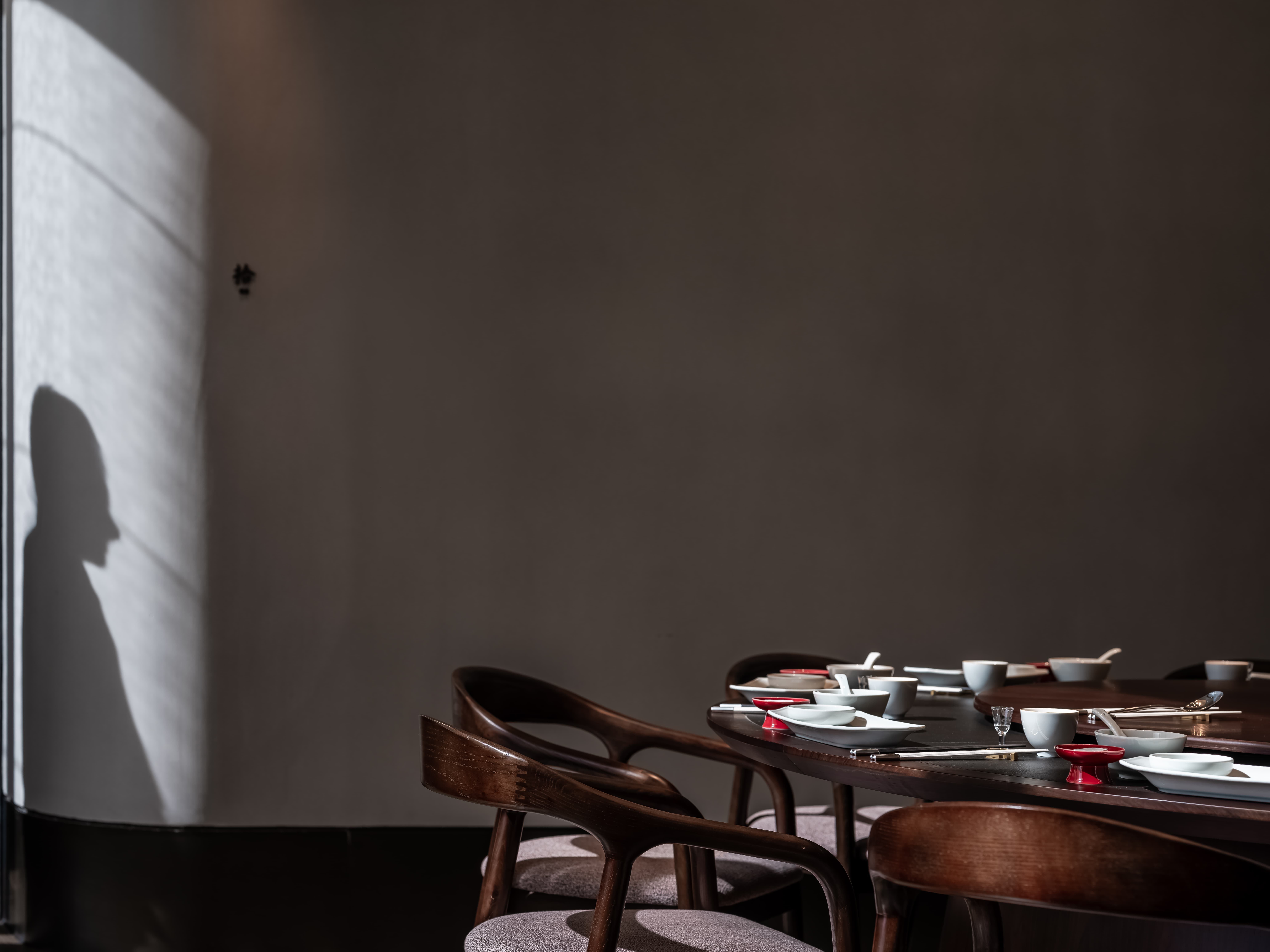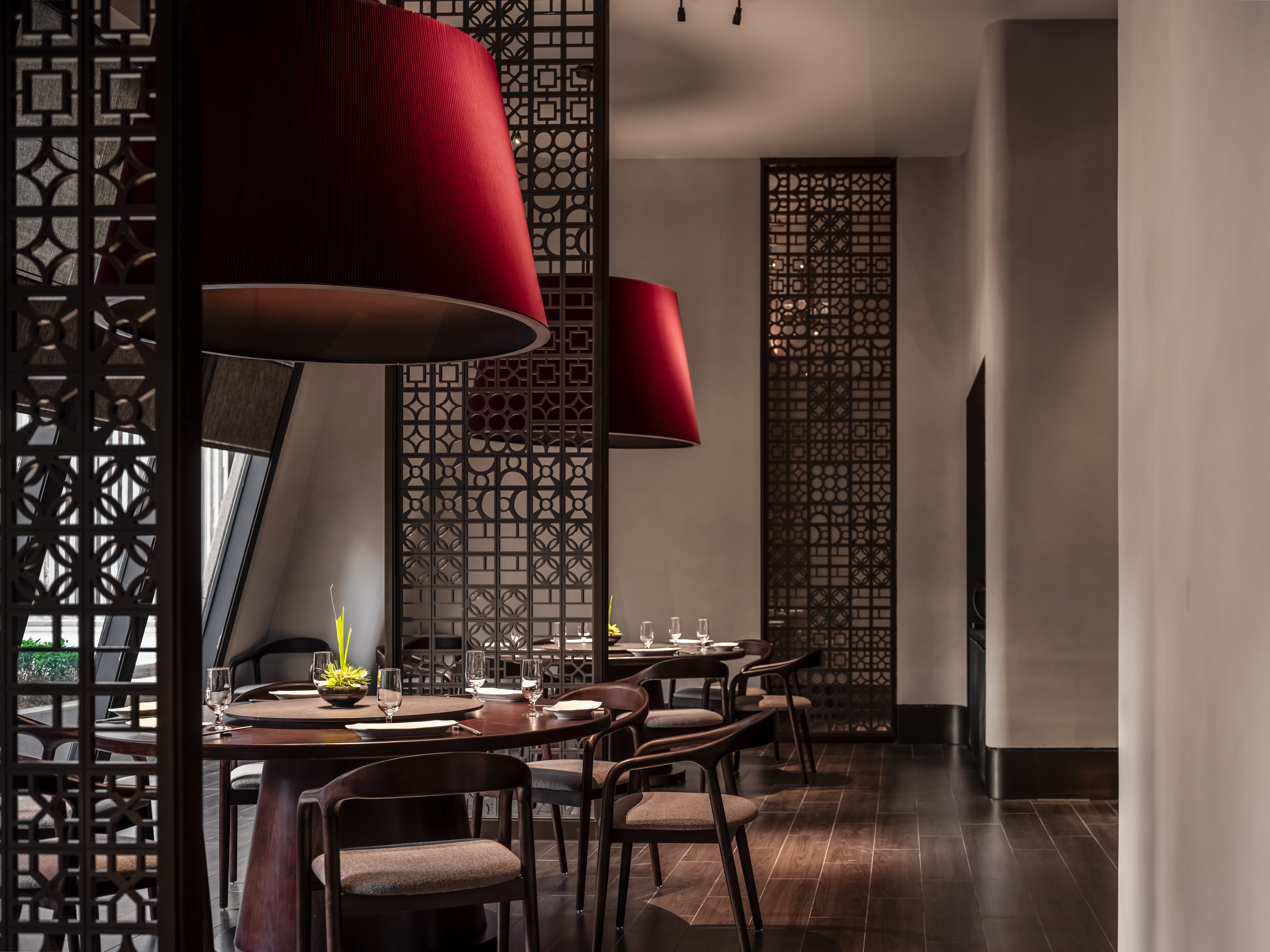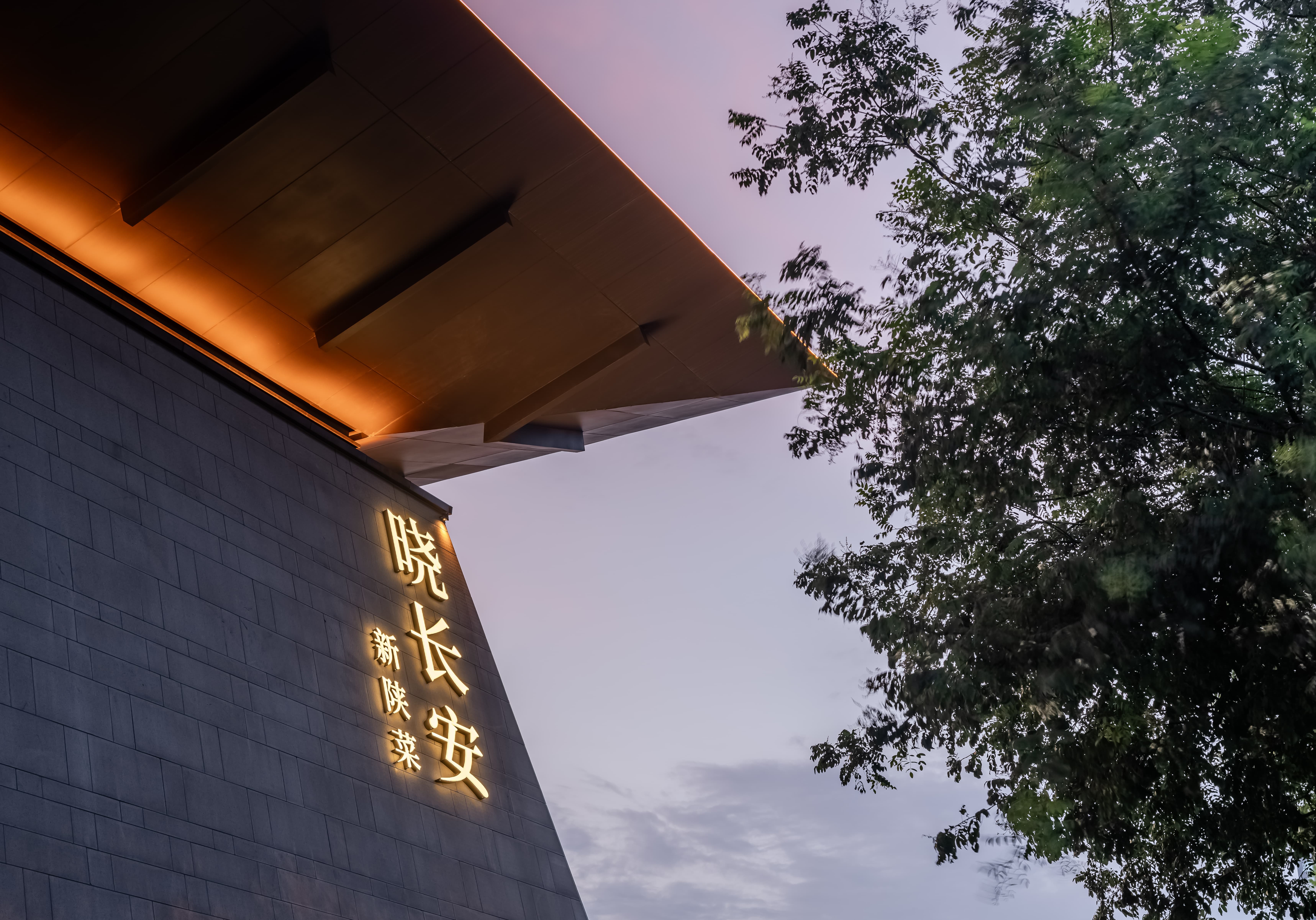 散座区,一边面向街面的小铺子,一边是办公绿化,外是人间烟火,内是高级中餐,裸露的水泥材质和室外的水泥台子在同一视觉空间,融合烟火,晓长安不再是“孤独的”,是长在这里,隐在这里的,内外的互动,周边的交互,空间中各样不同的生态关系在流转。 -