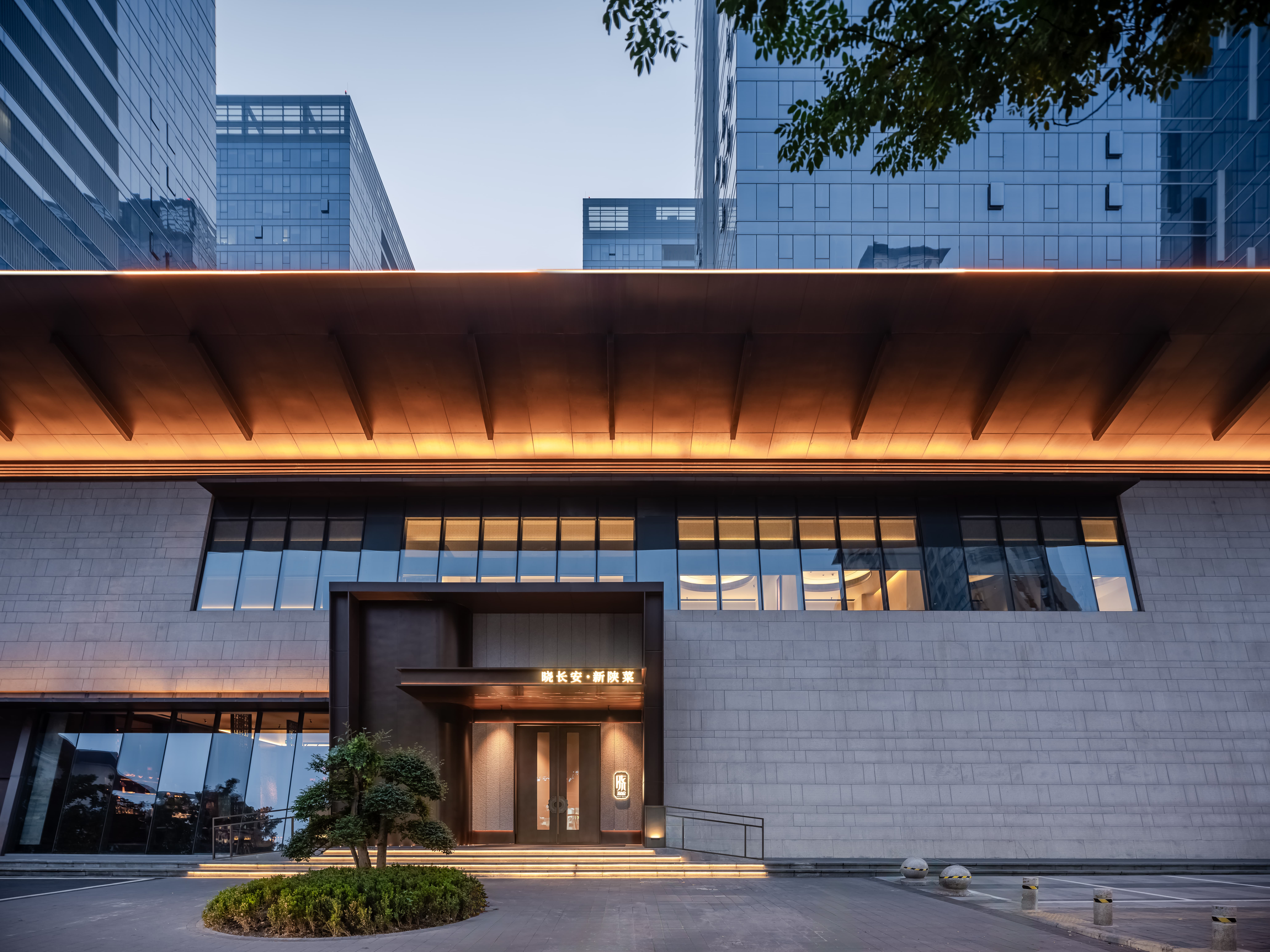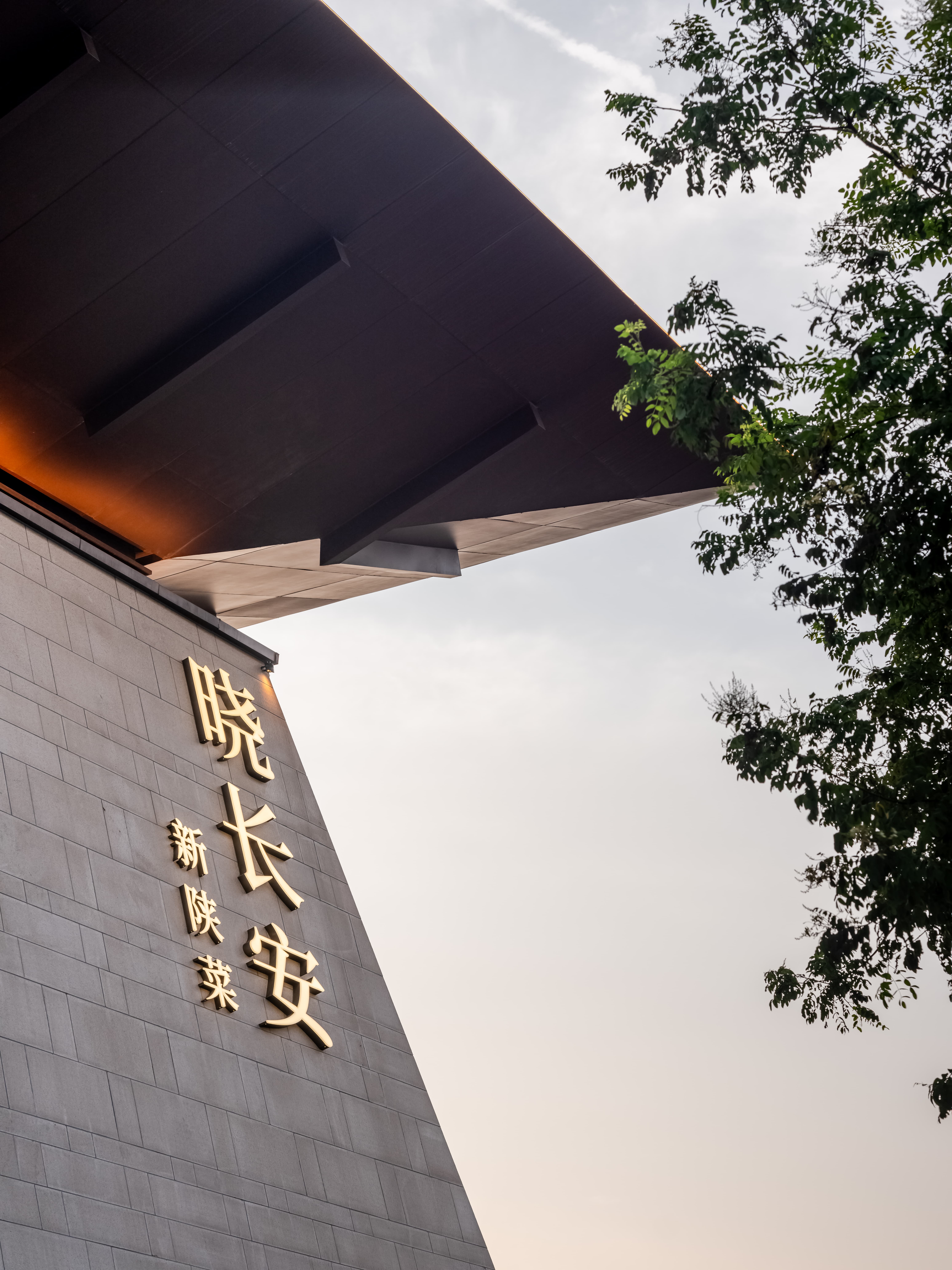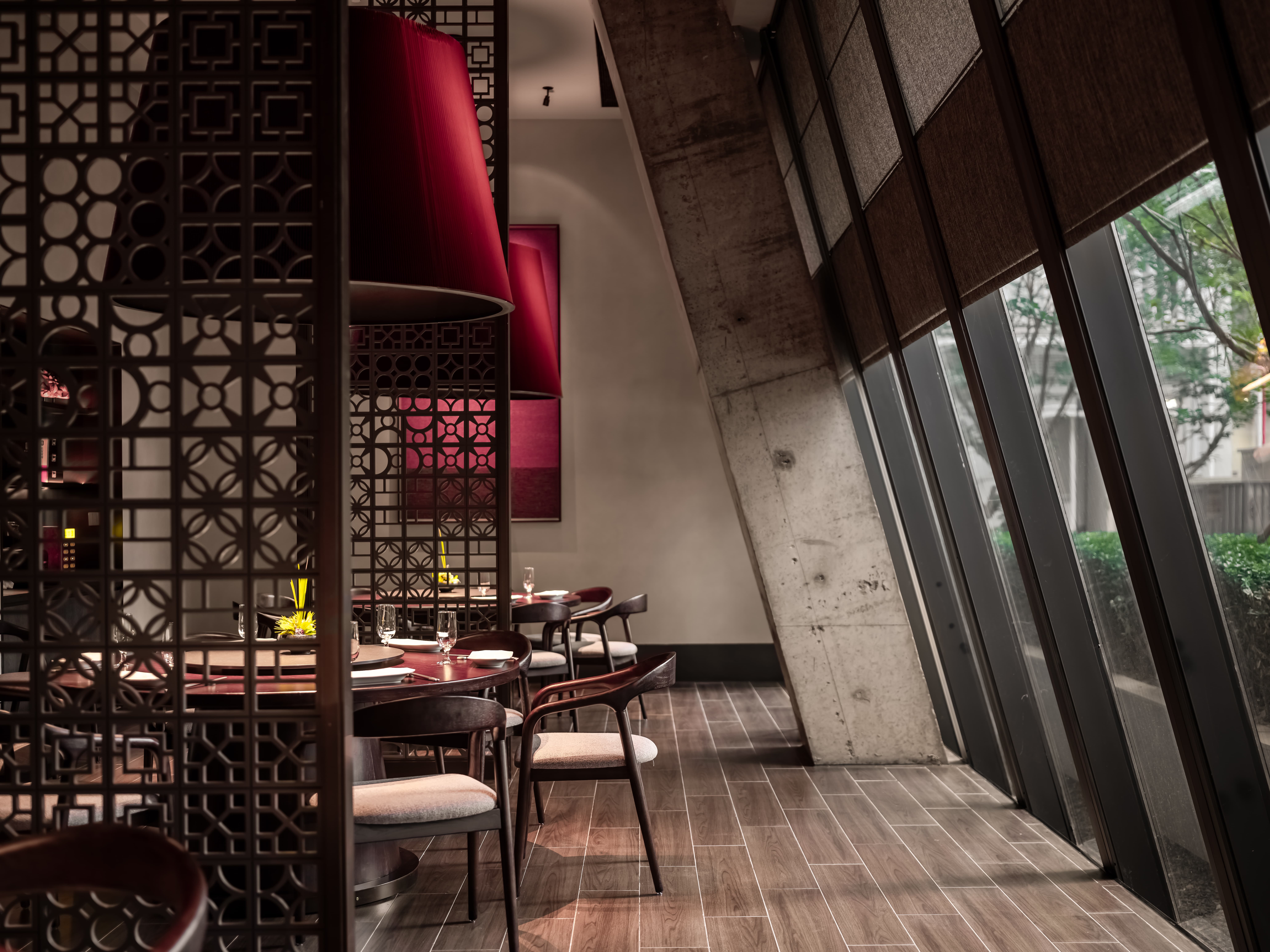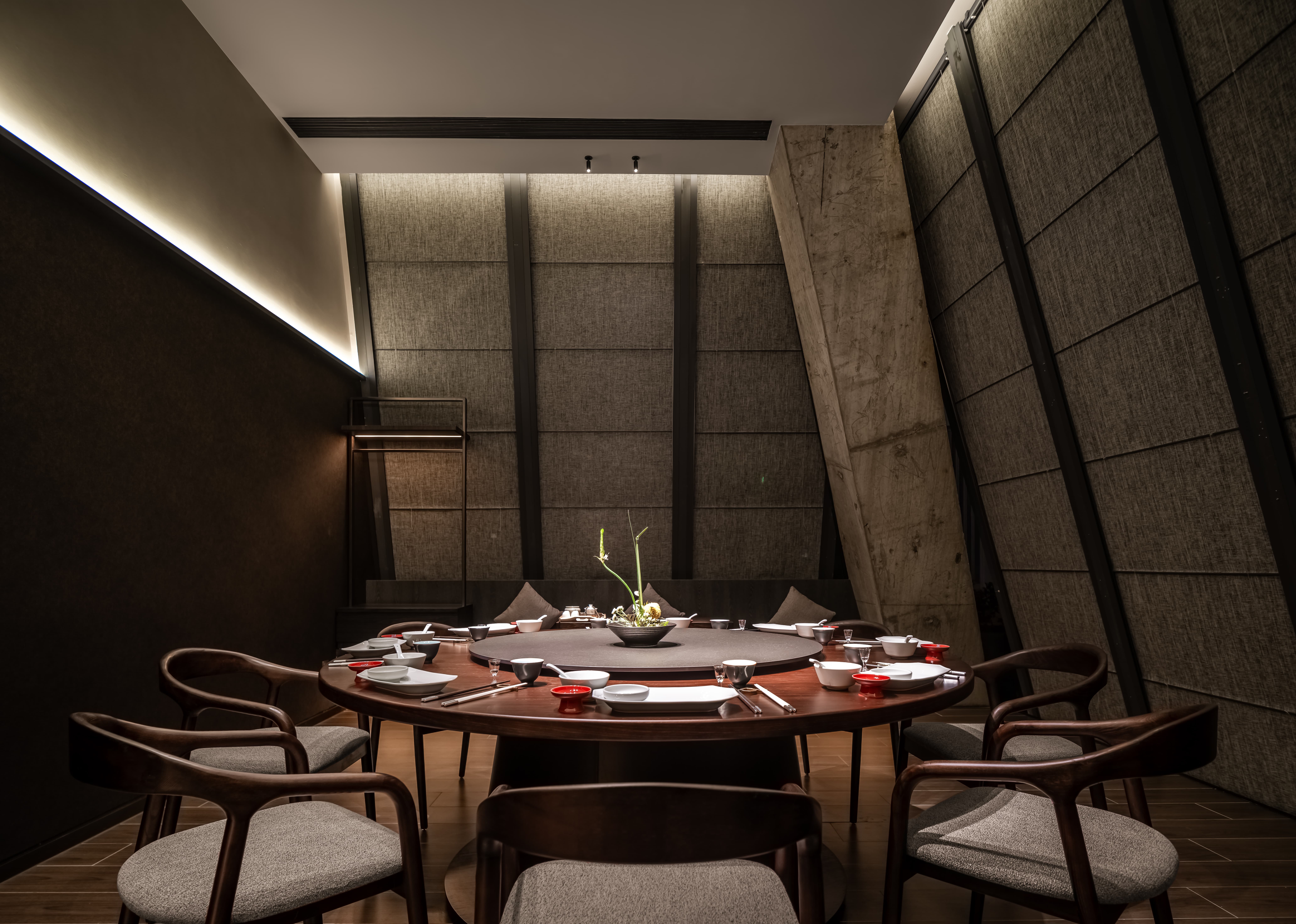 散座区,一边面向街面的小铺子,一边是办公绿化,外是人间烟火,内是高级中餐,裸露的水泥材质和室外的水泥台子在同一视觉空间,融合烟火,晓长安不再是“孤独的”,是长在这里,隐在这里的,内外的互动,周边的交互,空间中各样不同的生态关系在流转。 -