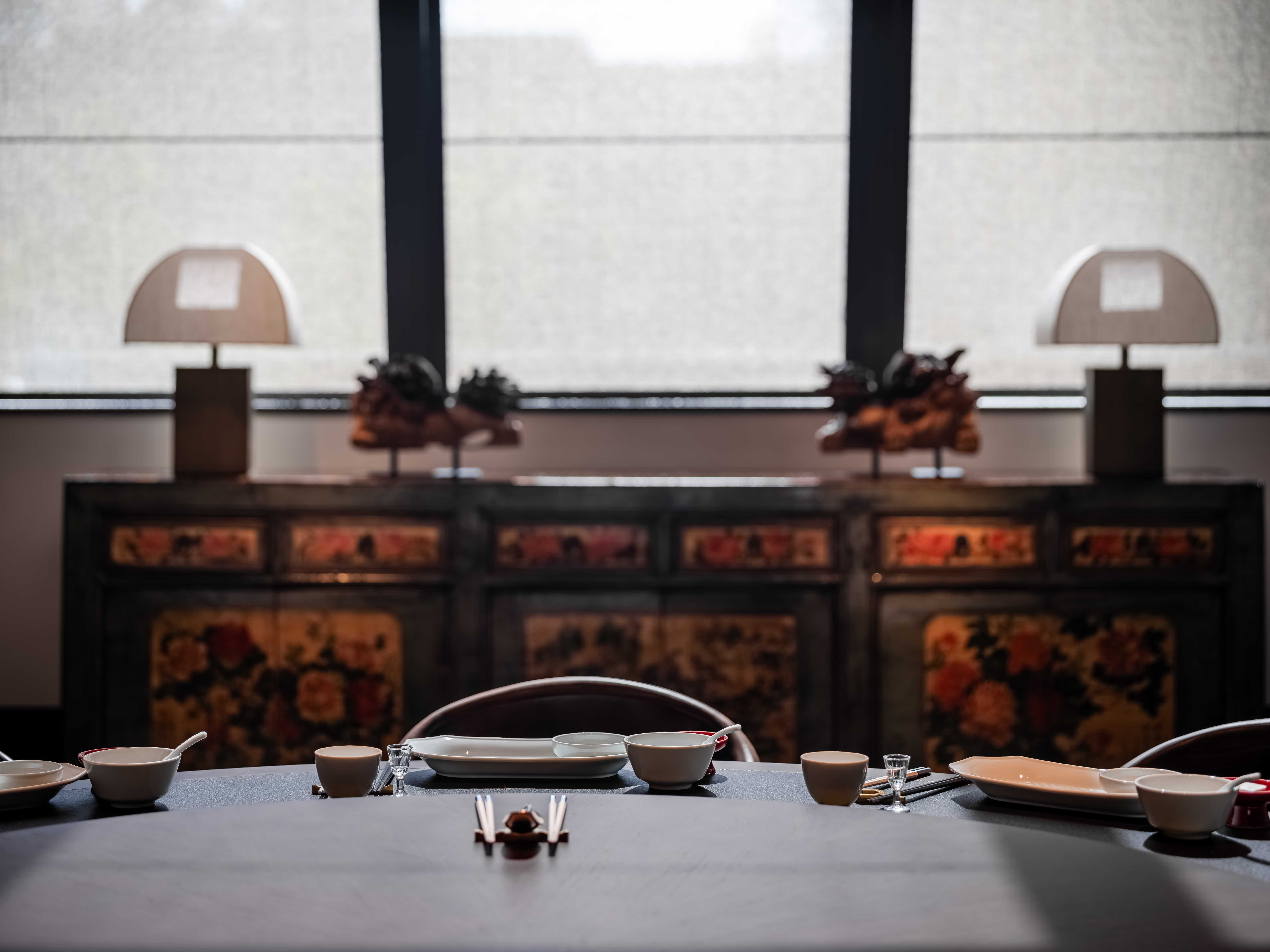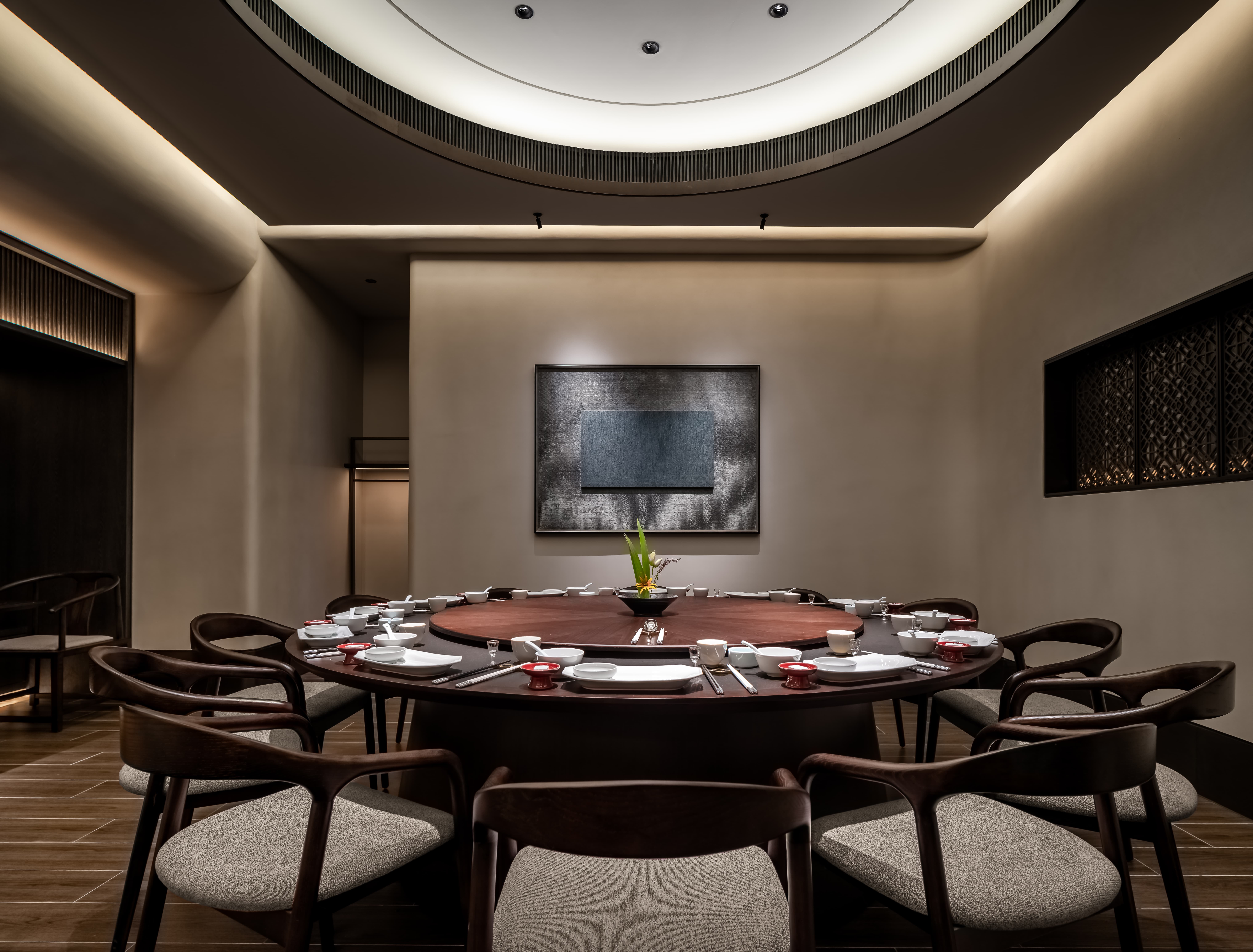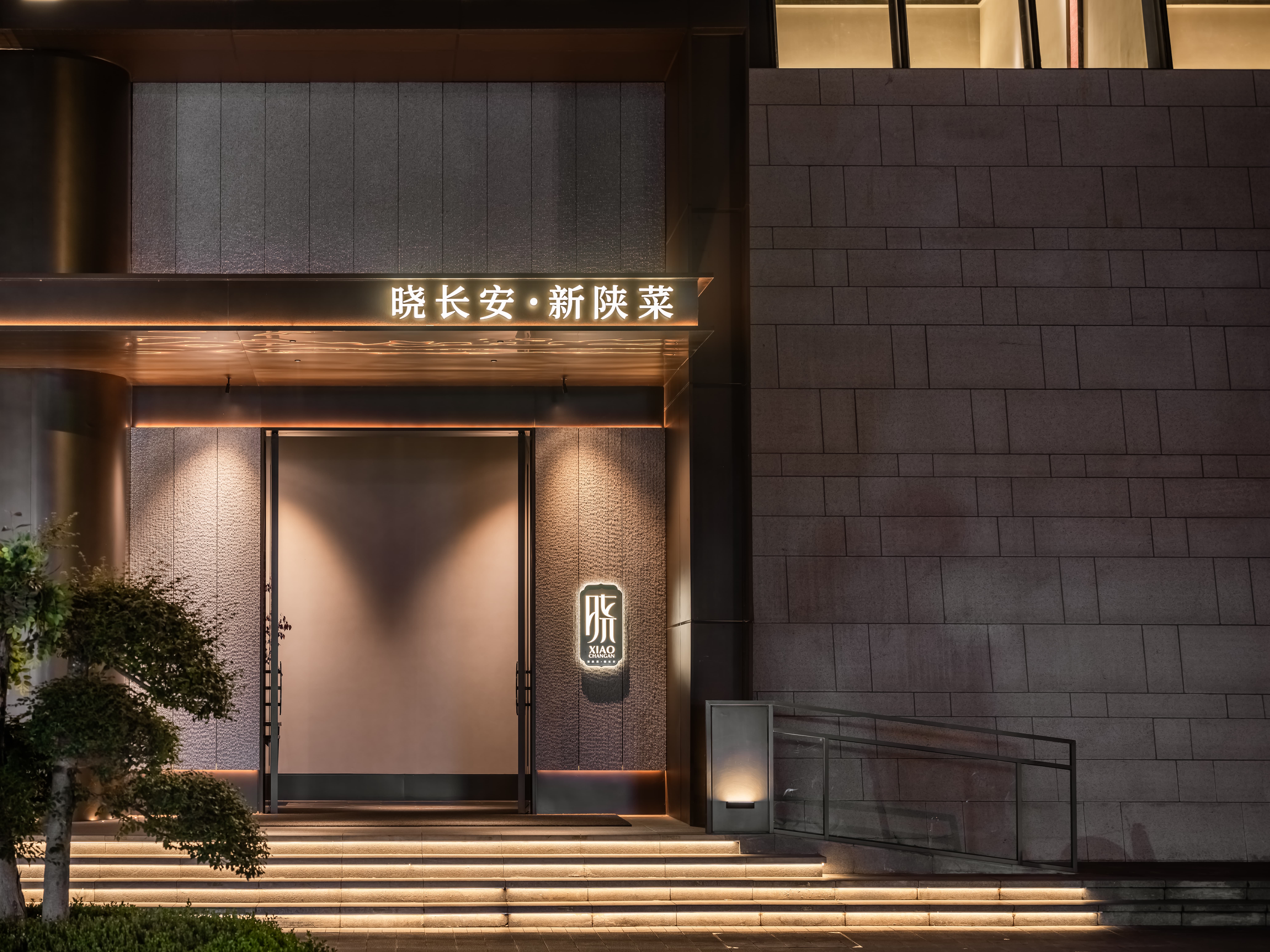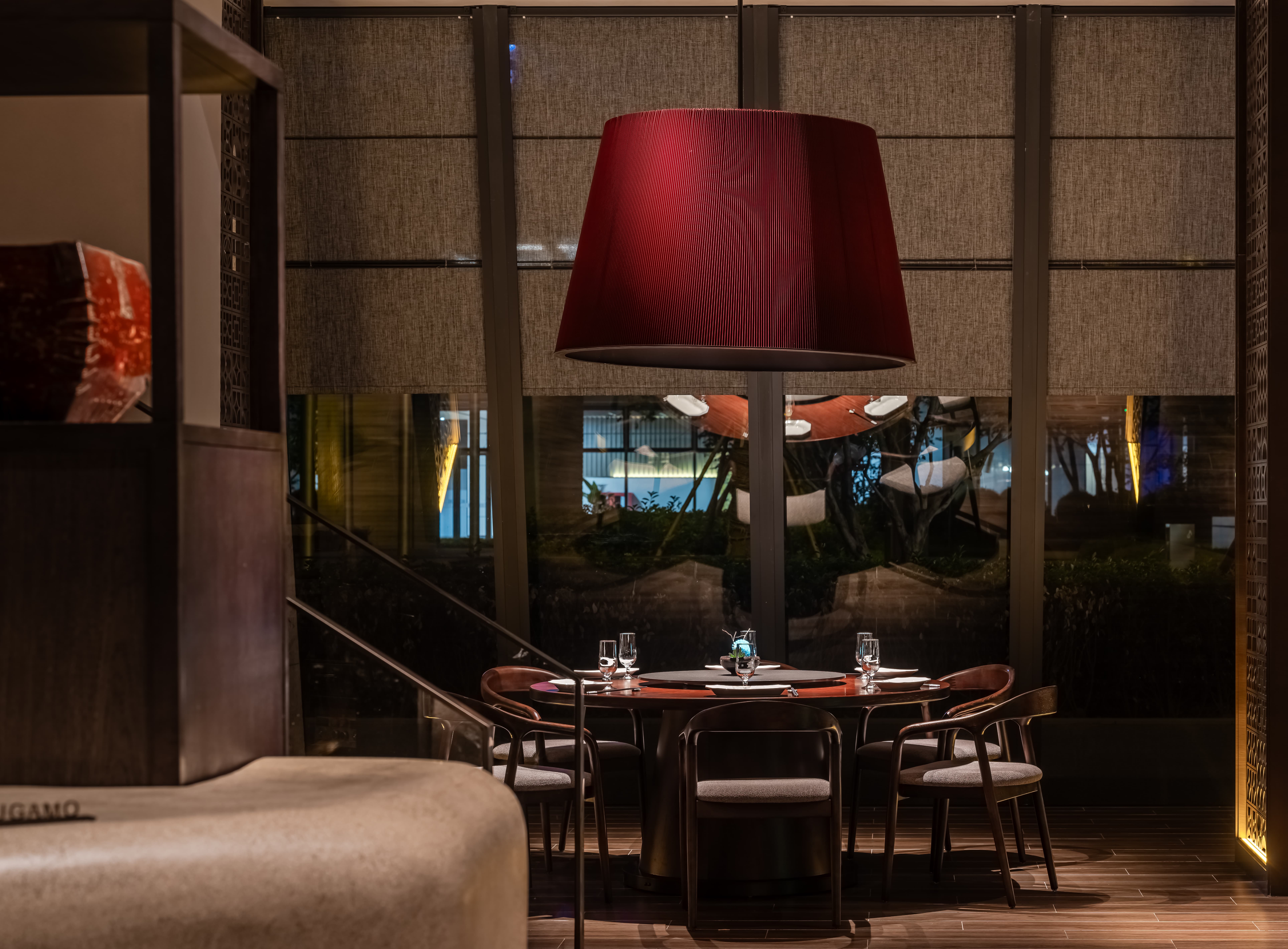 散座区,一边面向街面的小铺子,一边是办公绿化,外是人间烟火,内是高级中餐,裸露的水泥材质和室外的水泥台子在同一视觉空间,融合烟火,晓长安不再是“孤独的”,是长在这里,隐在这里的,内外的互动,周边的交互,空间中各样不同的生态关系在流转。 -