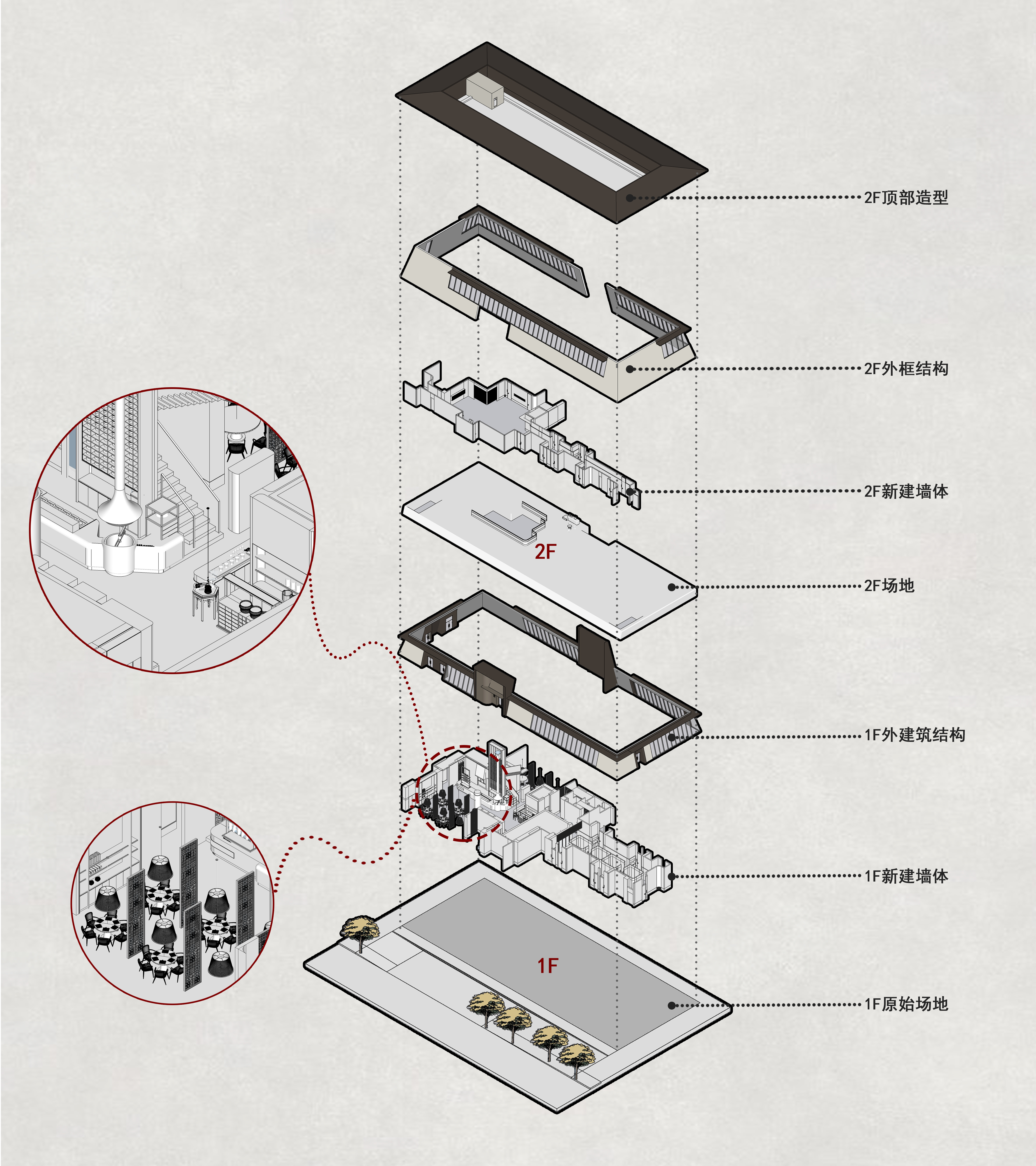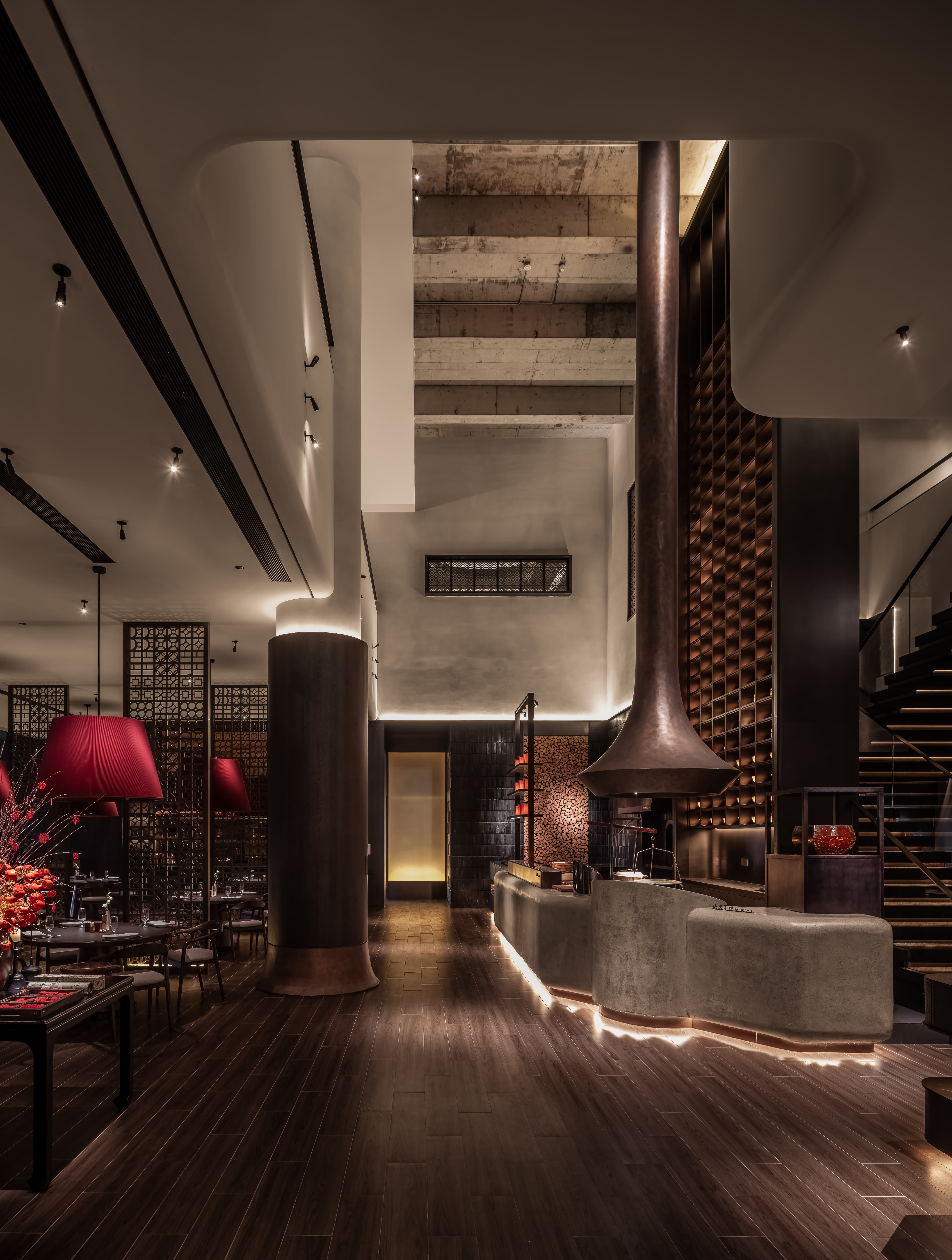 拆除量很大,拆完原始空间只是柱子了,挑空加建,调整入口方向,大入口缩小内退做风雨檐,压低门厅,设计从外至内层次拔高,有意压低放高再放高,让每一个进入的食客情绪直接被牵引,感叹内有乾坤。 -