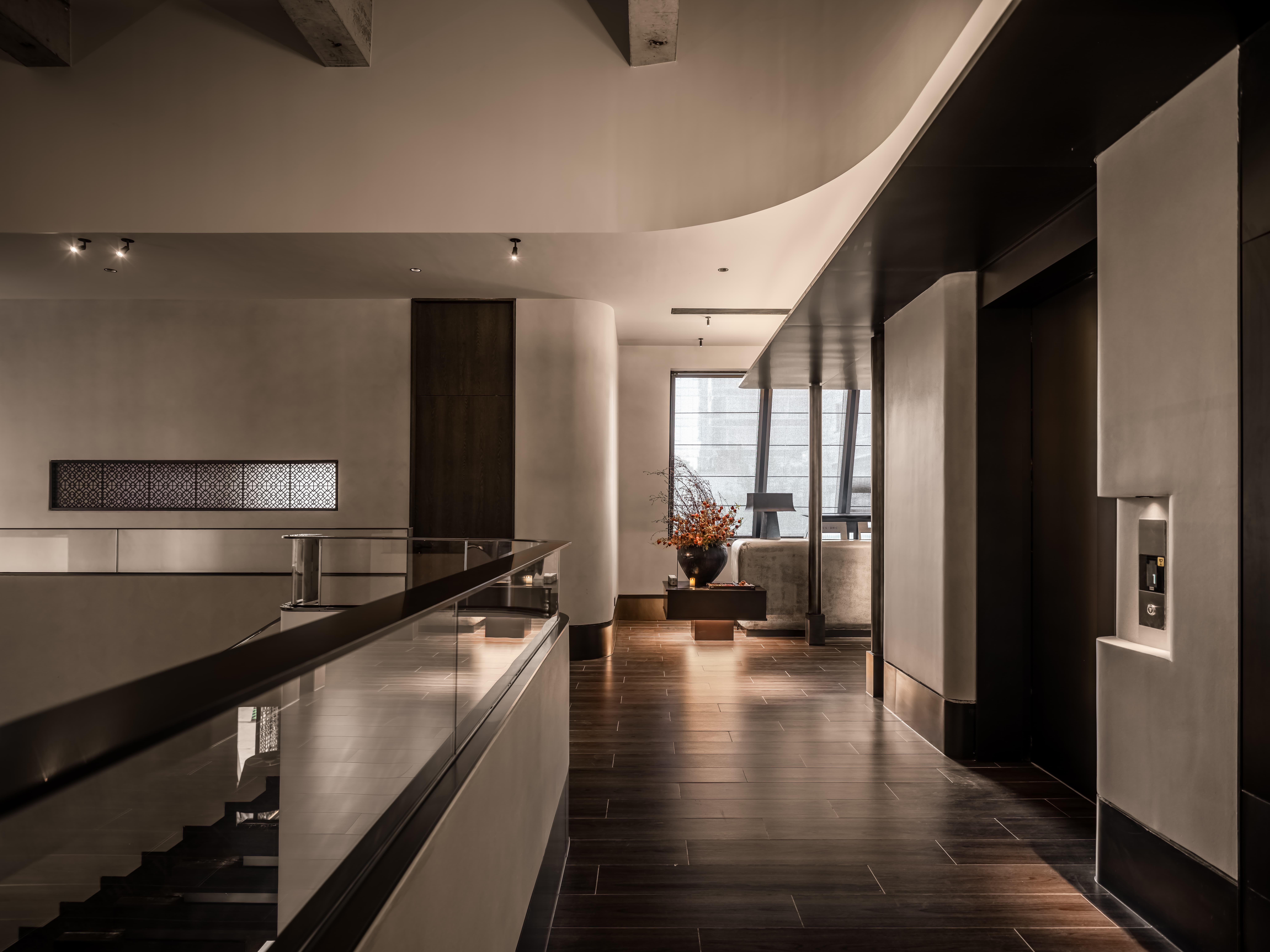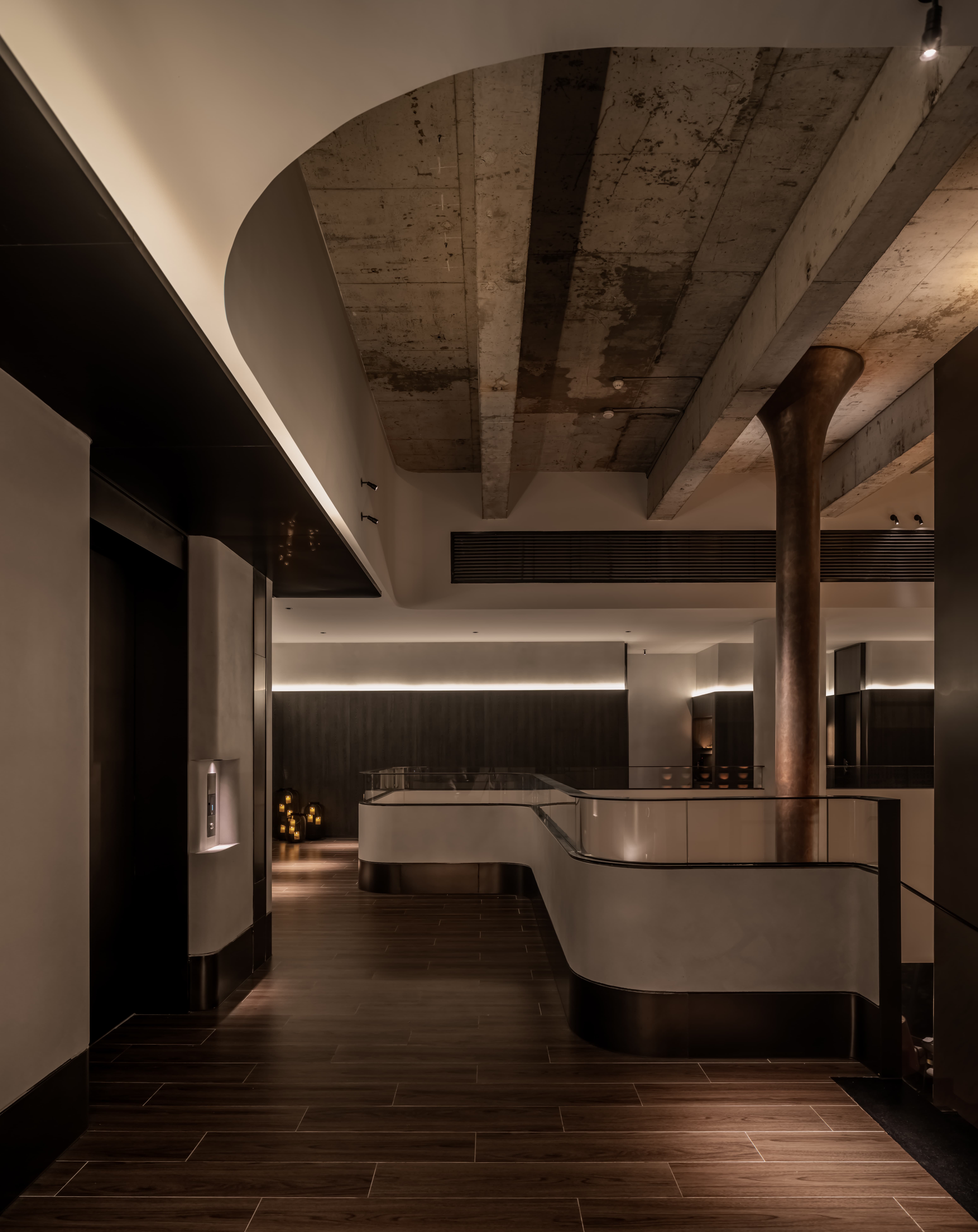 用户体验:虽然说设计是改变空间,结合空间内容做空间画像,但也是设计师的一种表达方式,将品牌和设计师的想法和情感传递给进入空间的人,挑空裸顶,收获了意外的文艺感,虚实结合的栏杆,符合安全高度,不完全通透,对夏天穿裙子的女士很友好,圆润的流线是节奏和舒适感。
