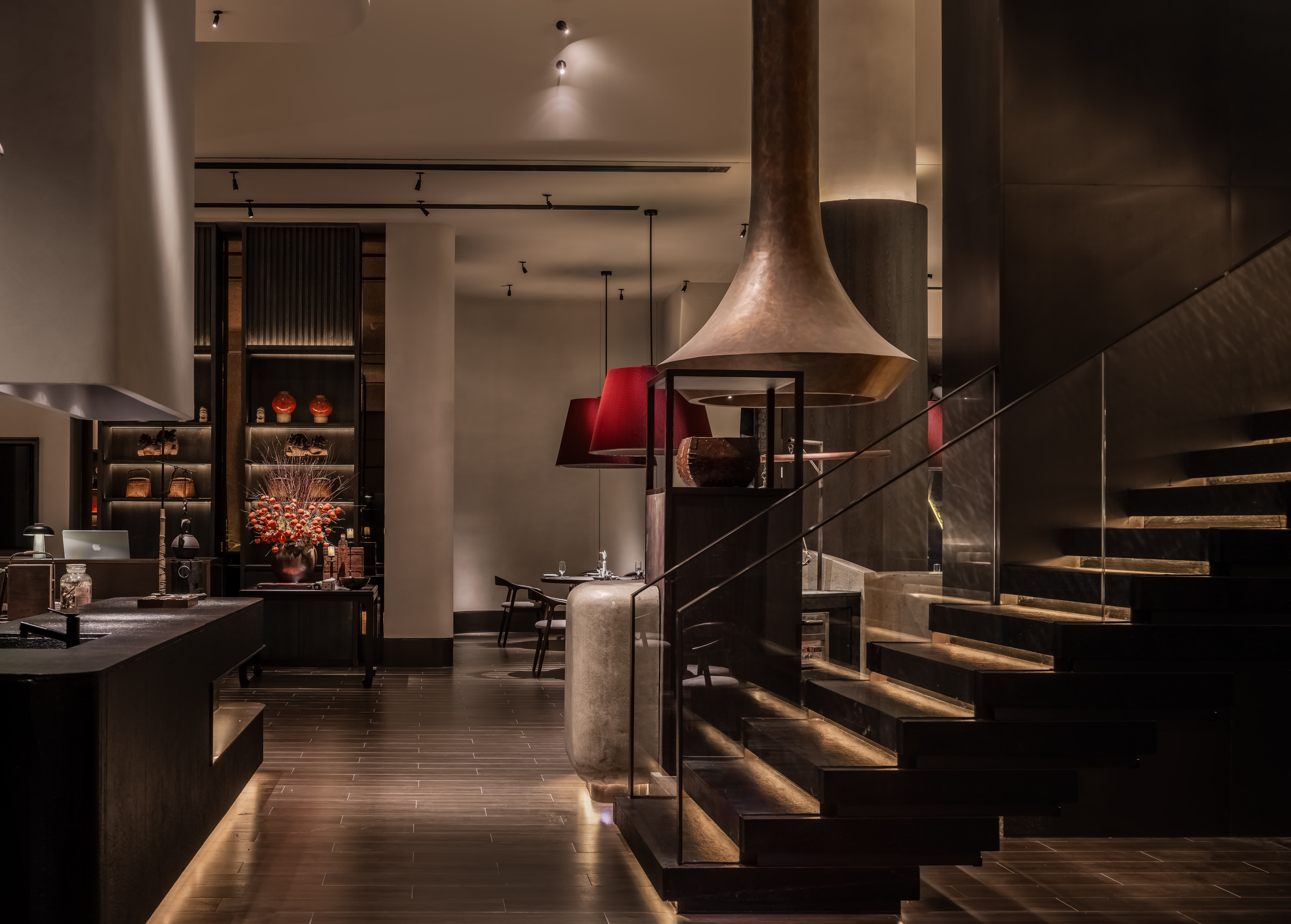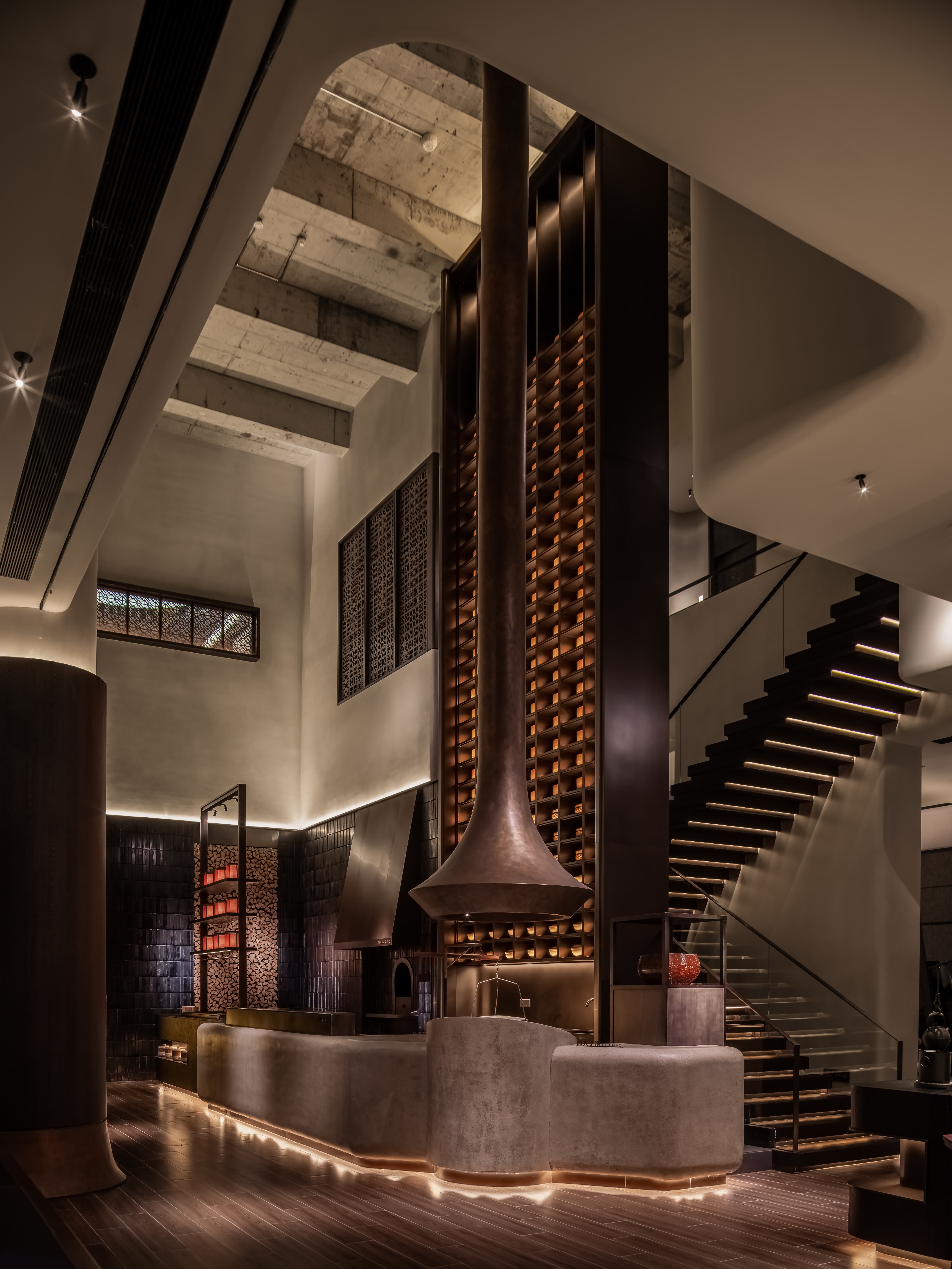 空间意境:进入后视线第一眼是一半的小挑空,转进去豁然开朗,震撼感袭来,简单的装修材料,空间“气质”大气,希望将空间的惊喜层层释放,明档是内在场域的“橱窗”,让顾客自然流连;