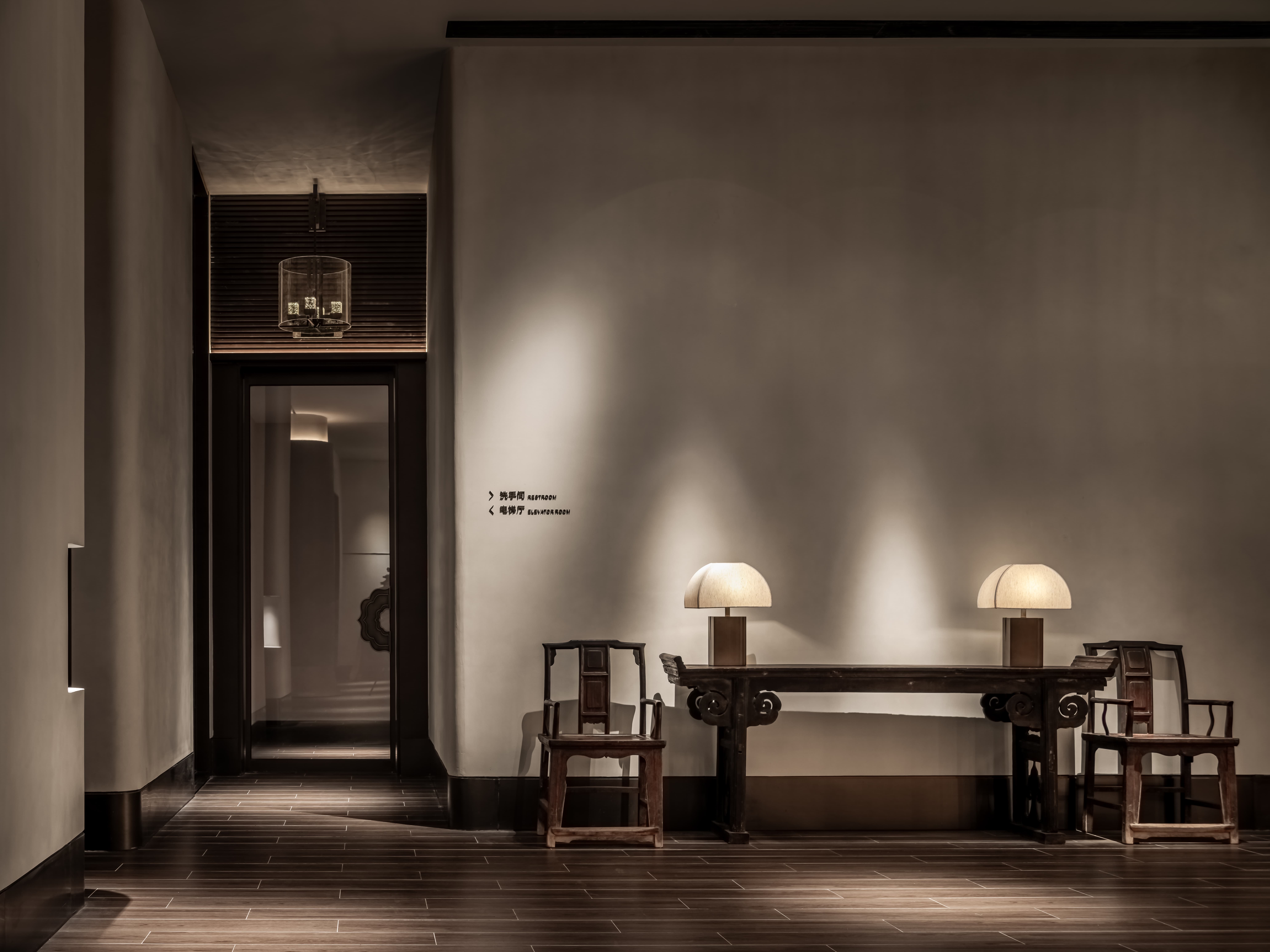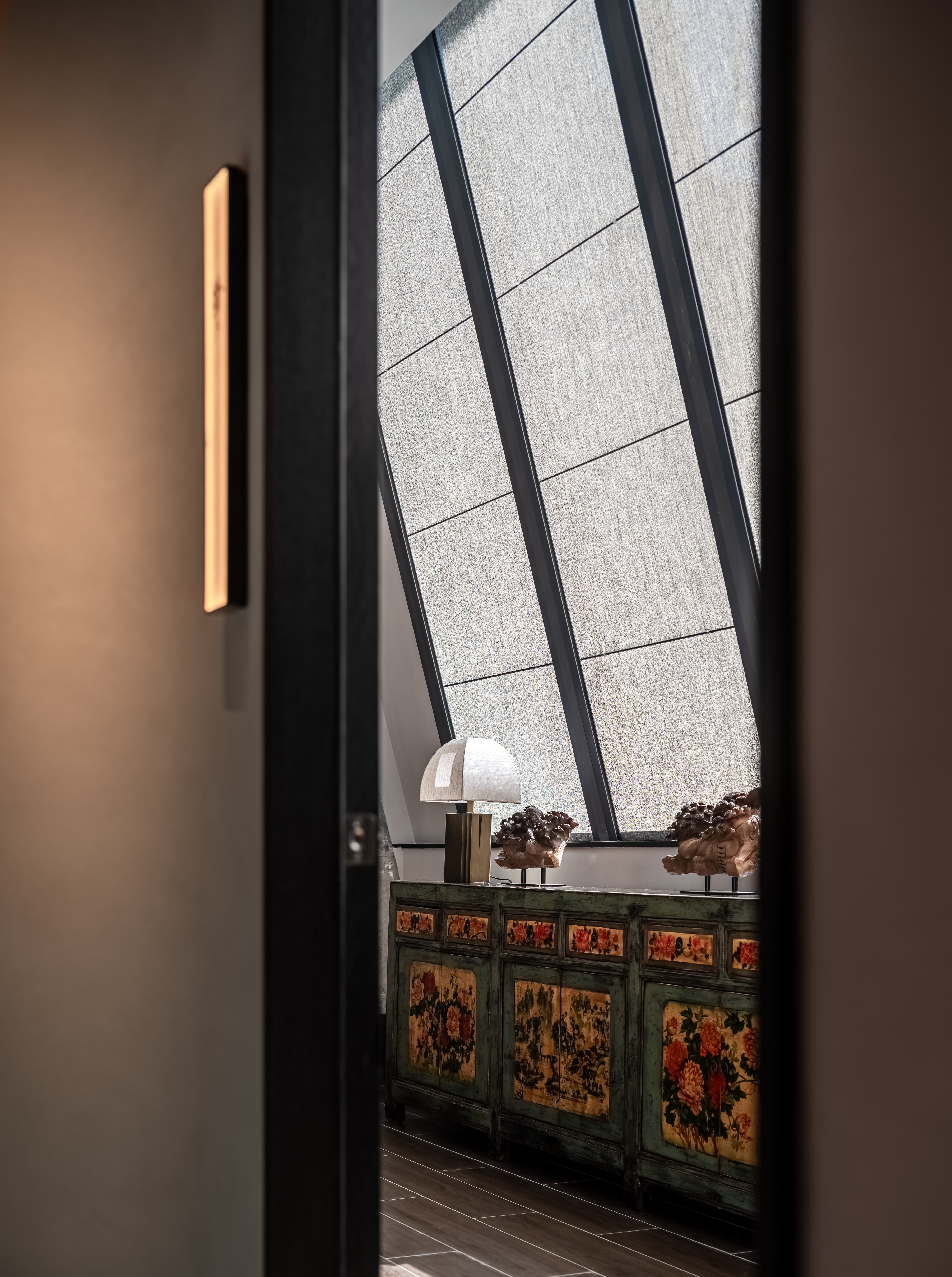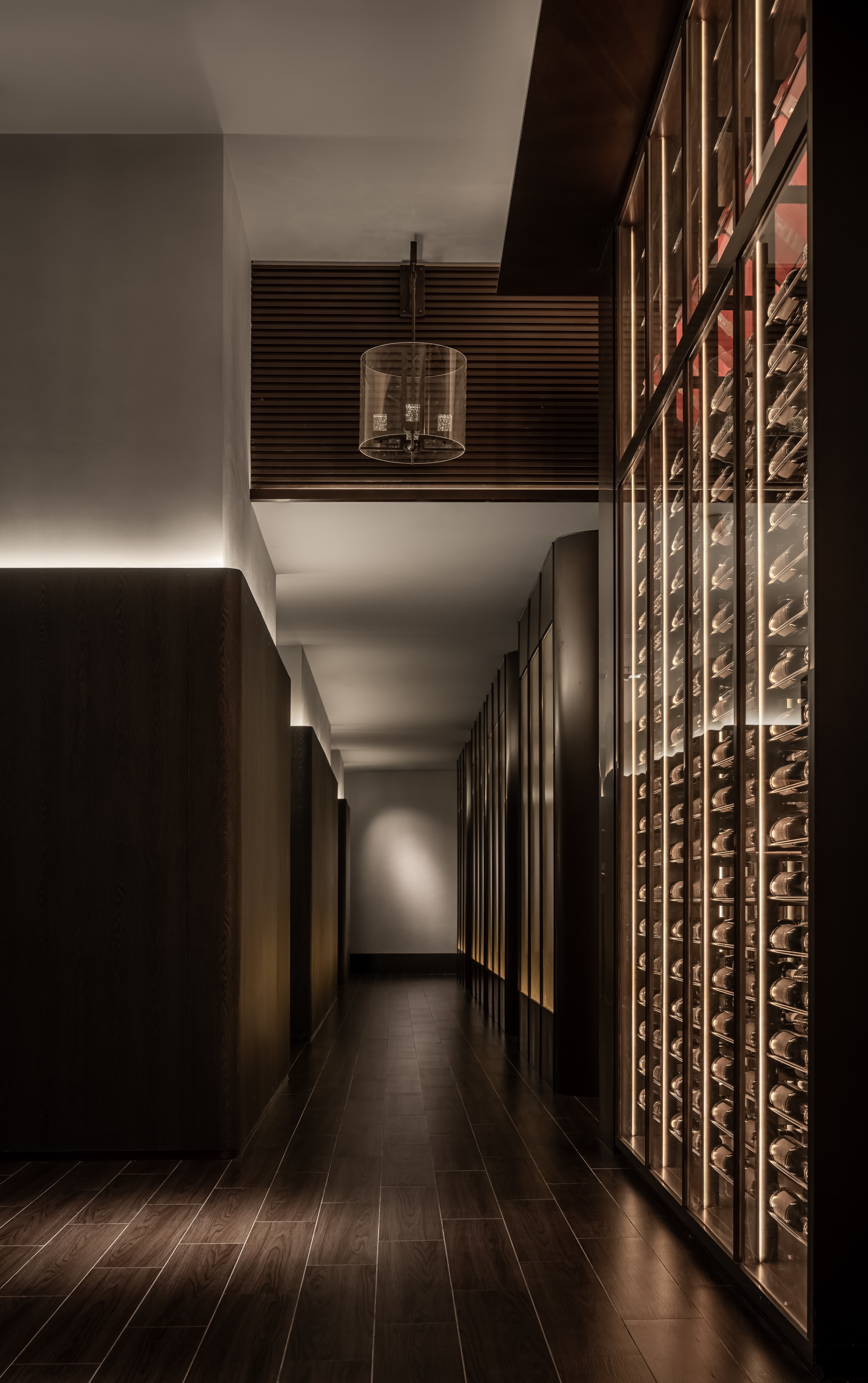 平行排比,将物理环境通过设计转变成为感官体验,入户的酒柜是端景,是展示,亦是致敬设计大师季裕堂;