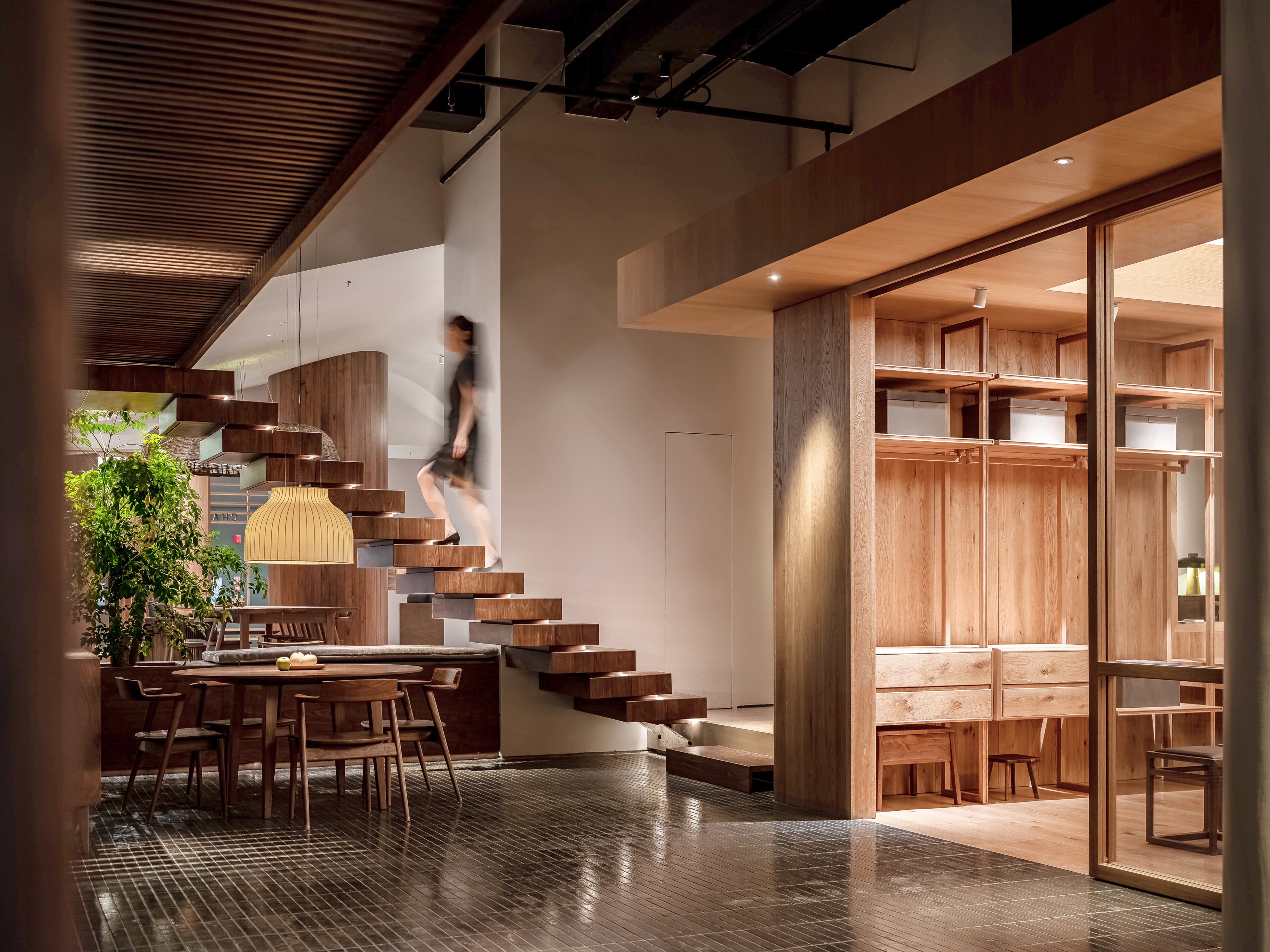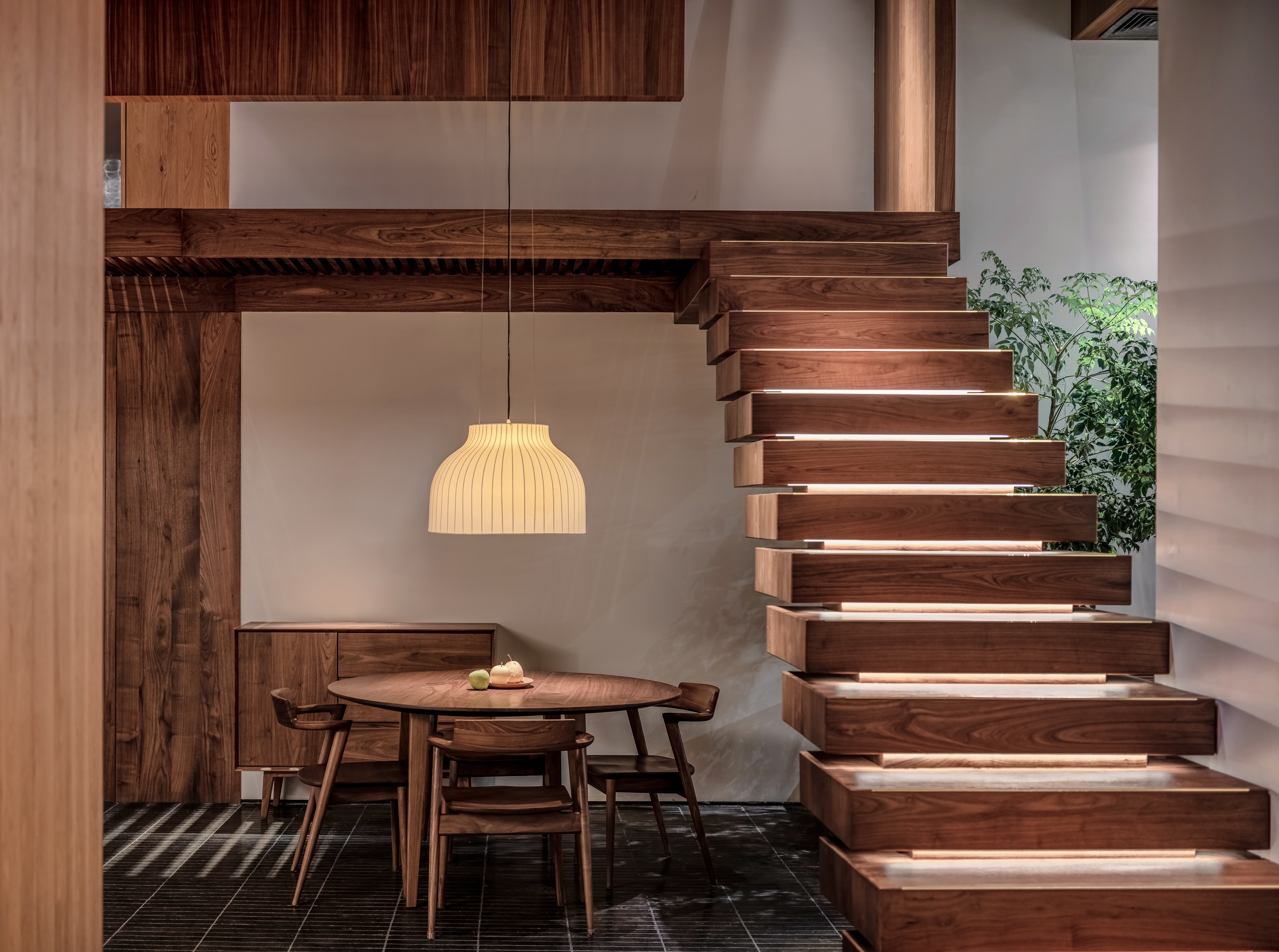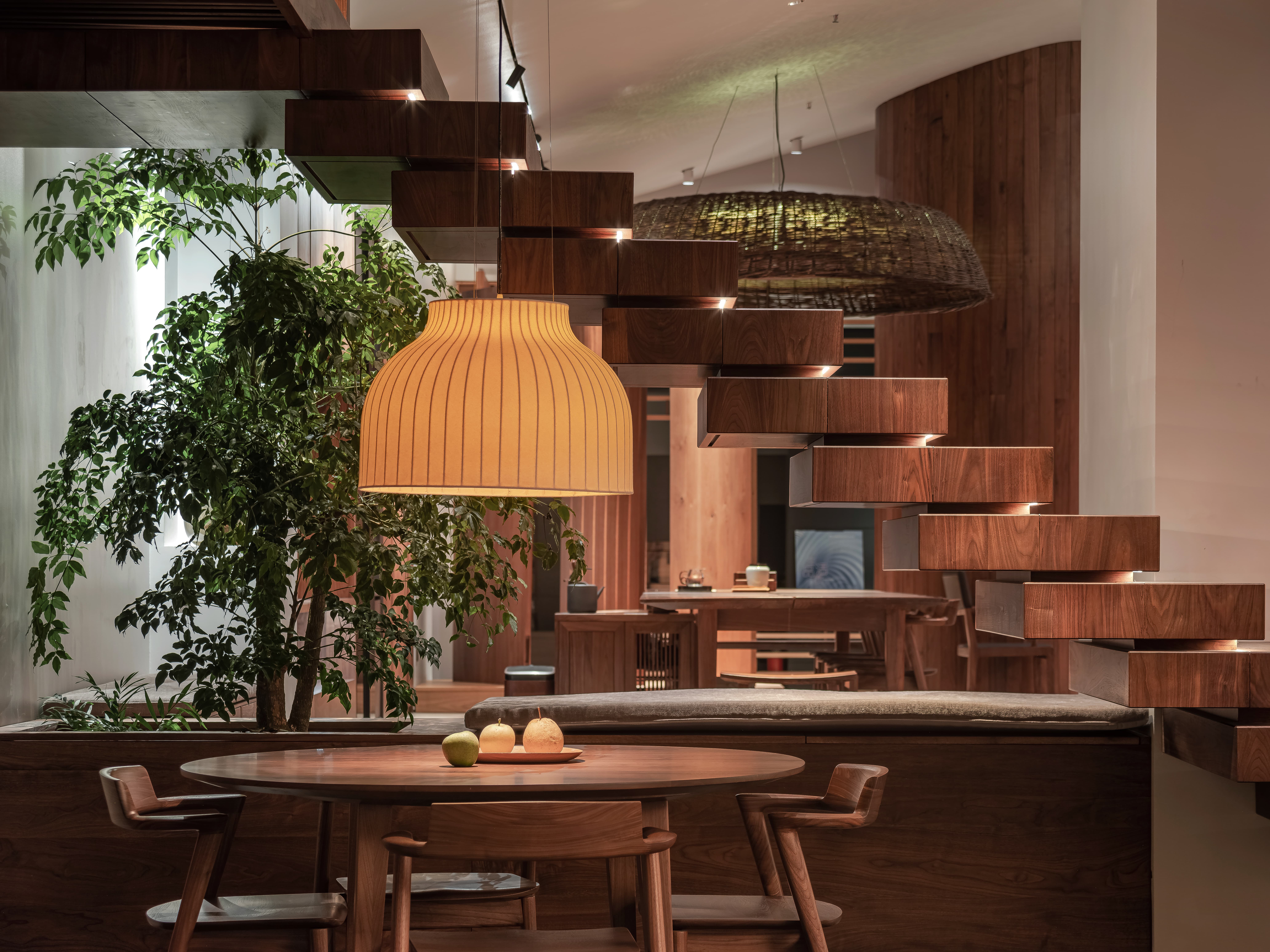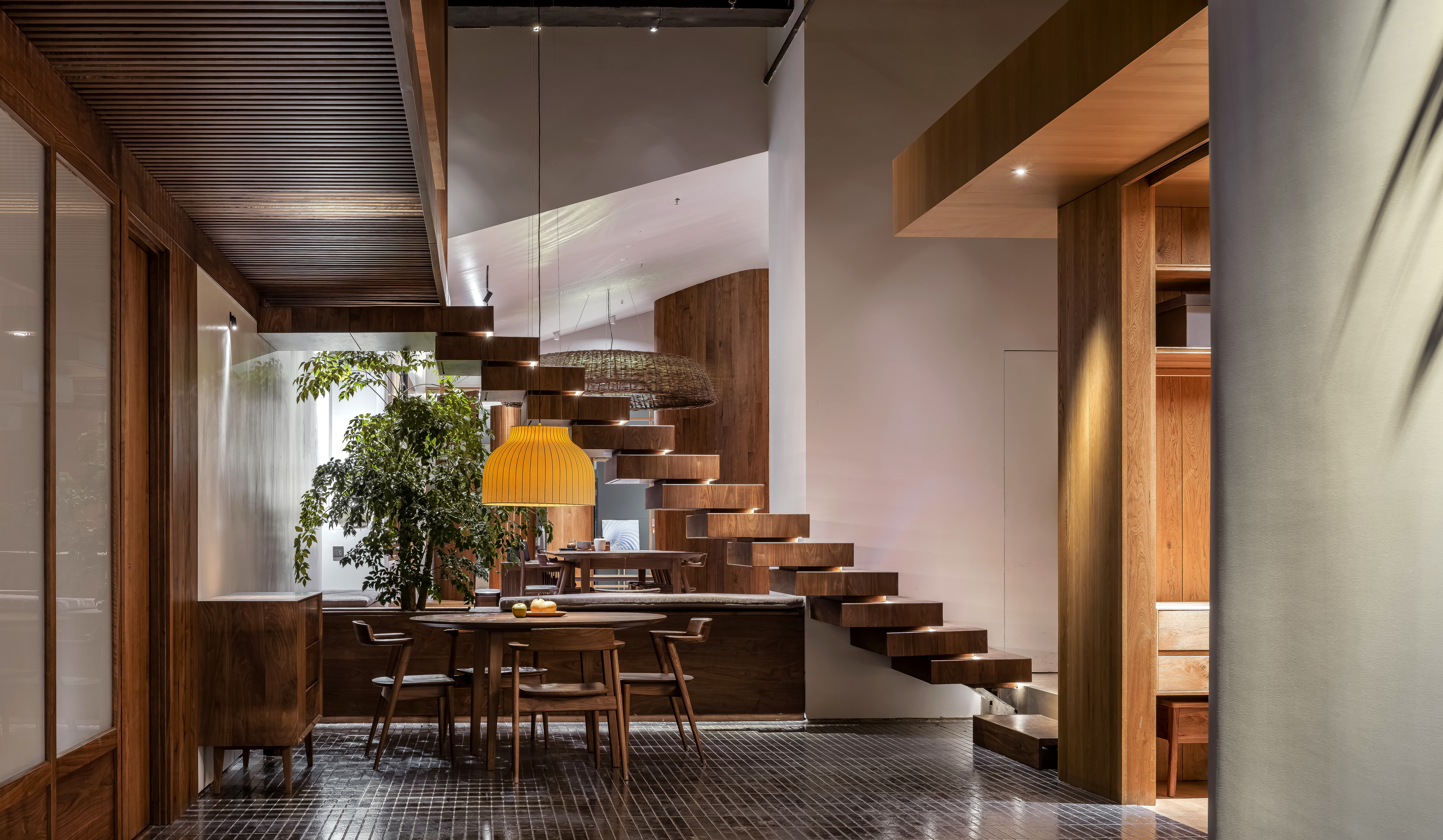 空间意境:线透过头顶的格栅洒落在街道上,营造出温暖的氛围。在远处的圆形餐桌上,一盏吊灯静静地照亮桌面,仿佛家人归家时为你留的那盏灯。