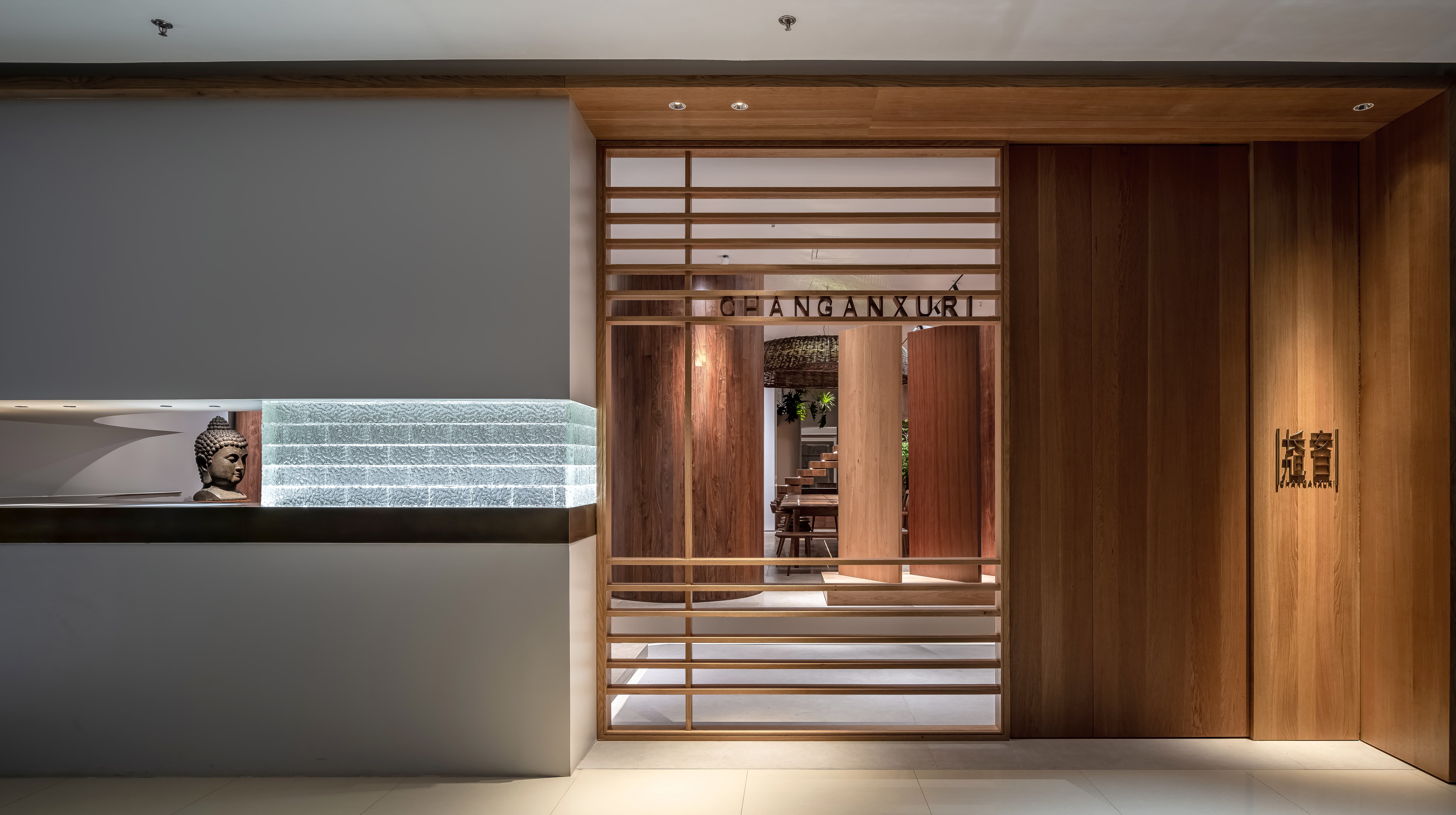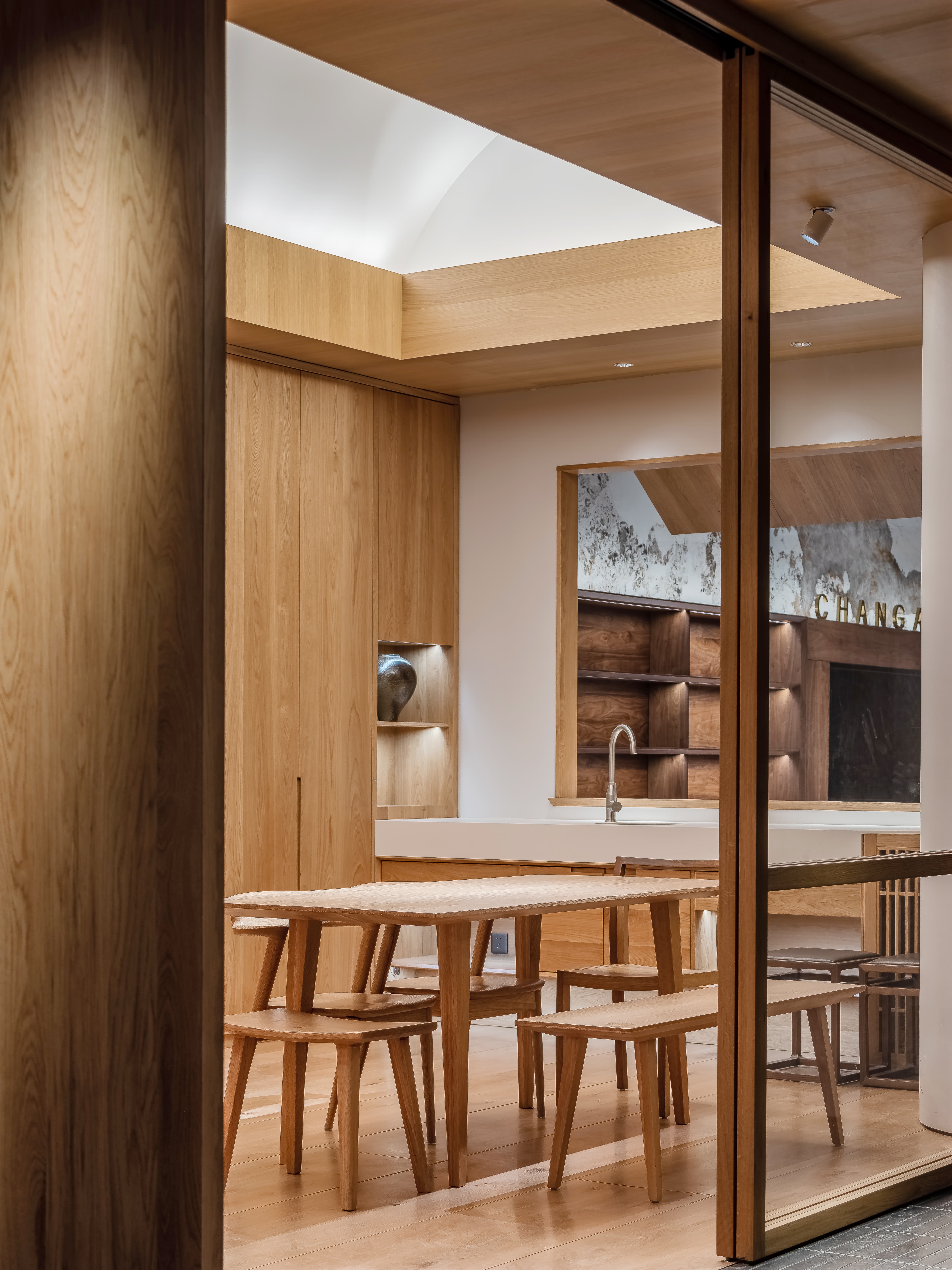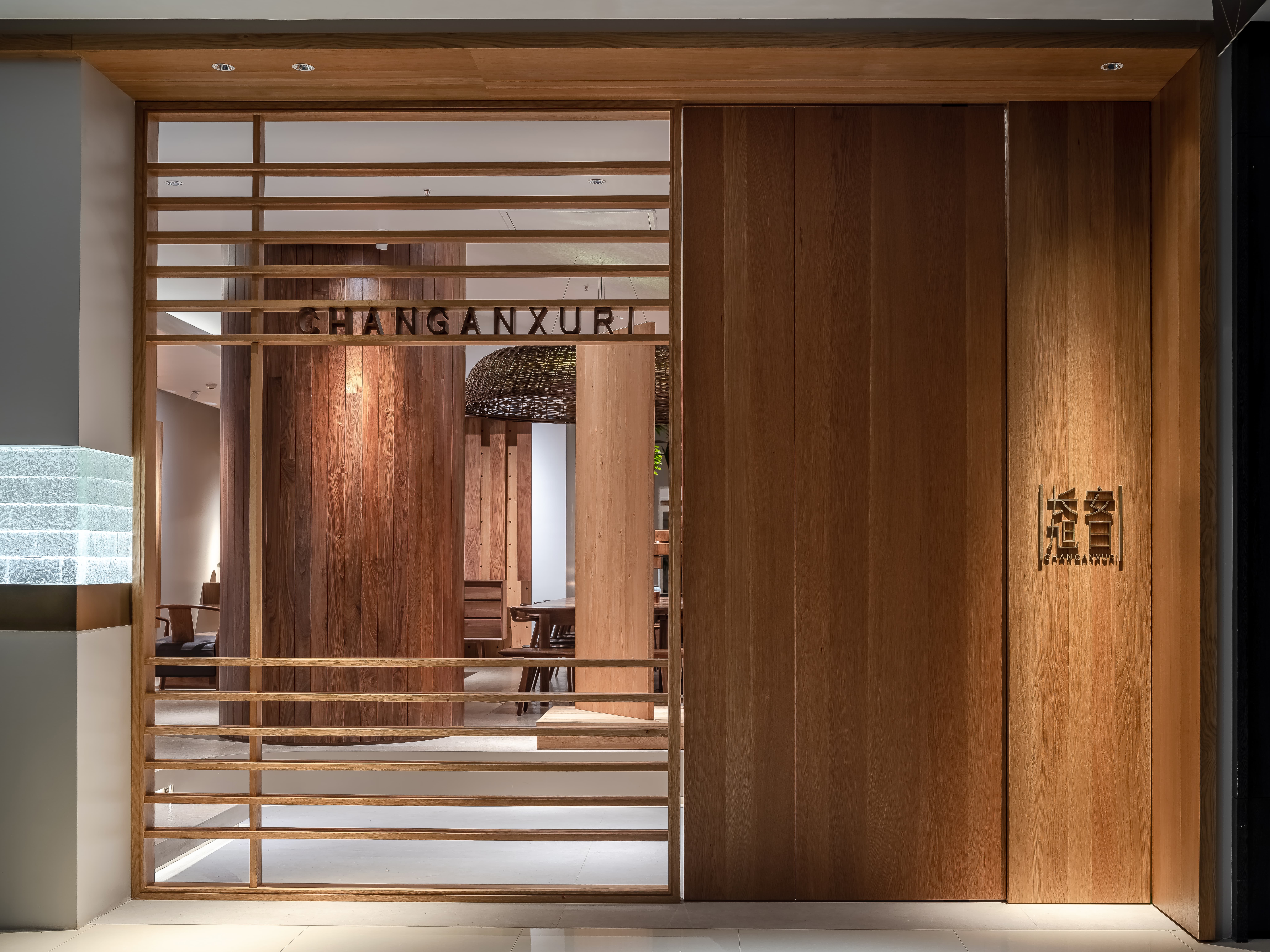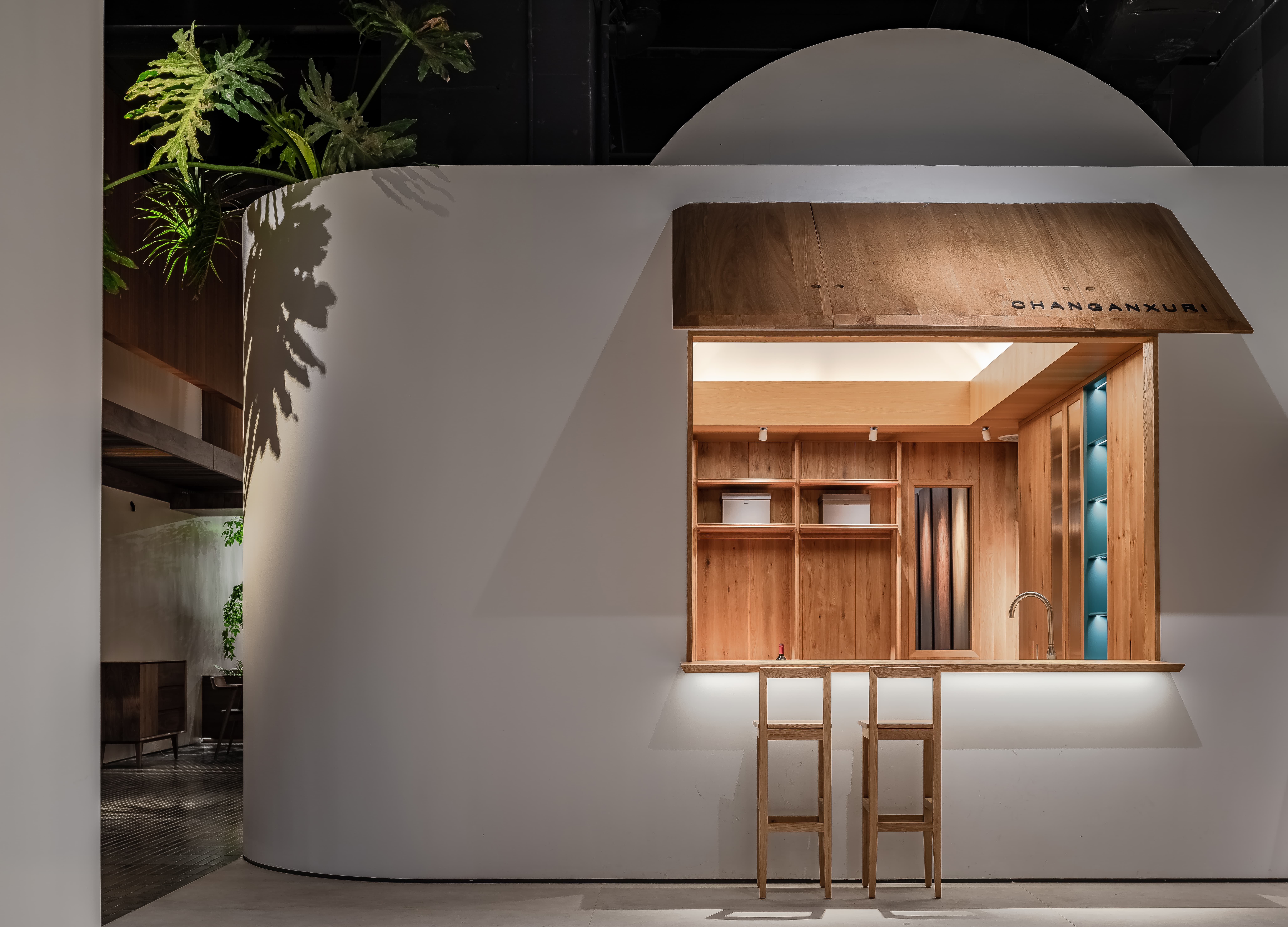 空间意境:线透过头顶的格栅洒落在街道上,营造出温暖的氛围。在远处的圆形餐桌上,一盏吊灯静静地照亮桌面,仿佛家人归家时为你留的那盏灯。