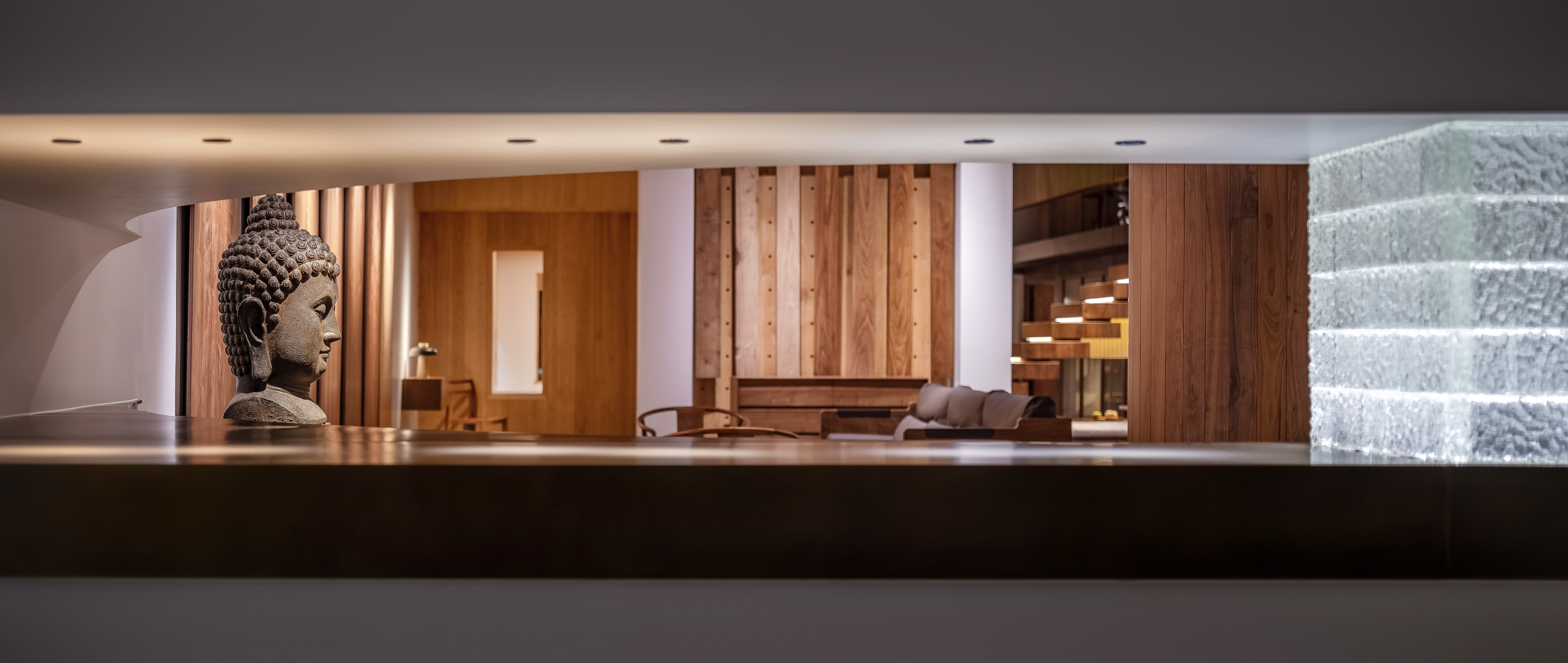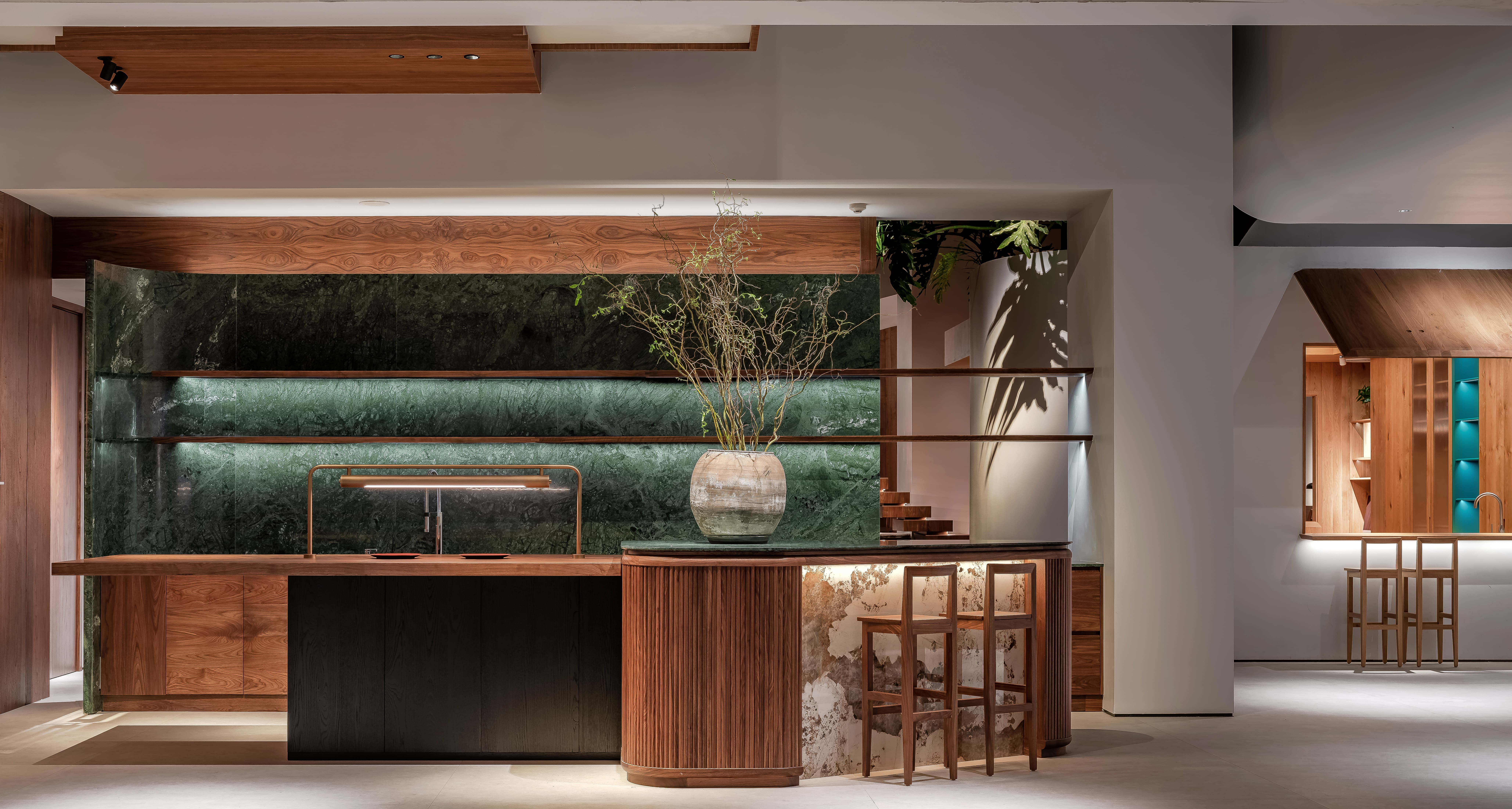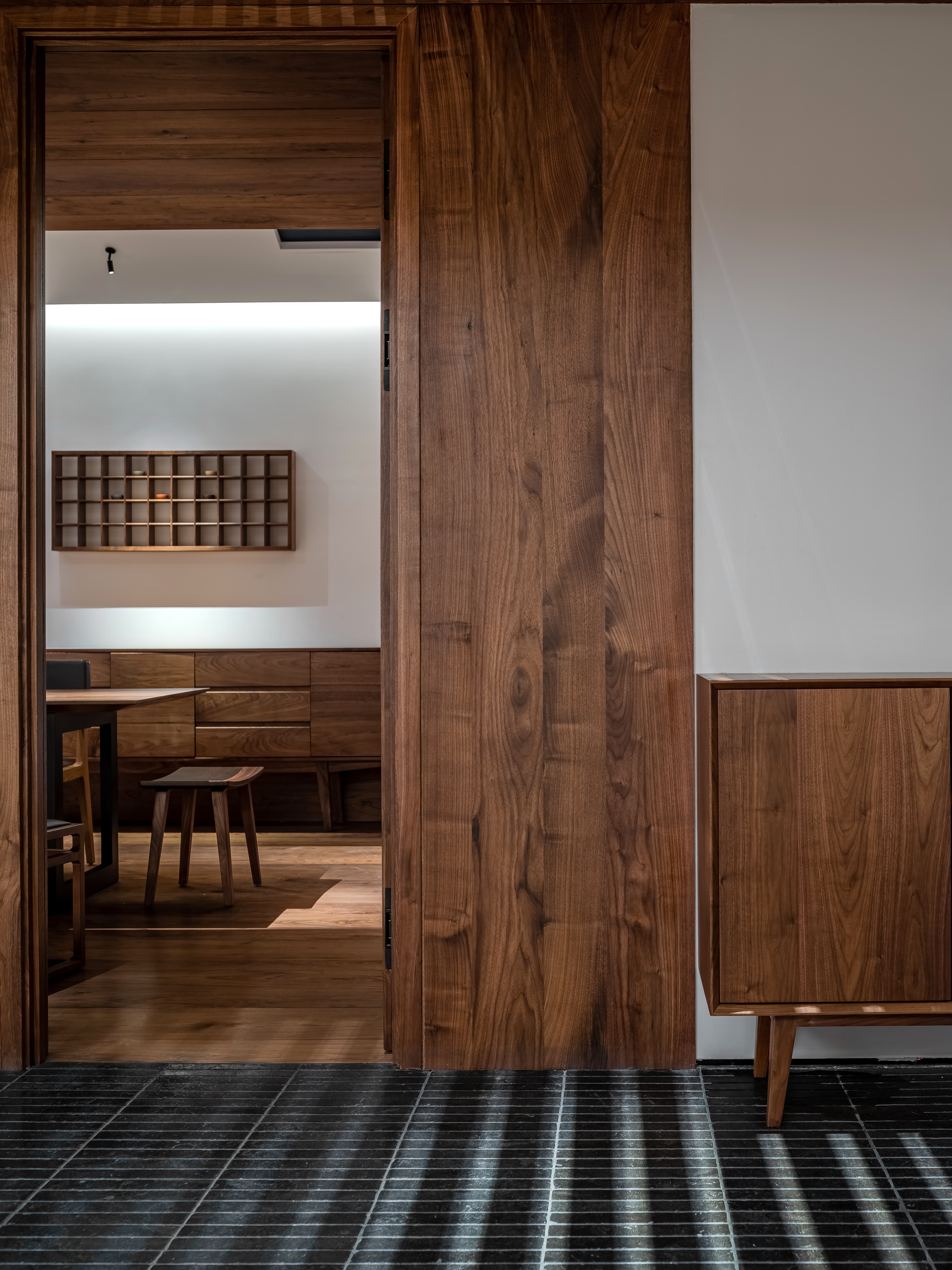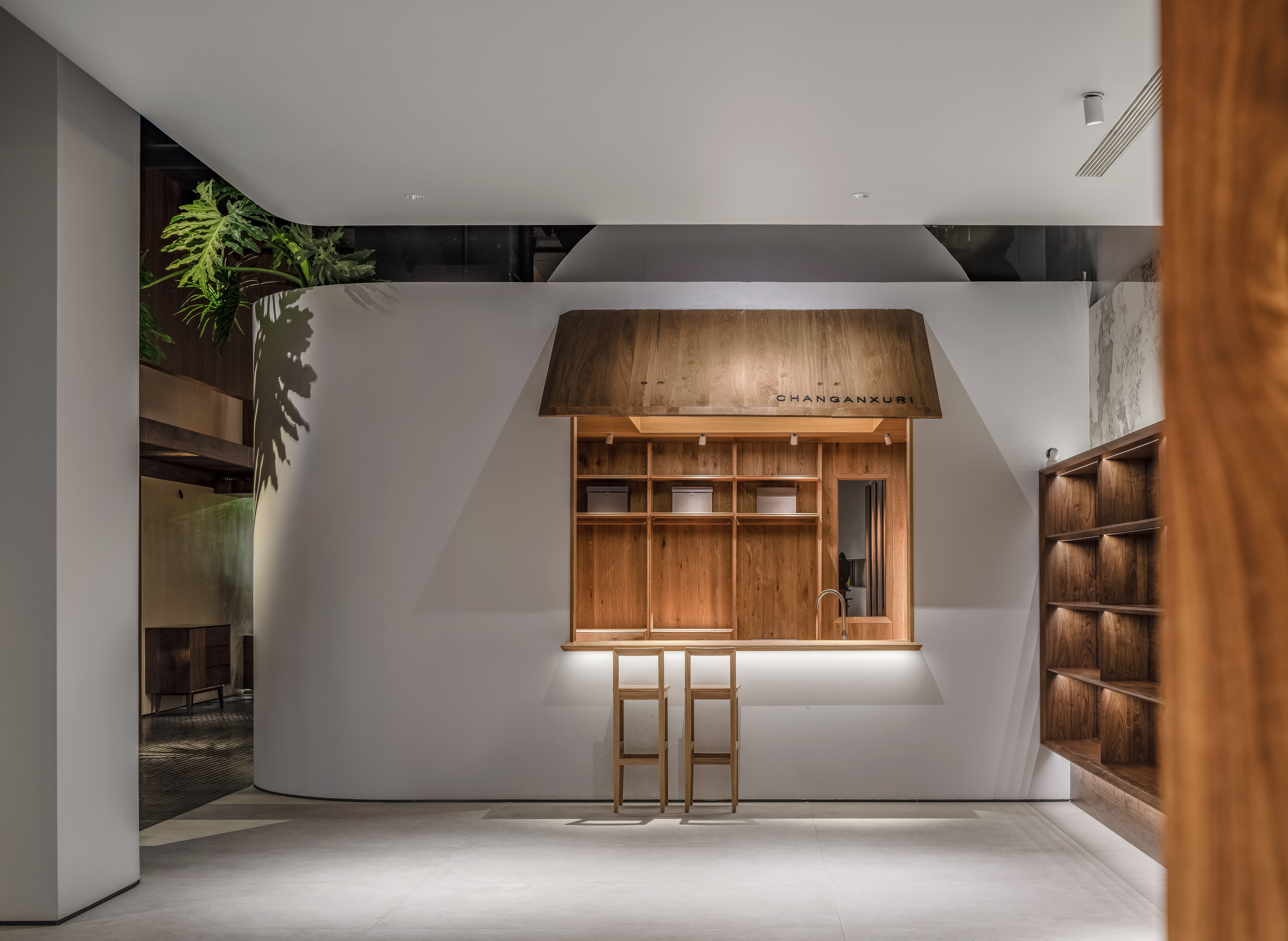 空间意境:线透过头顶的格栅洒落在街道上,营造出温暖的氛围。在远处的圆形餐桌上,一盏吊灯静静地照亮桌面,仿佛家人归家时为你留的那盏灯。