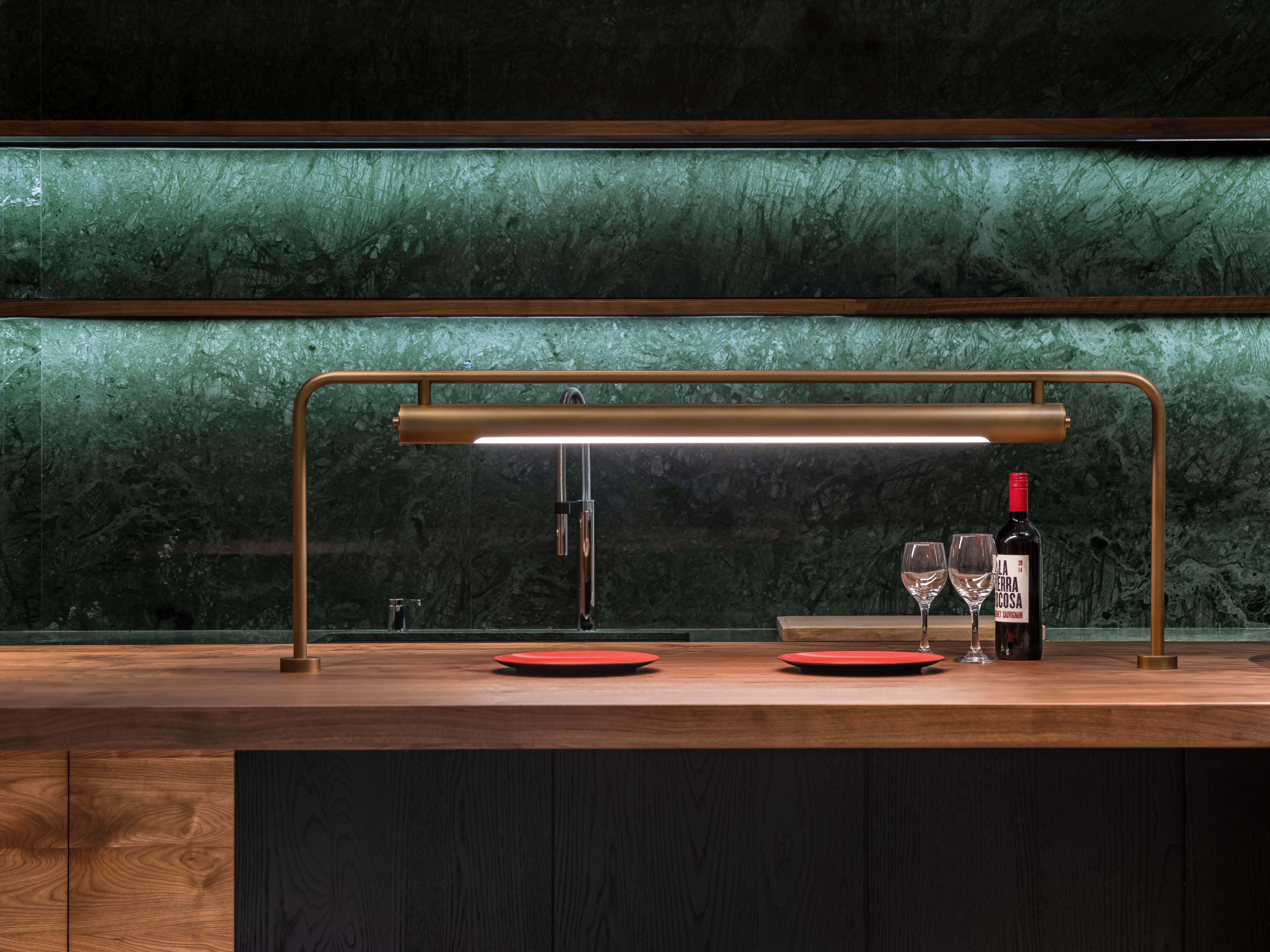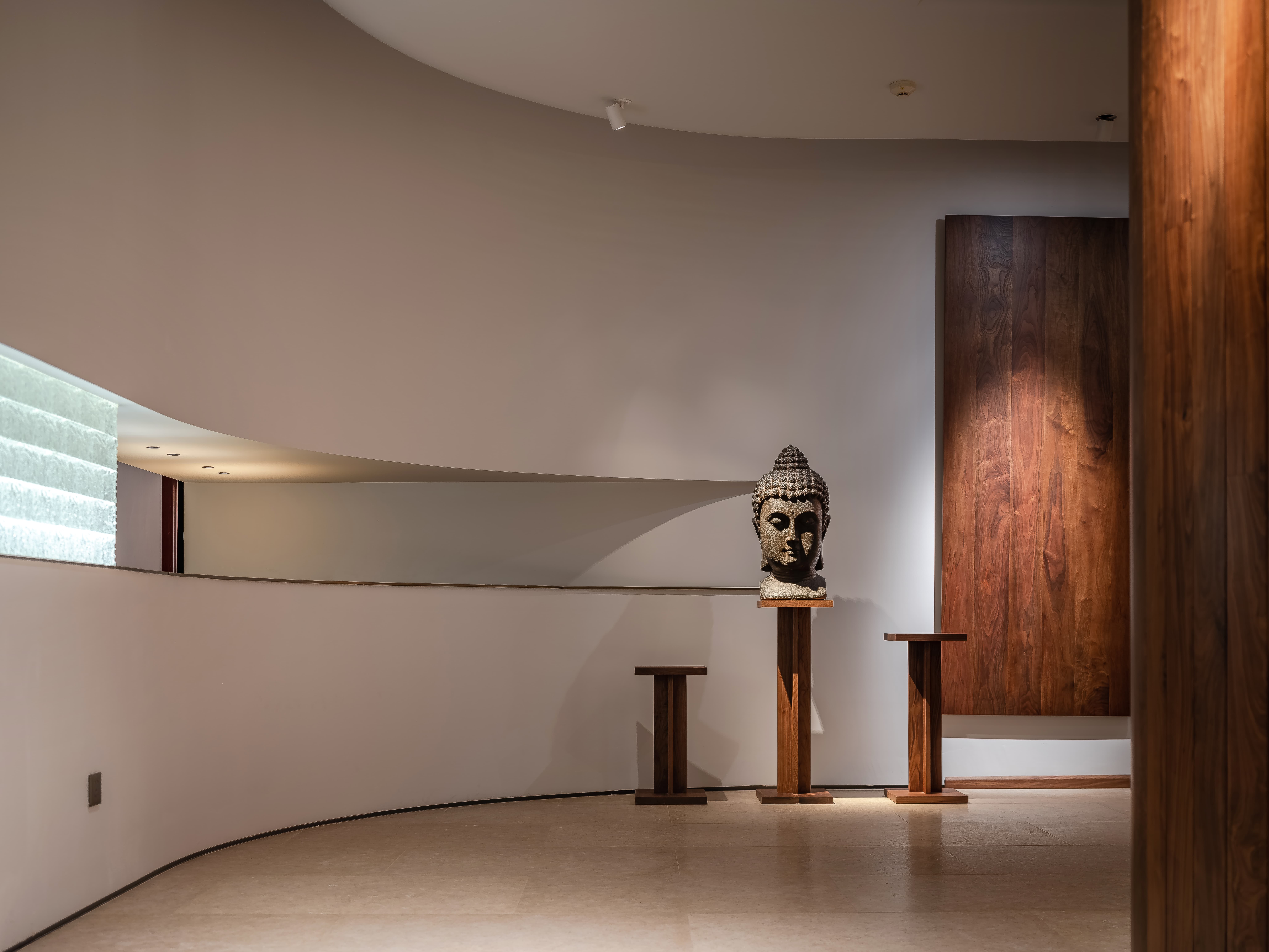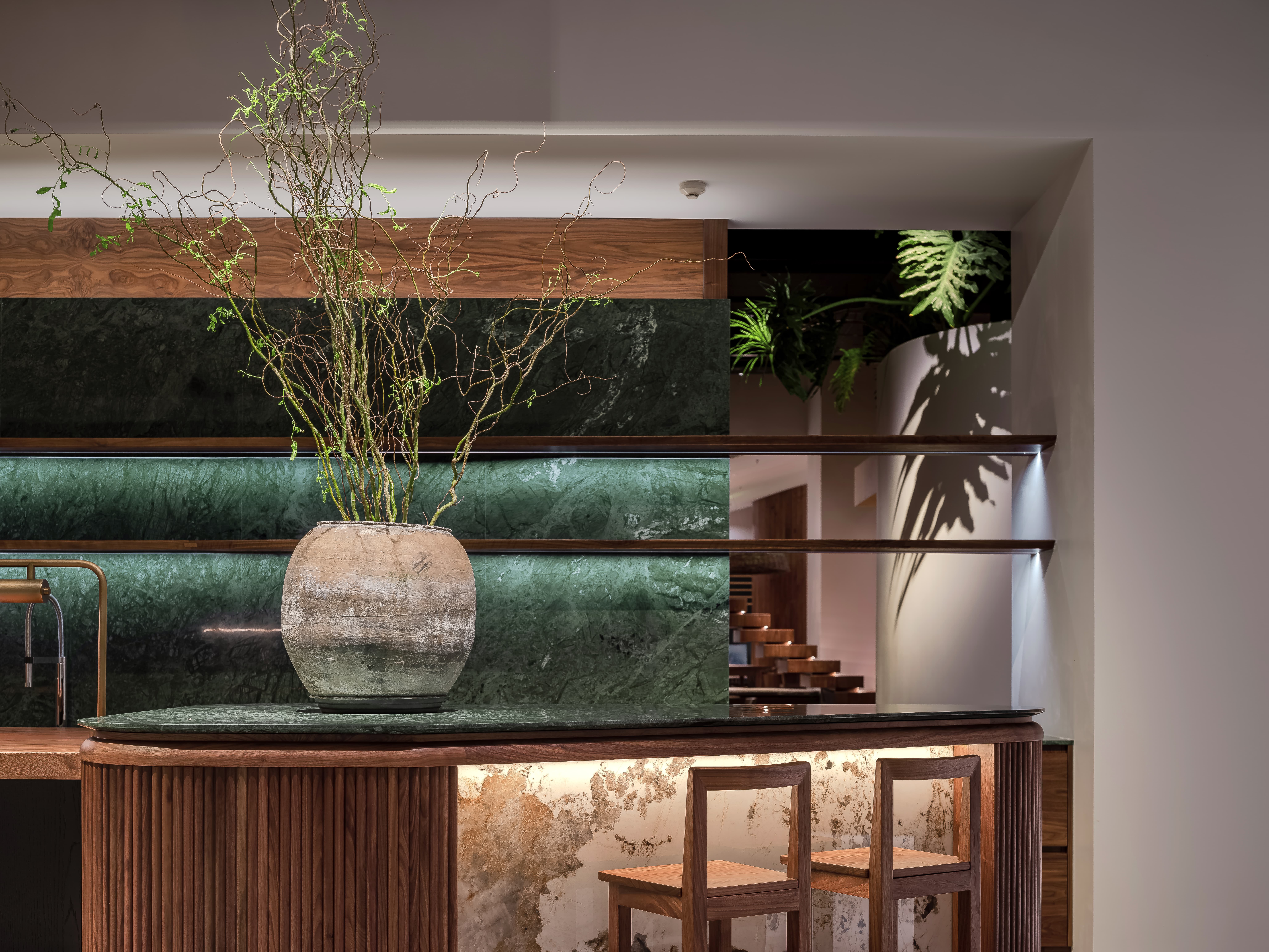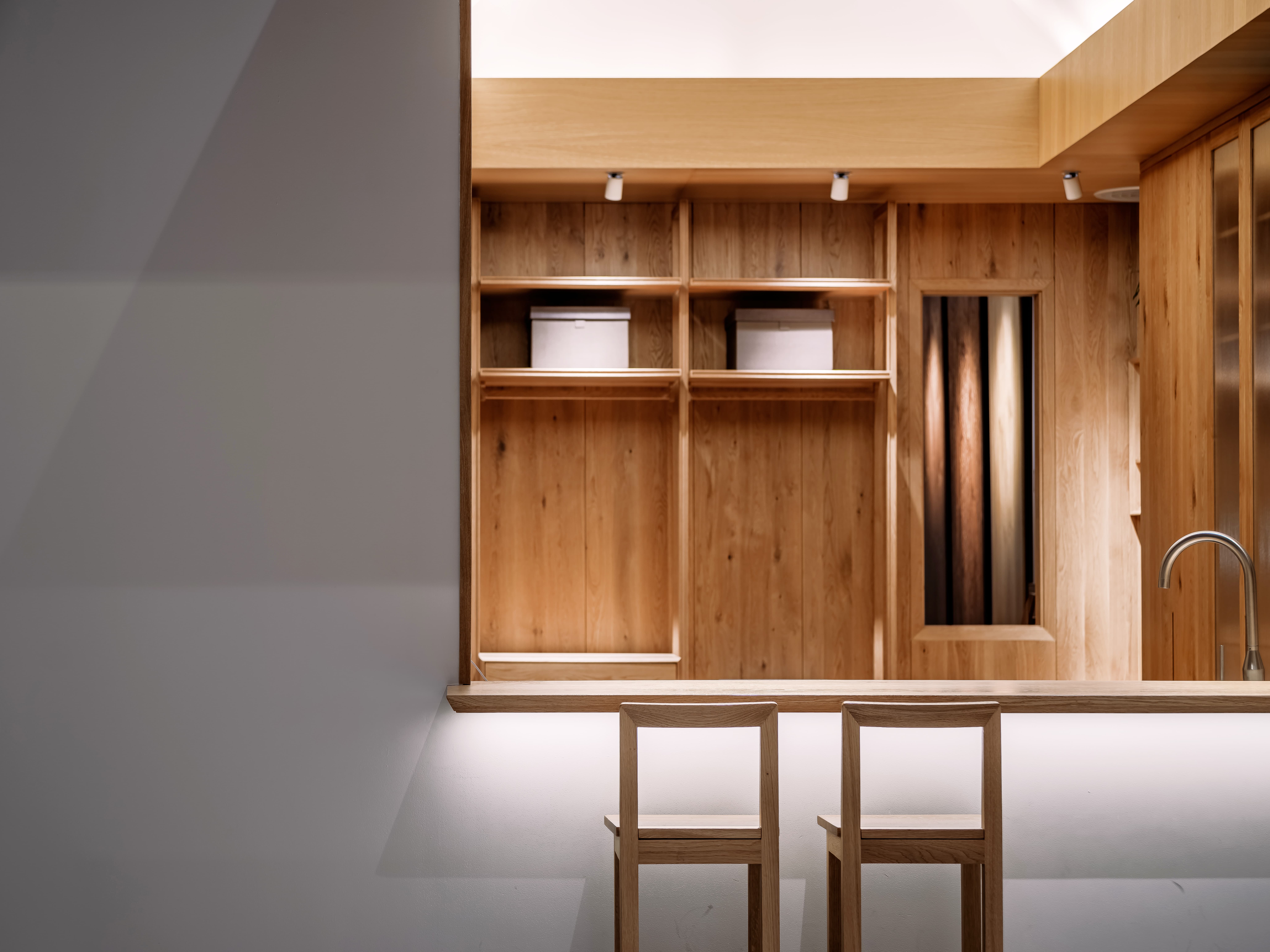 空间意境:线透过头顶的格栅洒落在街道上,营造出温暖的氛围。在远处的圆形餐桌上,一盏吊灯静静地照亮桌面,仿佛家人归家时为你留的那盏灯。