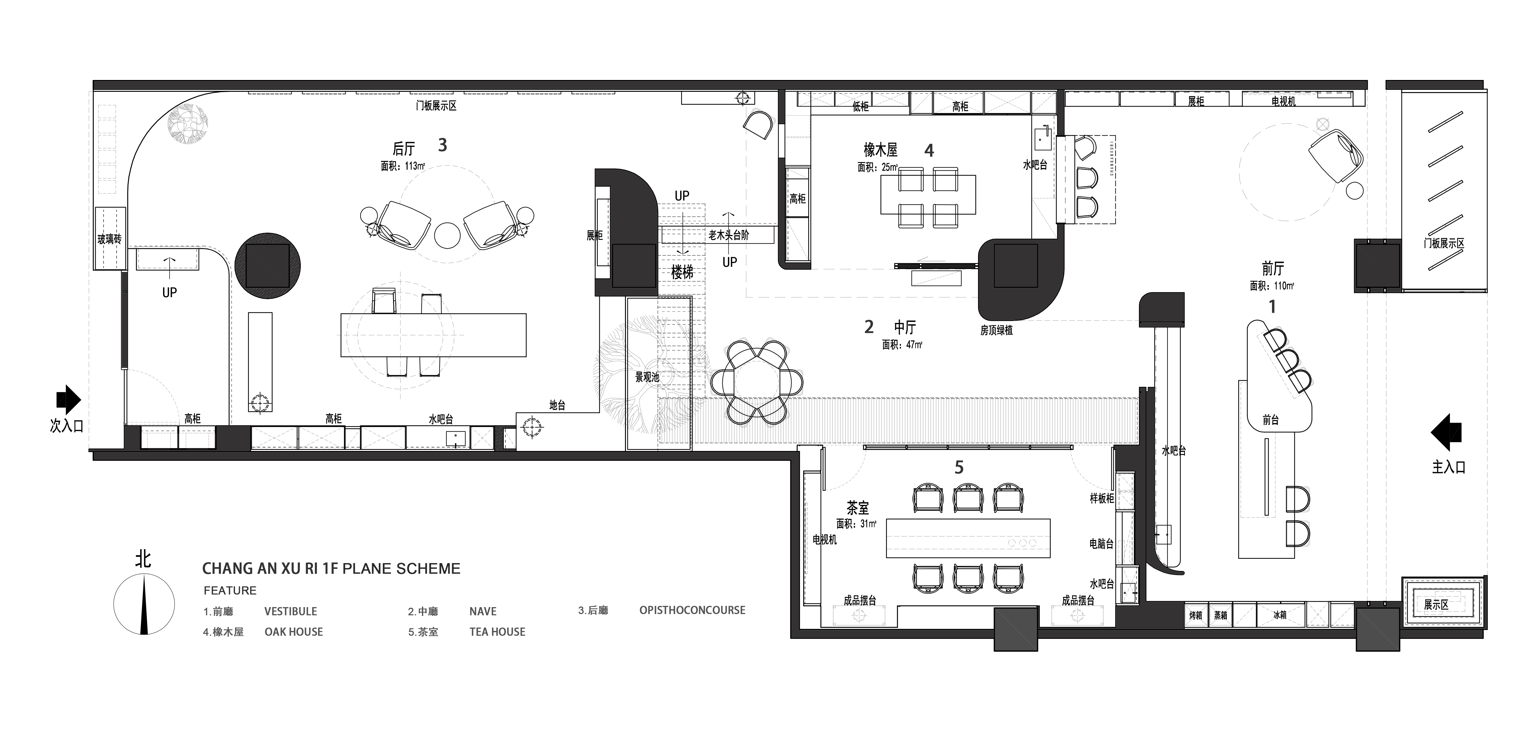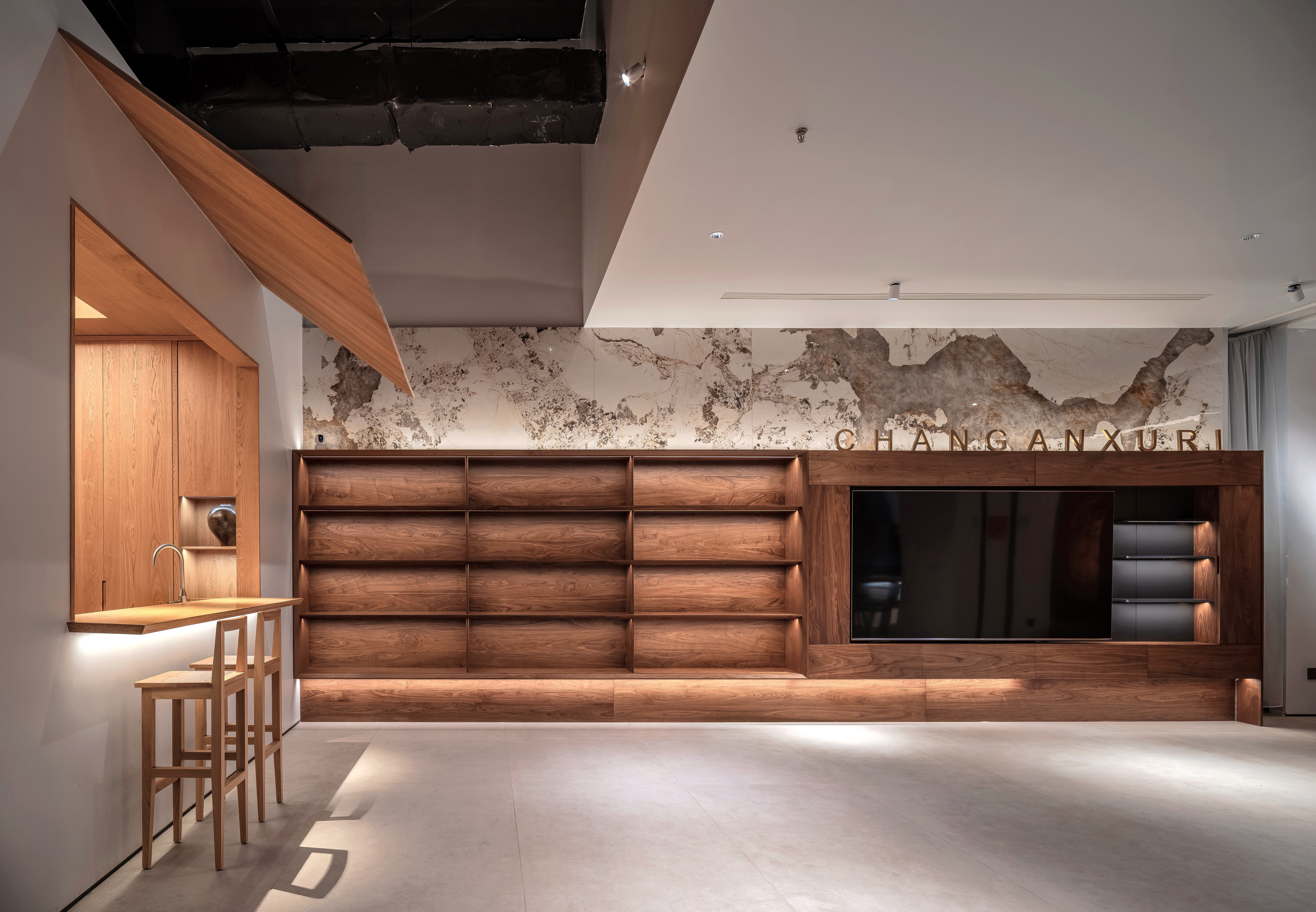 空间布局:通过空间的高低错落和展厅独立体块的设计,展厅自然形成了一条青石街道。行走在这条街道上,顾客可以看到开窗、室内以及街景,宛如小时候邻里之间的关系。