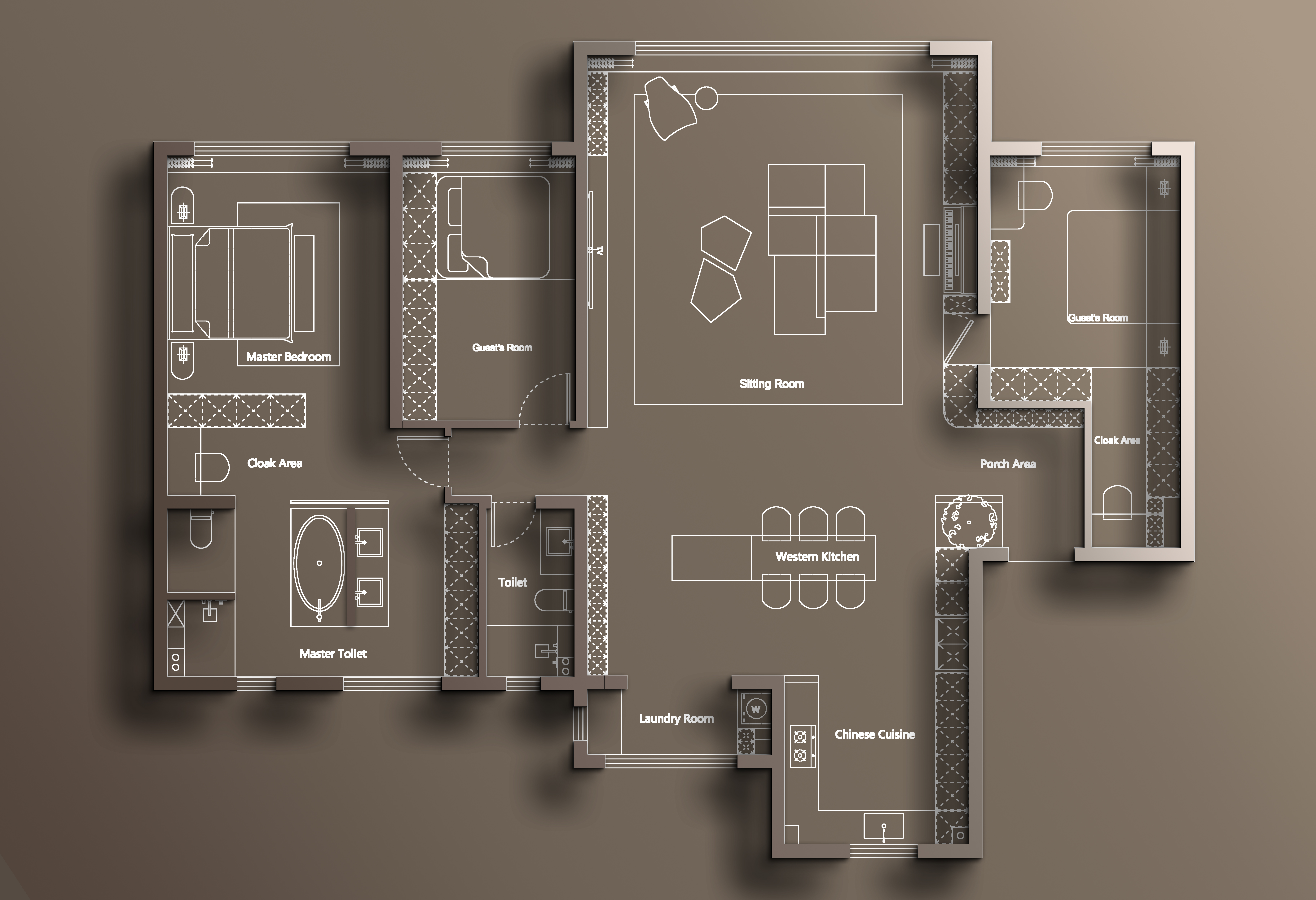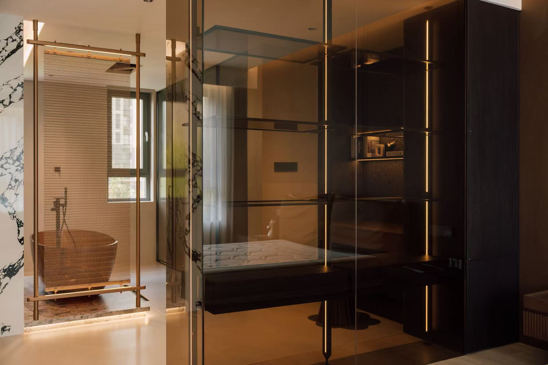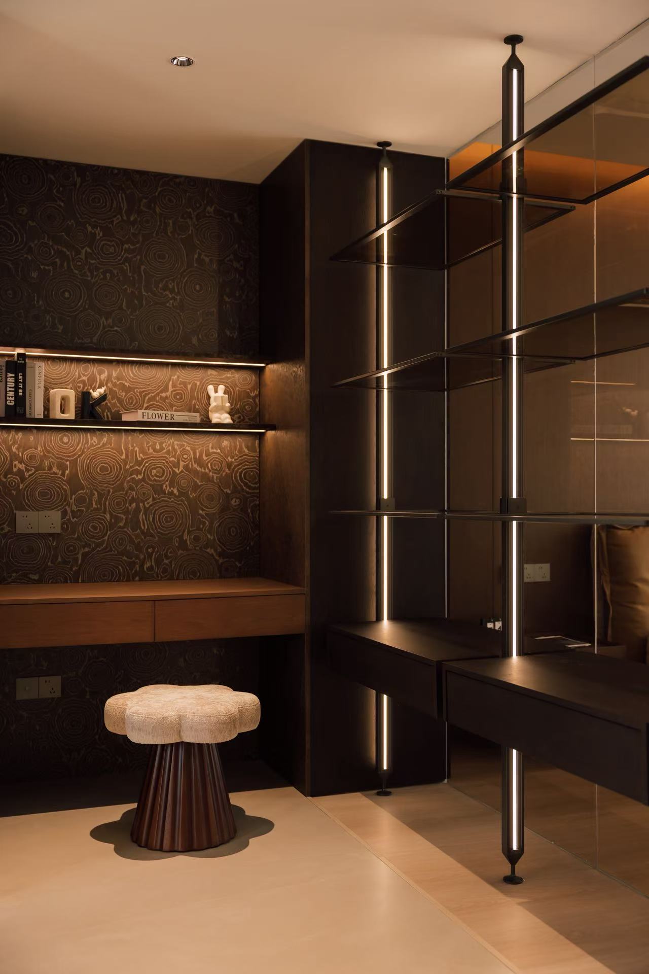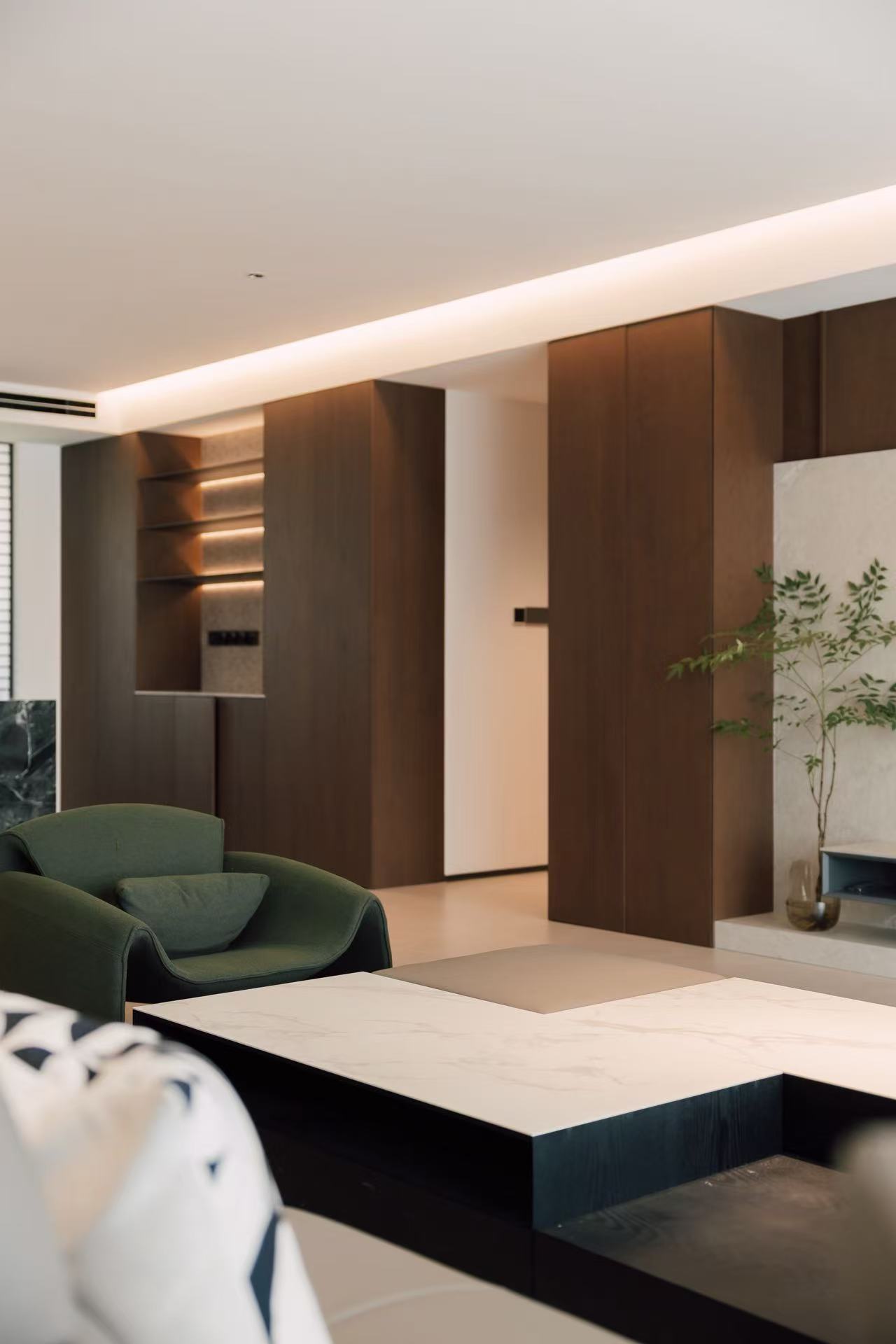 空间布局:事物存在于逻辑,希望空间承载人与自然的链接和共生性。建立了空间的架构关系,使视觉重心中心化,避免压迫感,顶部层级的阵列、深色体块和顶部形成的悬浮感,这些场景使得空间明确层次分明,也让光感更加温润。