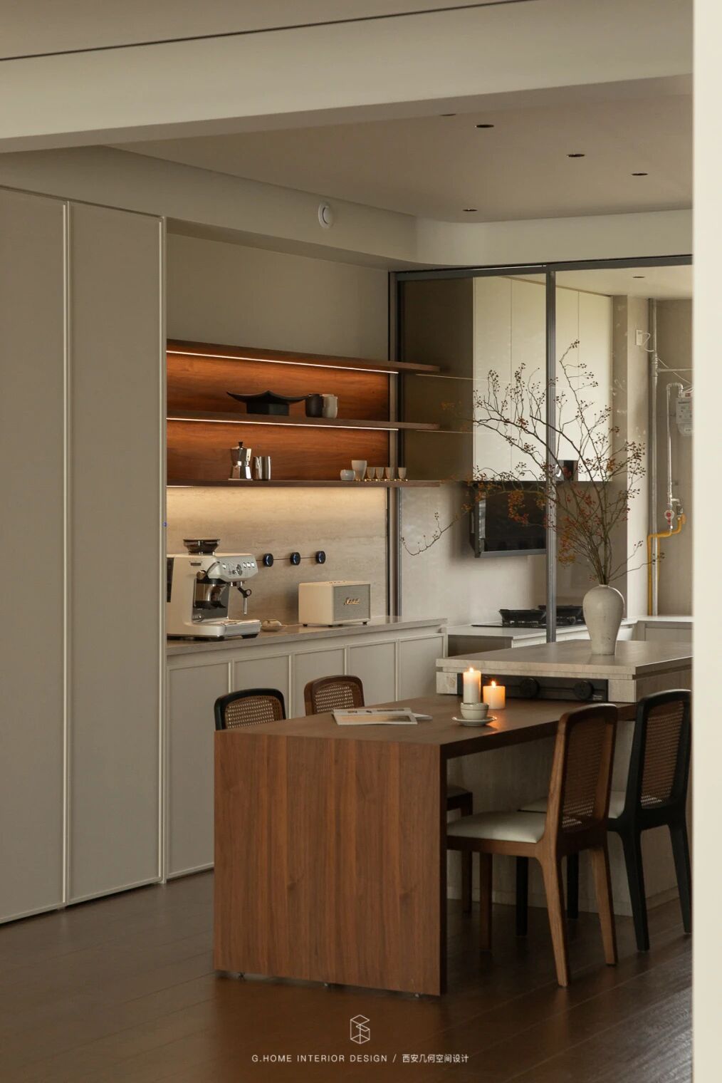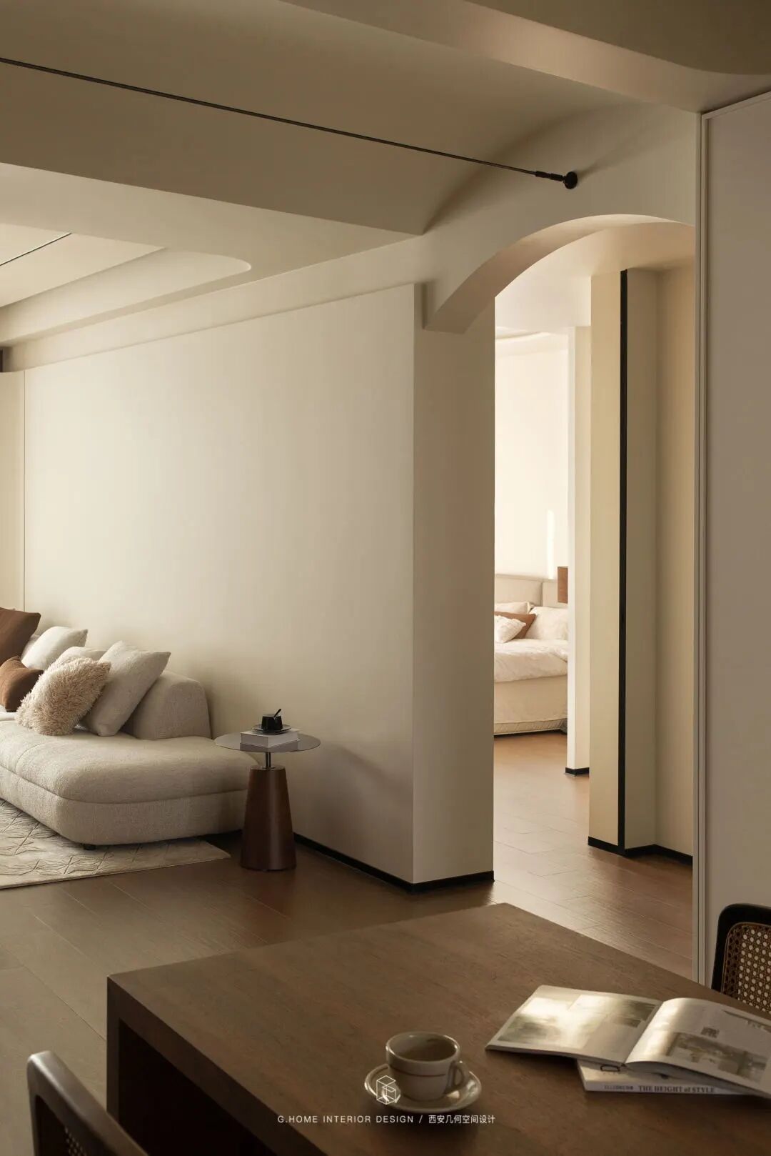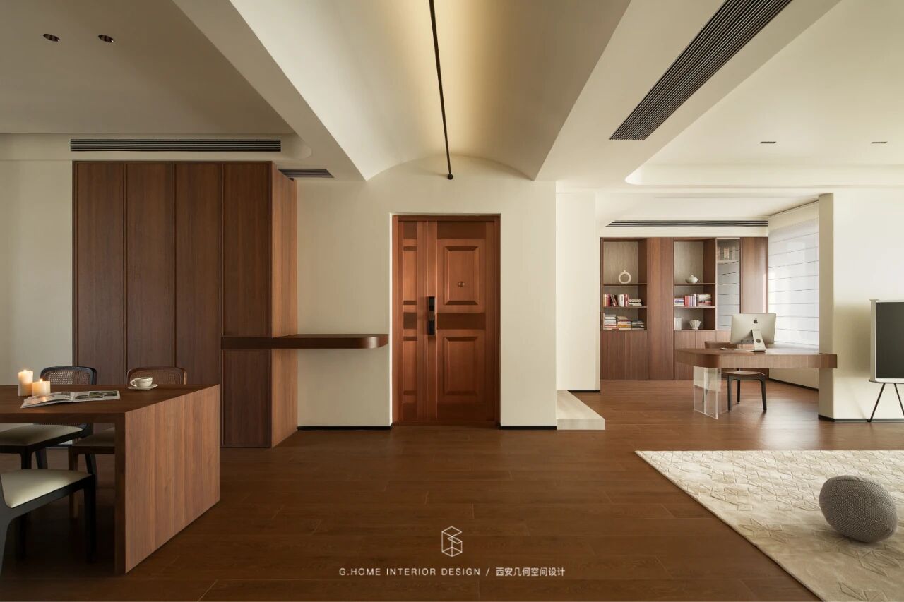 设计选材:以奶杏色、米色为基底,通铺温润木纹砖;餐厨区融入深色木质元素与藤编椅、原木板搁架,凸显中古质感;搭配弧形造型、镂空隔挡、圆弧吊顶及内嵌灯带,强化风格层次。
