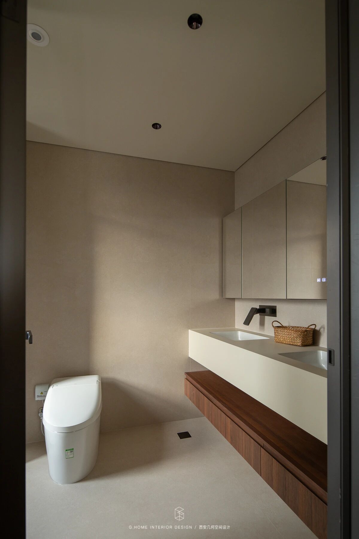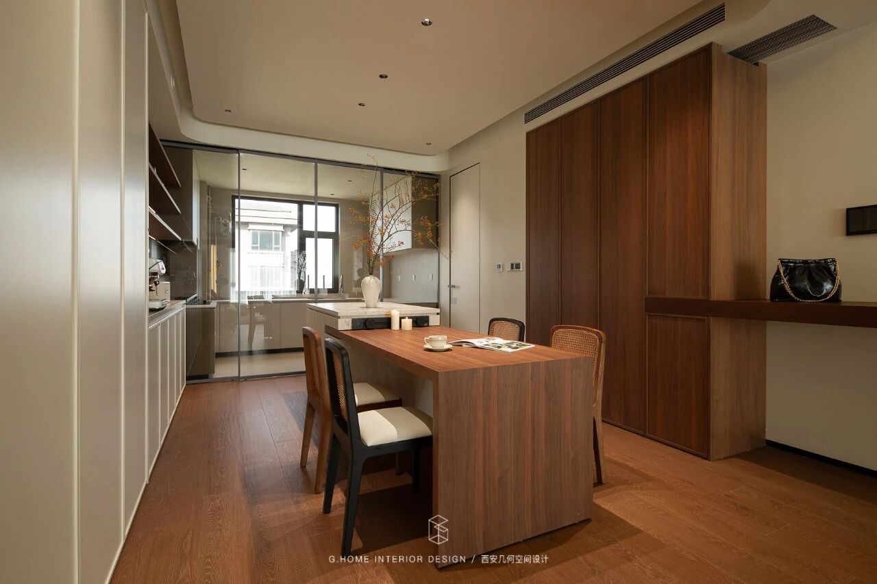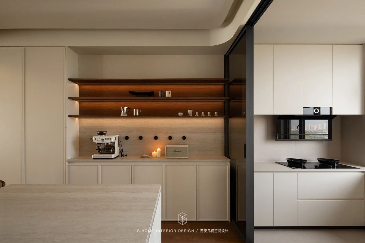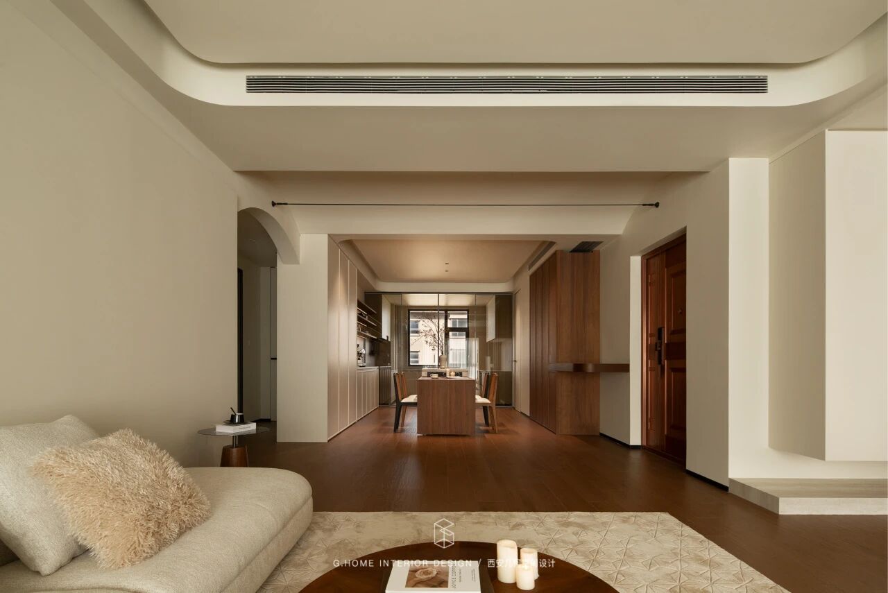 设计选材:以奶杏色、米色为基底,通铺温润木纹砖;餐厨区融入深色木质元素与藤编椅、原木板搁架,凸显中古质感;搭配弧形造型、镂空隔挡、圆弧吊顶及内嵌灯带,强化风格层次。
