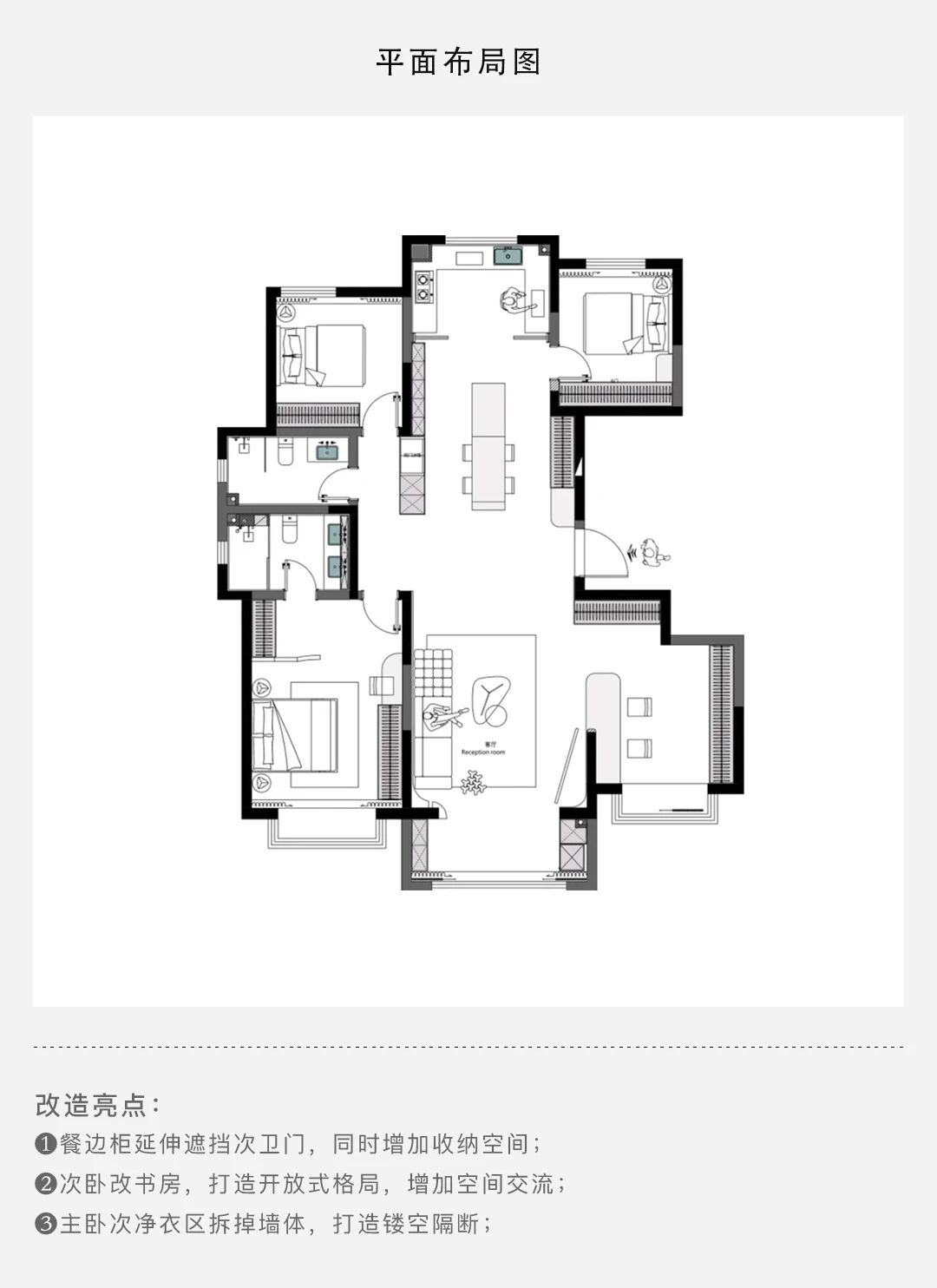 空间布局:客厅与书房开半墙形成开放式布局,增强空间交流;阳台整合功能区,餐厨区设岛台餐桌一体,厨房遵循U型洗切炒动线;主卧规划双收纳区与双台盆卫生间,全空间动线流畅、功能分区清晰。