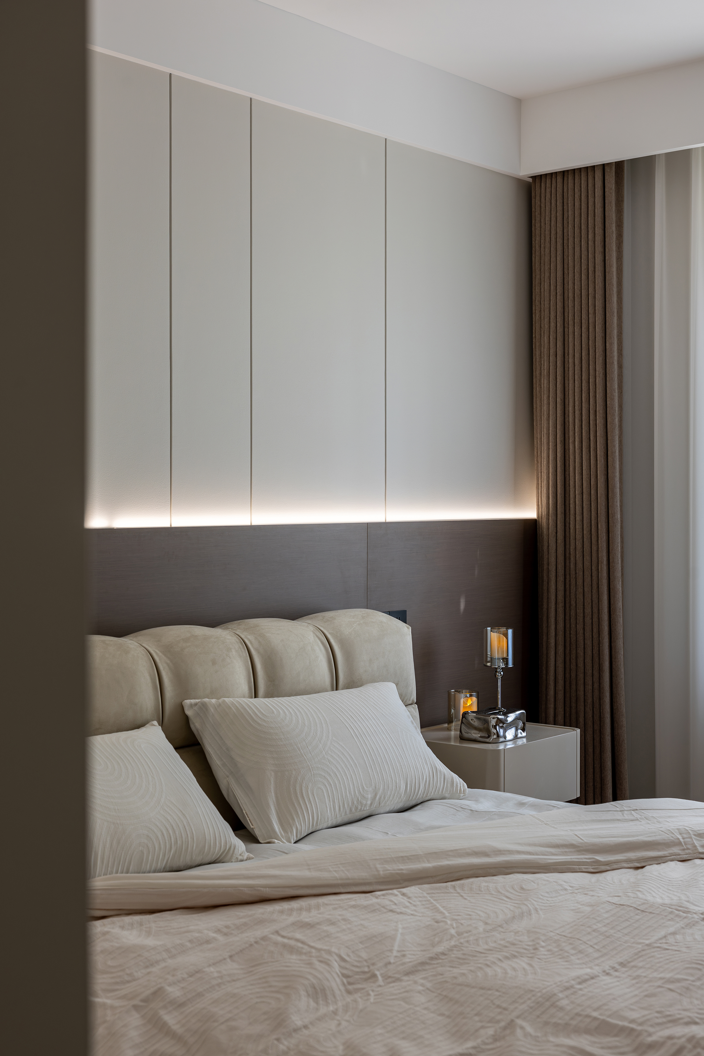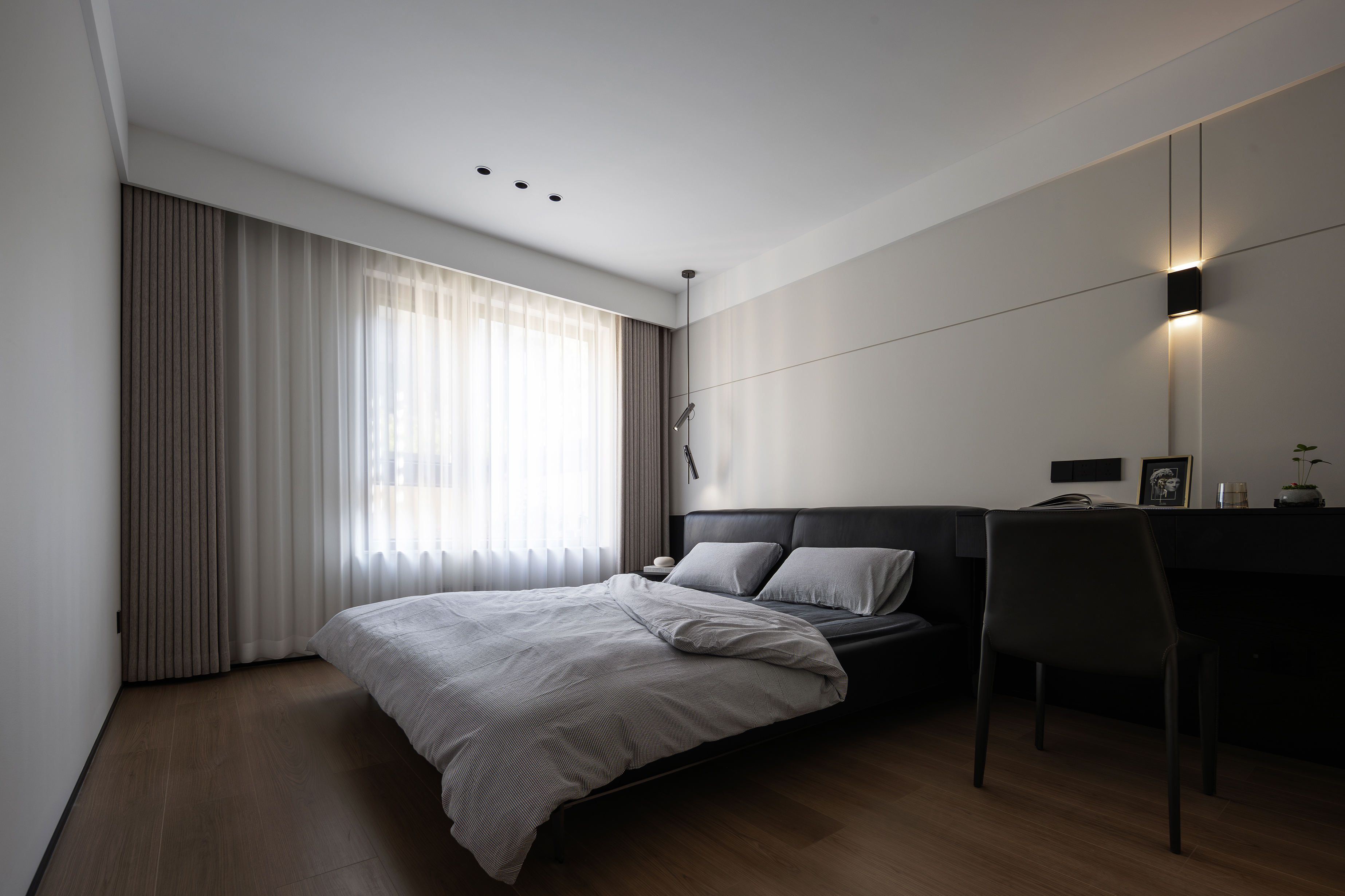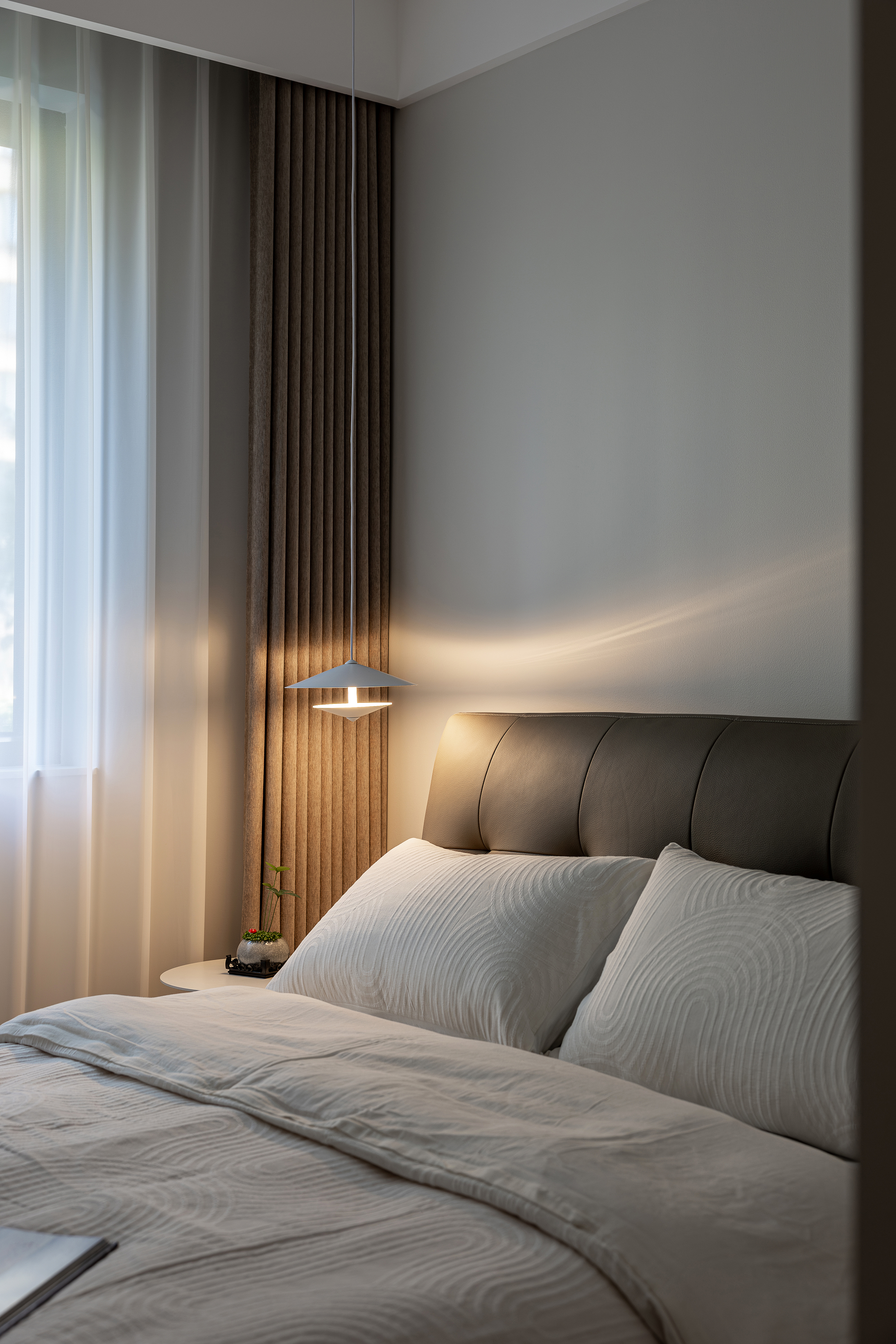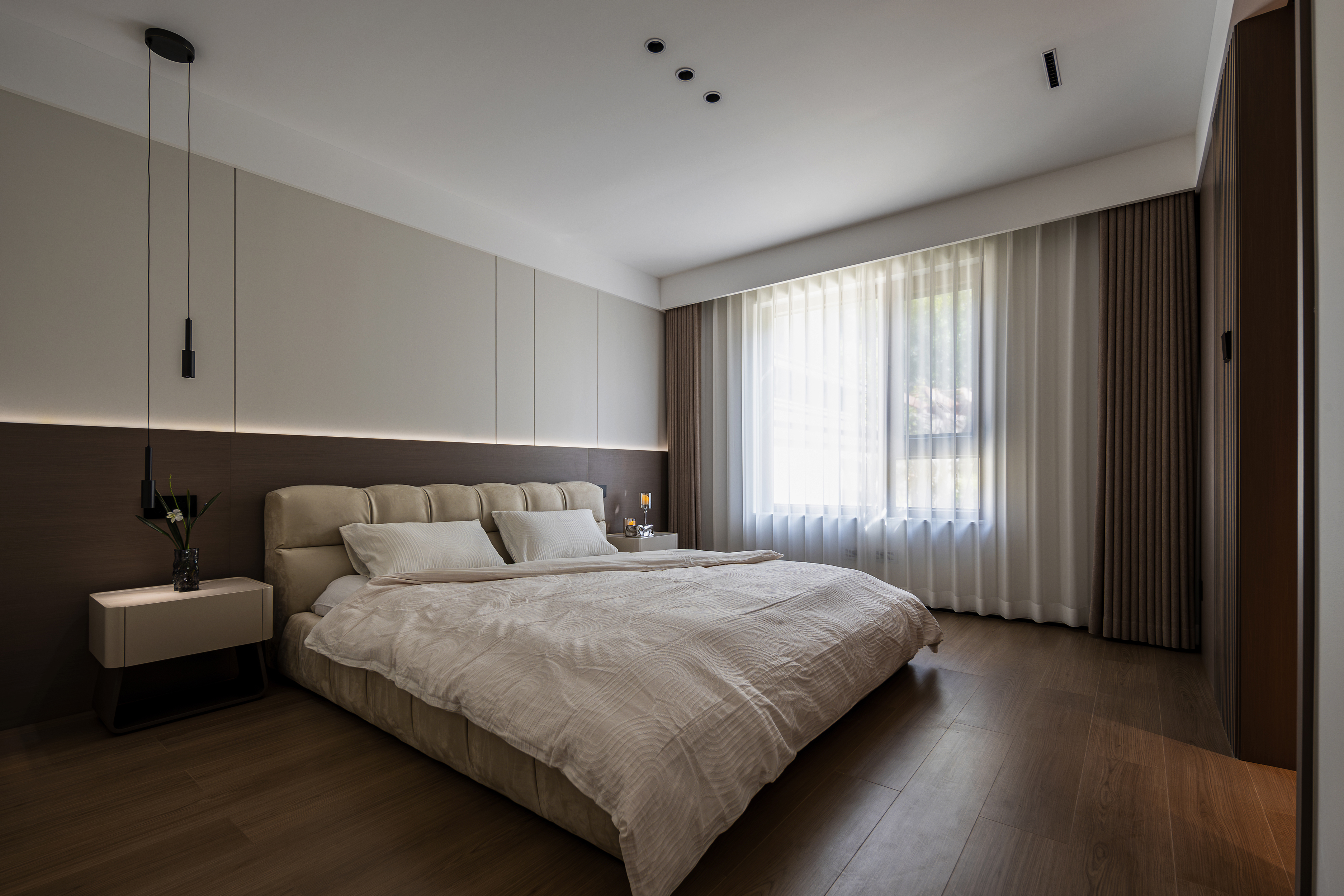 空间意境:本案以自然光透过半透明窗帘在地面投射出柔和的条纹,与人工照明共同营造出静谧而富有层次的光环境。隐藏式灯带与点光源的组合,在满足功能性的同时,创造出温馨氛围。绿植的点缀为空间注入生机,与木质元素共同演绎自然与现代的共生关系。