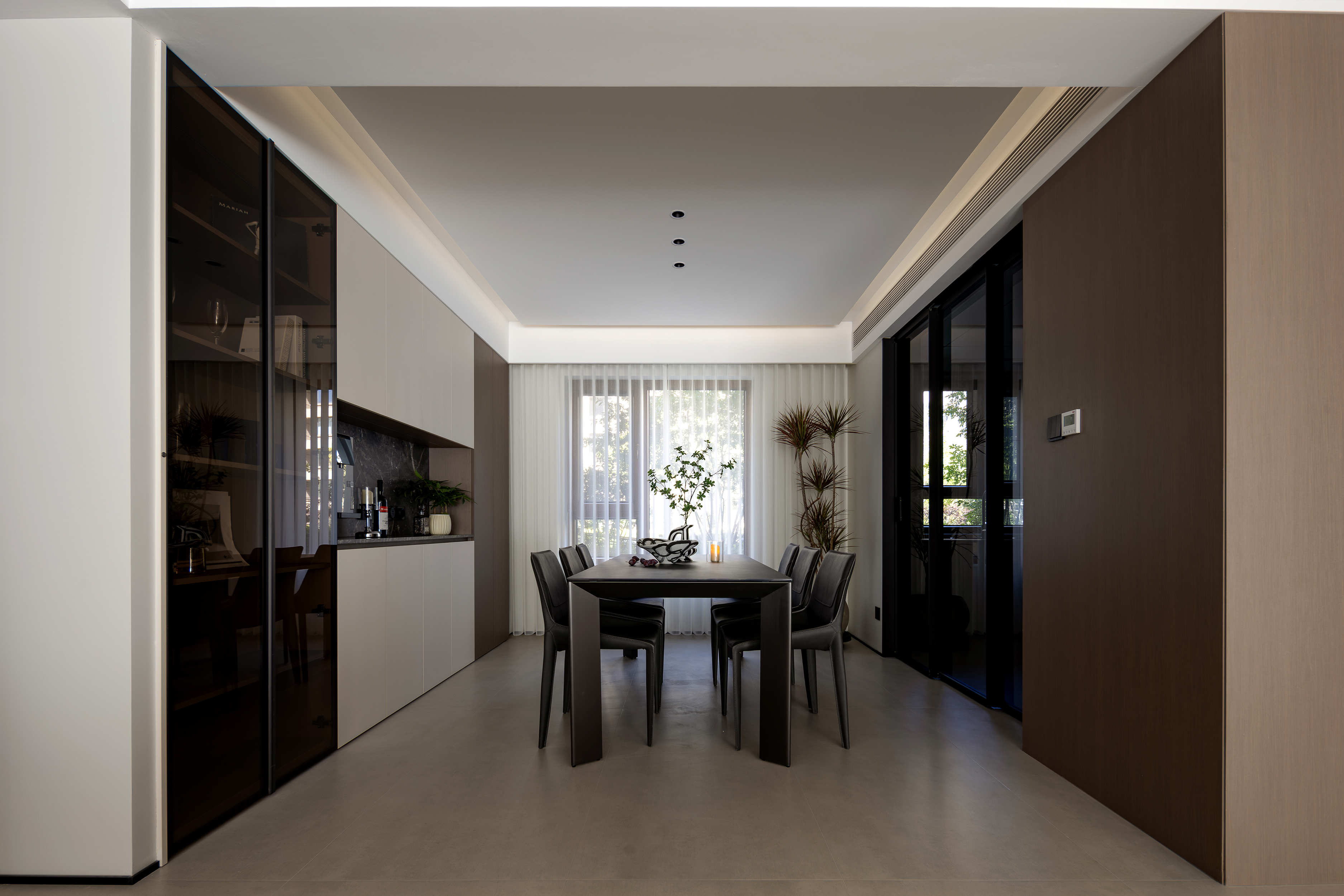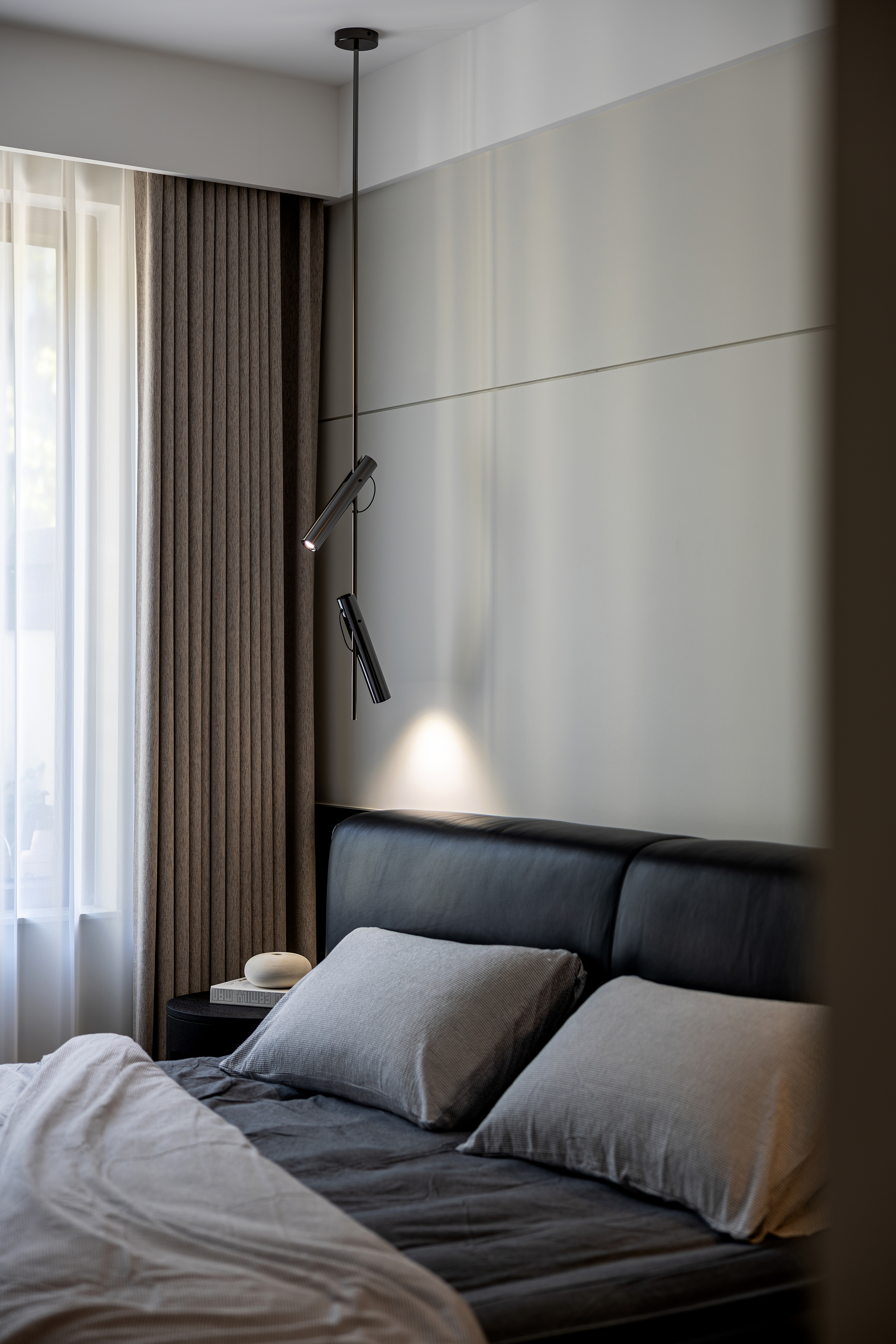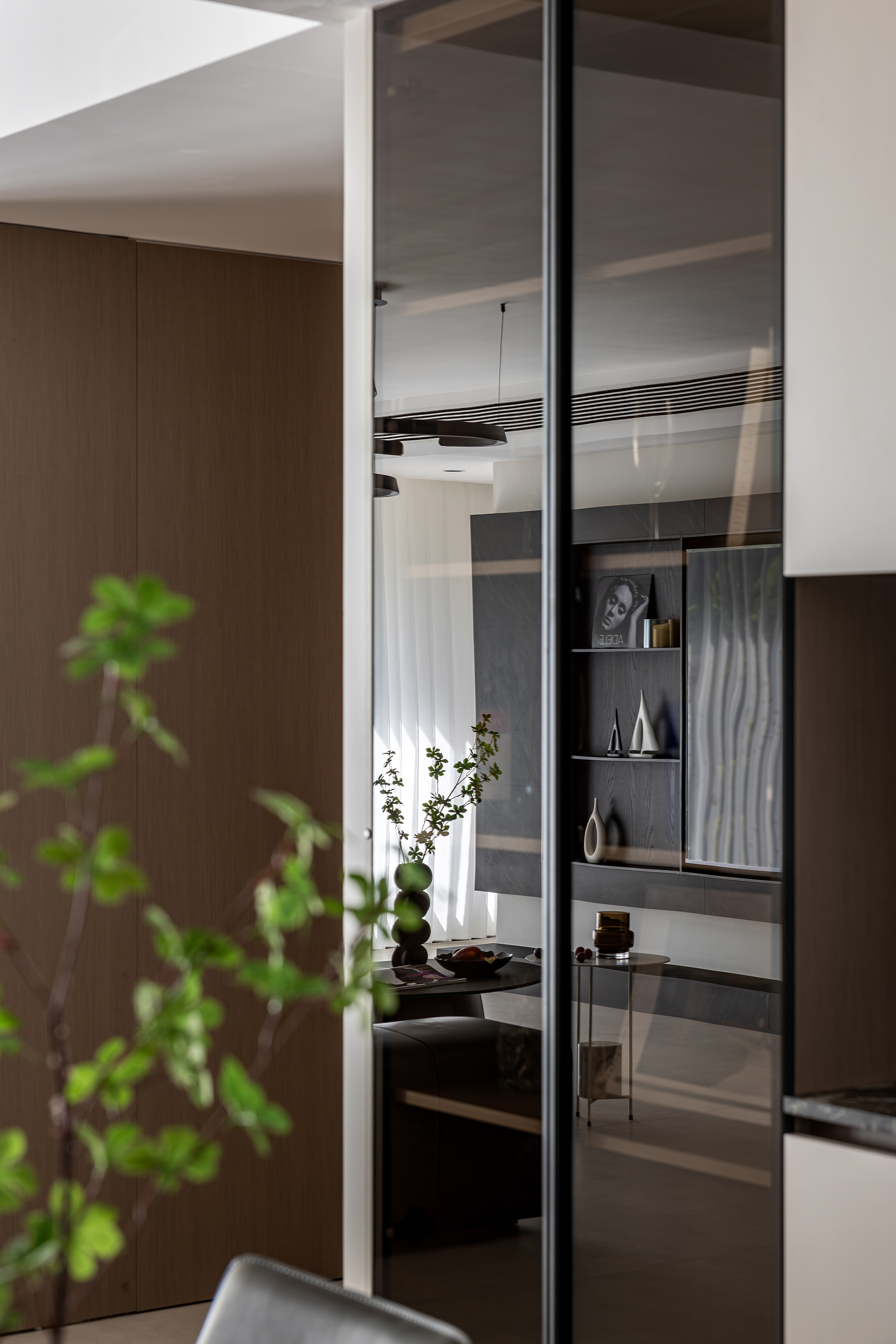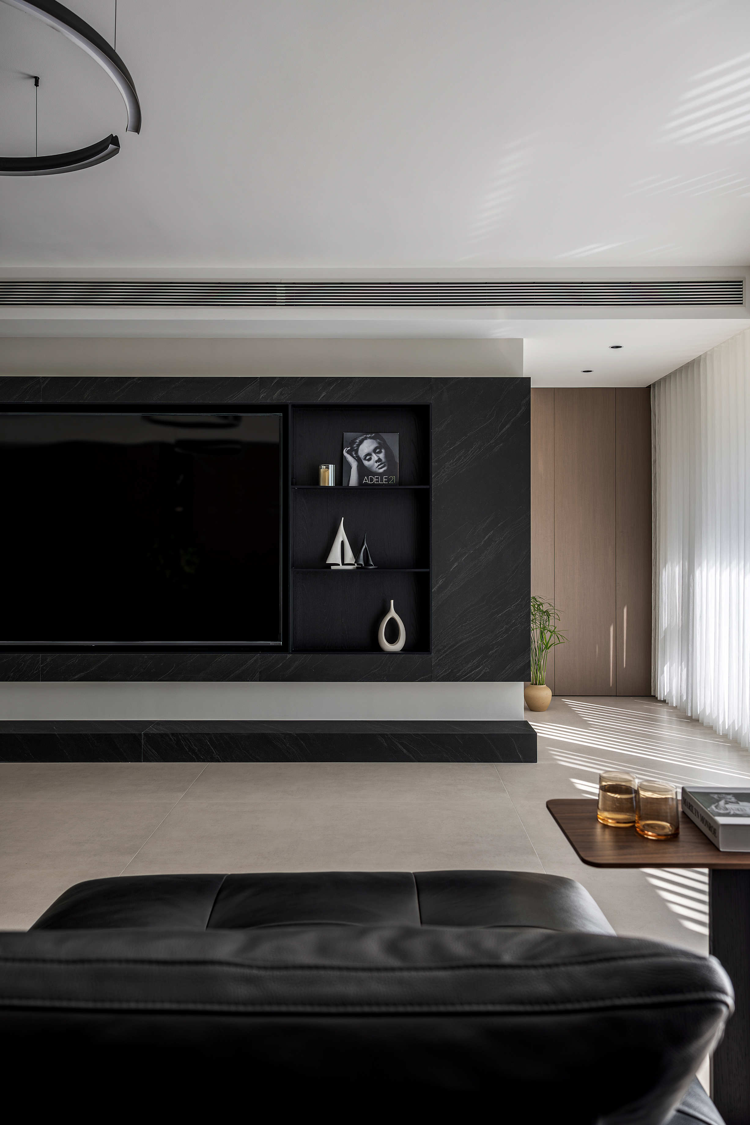 空间意境:本案以自然光透过半透明窗帘在地面投射出柔和的条纹,与人工照明共同营造出静谧而富有层次的光环境。隐藏式灯带与点光源的组合,在满足功能性的同时,创造出温馨氛围。绿植的点缀为空间注入生机,与木质元素共同演绎自然与现代的共生关系。