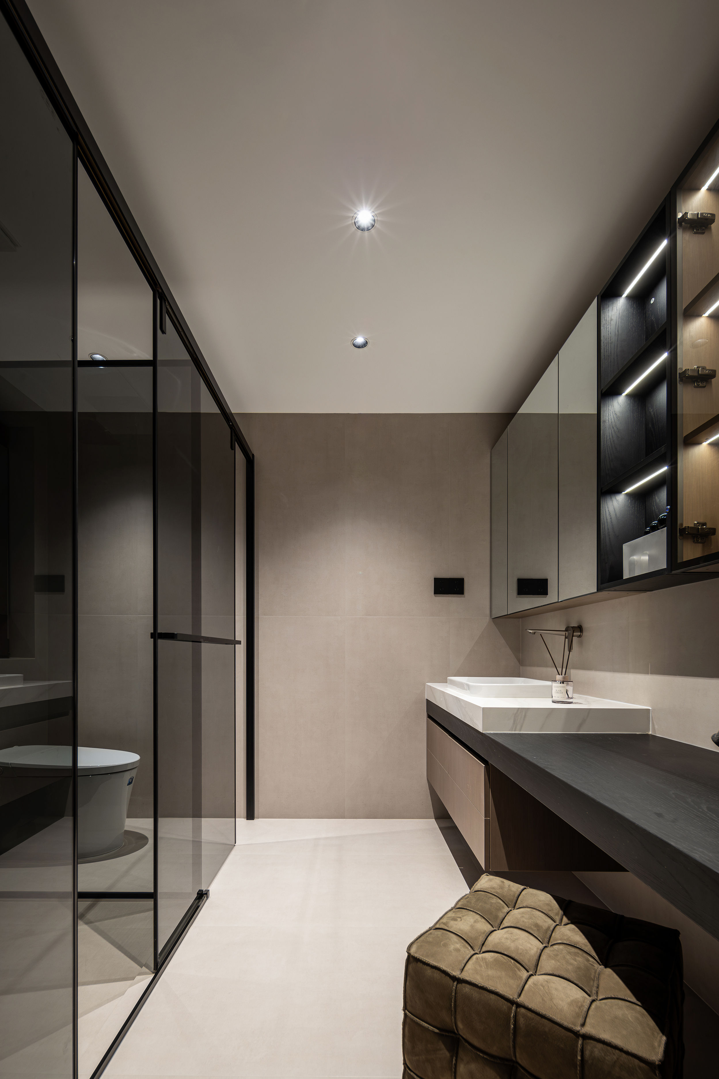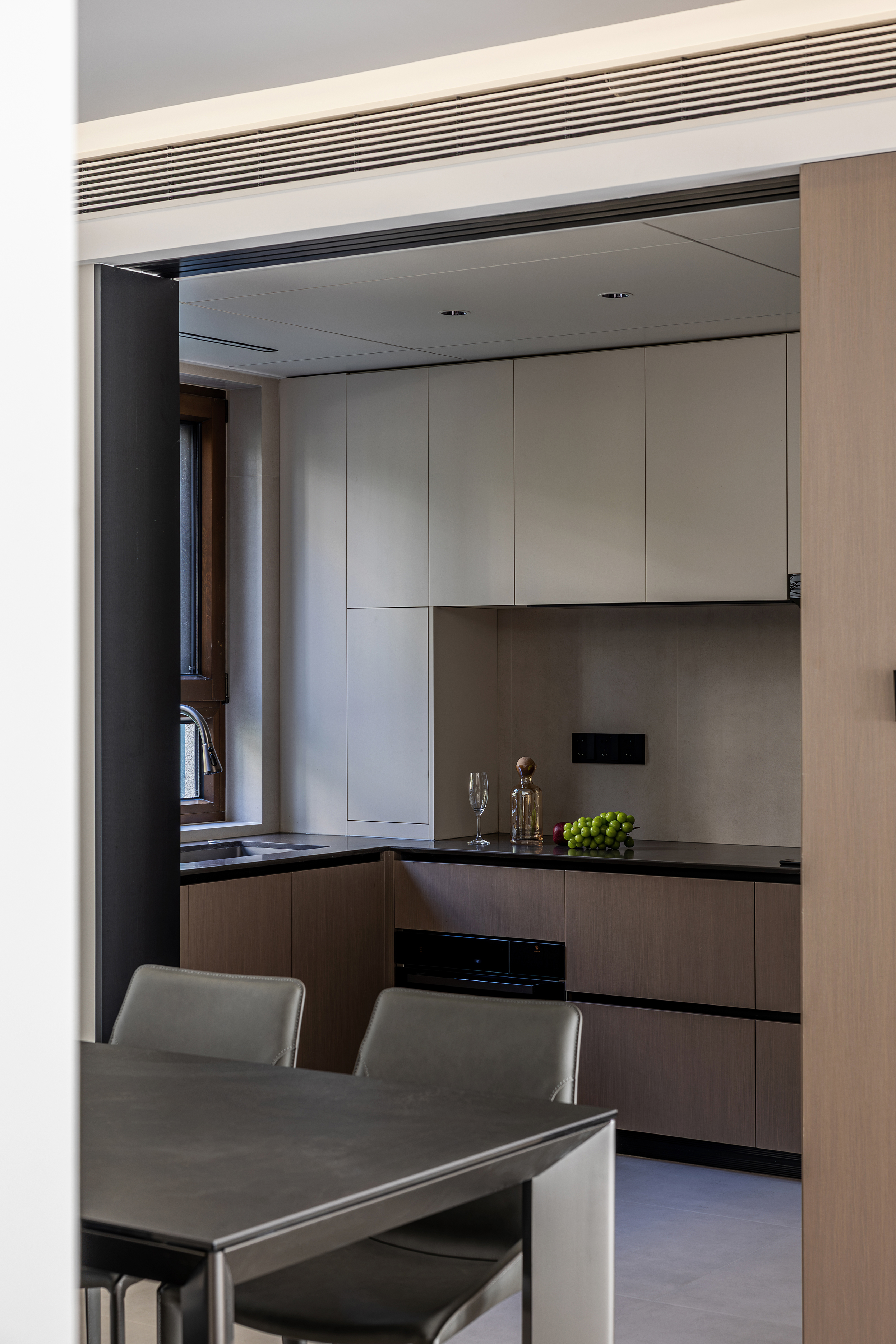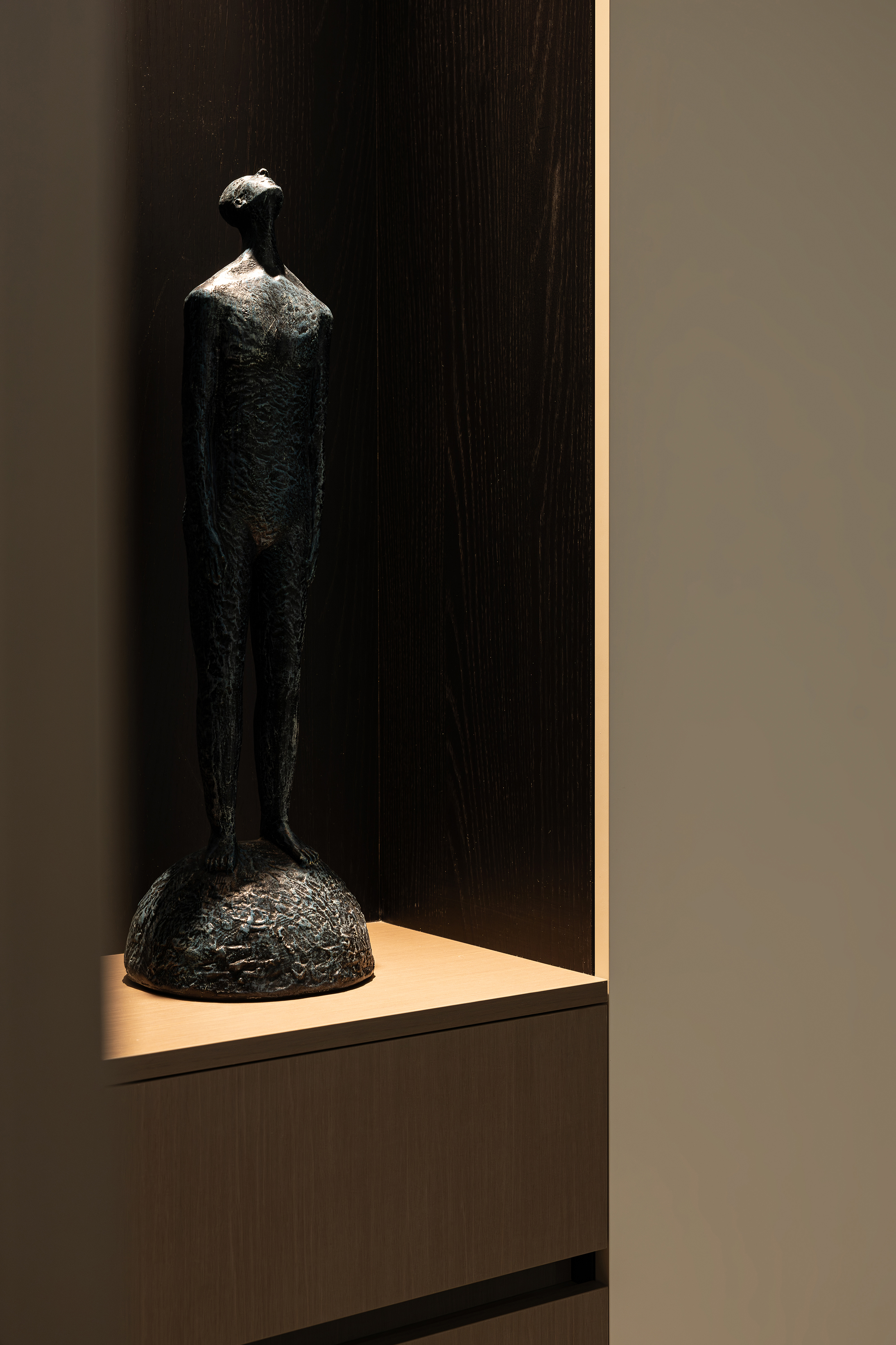 设计选材:通过对木材的精准运用和对光影的巧妙控制,打破了传统极简风格的冰冷感,在理性的空间秩序中,构建出富有温度的生活场景。每一处木作细节都在光线的映衬下呈现出独特的纹理,让居住者在都市喧嚣中,时刻感受到自然的宁静与生活的质感。