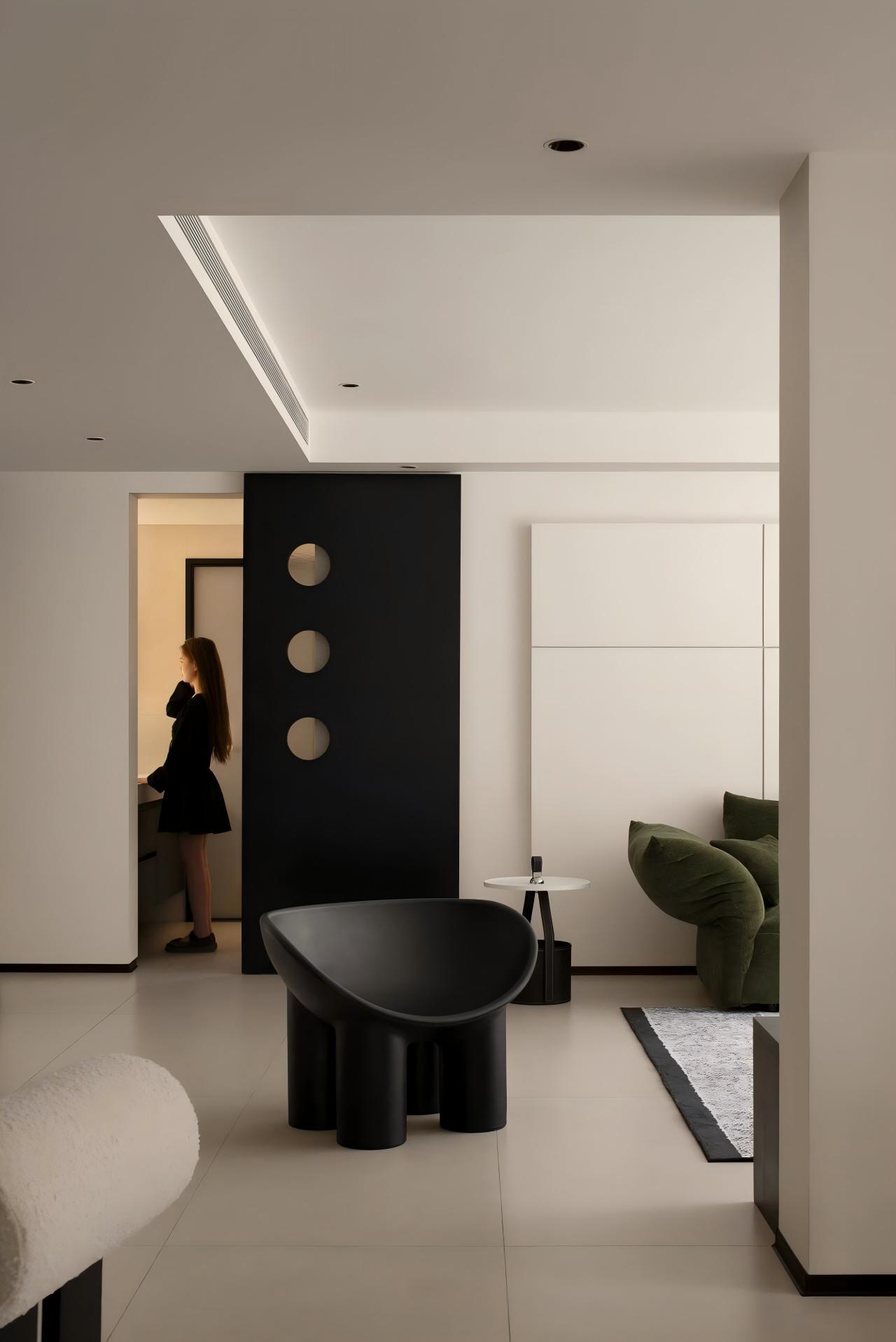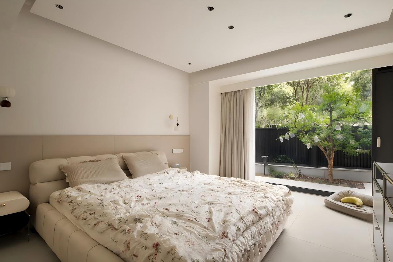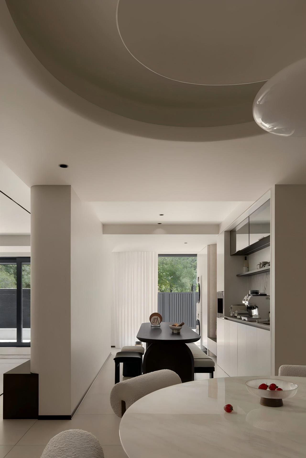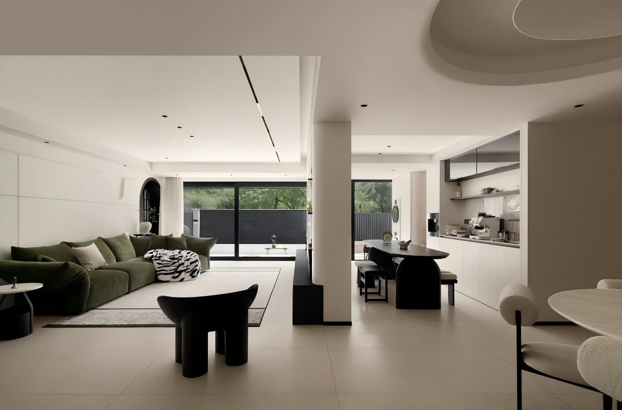 设计选材:以大面积纯白为基底,搭配定制绿色家具形成视觉焦点;借助线性切割与几何造型塑造光影层次,辅以通透材质(落地窗)最大化引入庭院景观,平衡素雅基调与活力氛围。