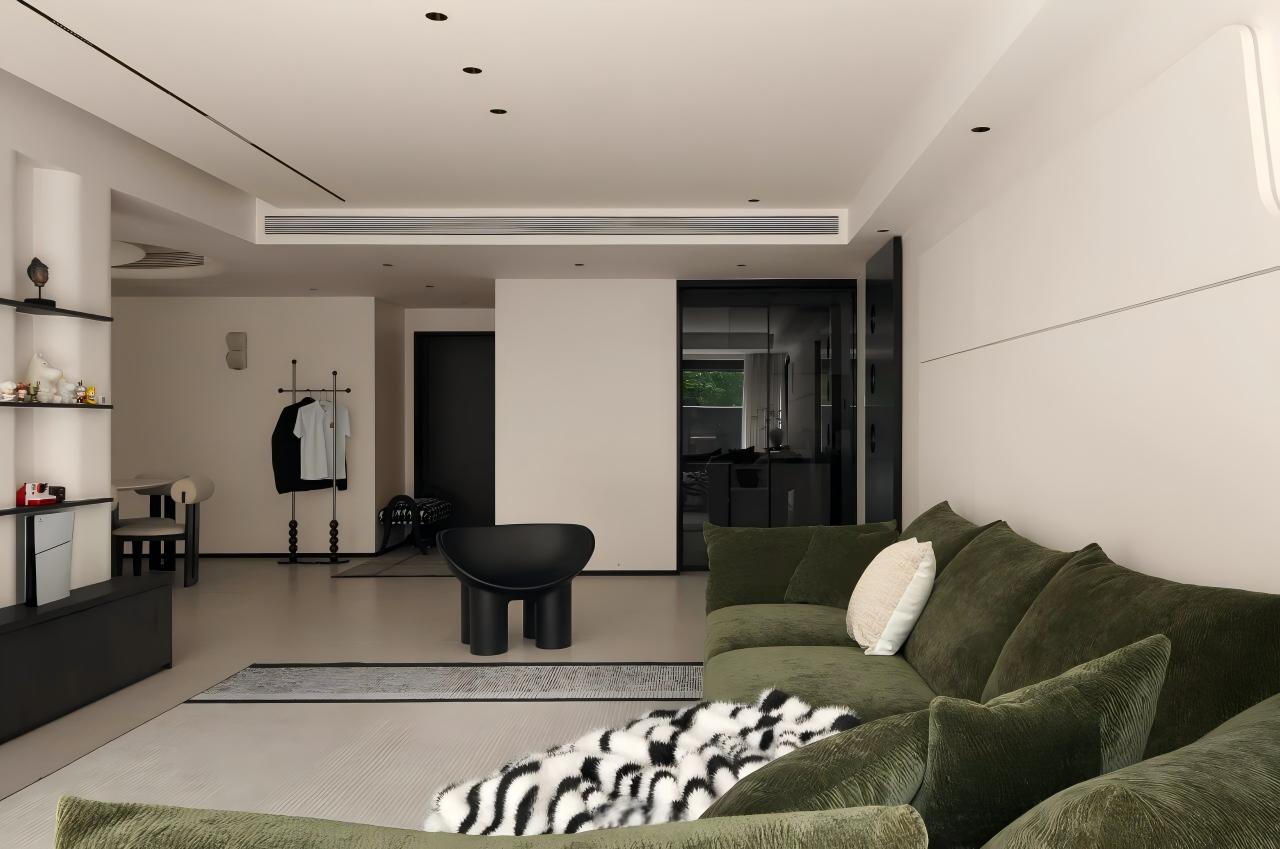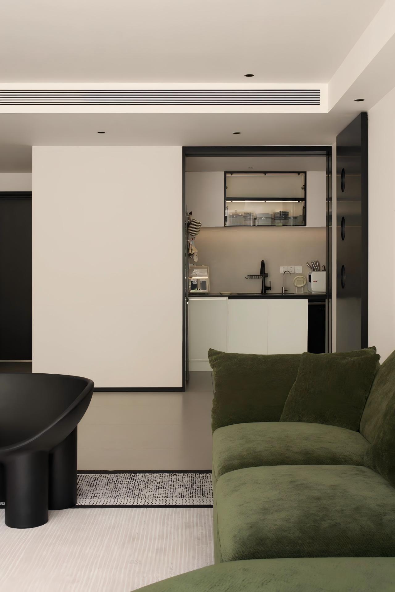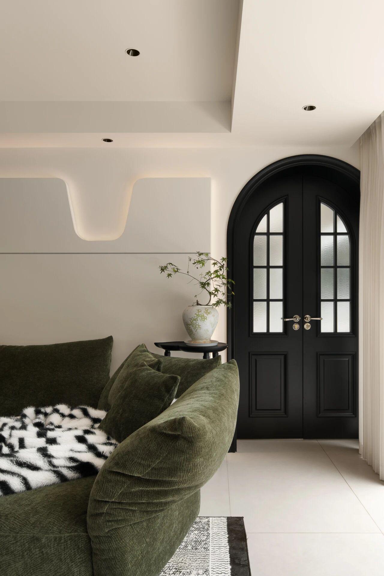 设计选材:以大面积纯白为基底,搭配定制绿色家具形成视觉焦点;借助线性切割与几何造型塑造光影层次,辅以通透材质(落地窗)最大化引入庭院景观,平衡素雅基调与活力氛围。