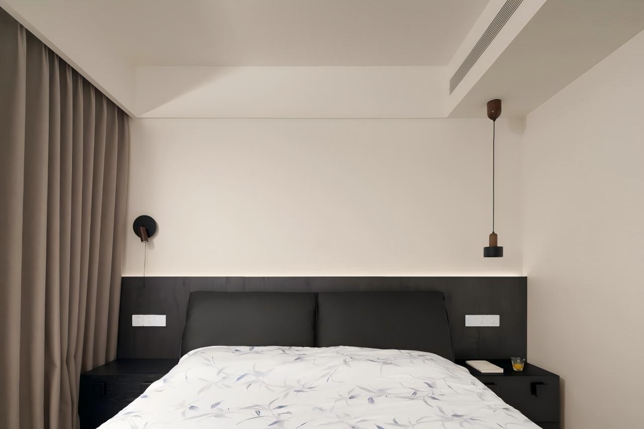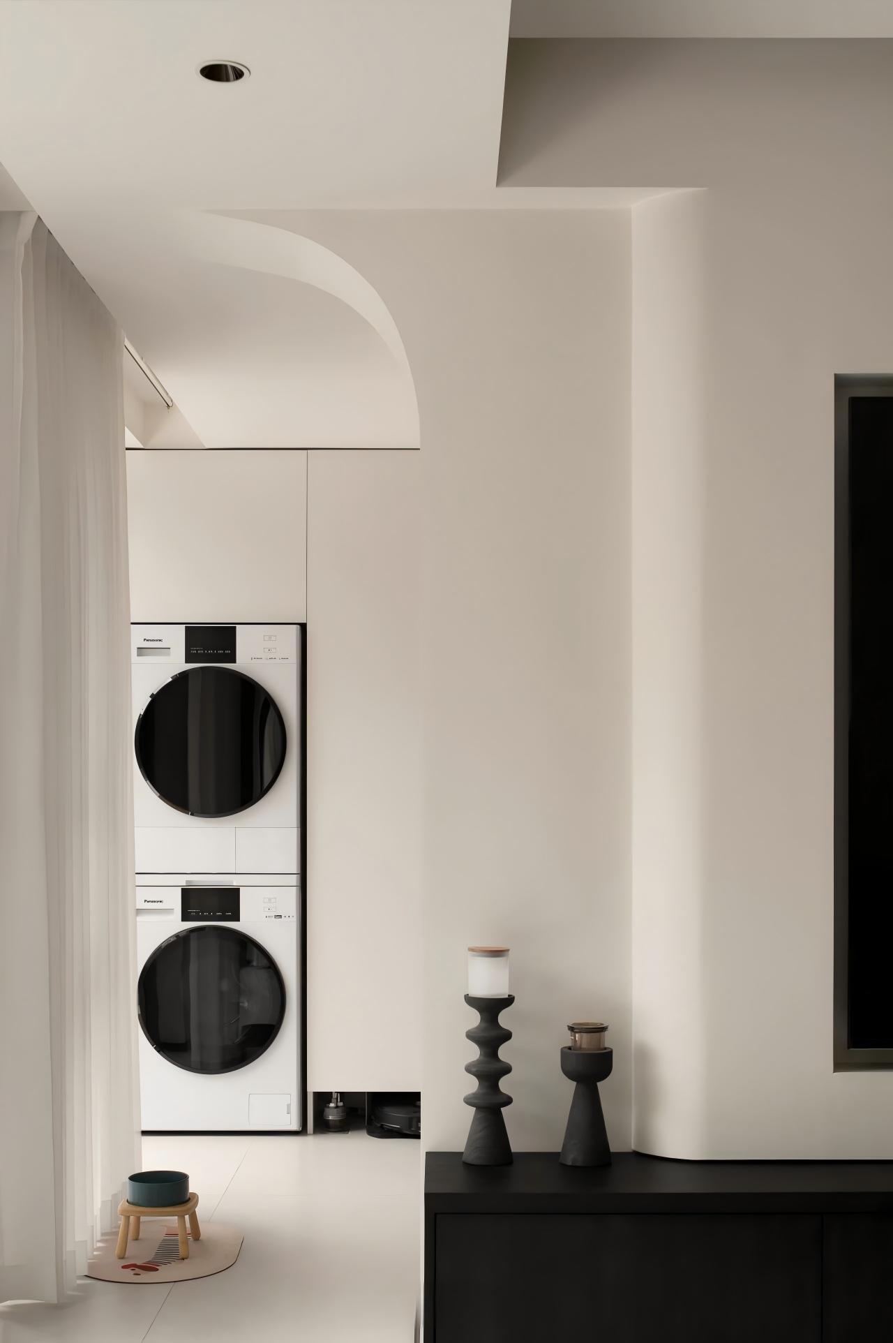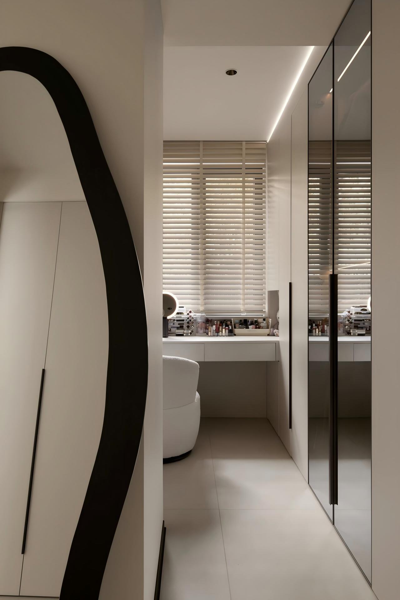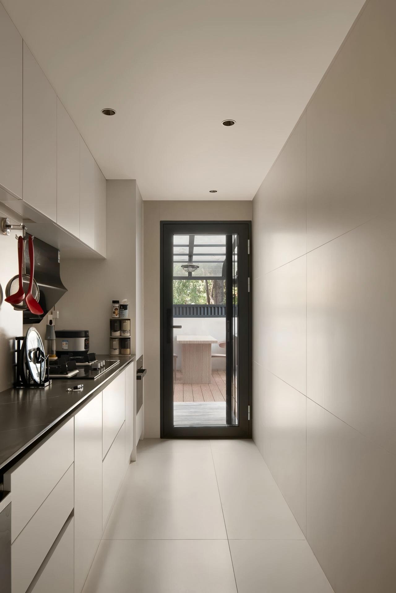 设计选材:以大面积纯白为基底,搭配定制绿色家具形成视觉焦点;借助线性切割与几何造型塑造光影层次,辅以通透材质(落地窗)最大化引入庭院景观,平衡素雅基调与活力氛围。